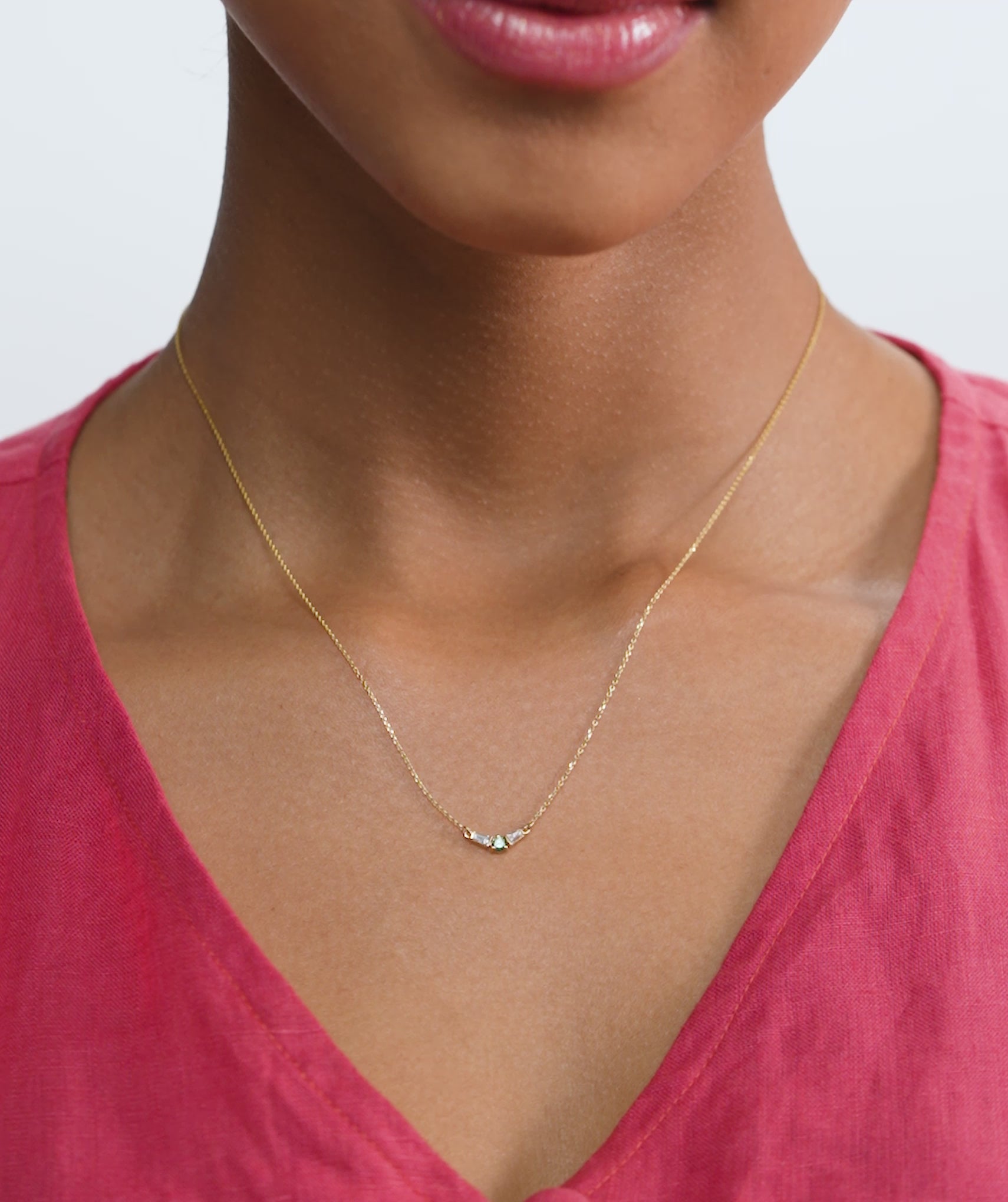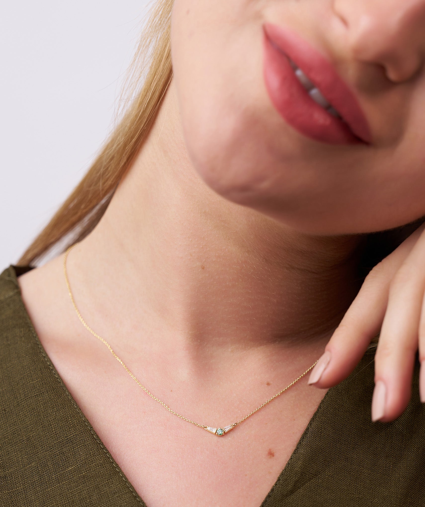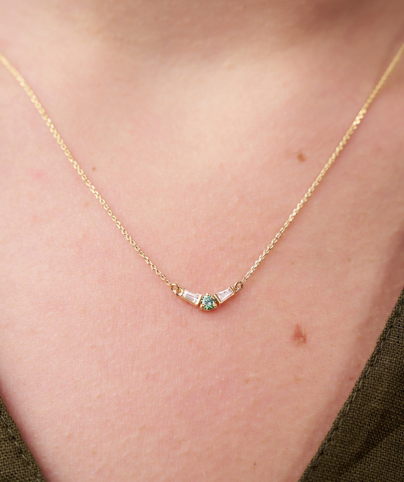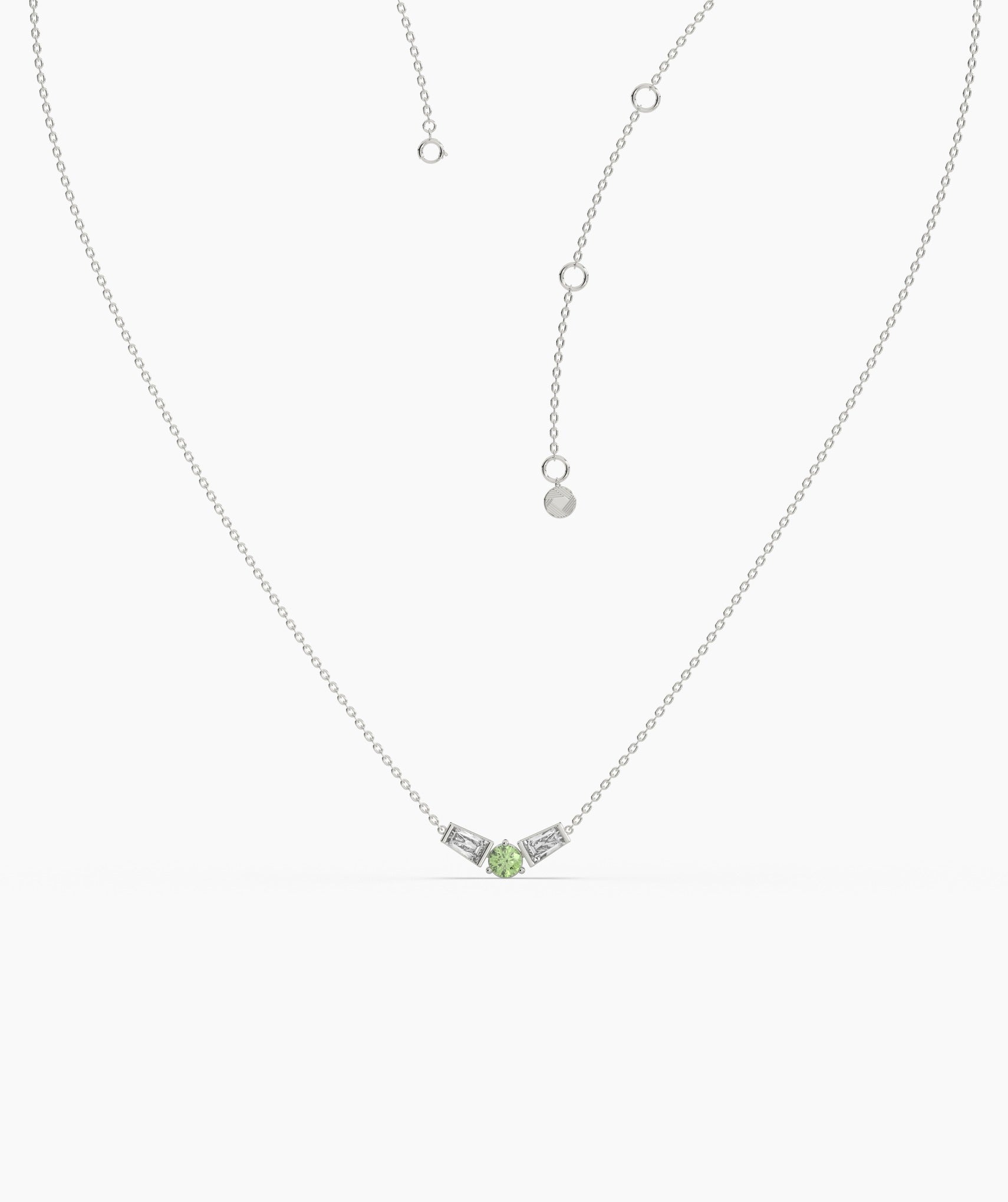 Elevate your style with this modern 14K gold necklace, featuring a bright green gem flanked by sleek, angular accents.