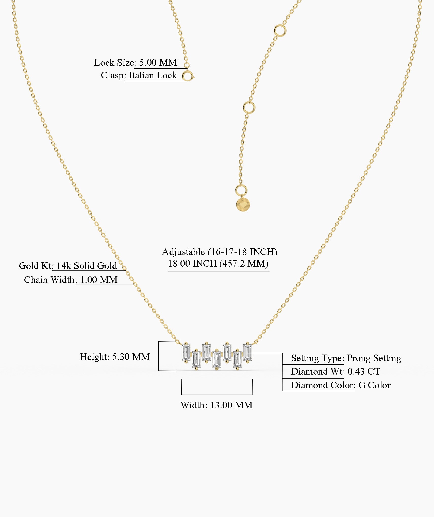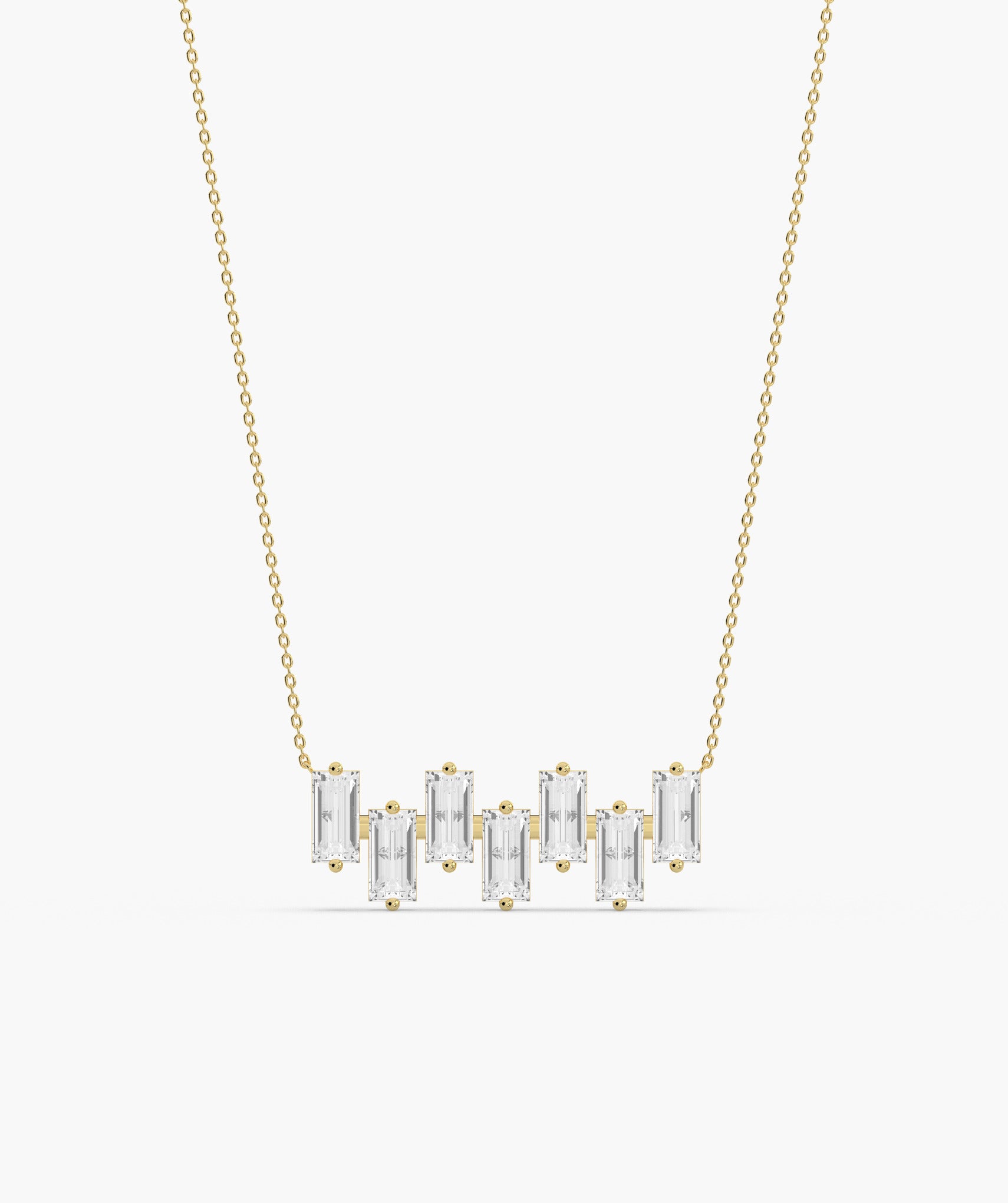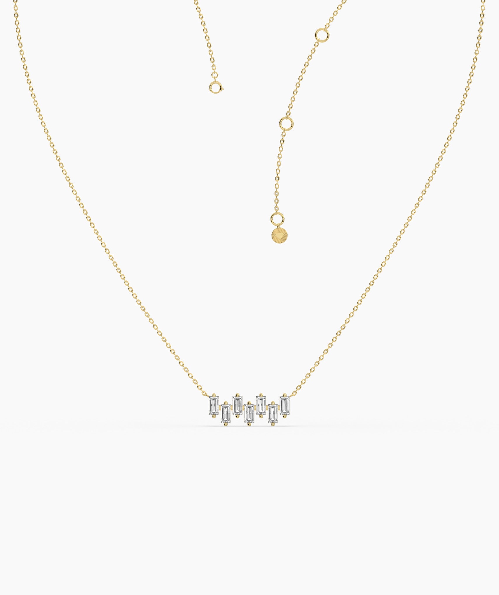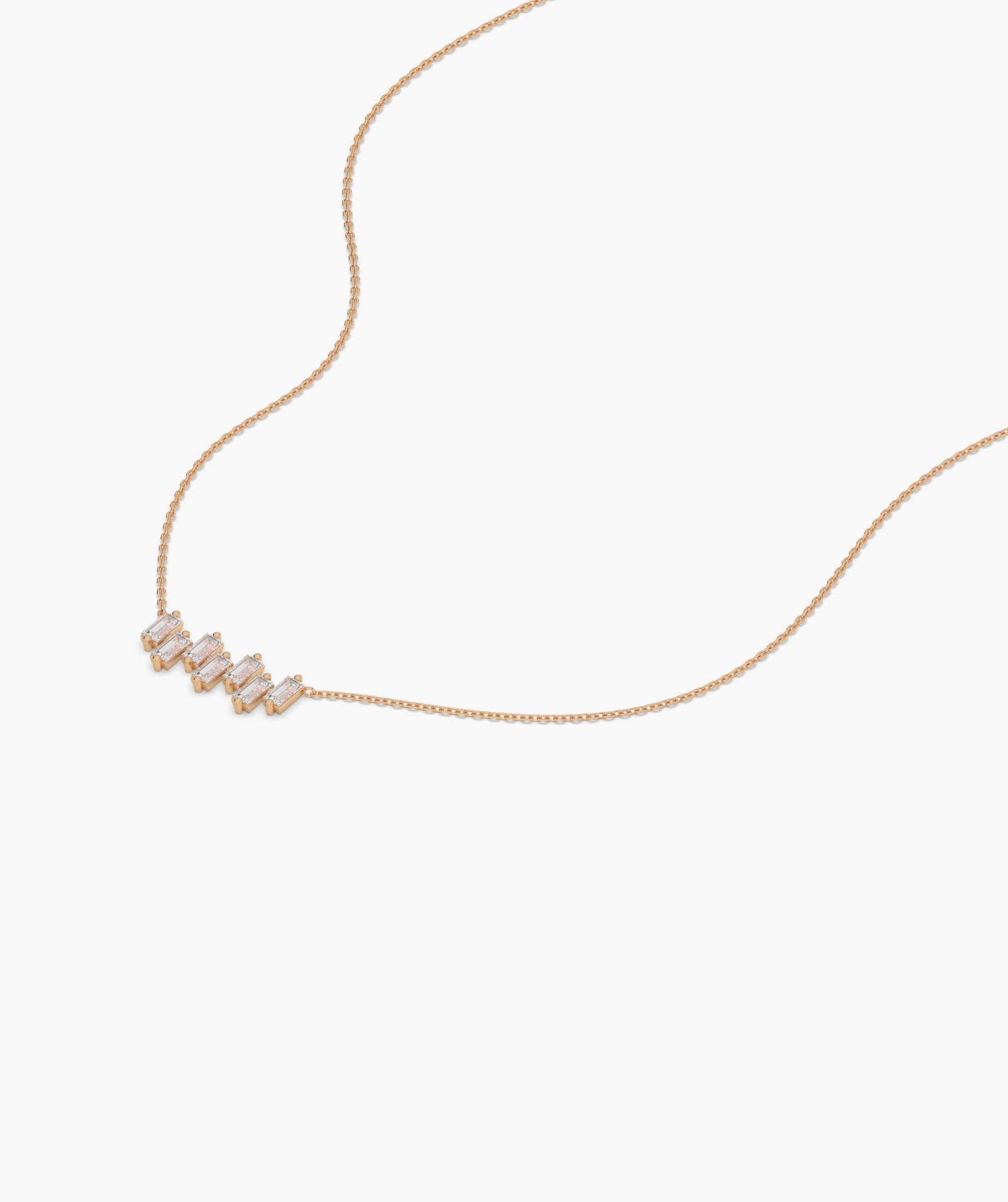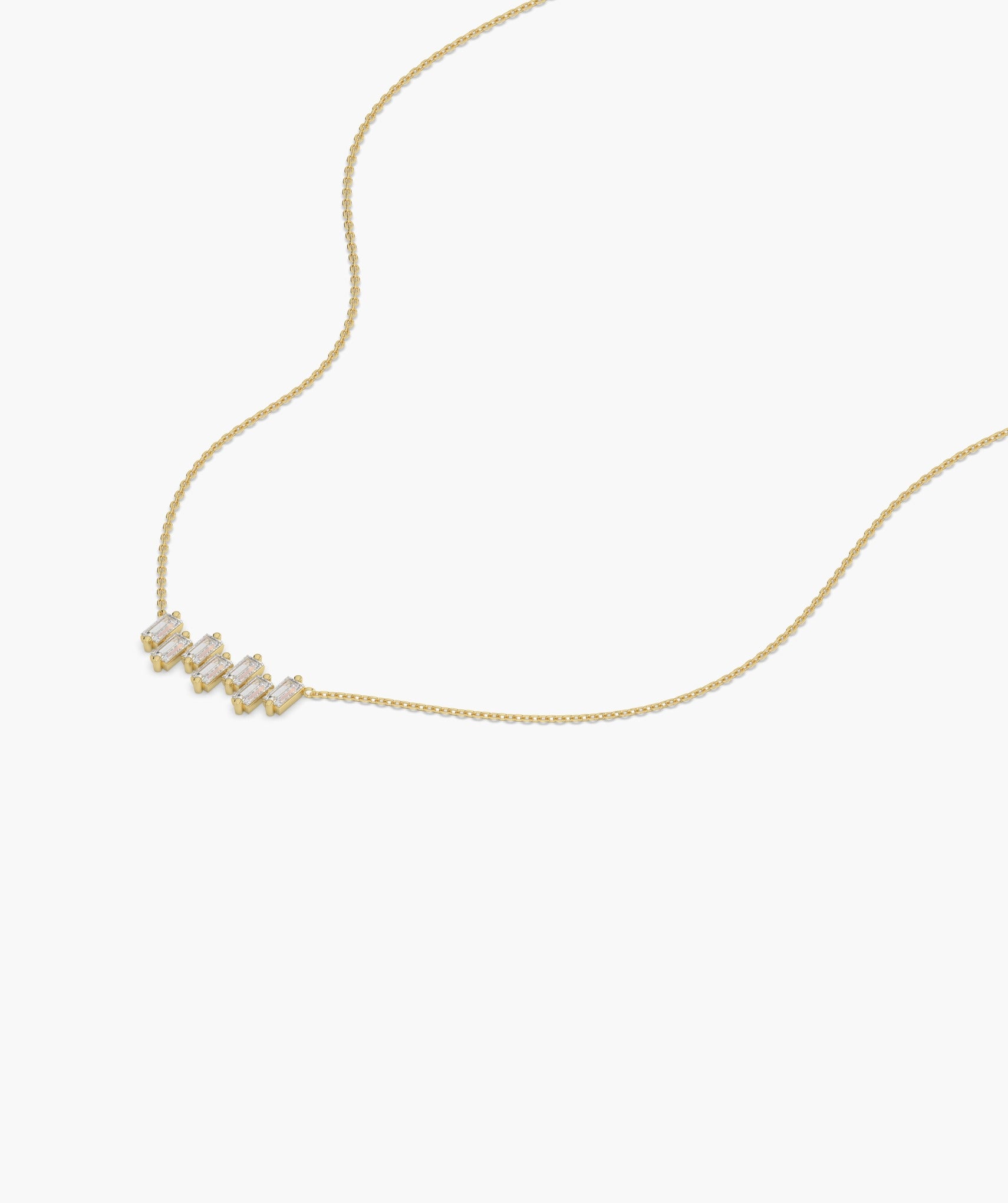 This 14K solid gold necklace elegantly showcases a linear design of vertically set baguette diamonds, perfect for a touch of contemporary luxury.