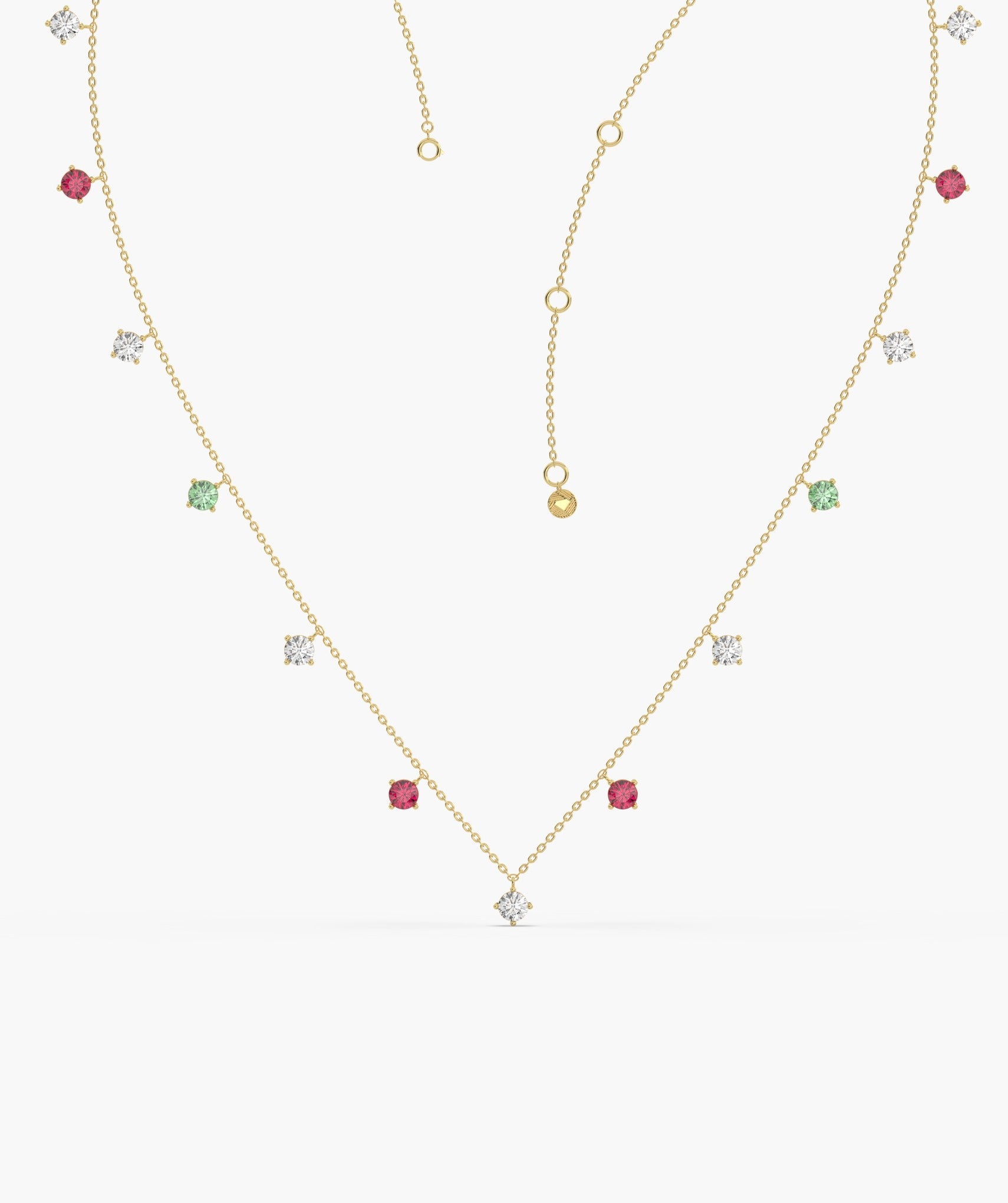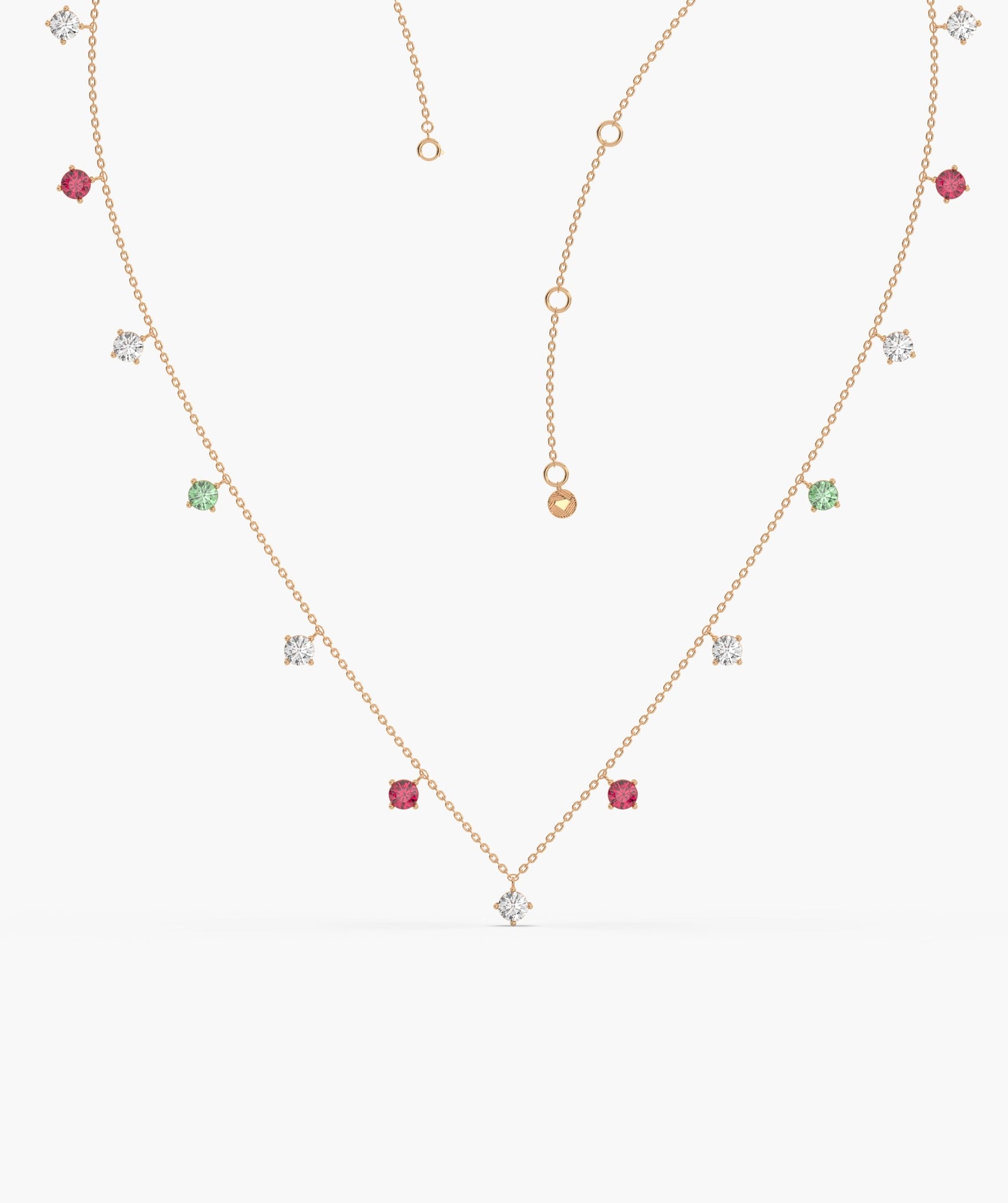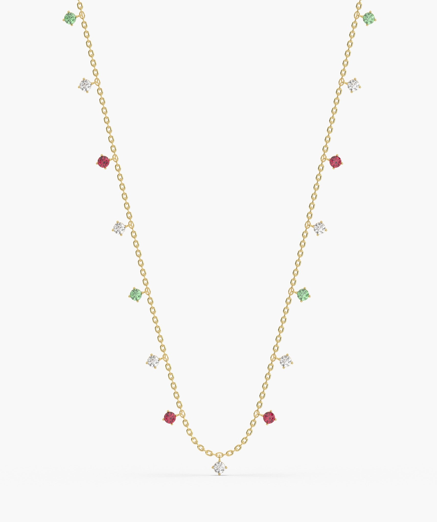 14K gold necklace dotted with colorful diamonds including red, green, and sparkling white diamonds, perfect for adding a vibrant touch to your everyday style.