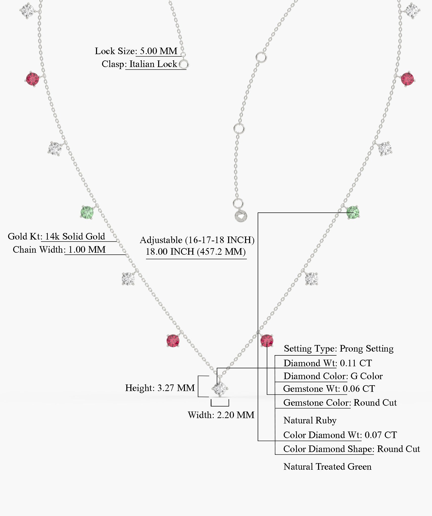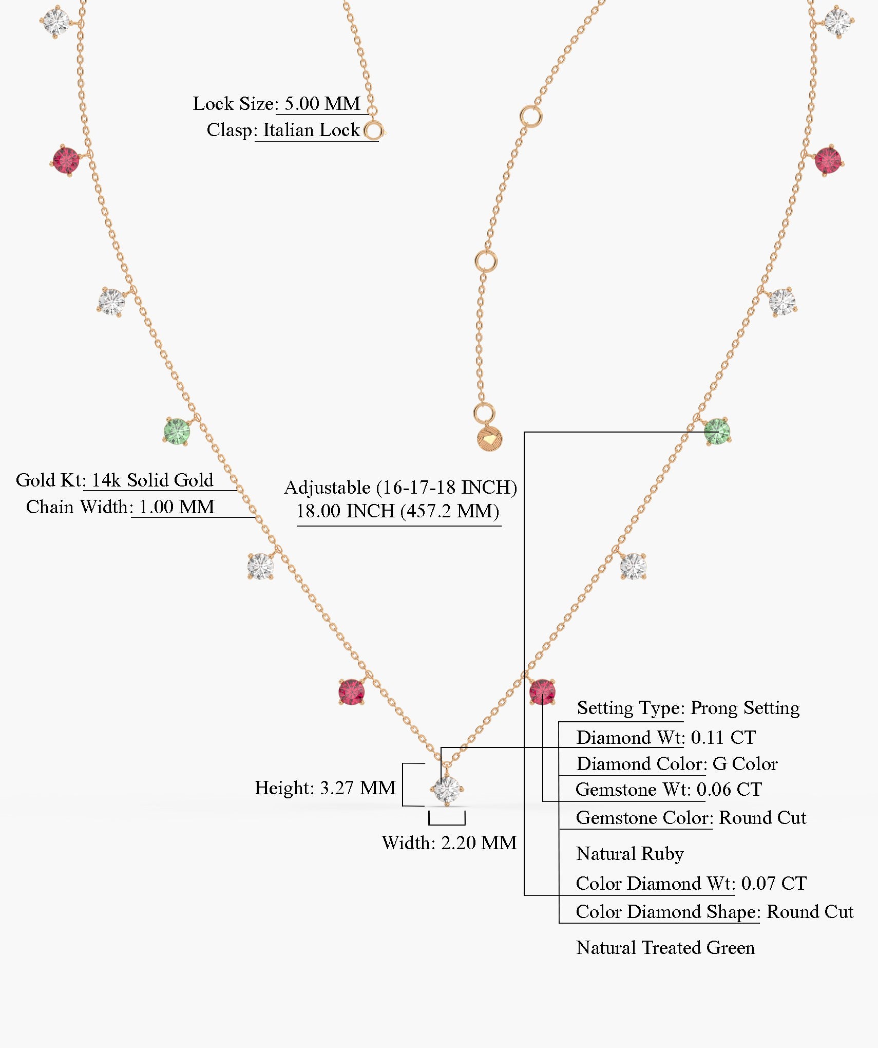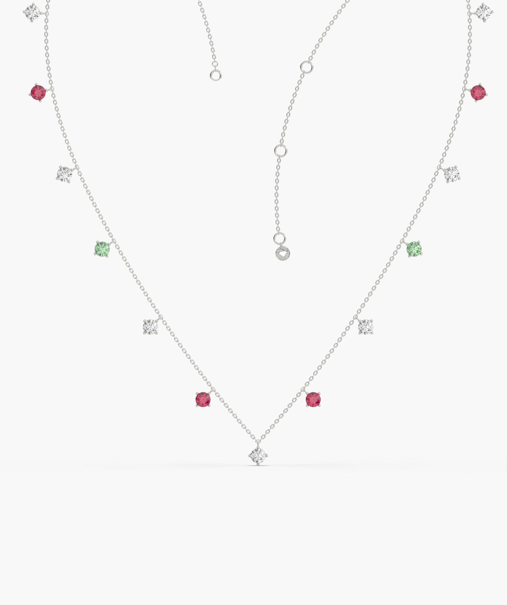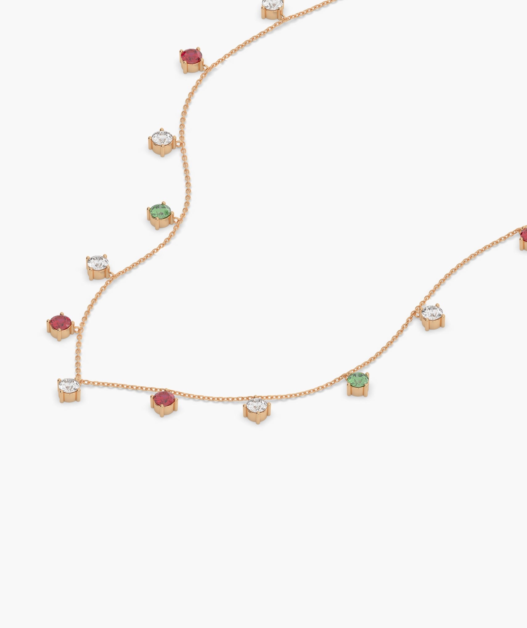 14K gold necklace dotted with colorful diamonds including red, green, and sparkling white diamonds, perfect for adding a vibrant touch to your everyday style.