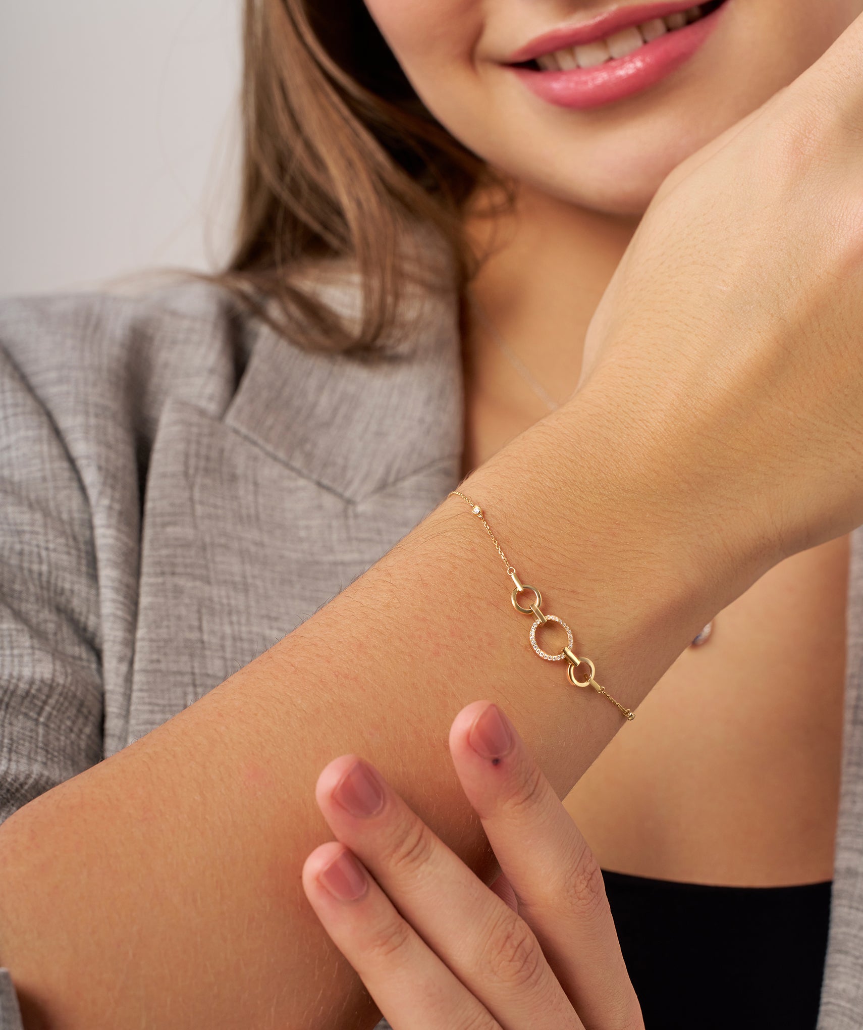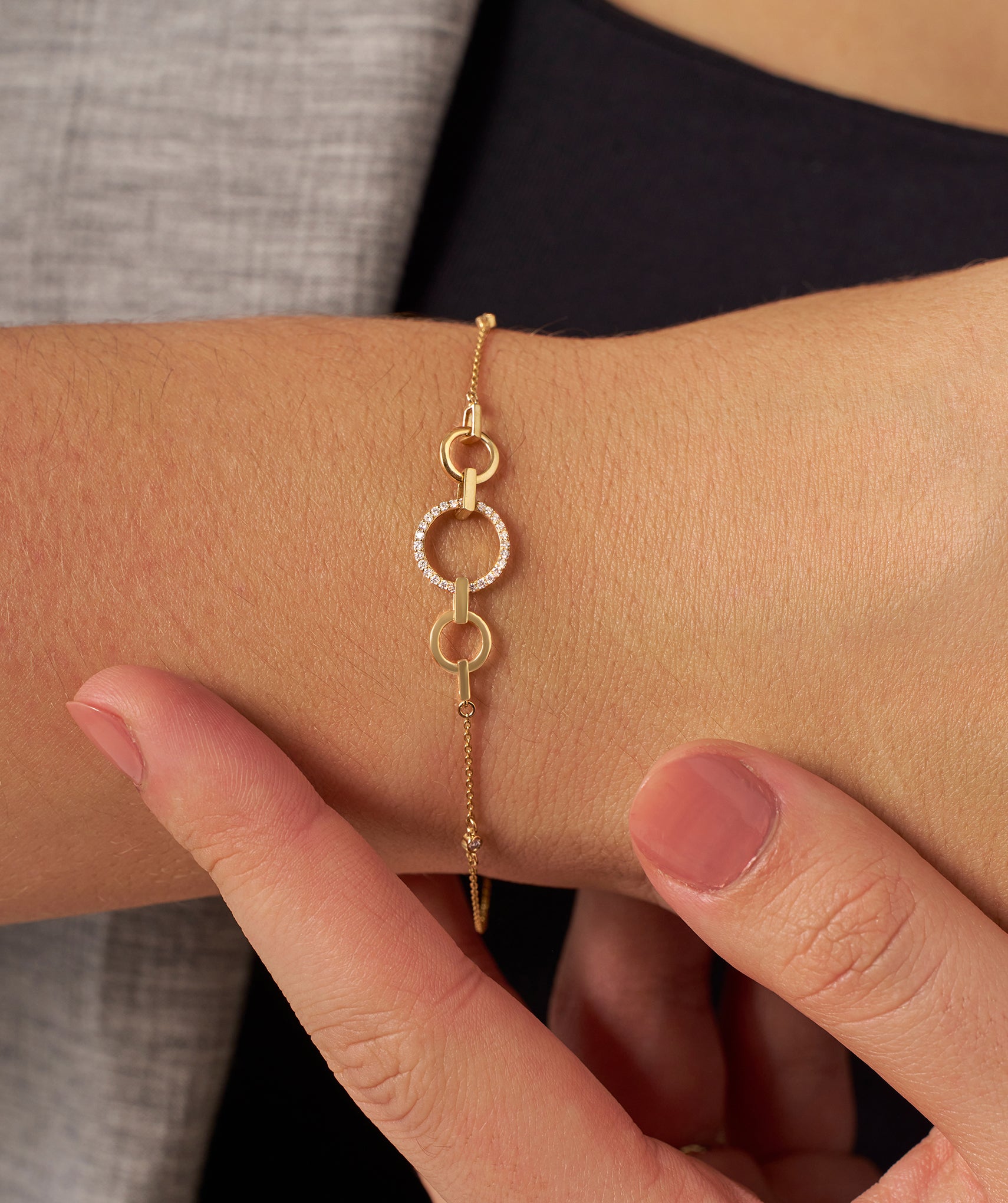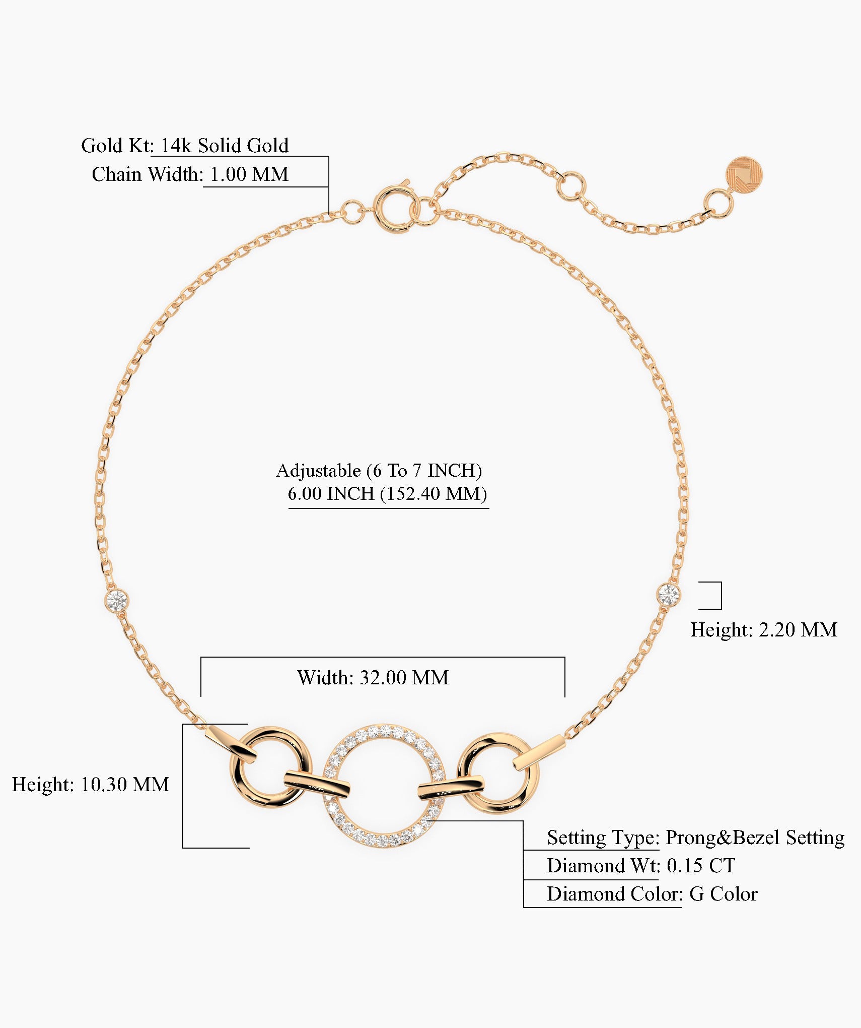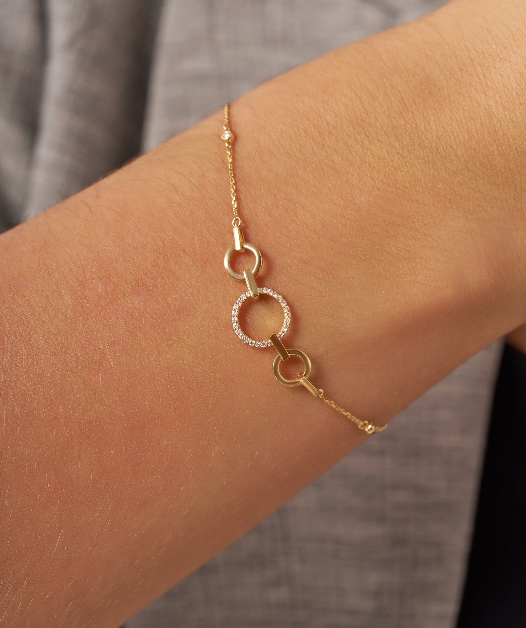 Embrace elegance with this 14K solid gold bracelet, featuring a unique design of interconnected circles, one adorned with sparkling diamonds.