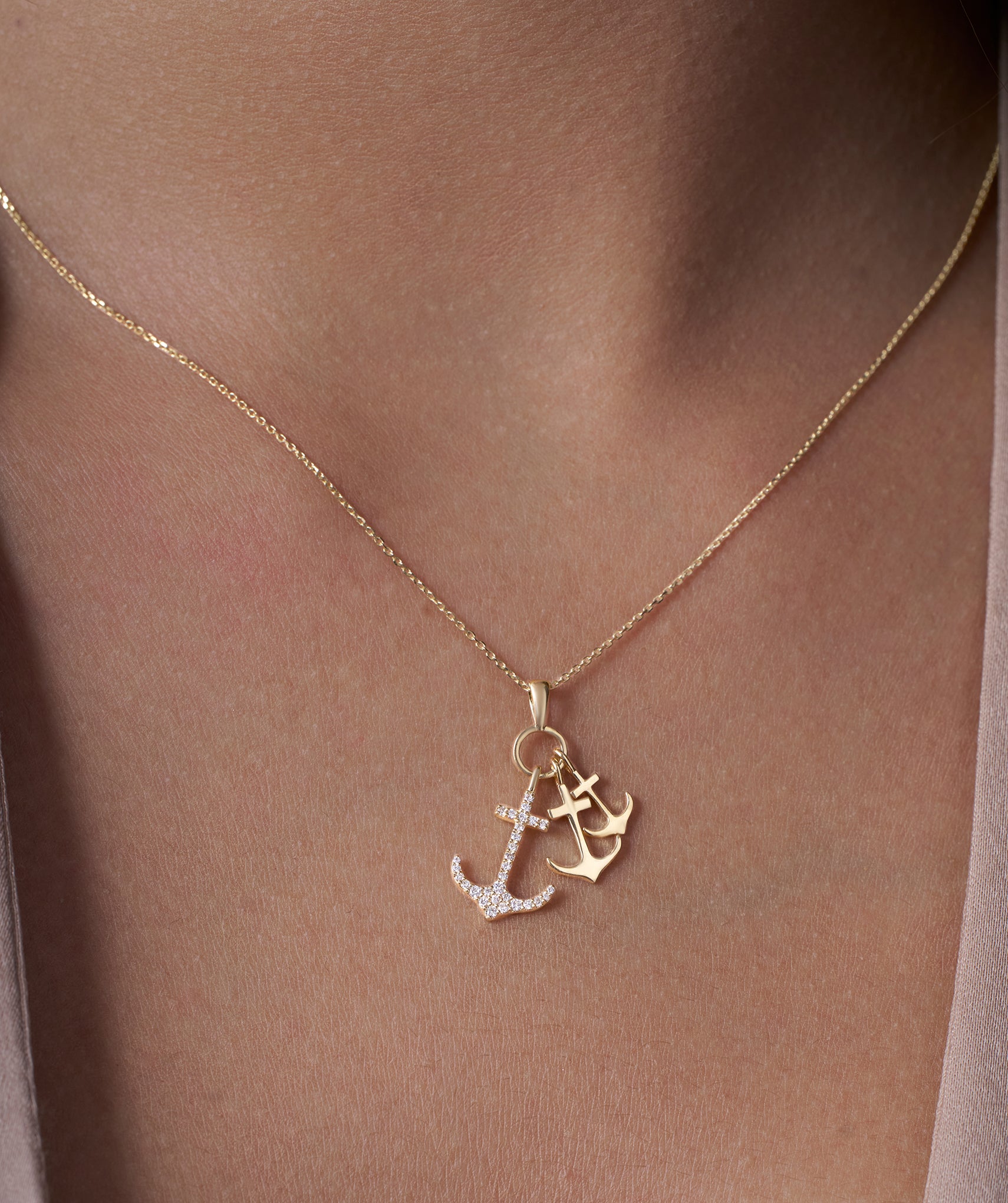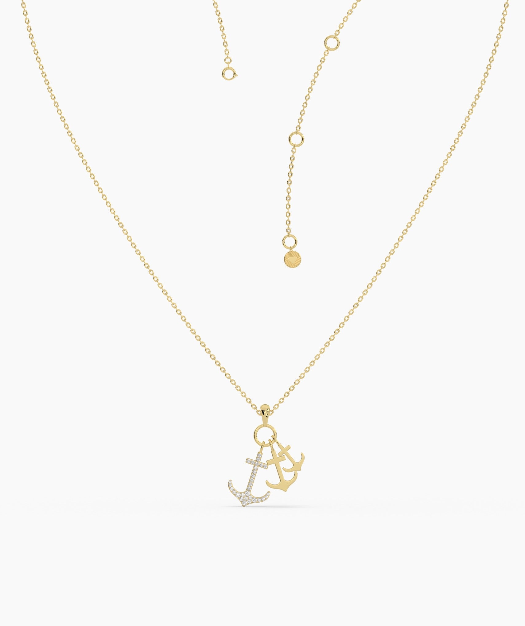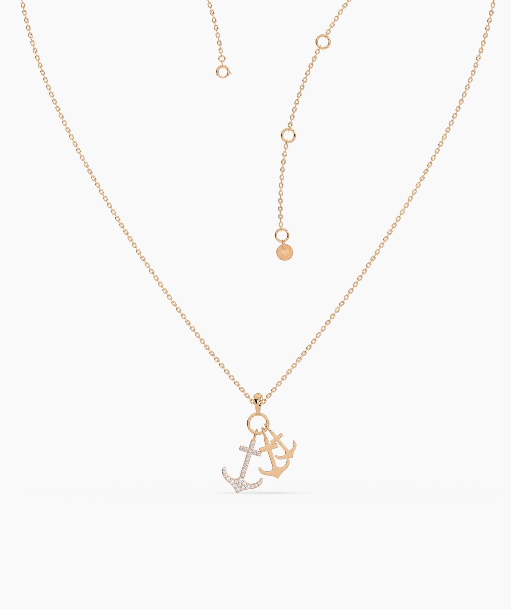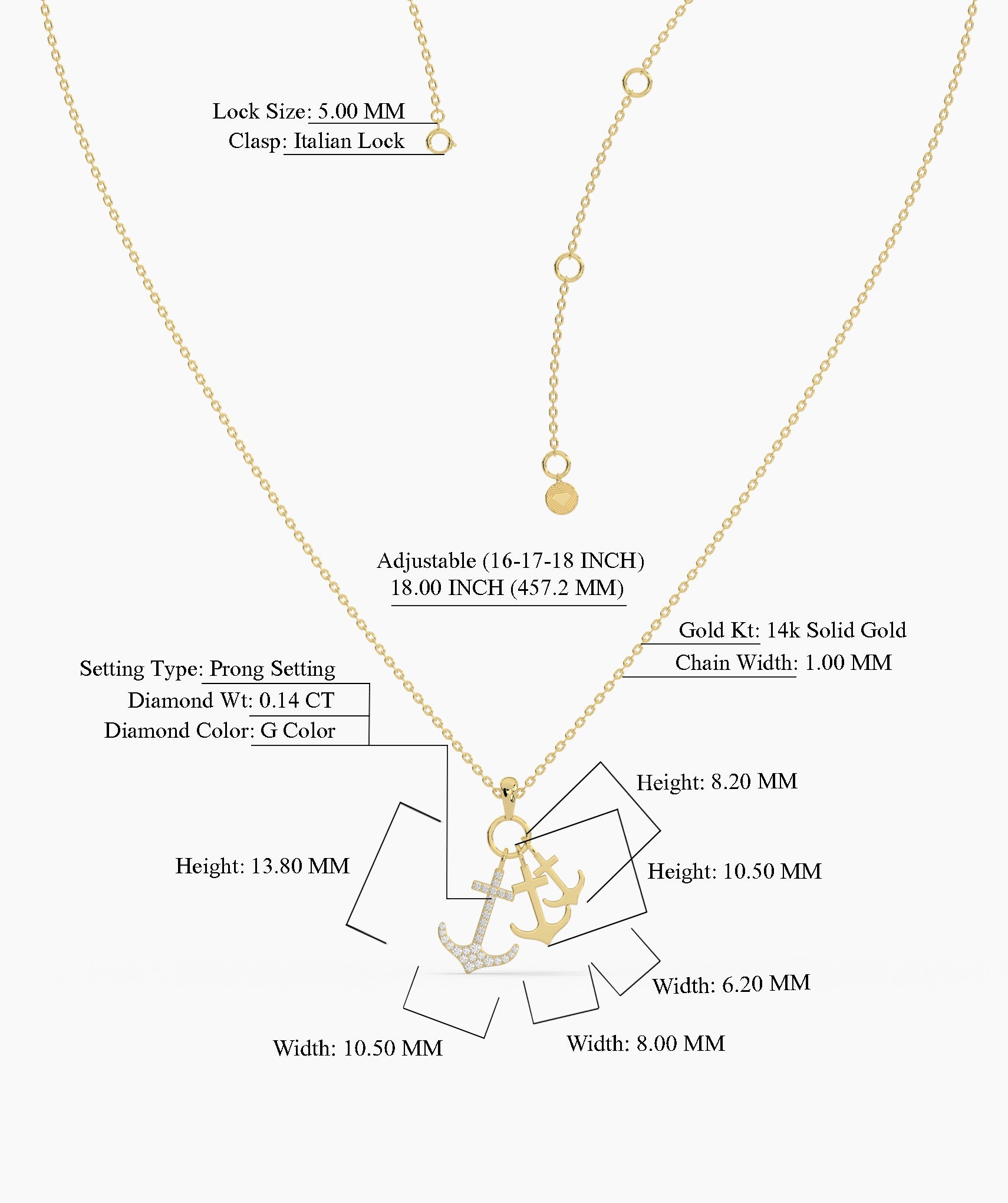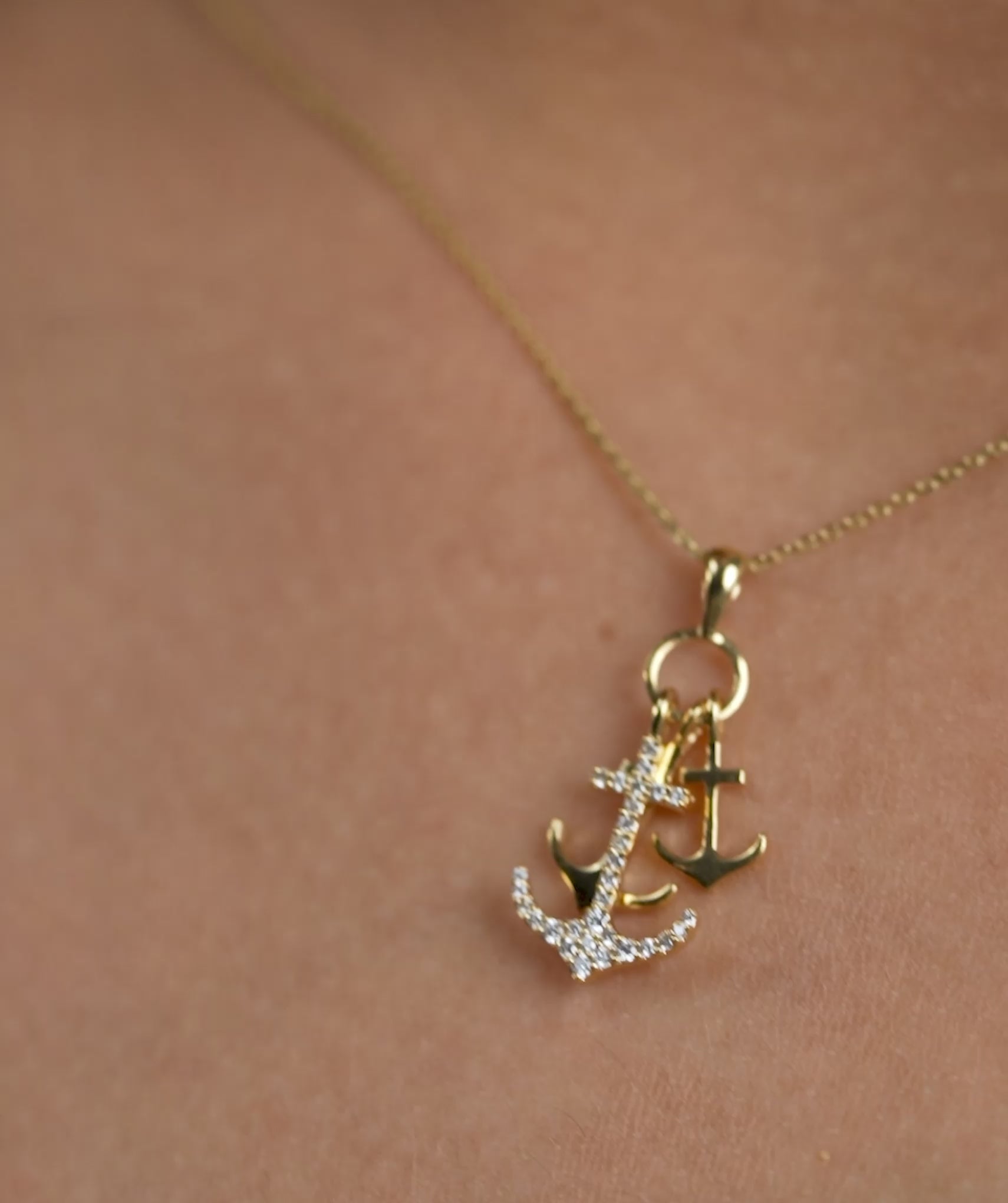 This striking 14K solid gold dual-tone anchor necklace, featuring diamond-encrusted anchors in silver and gold hues.