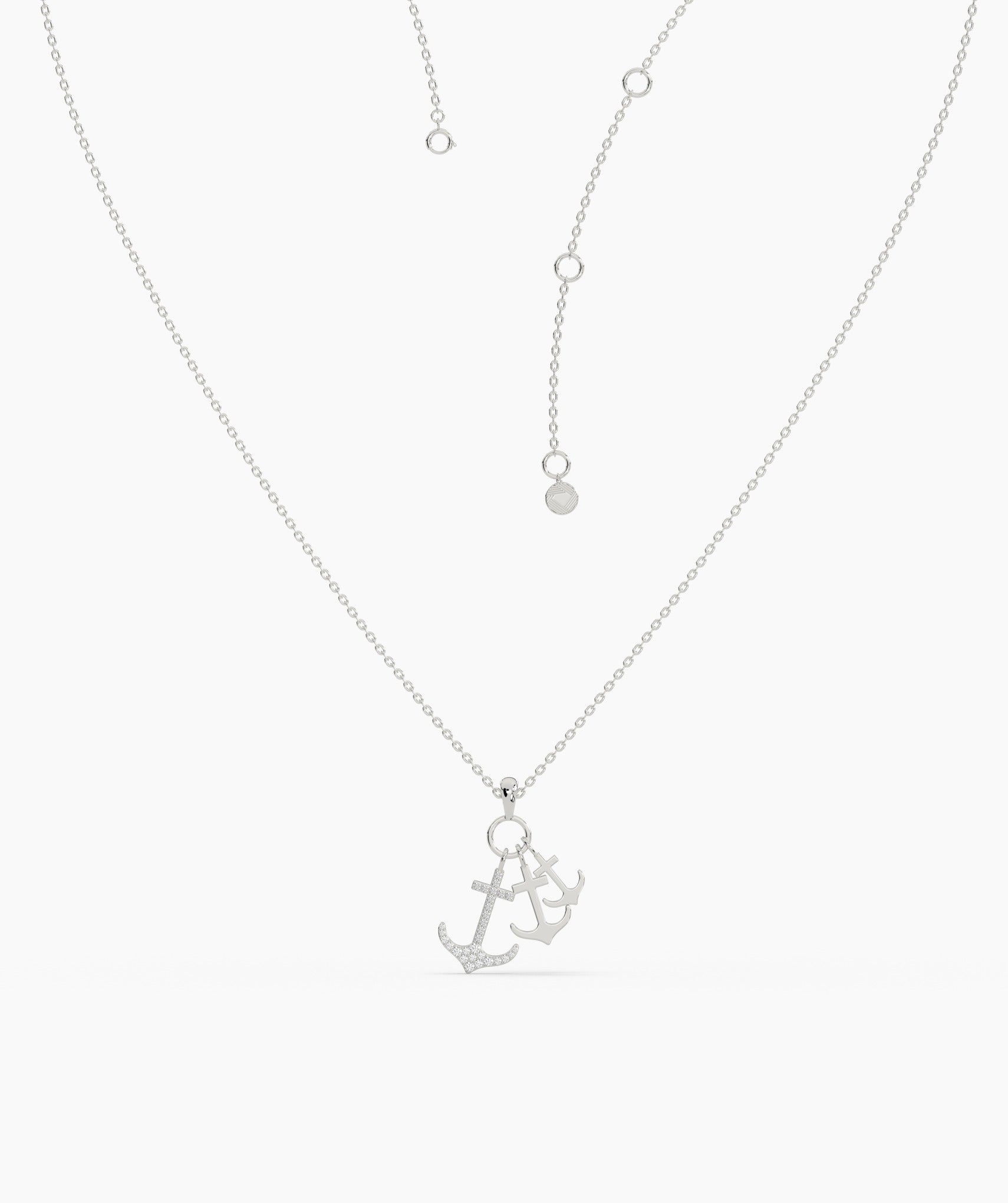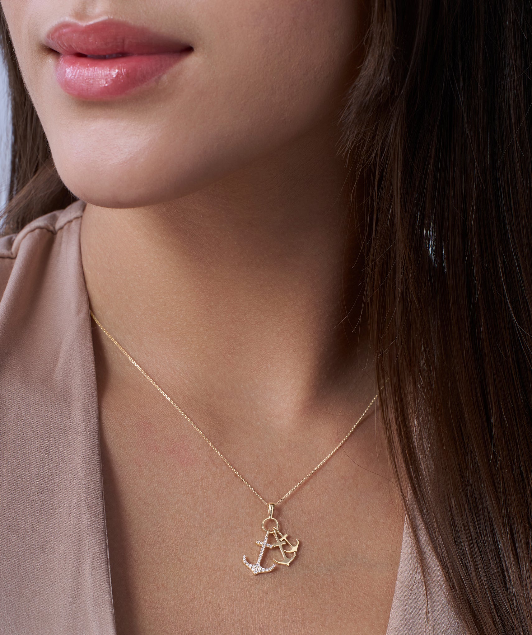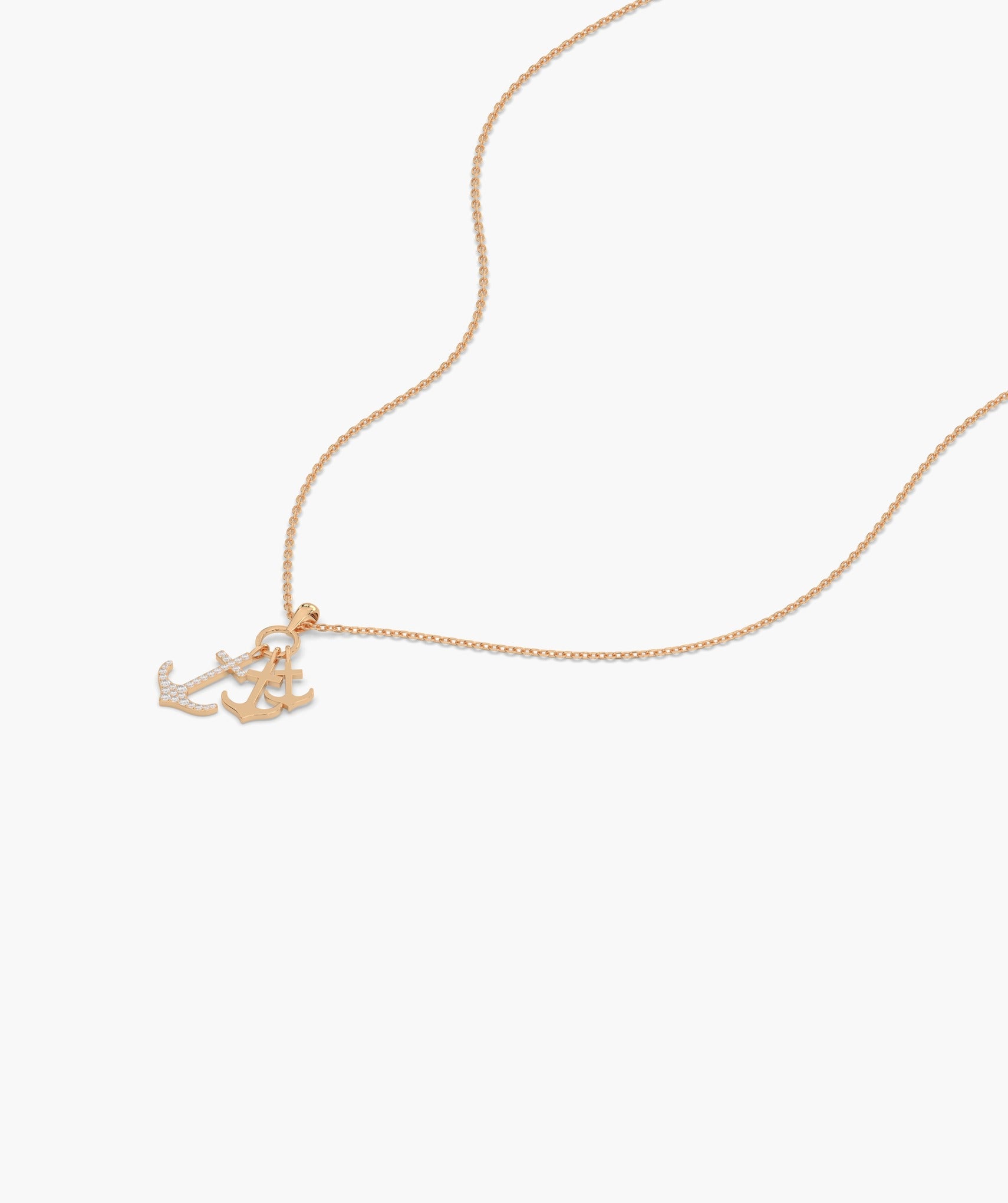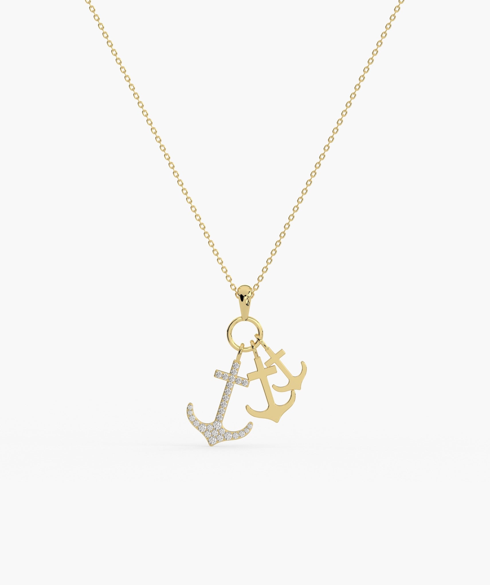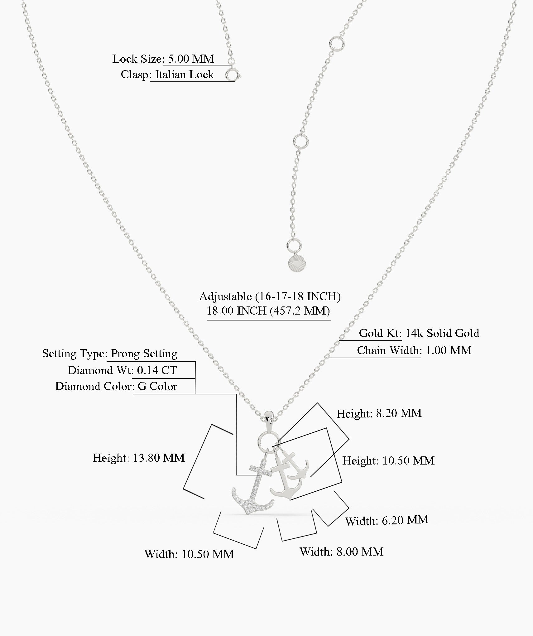 This striking 14K solid gold dual-tone anchor necklace, featuring diamond-encrusted anchors in silver and gold hues.