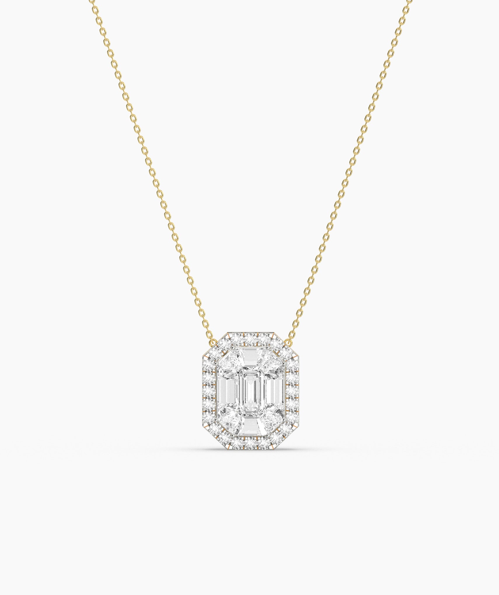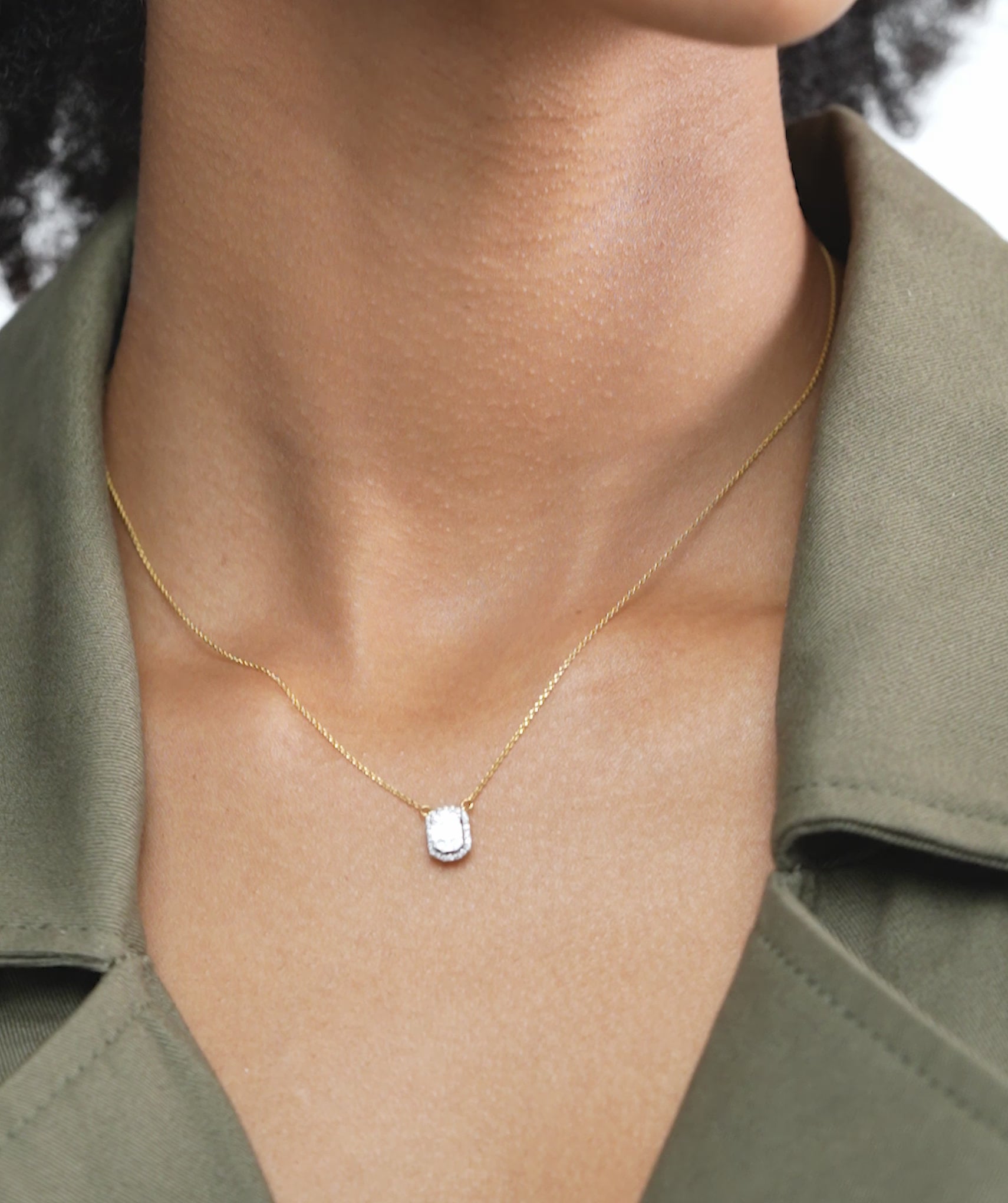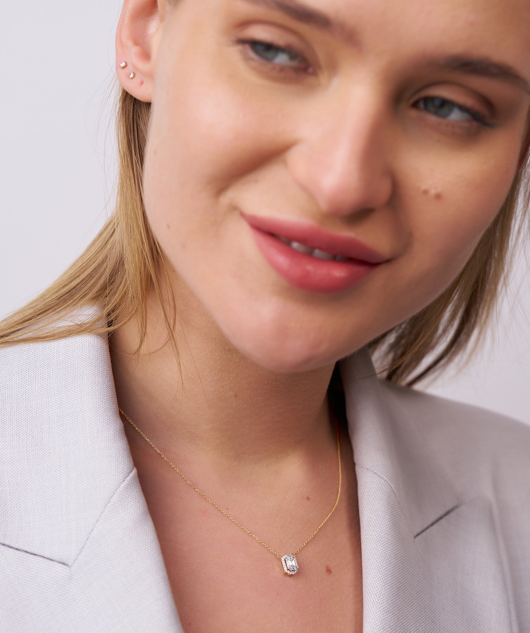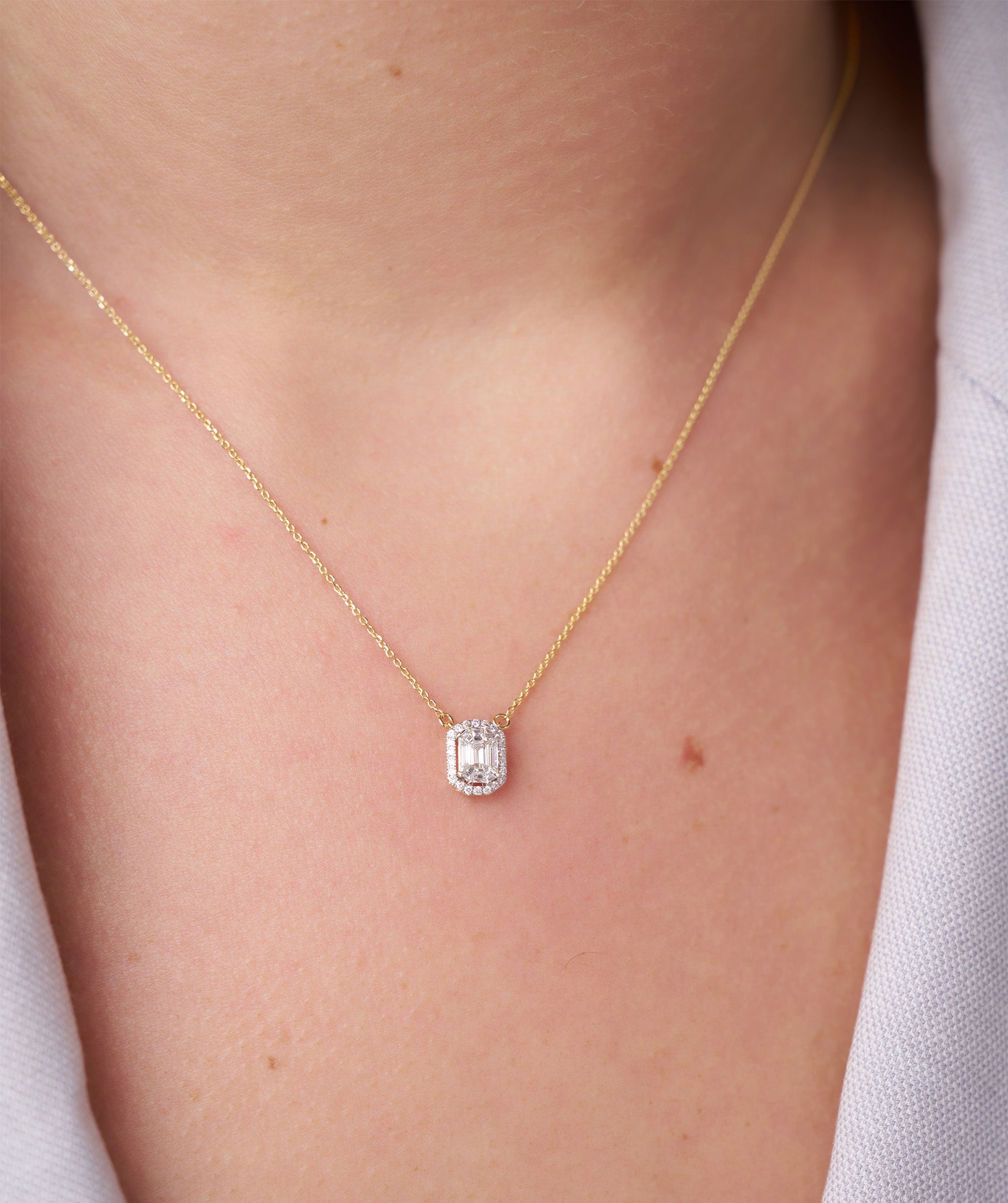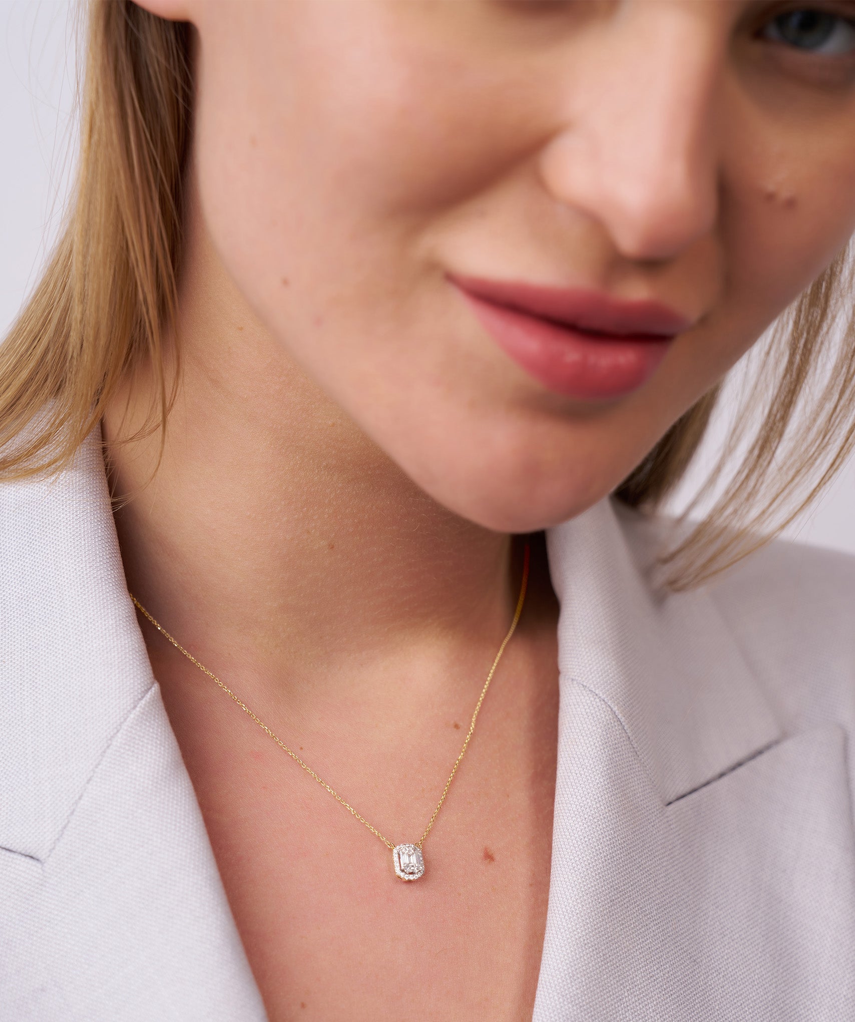 A nod to Art Deco style—this 14K gold necklace showcases a geometric halo design that highlights the diamond’s mesmerizing facets.
