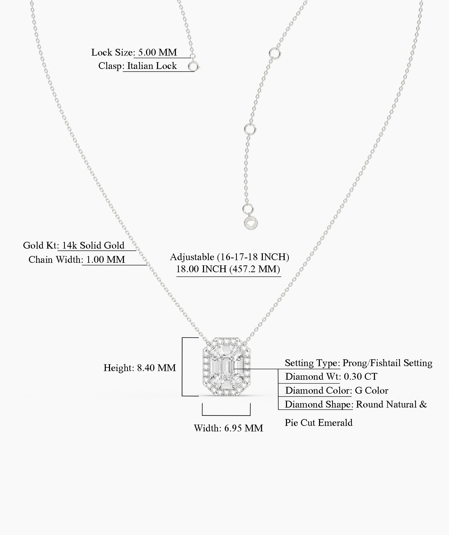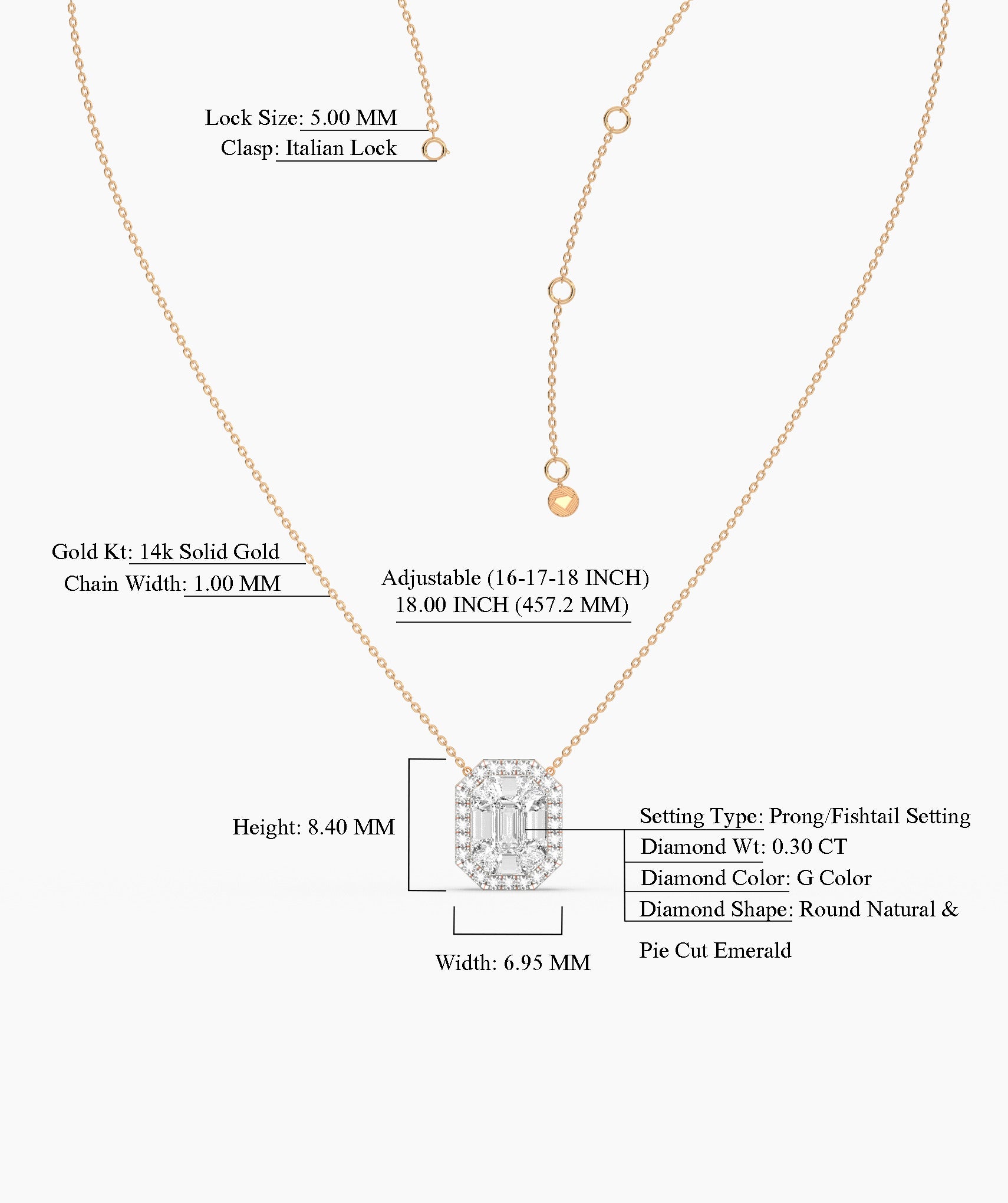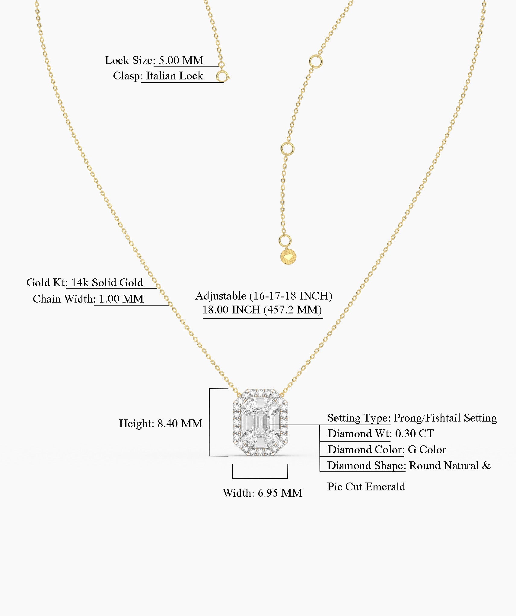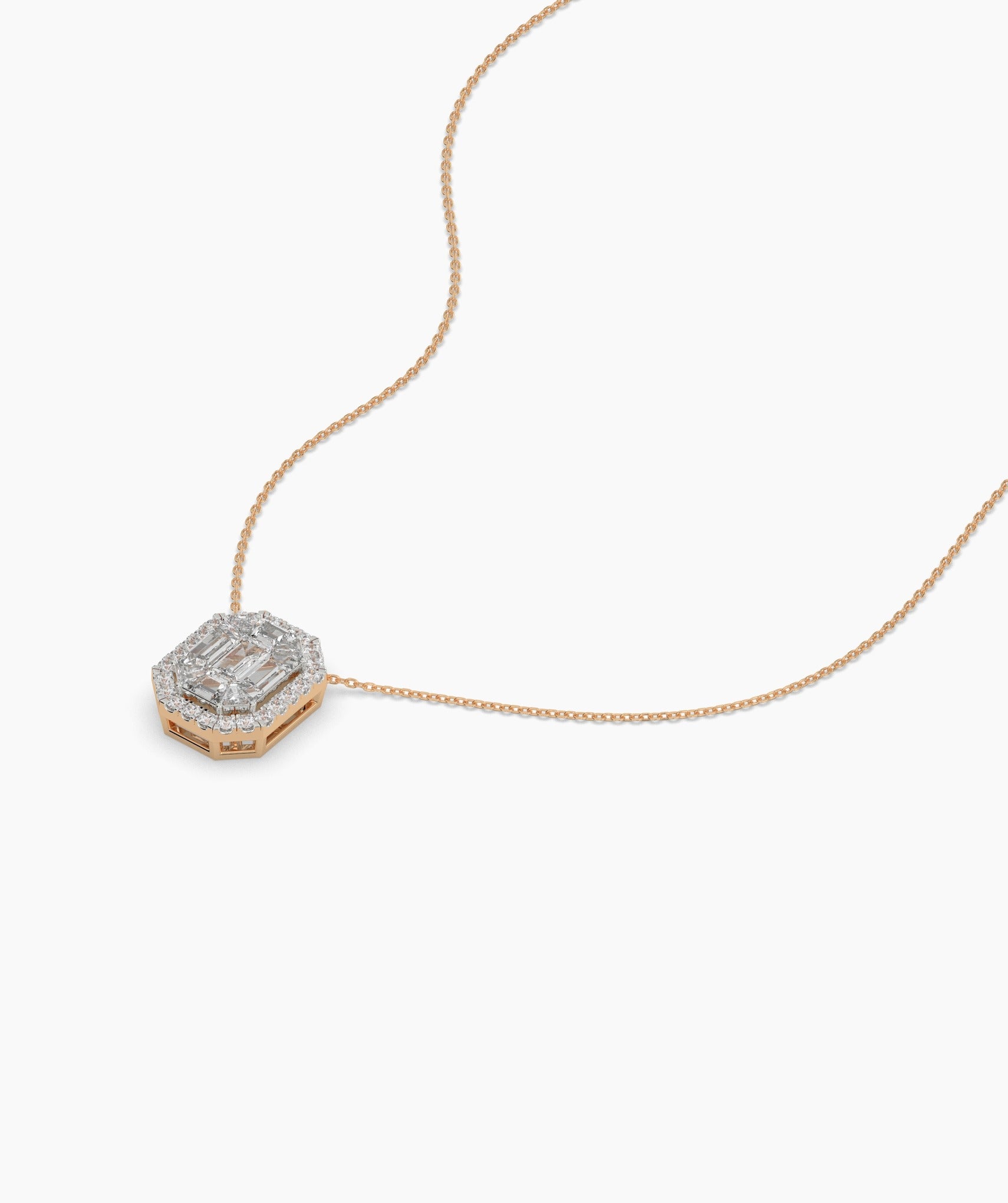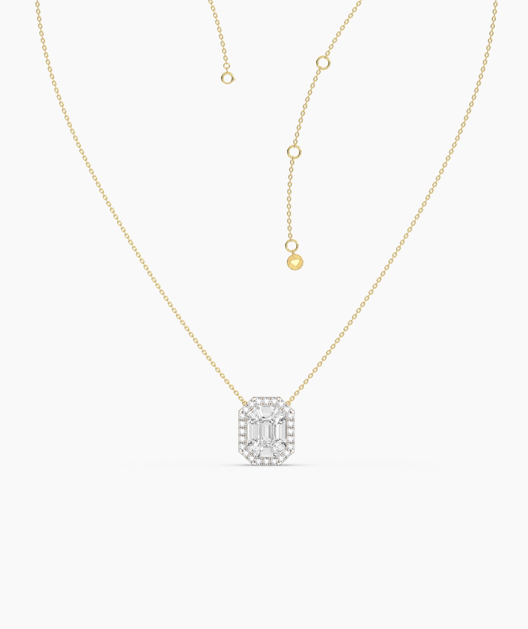 A nod to Art Deco style—this 14K gold necklace showcases a geometric halo design that highlights the diamond’s mesmerizing facets.
