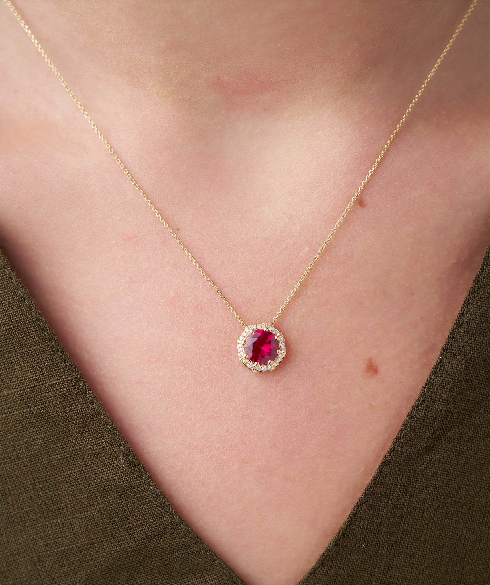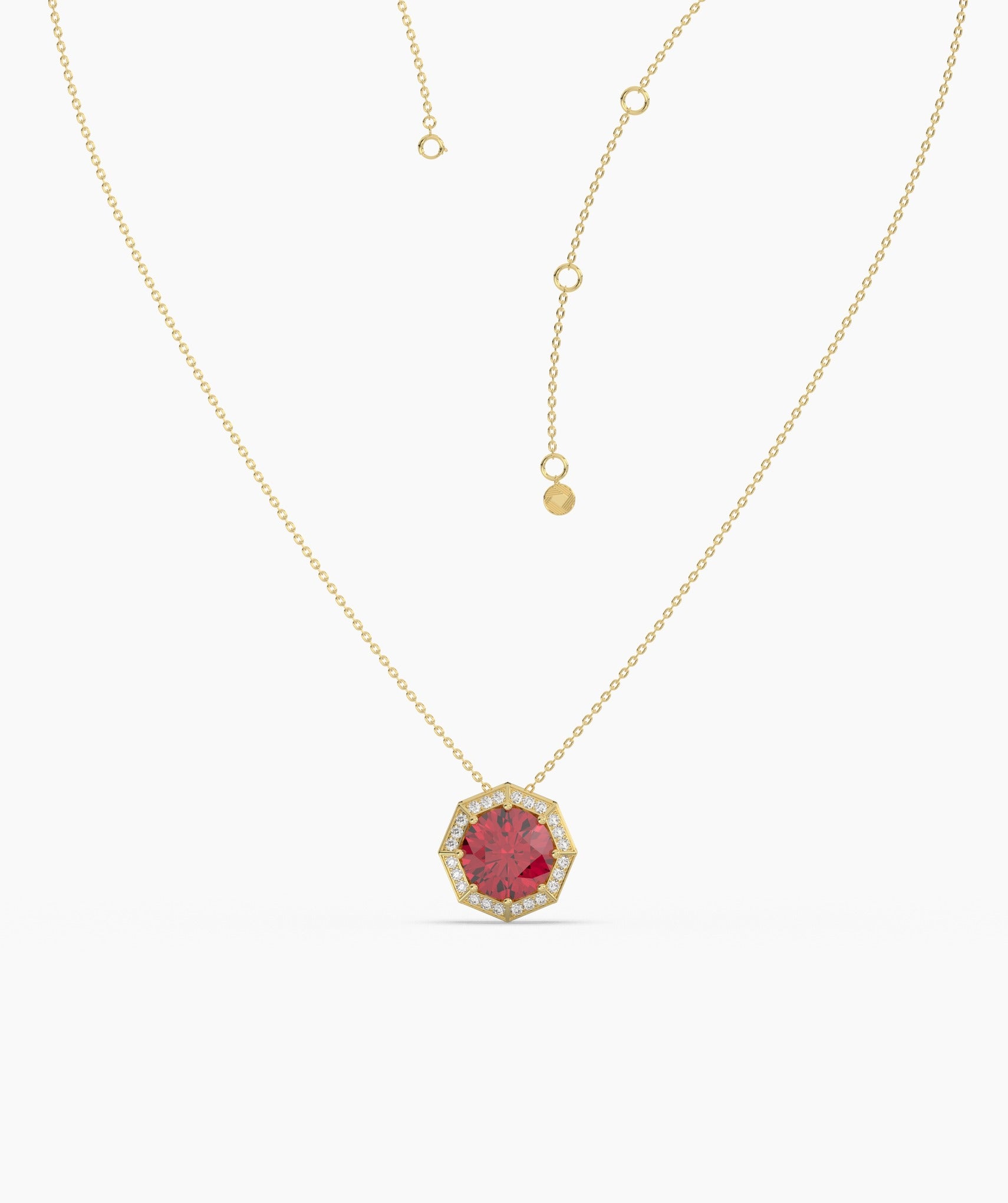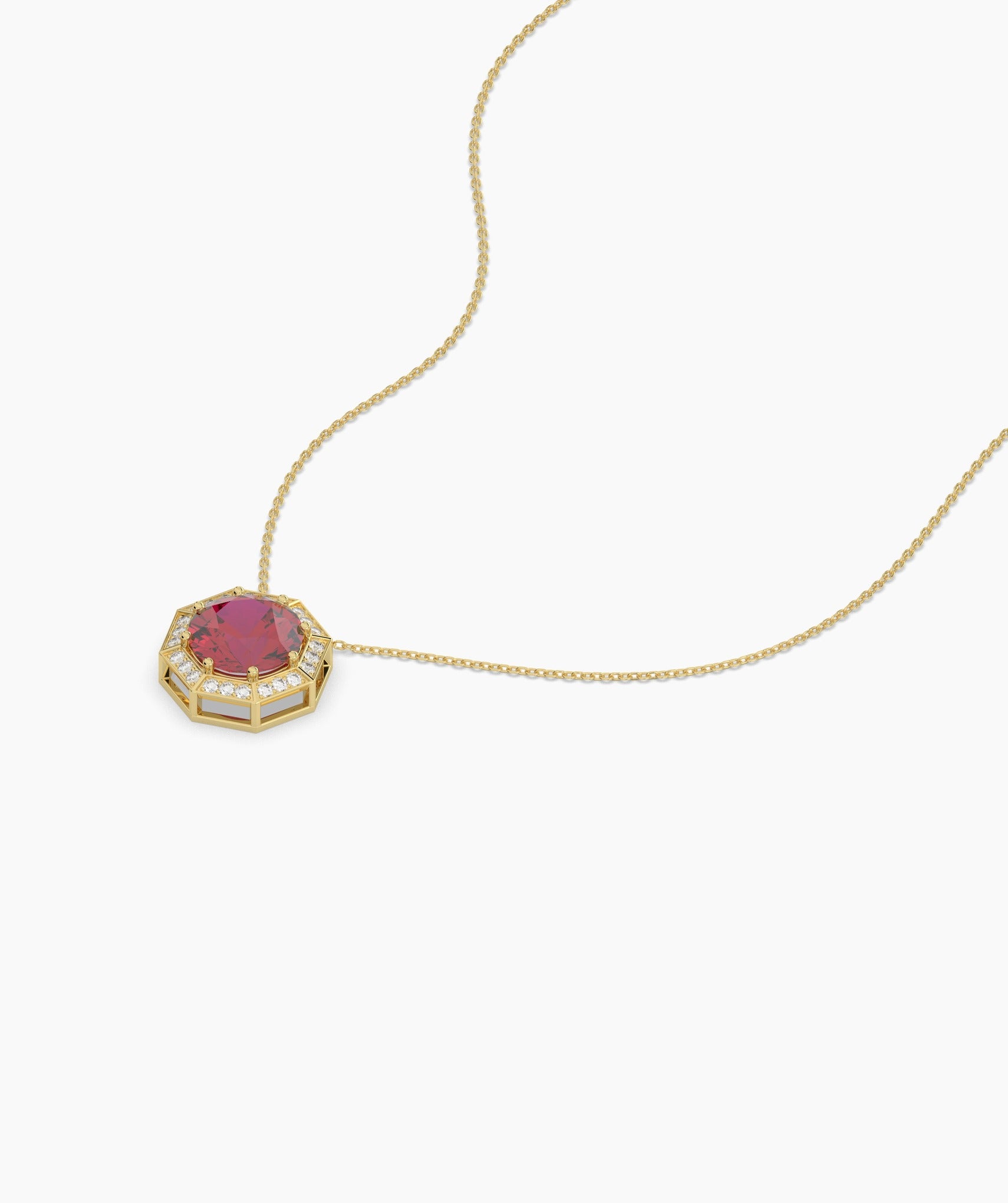 A striking blend of timeless elegance and modern design, this 14K gold necklace features a bold red gemstone in a unique octagonal setting.