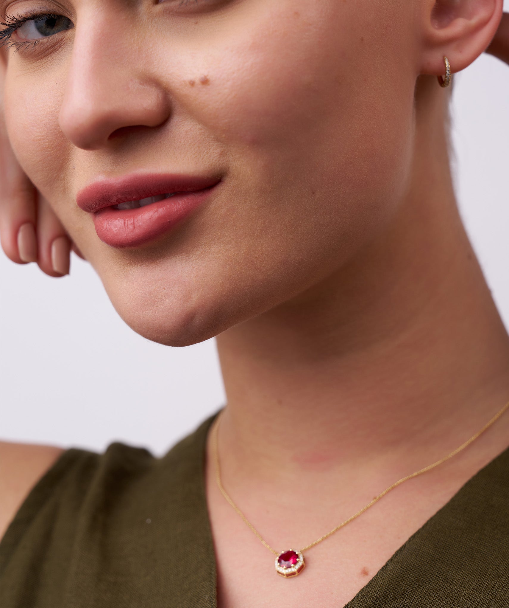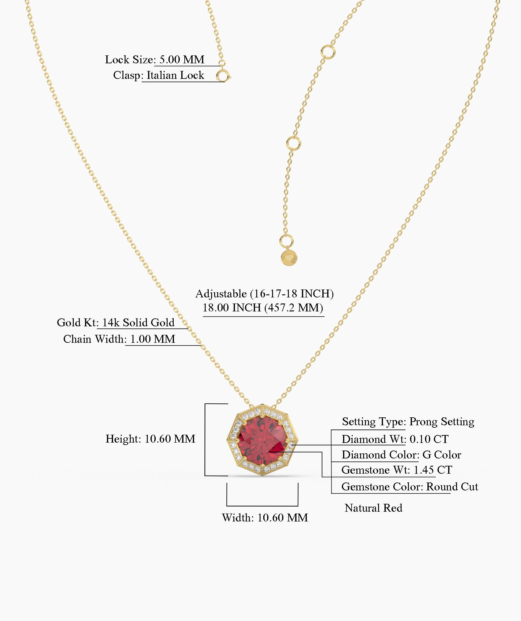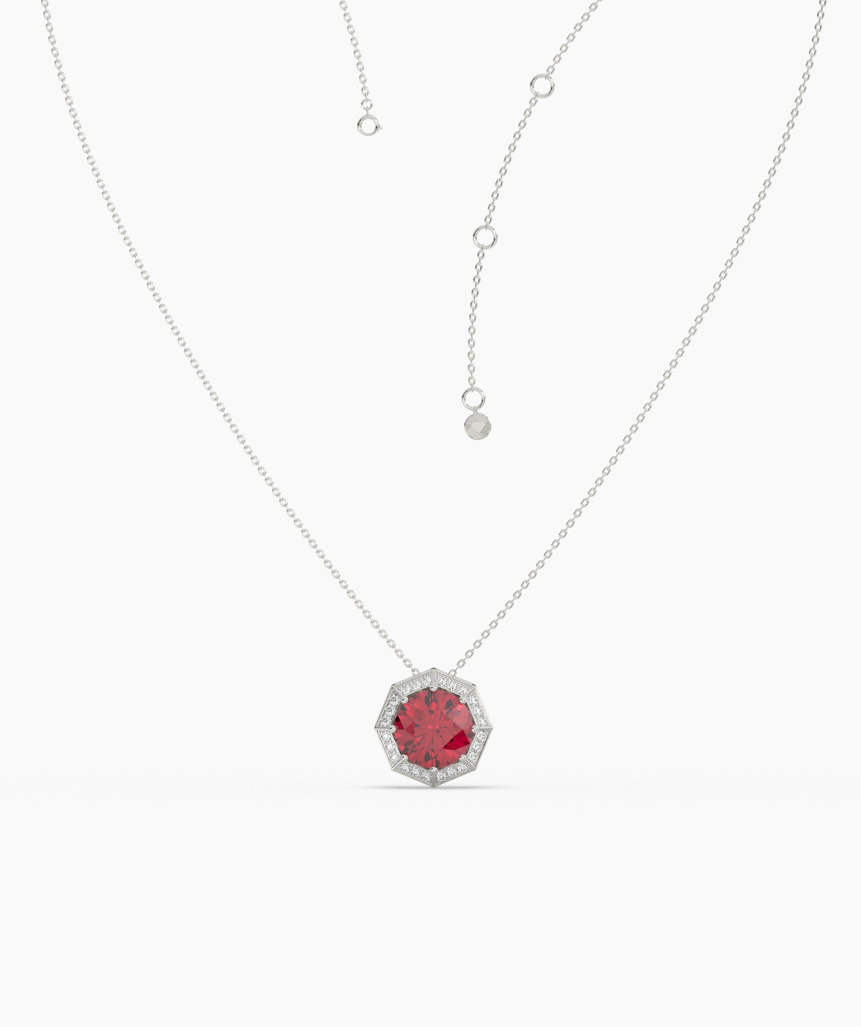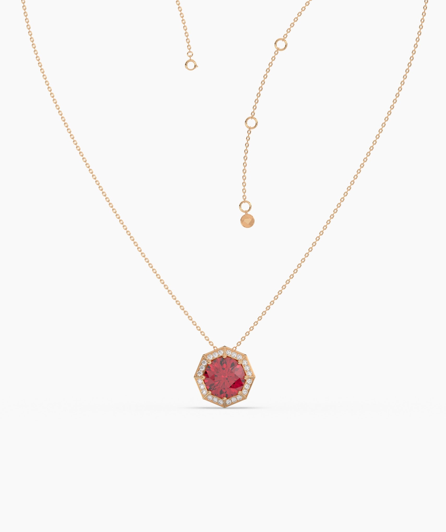 A striking blend of timeless elegance and modern design, this 14K gold necklace features a bold red gemstone in a unique octagonal setting.