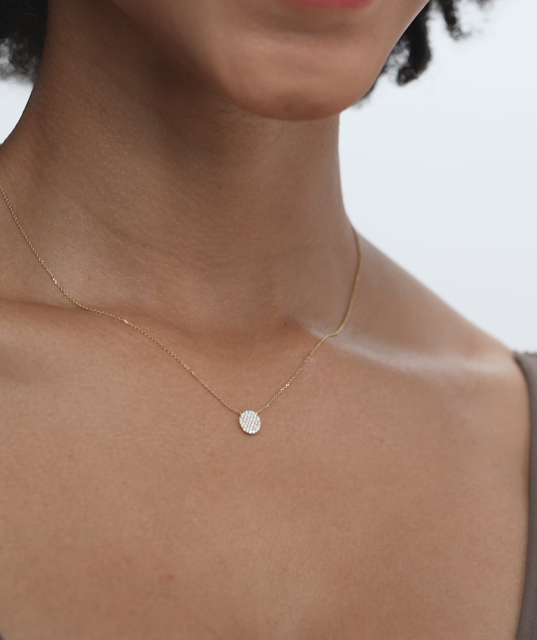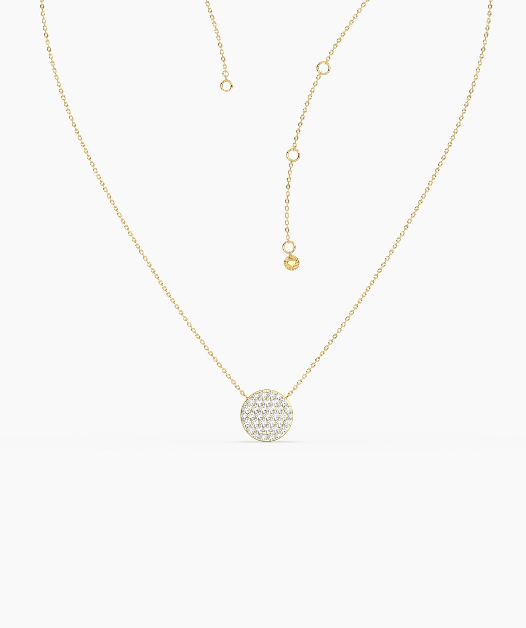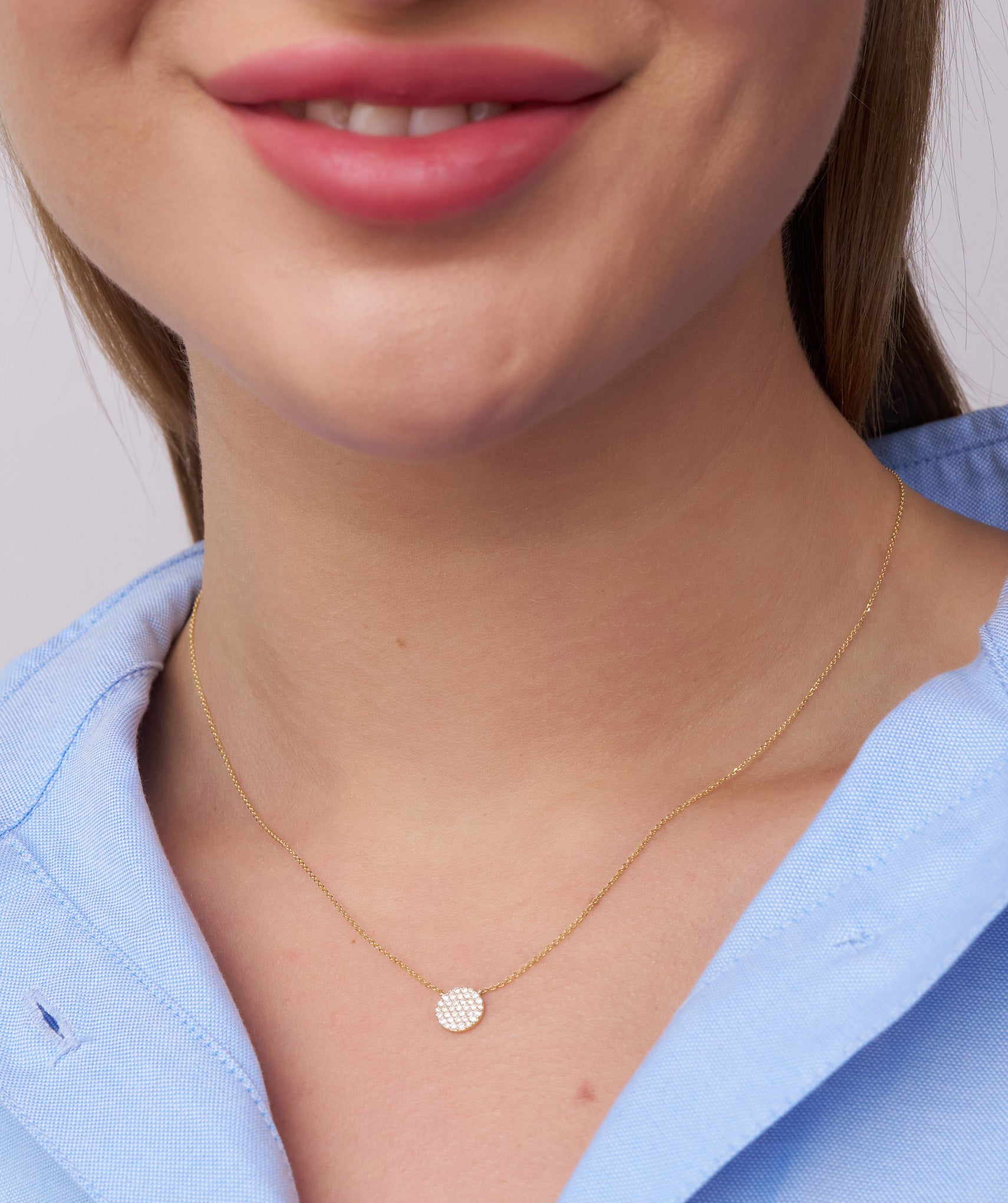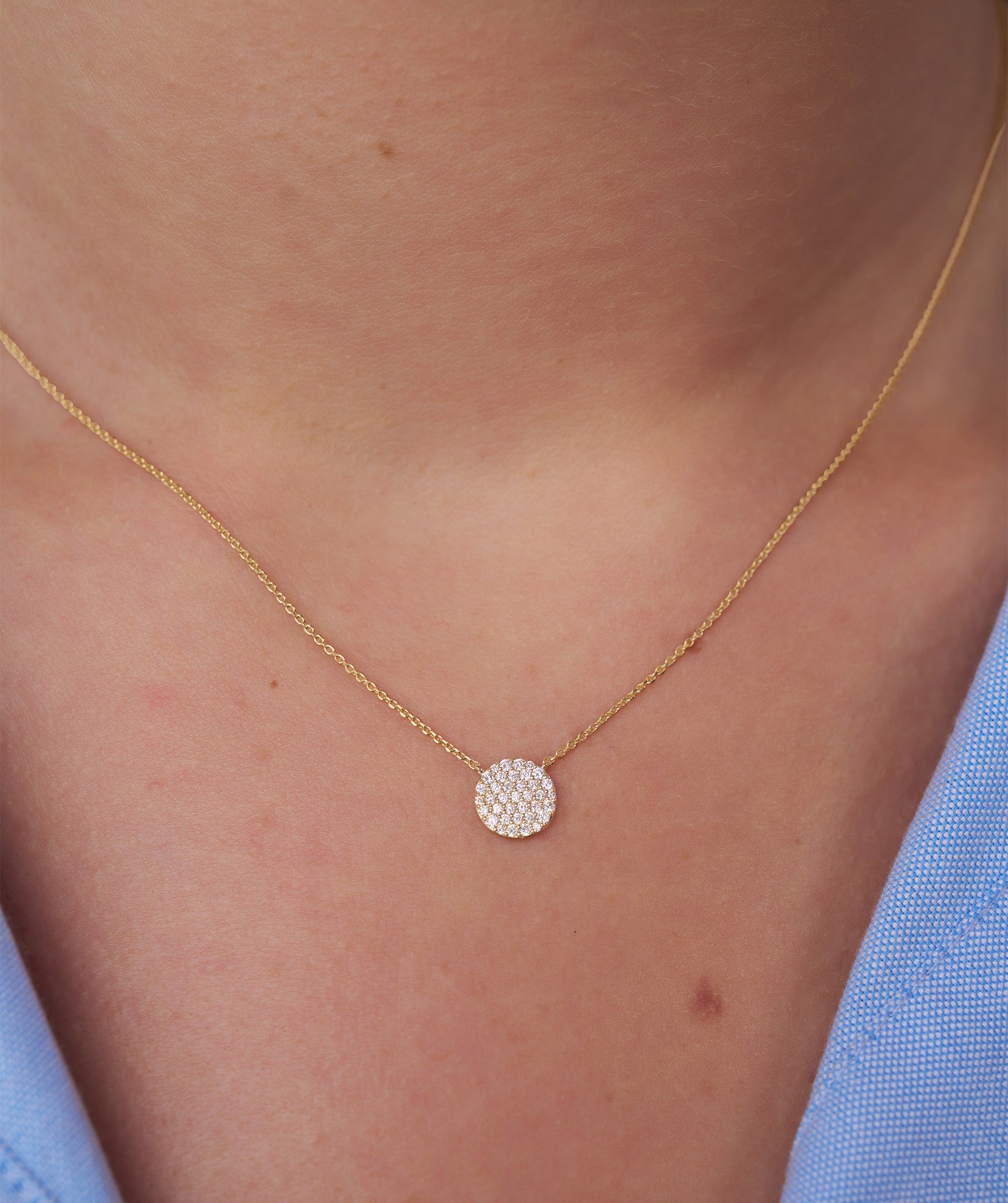 A stunning 14K gold circle pendant, fully set with sparkling pave diamonds—a timeless and elegant piece.