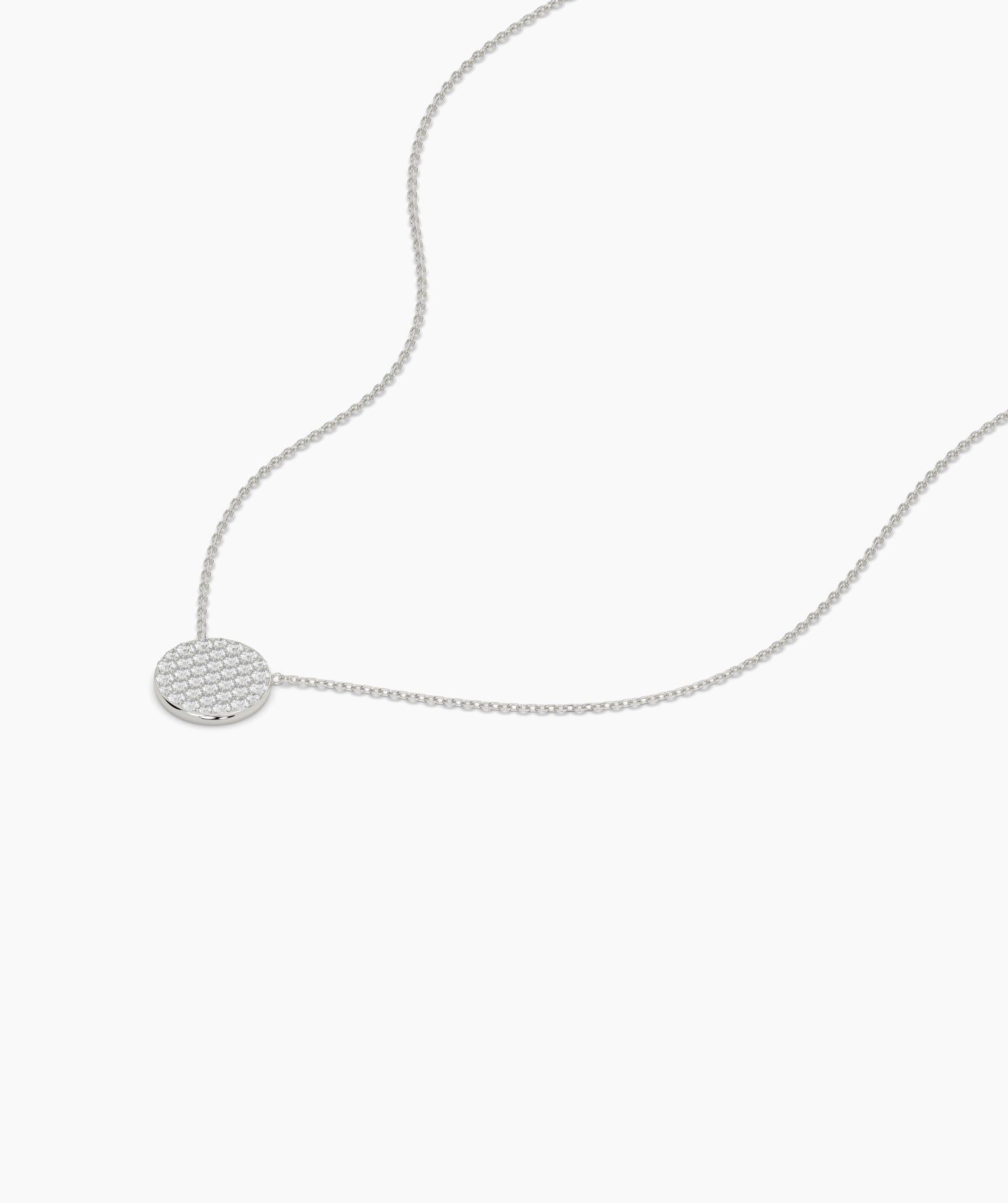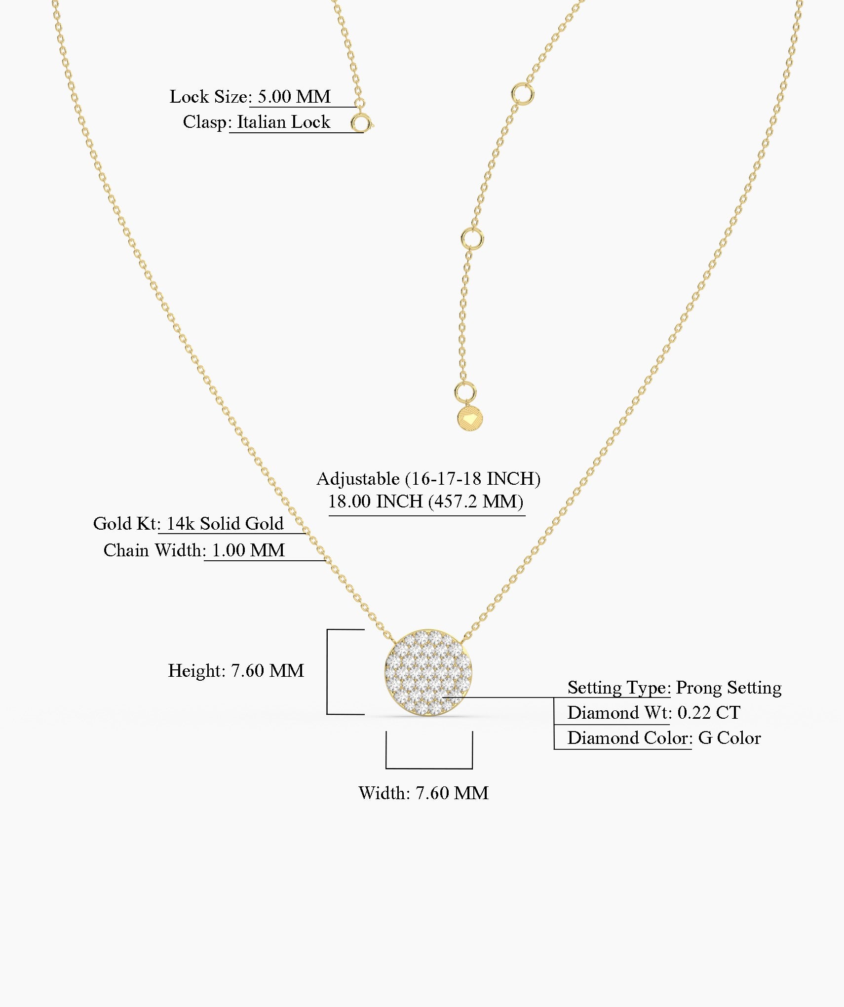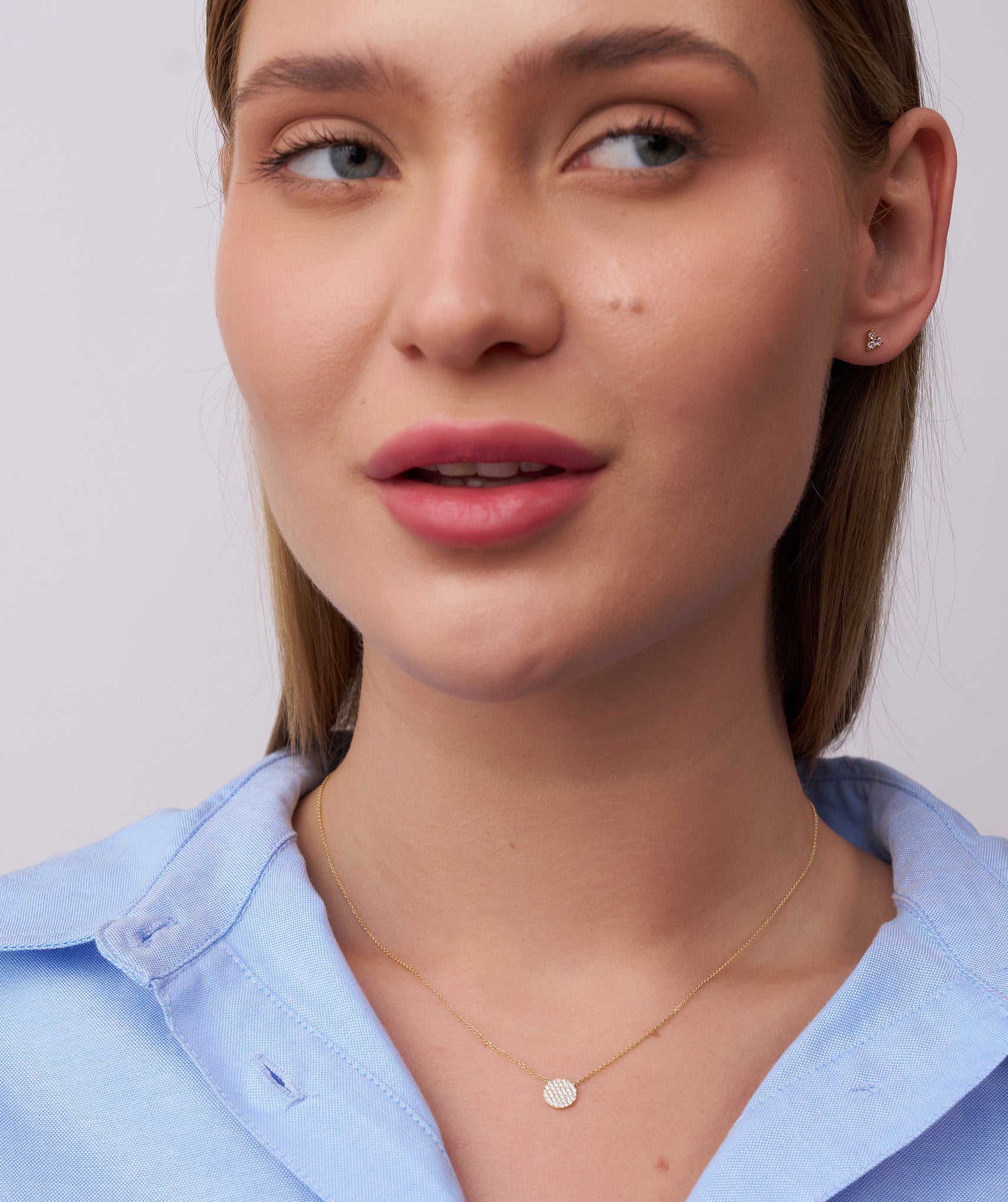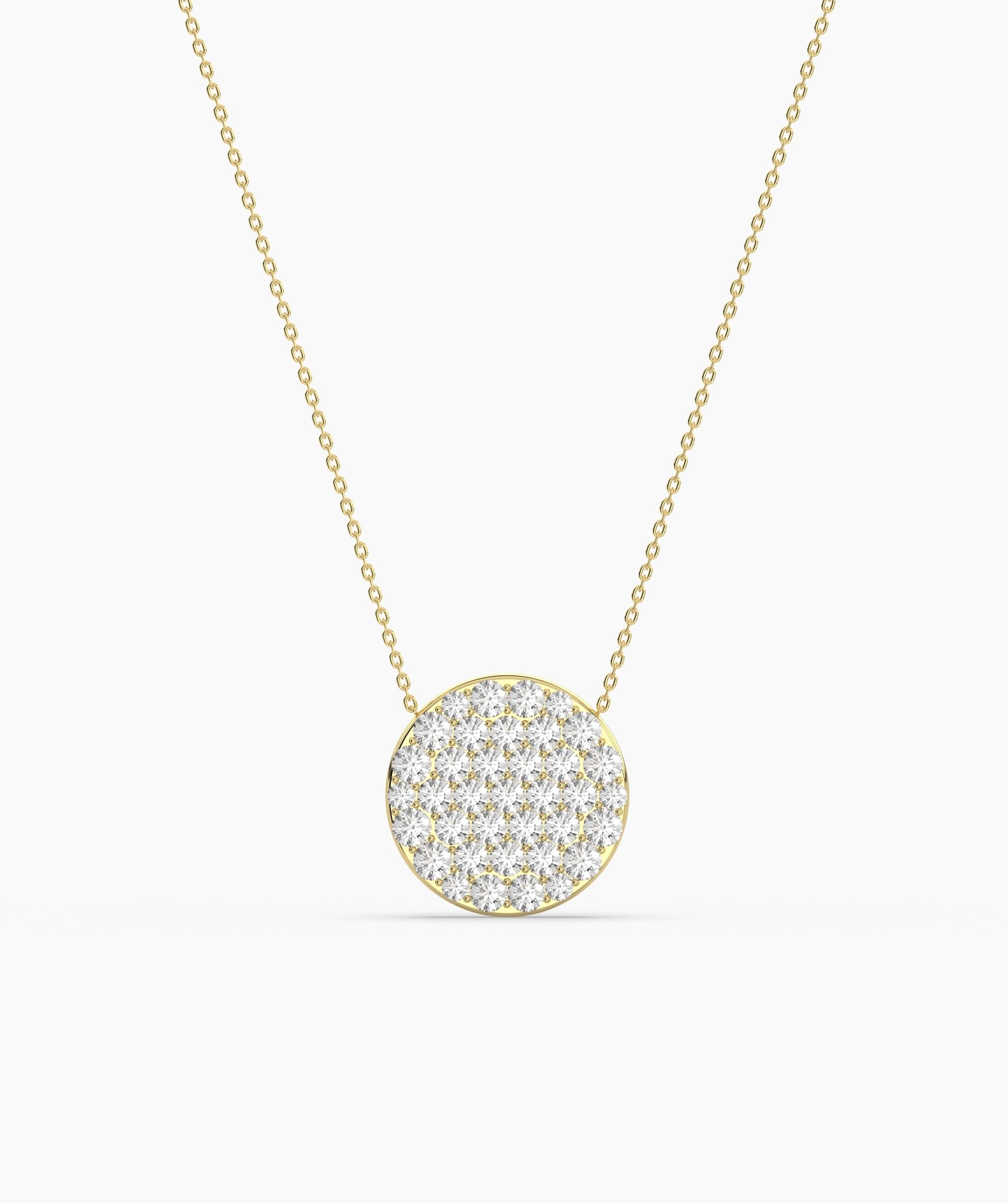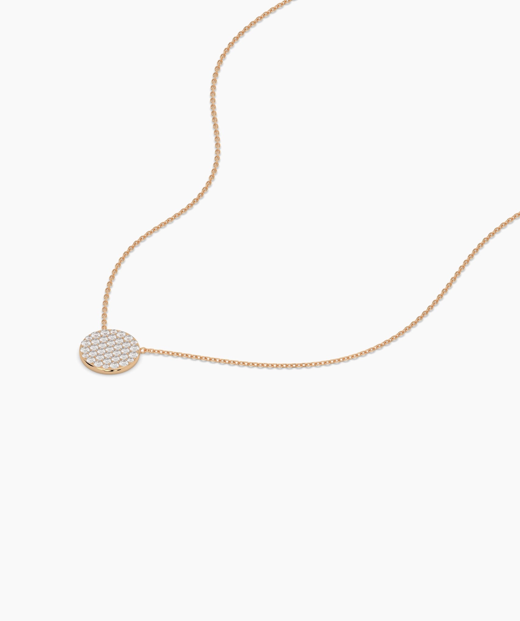 A stunning 14K gold circle pendant, fully set with sparkling pave diamonds—a timeless and elegant piece.