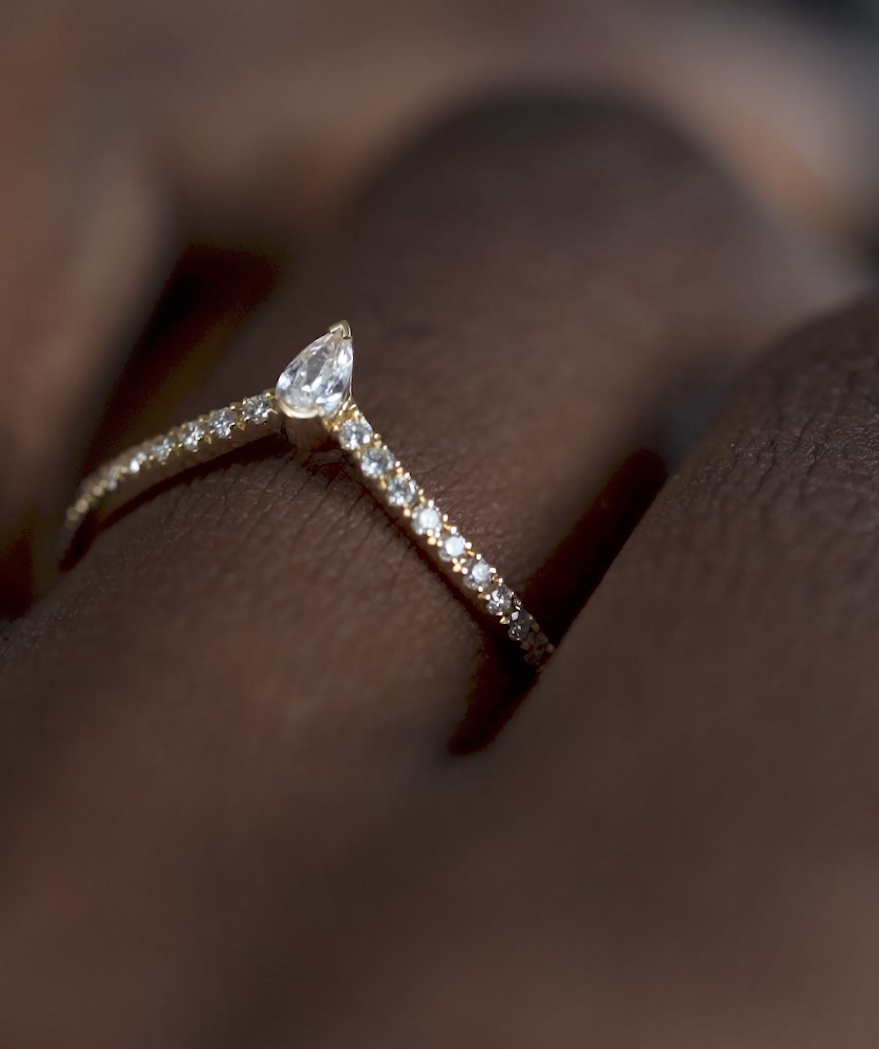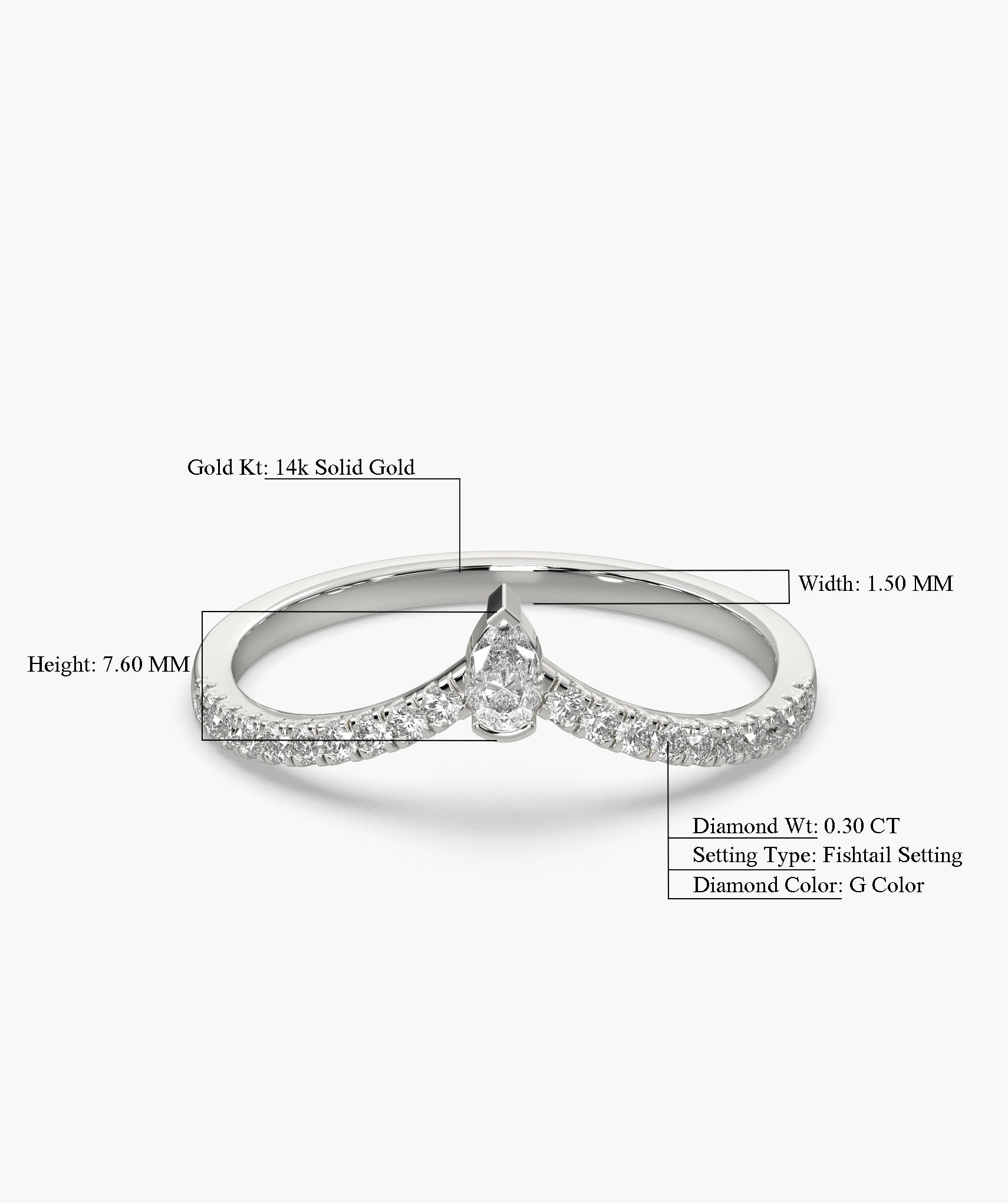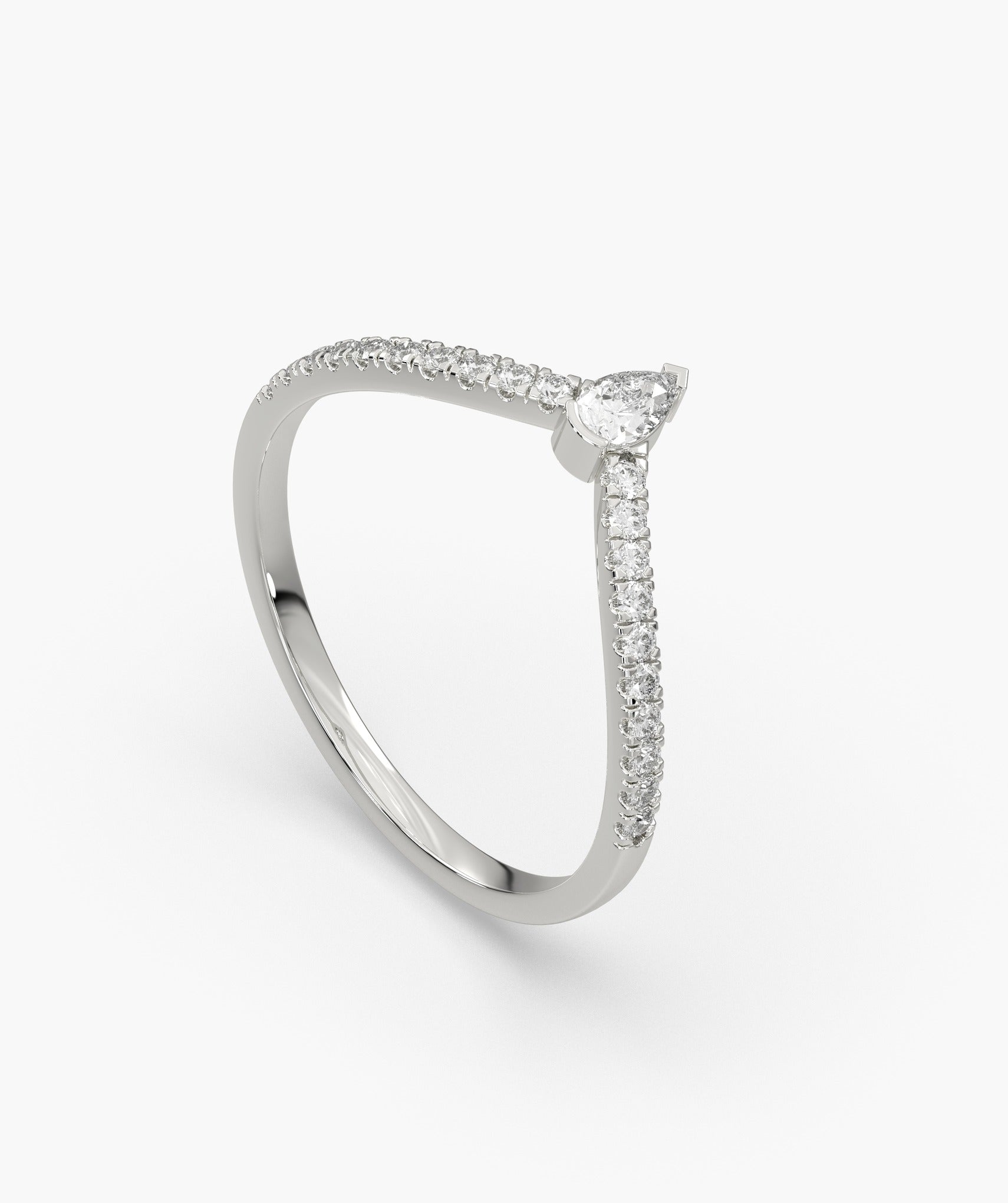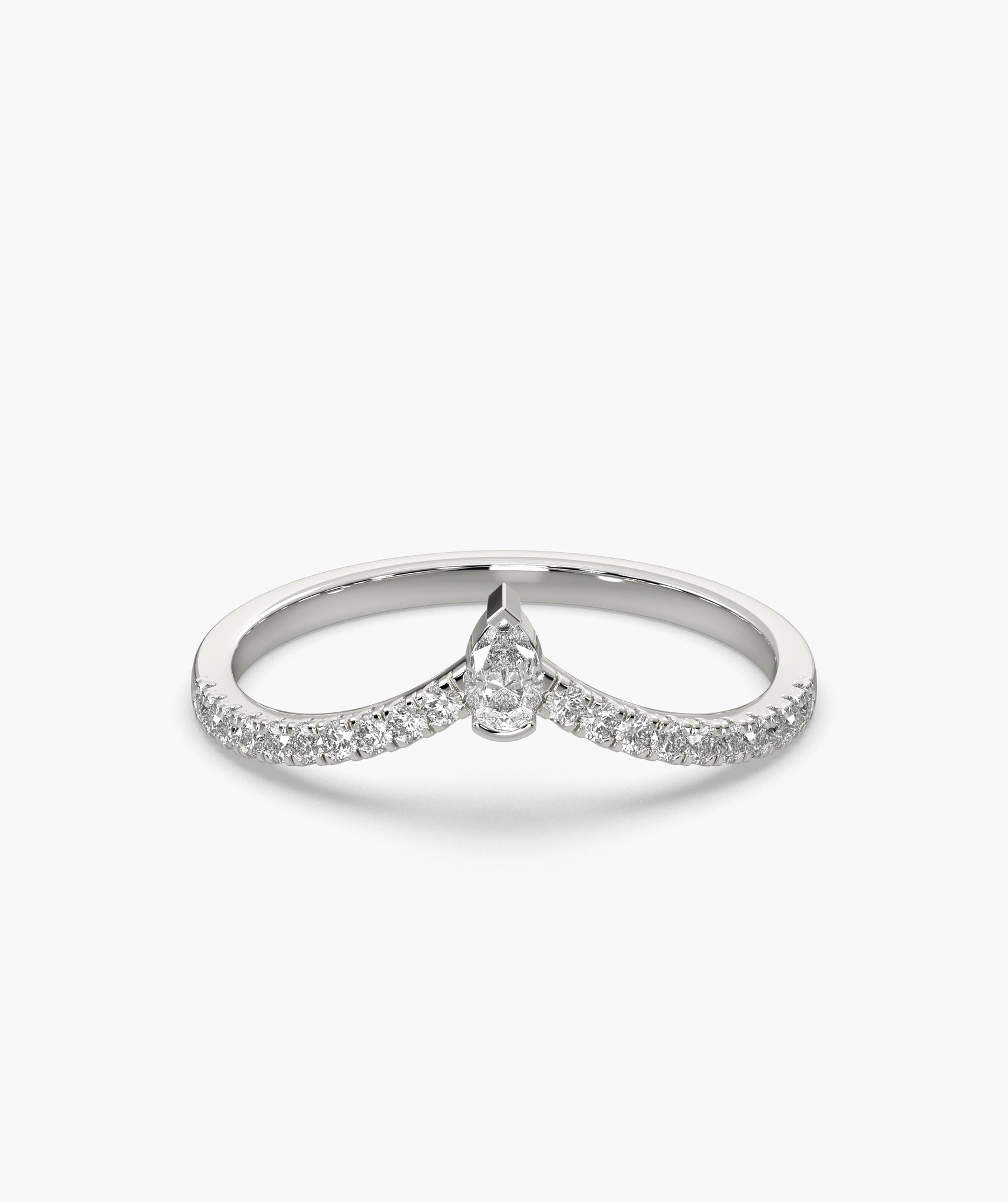 This graceful chevron-style ring features a dazzling pear-cut center diamond accented by a delicate pavé band. Crafted in 14K white gold, it’s perfect for stacking or wearing as a wedding band.