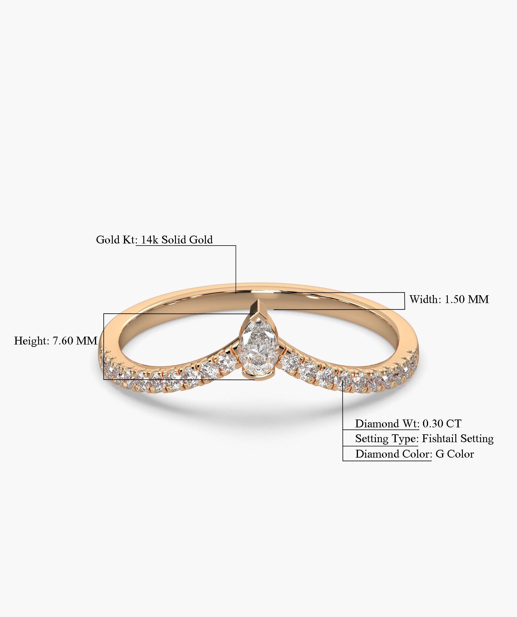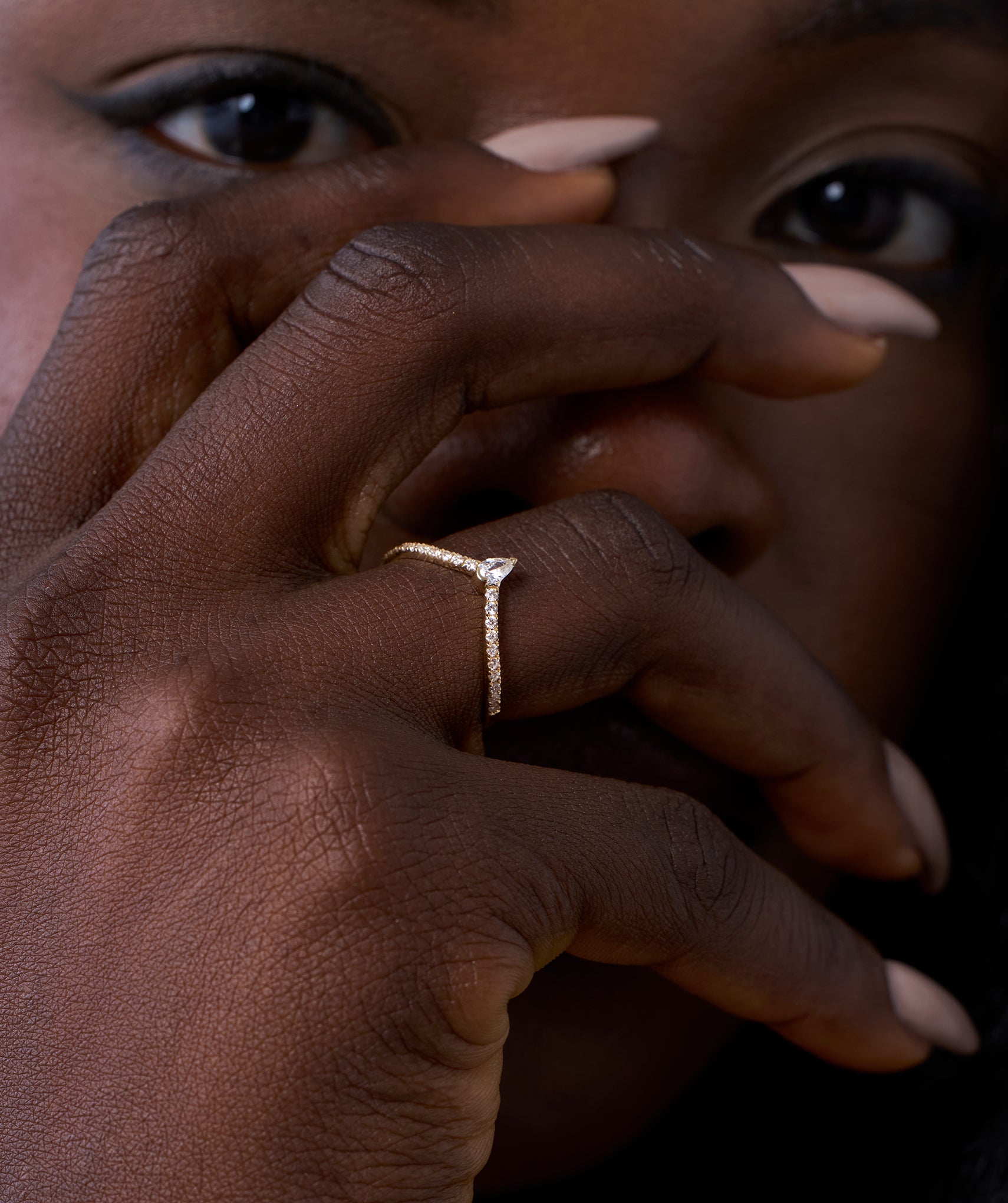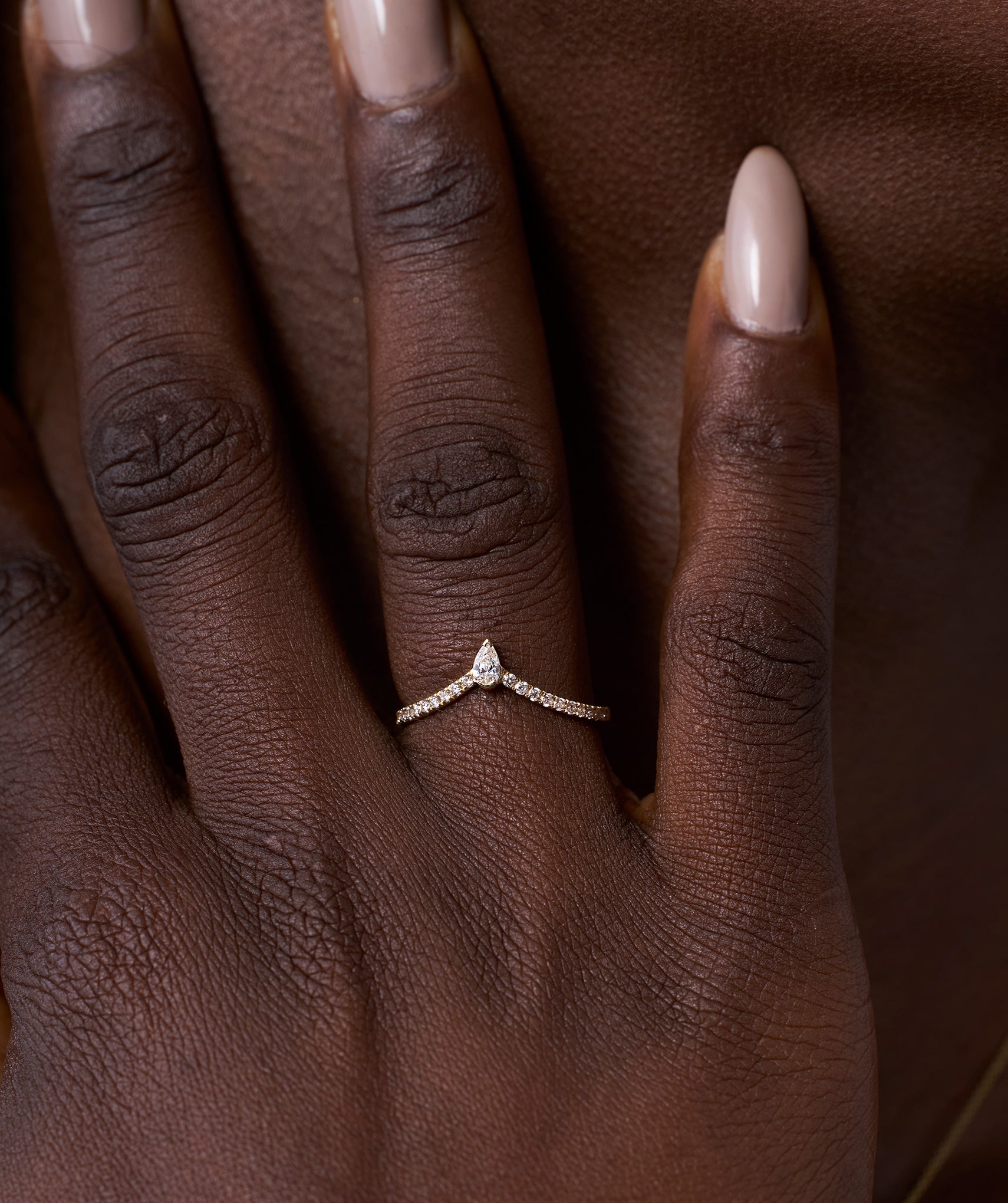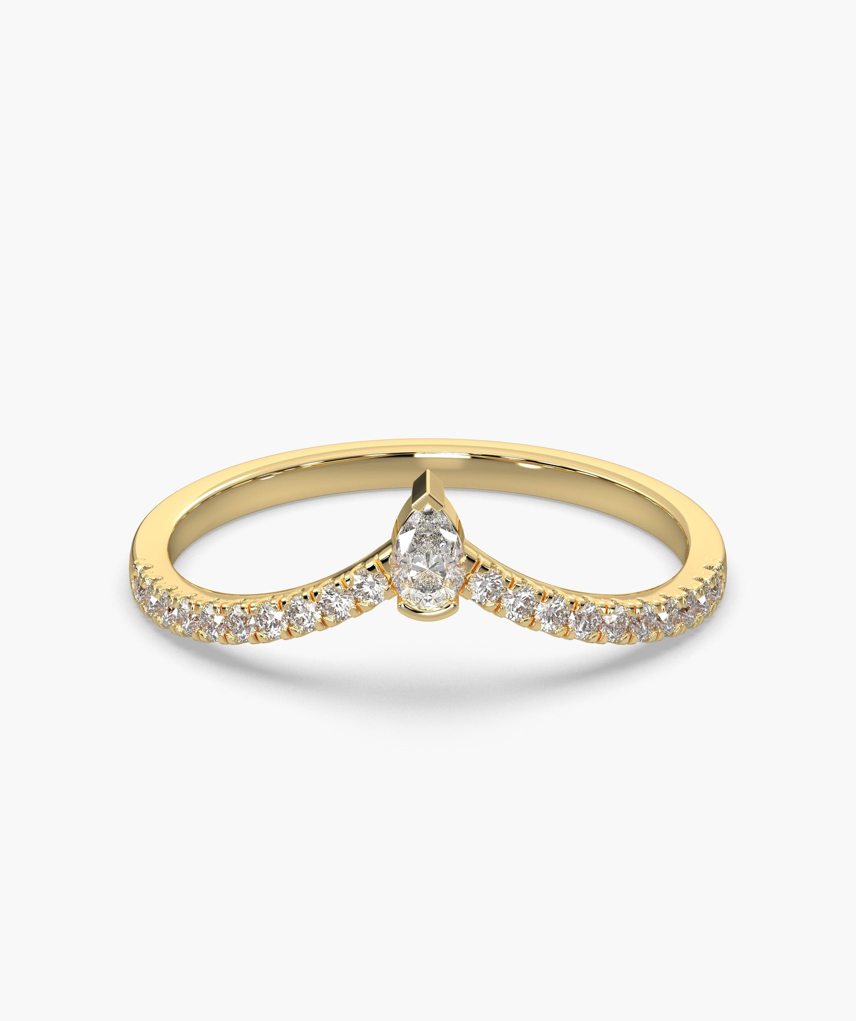 This graceful chevron-style ring features a dazzling pear-cut center diamond accented by a delicate pavé band. Crafted in 14K white gold, it’s perfect for stacking or wearing as a wedding band.