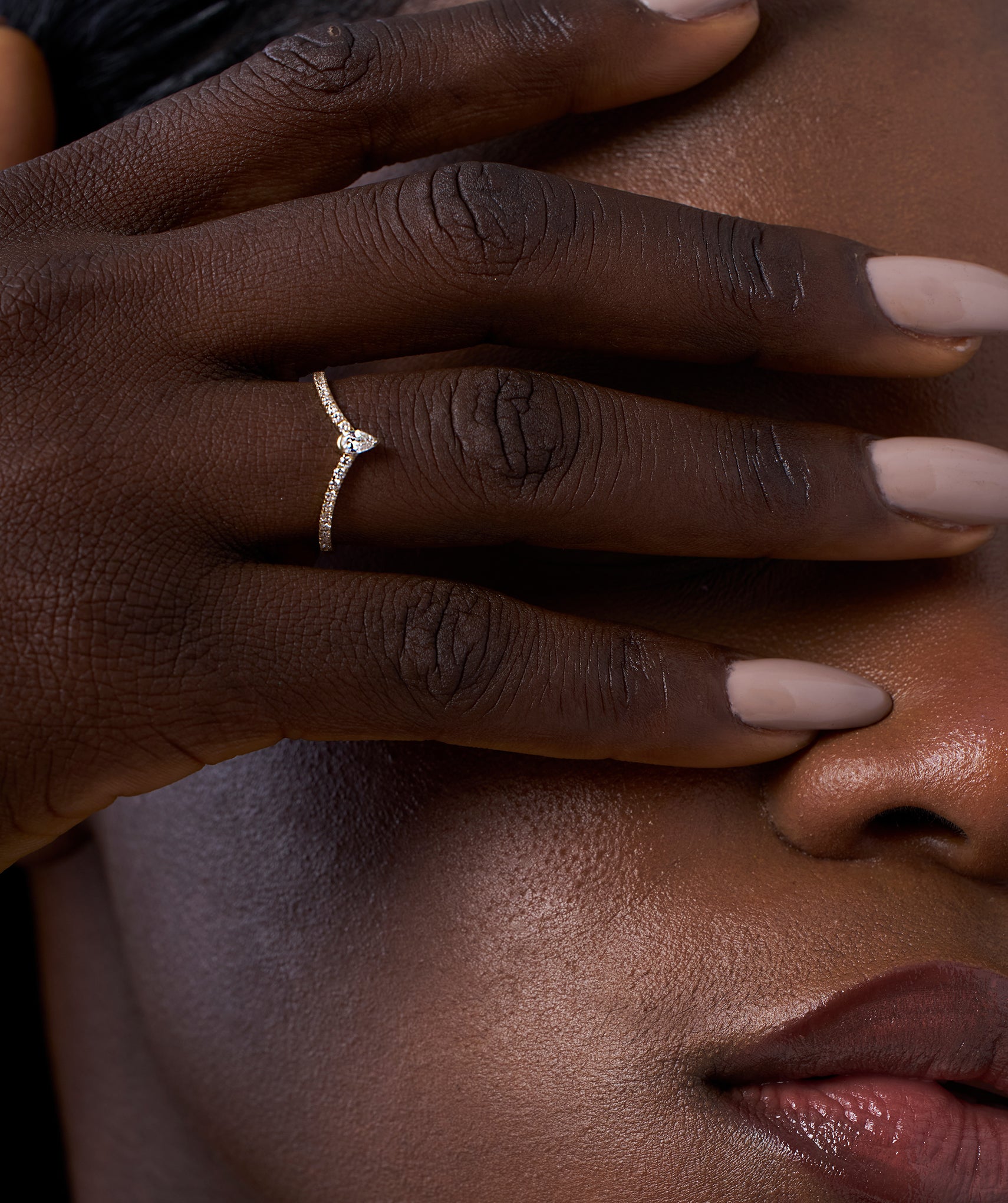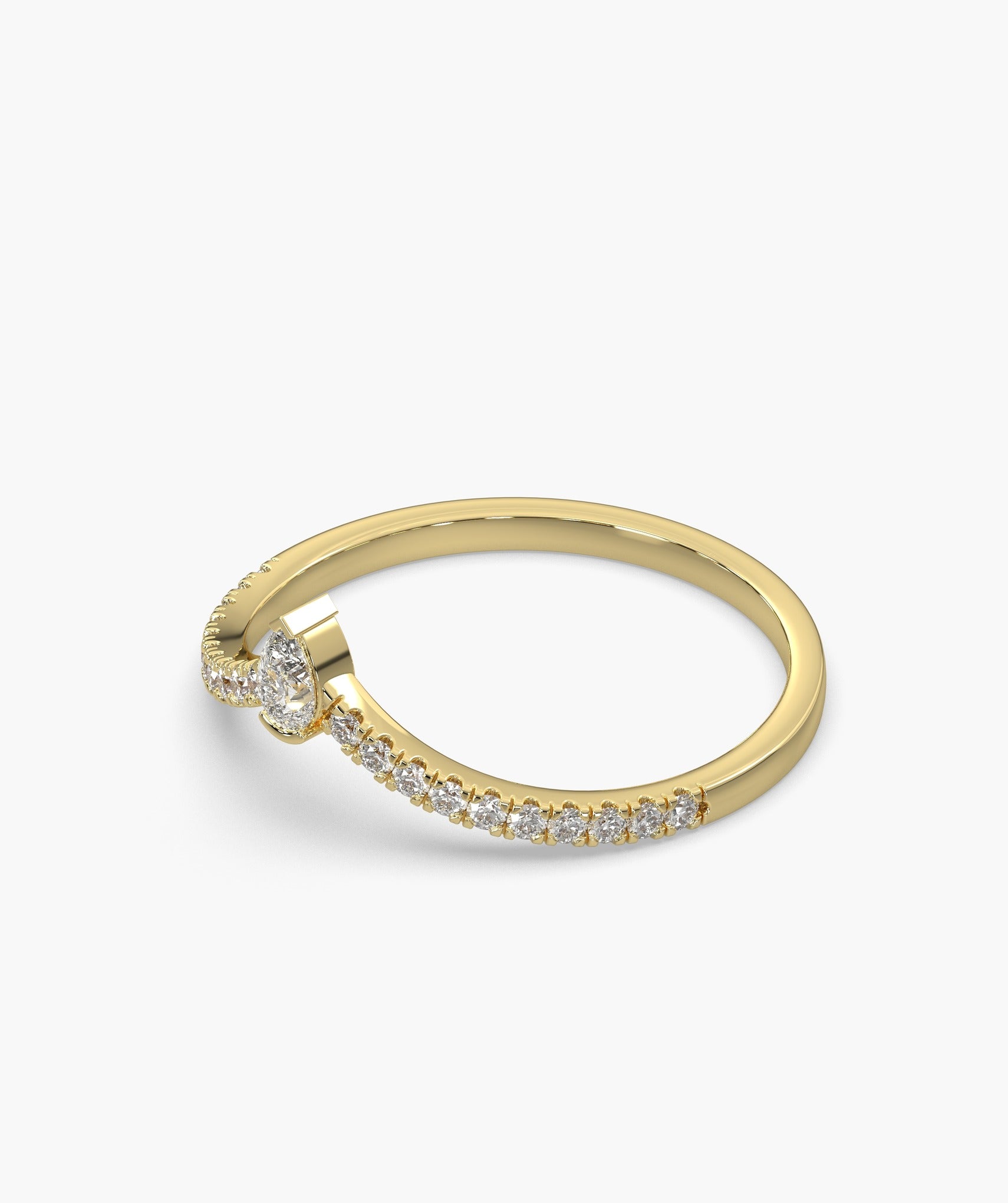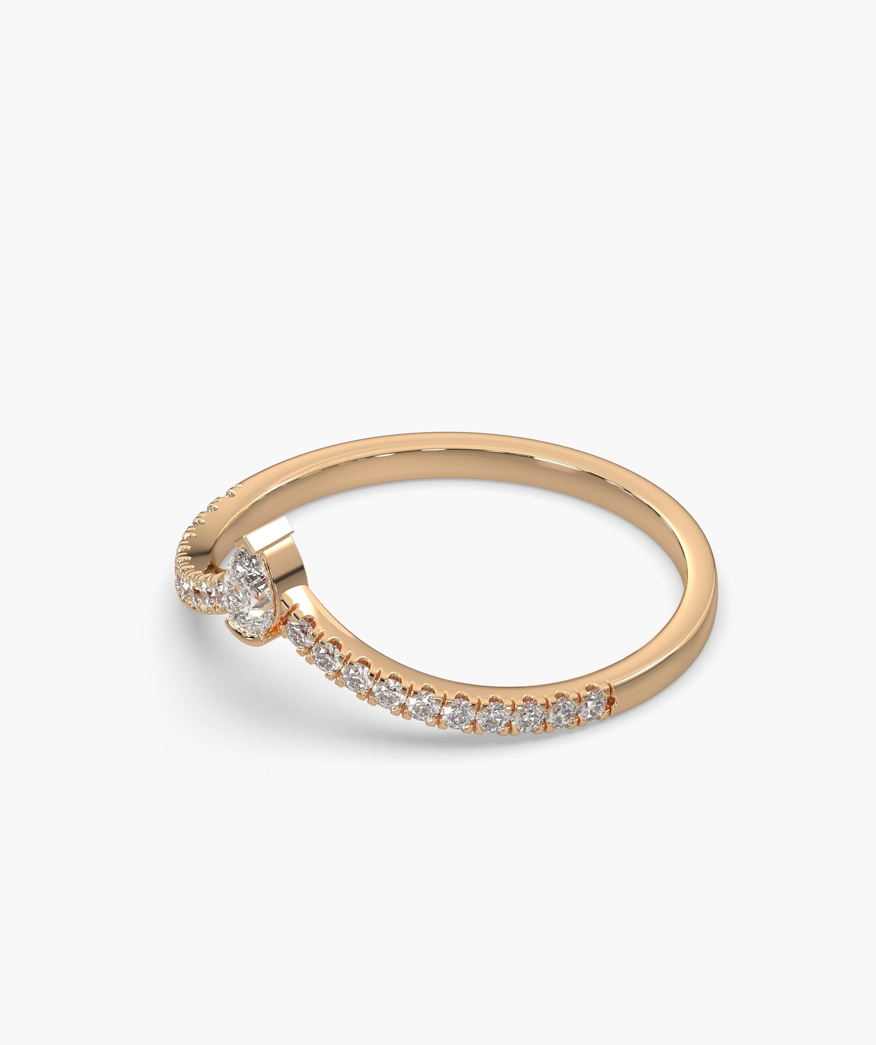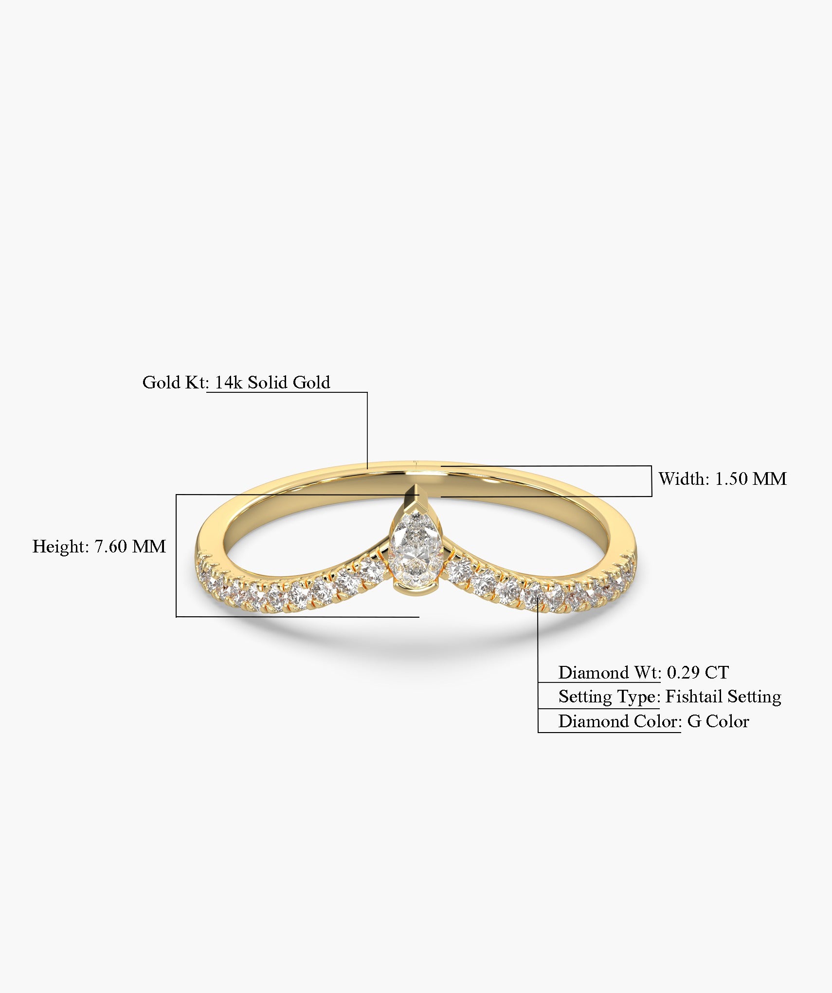 This graceful chevron-style ring features a dazzling pear-cut center diamond accented by a delicate pavé band. Crafted in 14K white gold, it’s perfect for stacking or wearing as a wedding band.