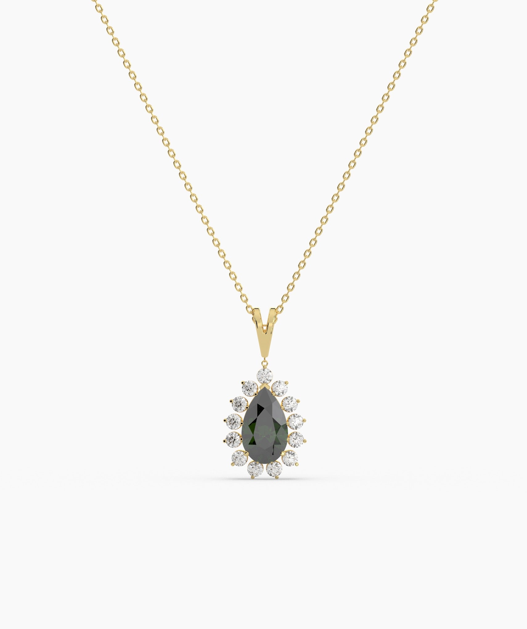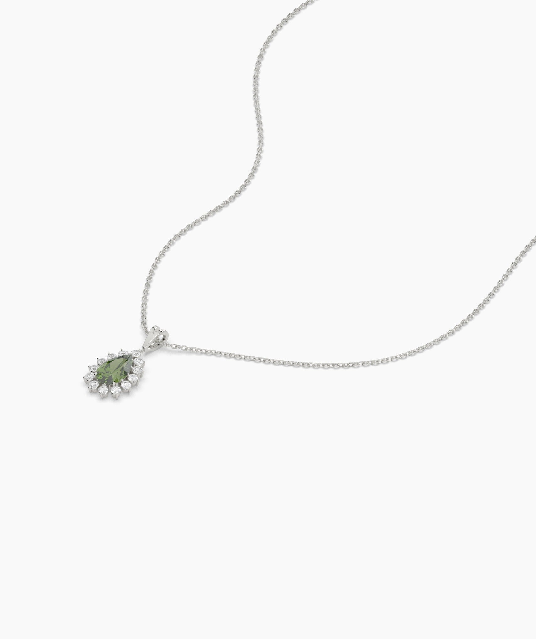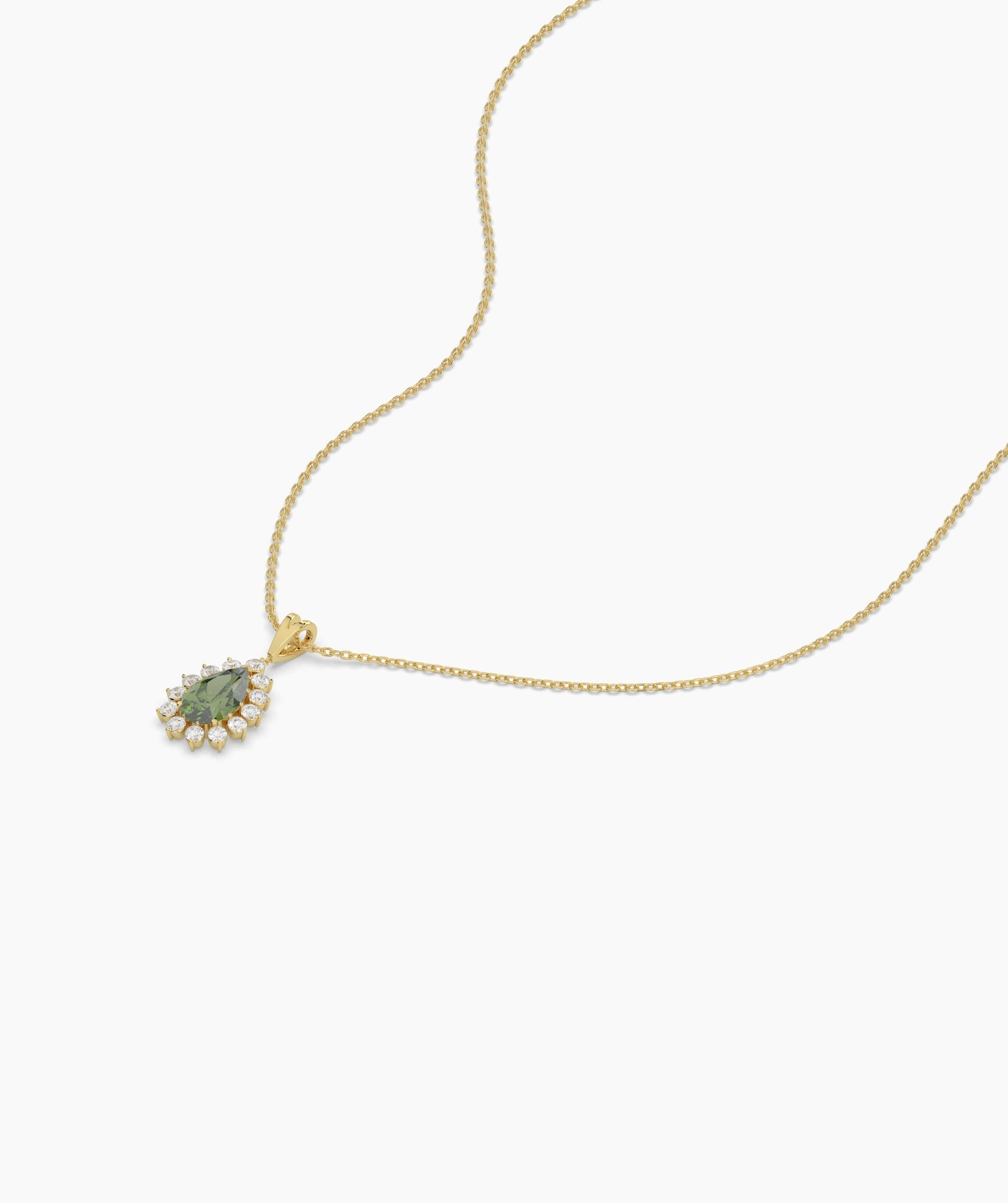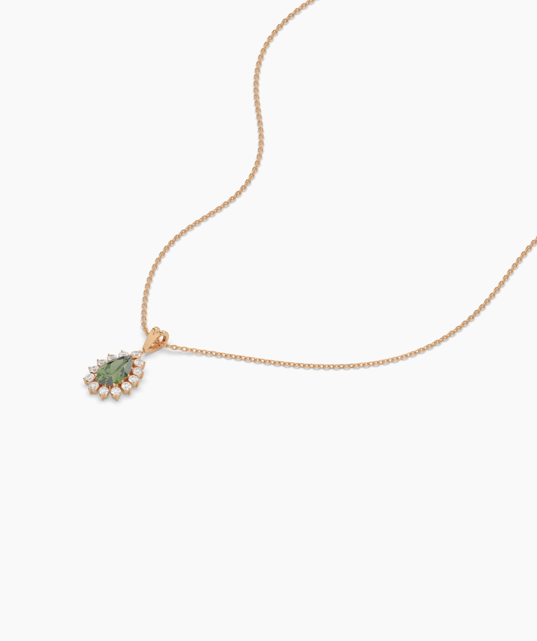 A regal teardrop design, where a lush green stone meets a sparkling diamond halo—perfect for making a statement.