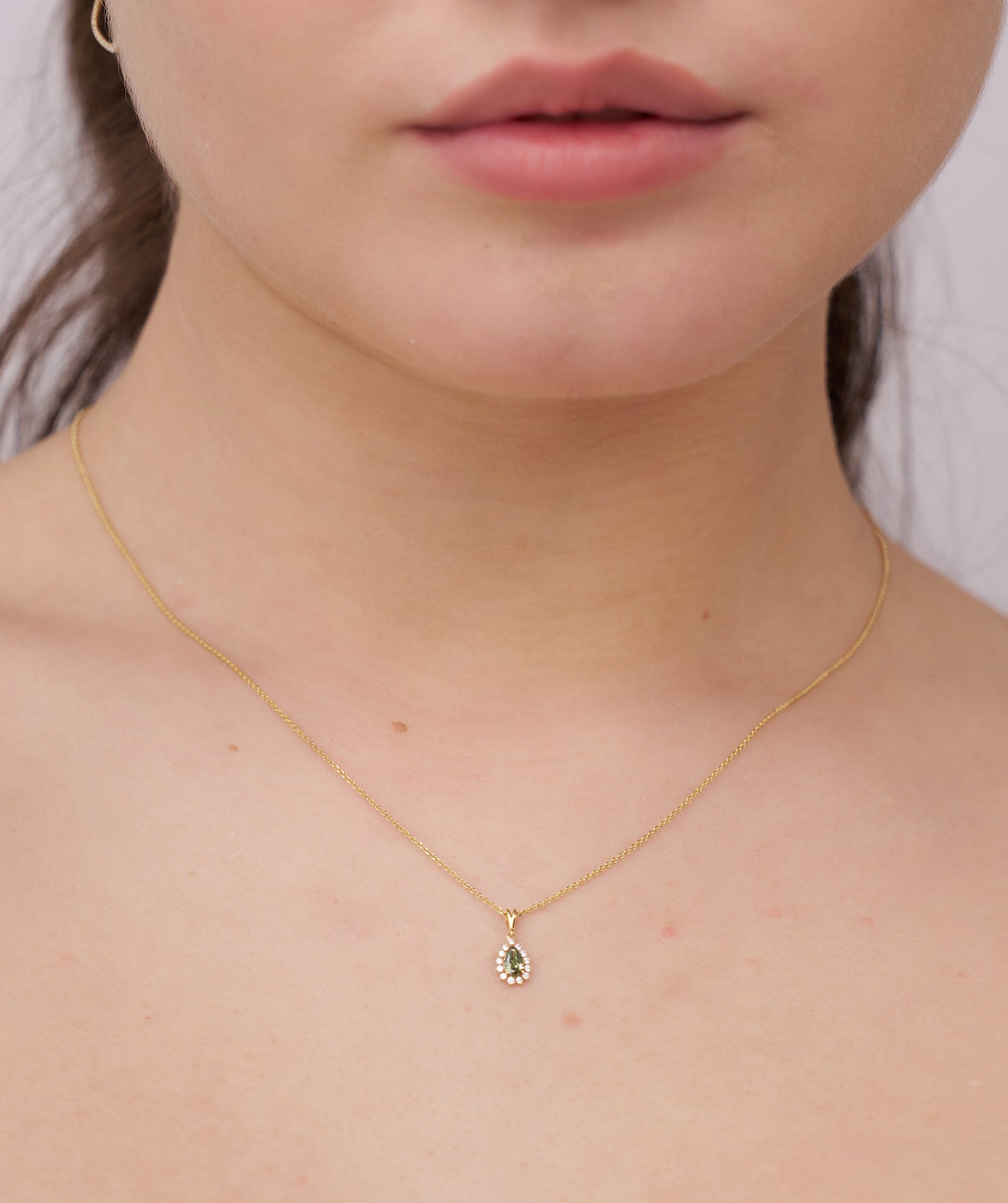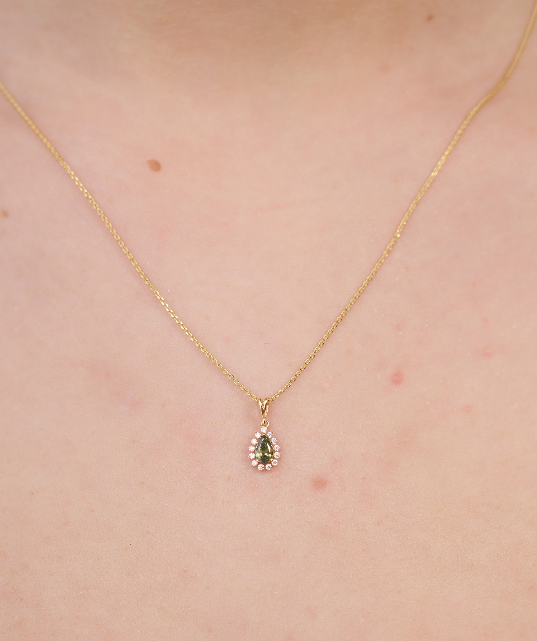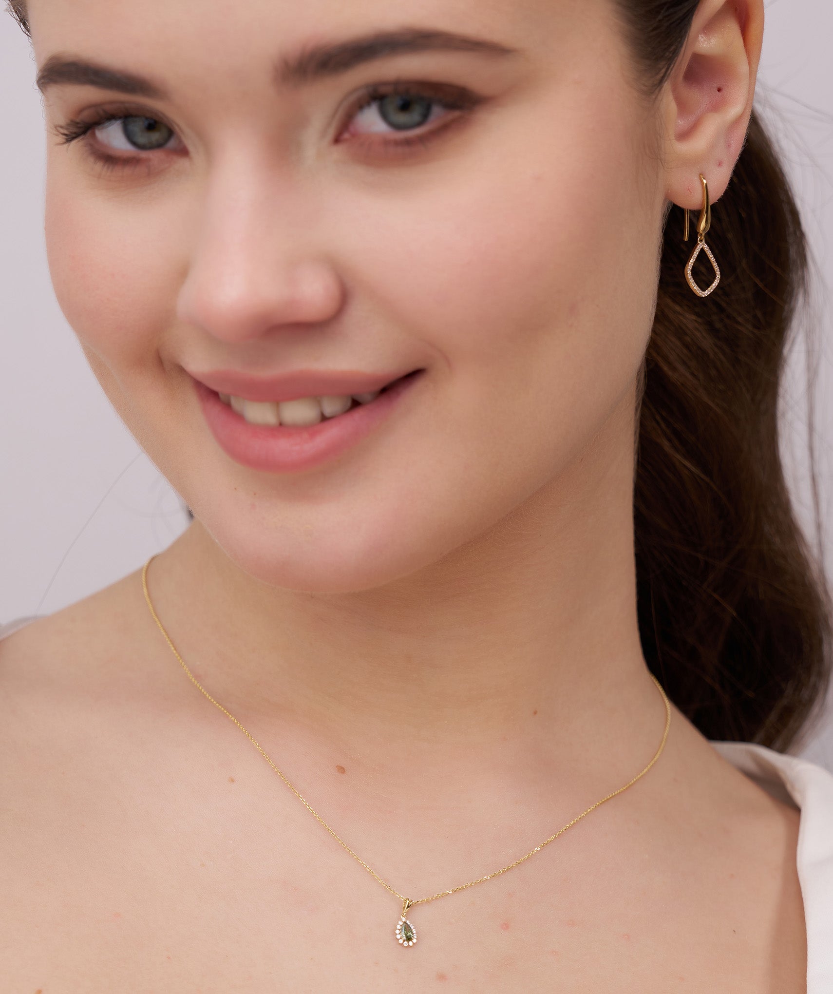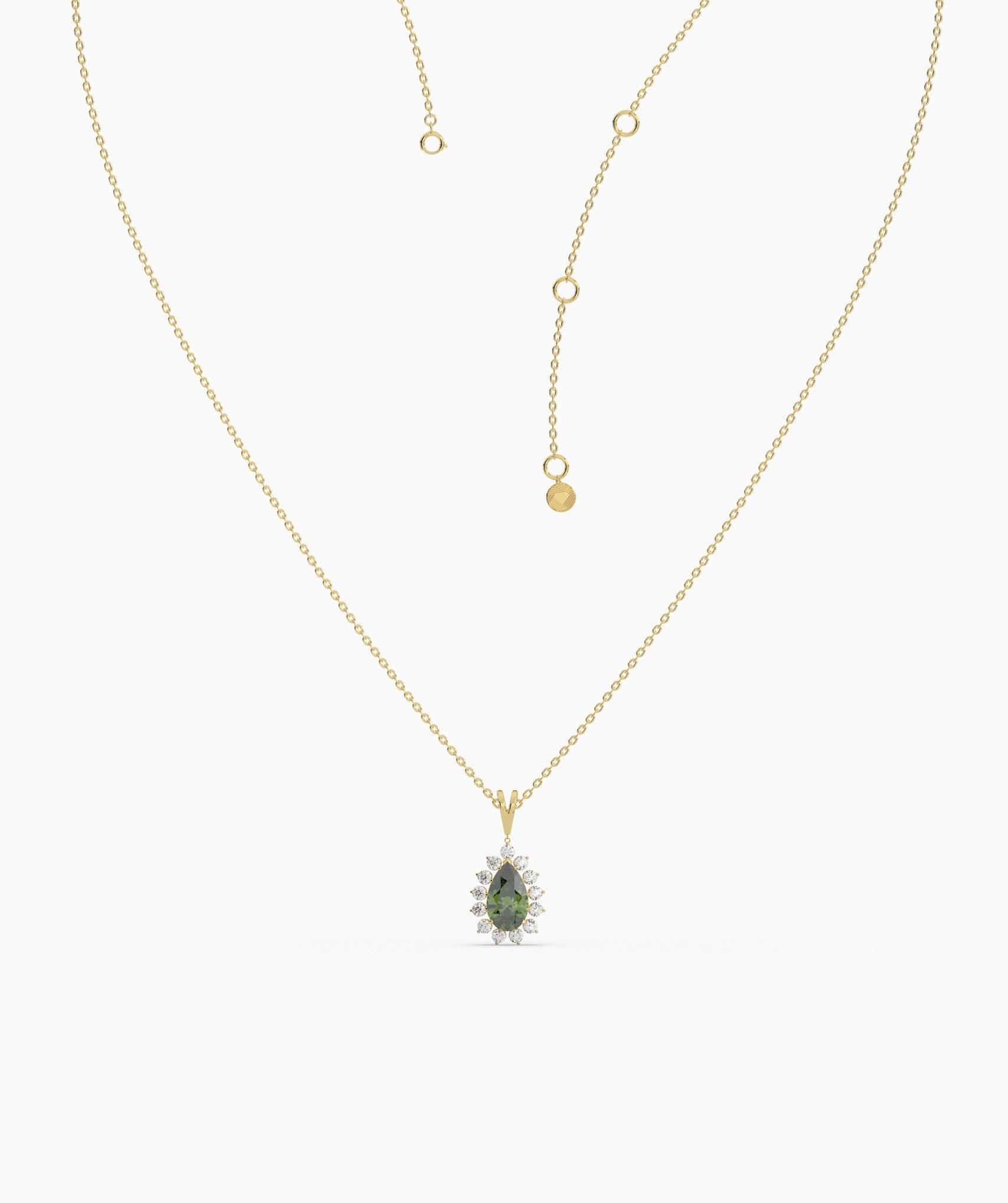 A regal teardrop design, where a lush green stone meets a sparkling diamond halo—perfect for making a statement.