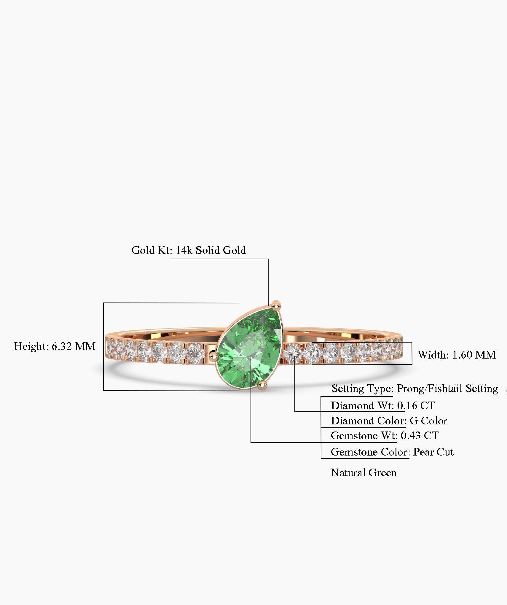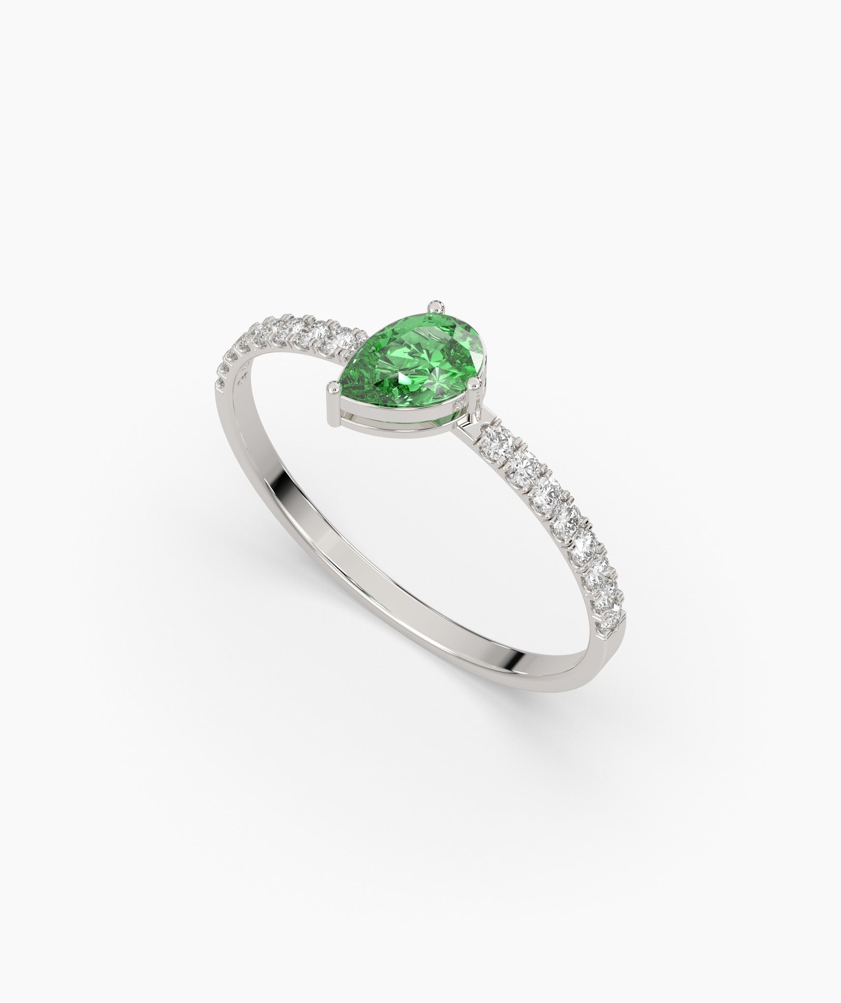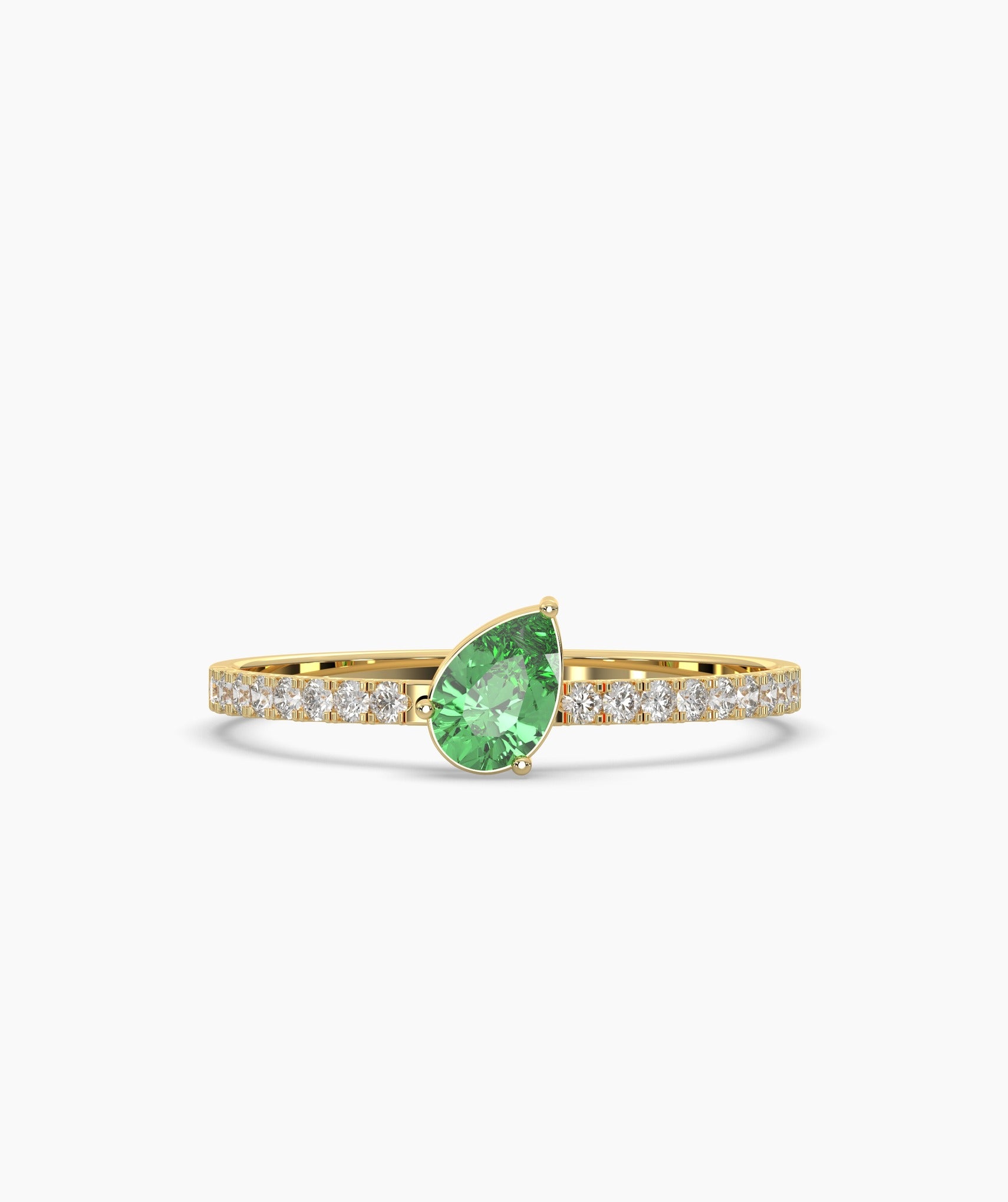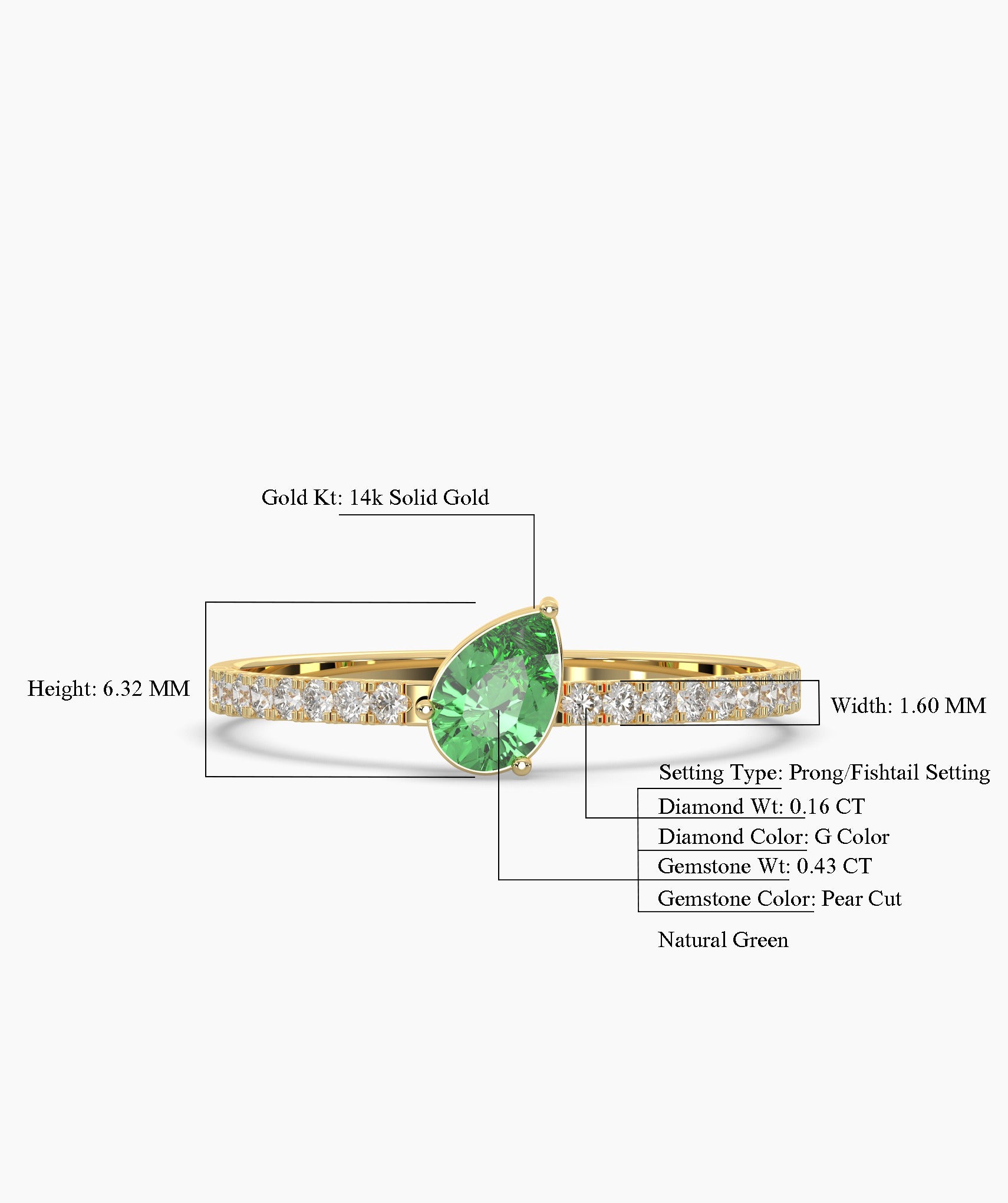 Crafted in solid 14K gold, this elegant ring showcases a vibrant green gemstone in a pear cut, enhanced with diamond accents.