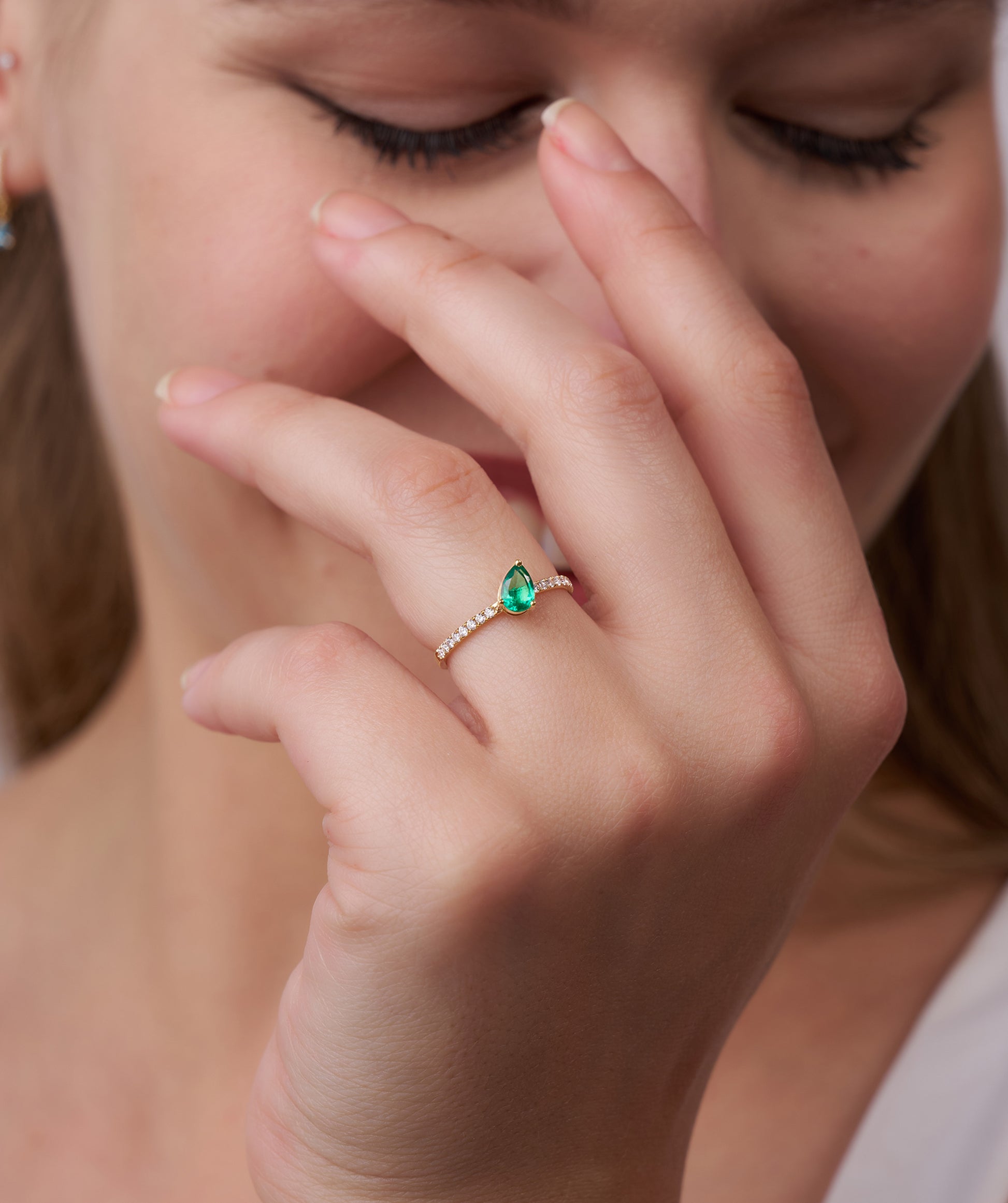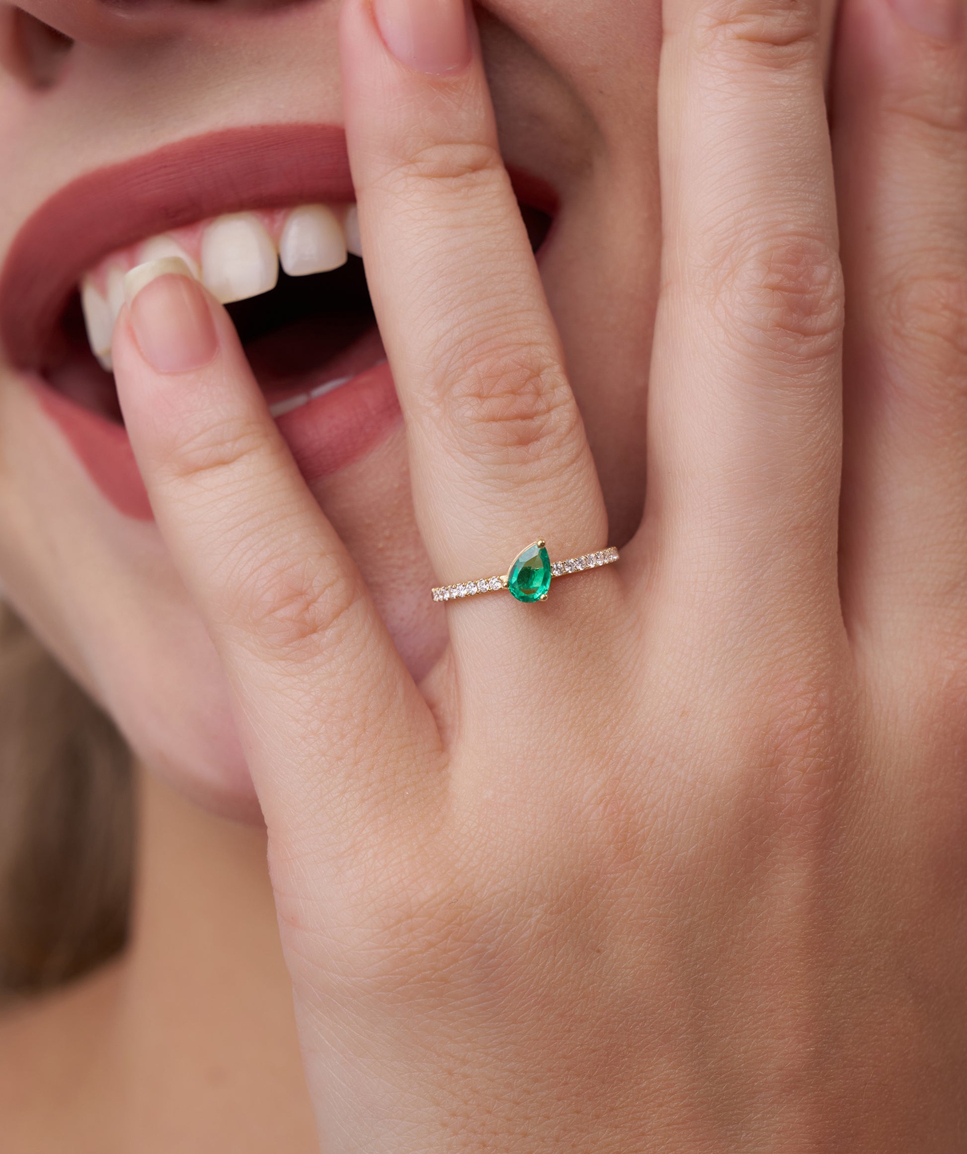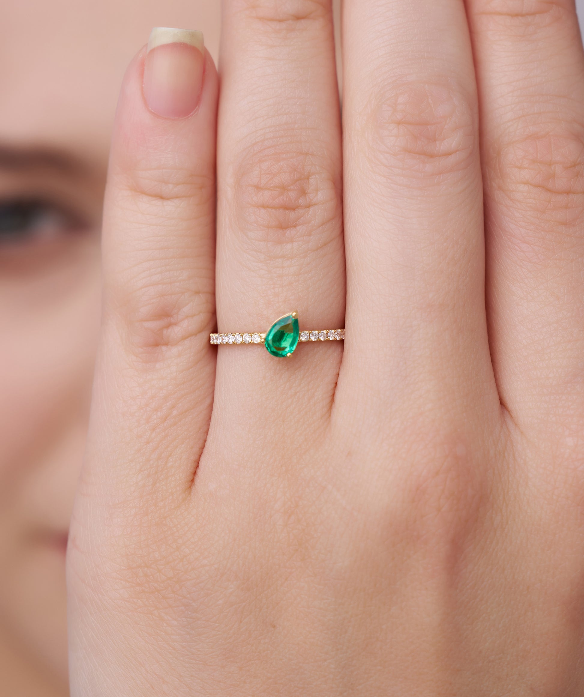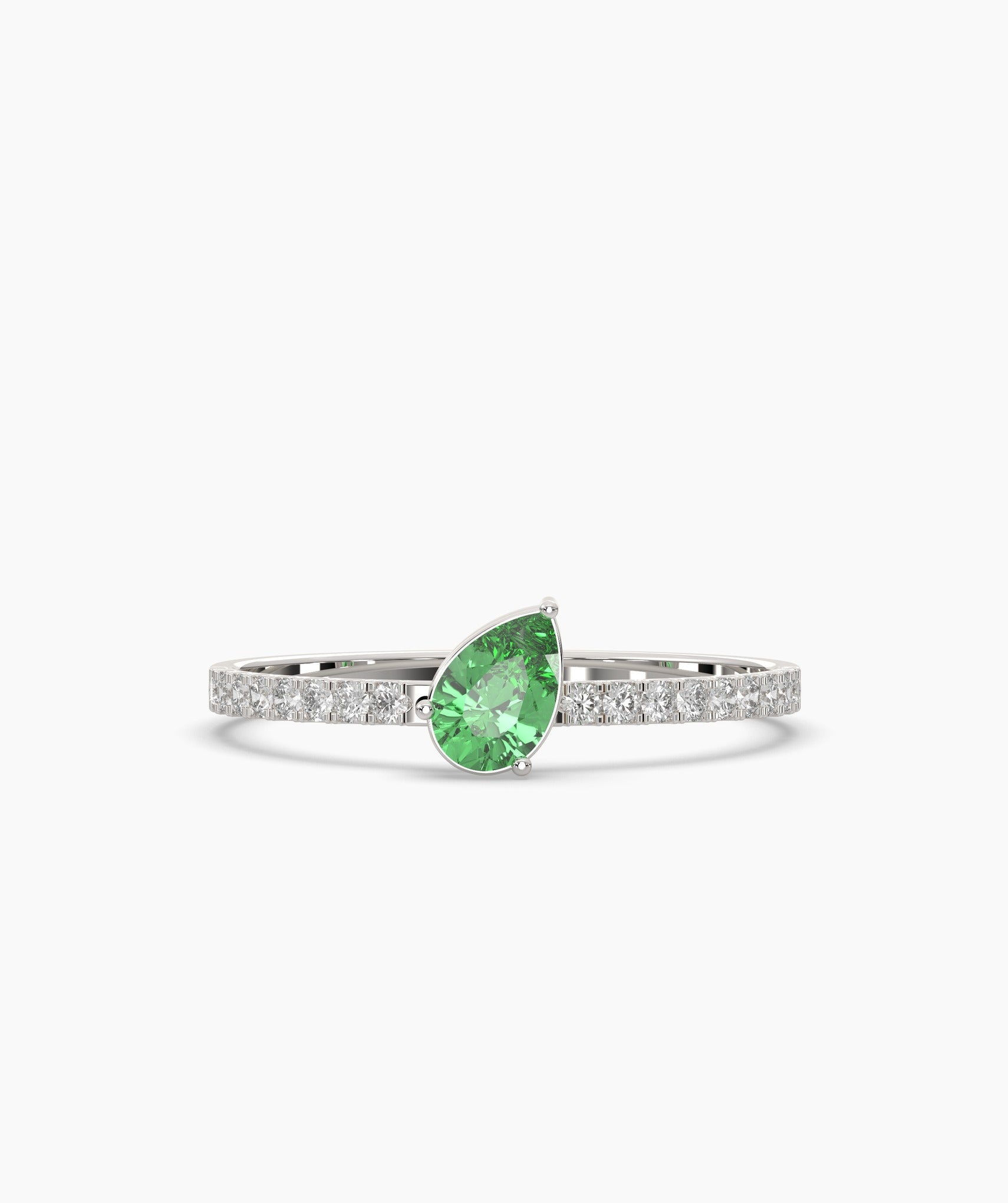 Crafted in solid 14K gold, this elegant ring showcases a vibrant green gemstone in a pear cut, enhanced with diamond accents.