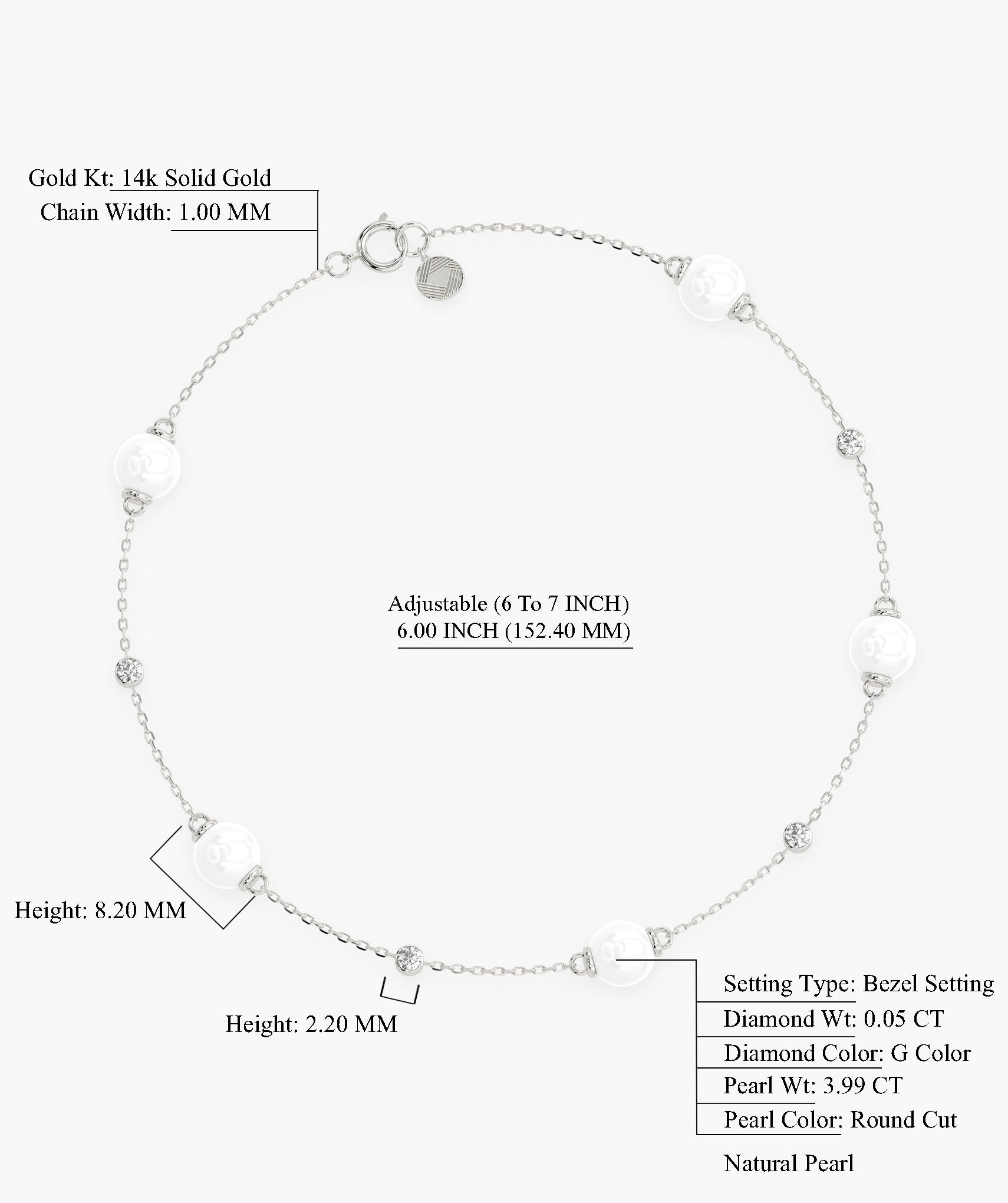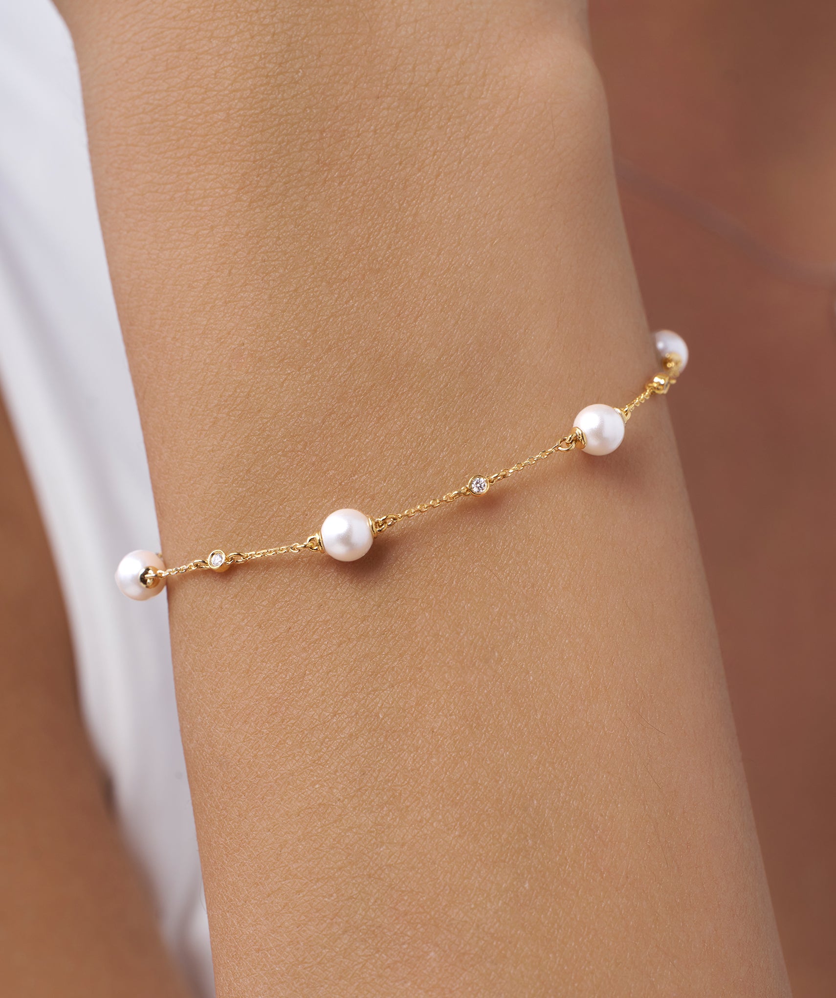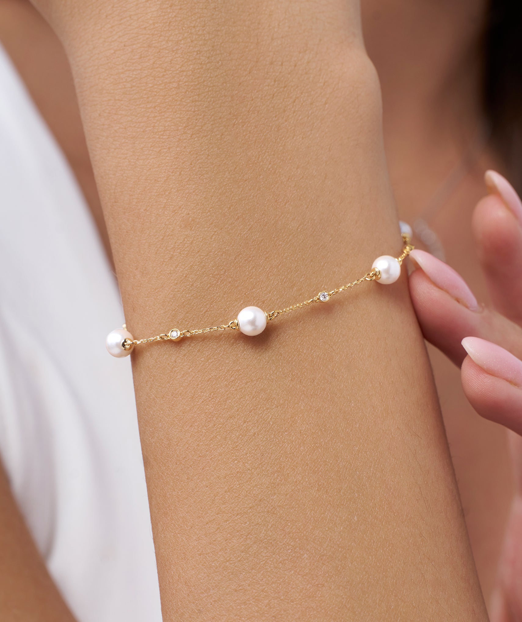 This 14K solid gold bracelet gracefully alternates between luminous pearl accents and sparkling diamonds, creating a serene and sophisticated look.