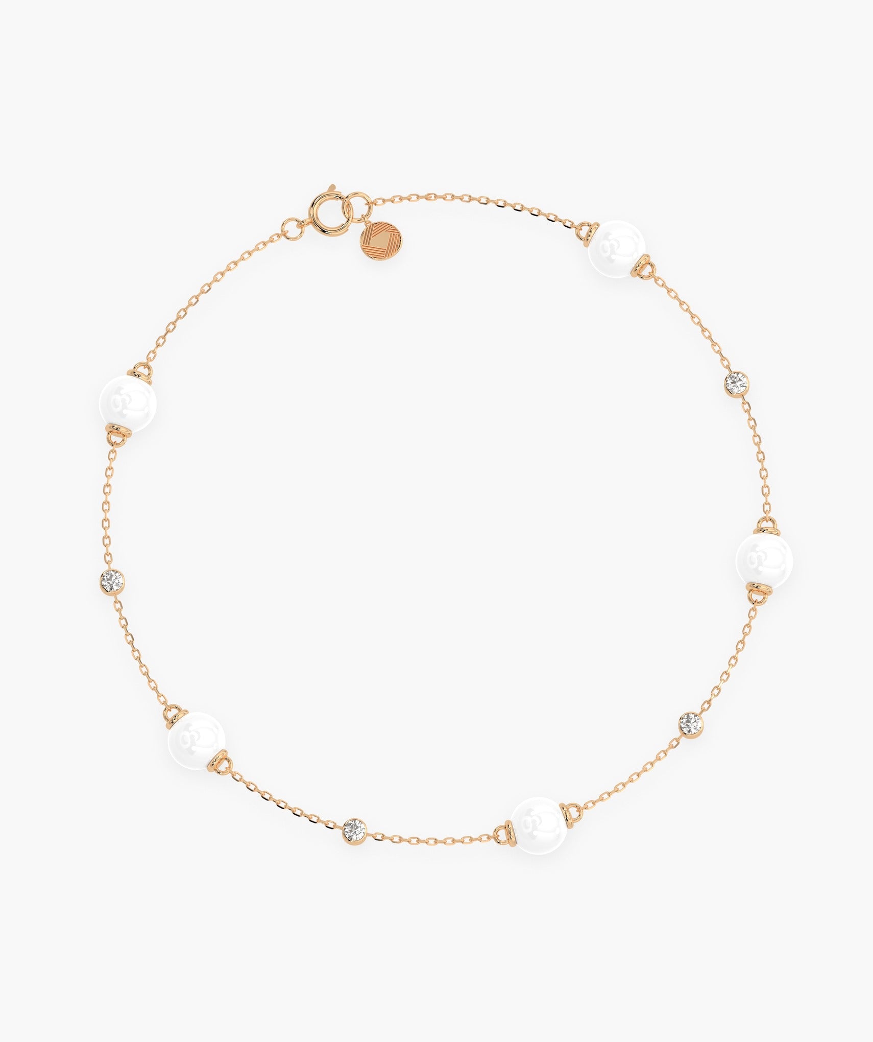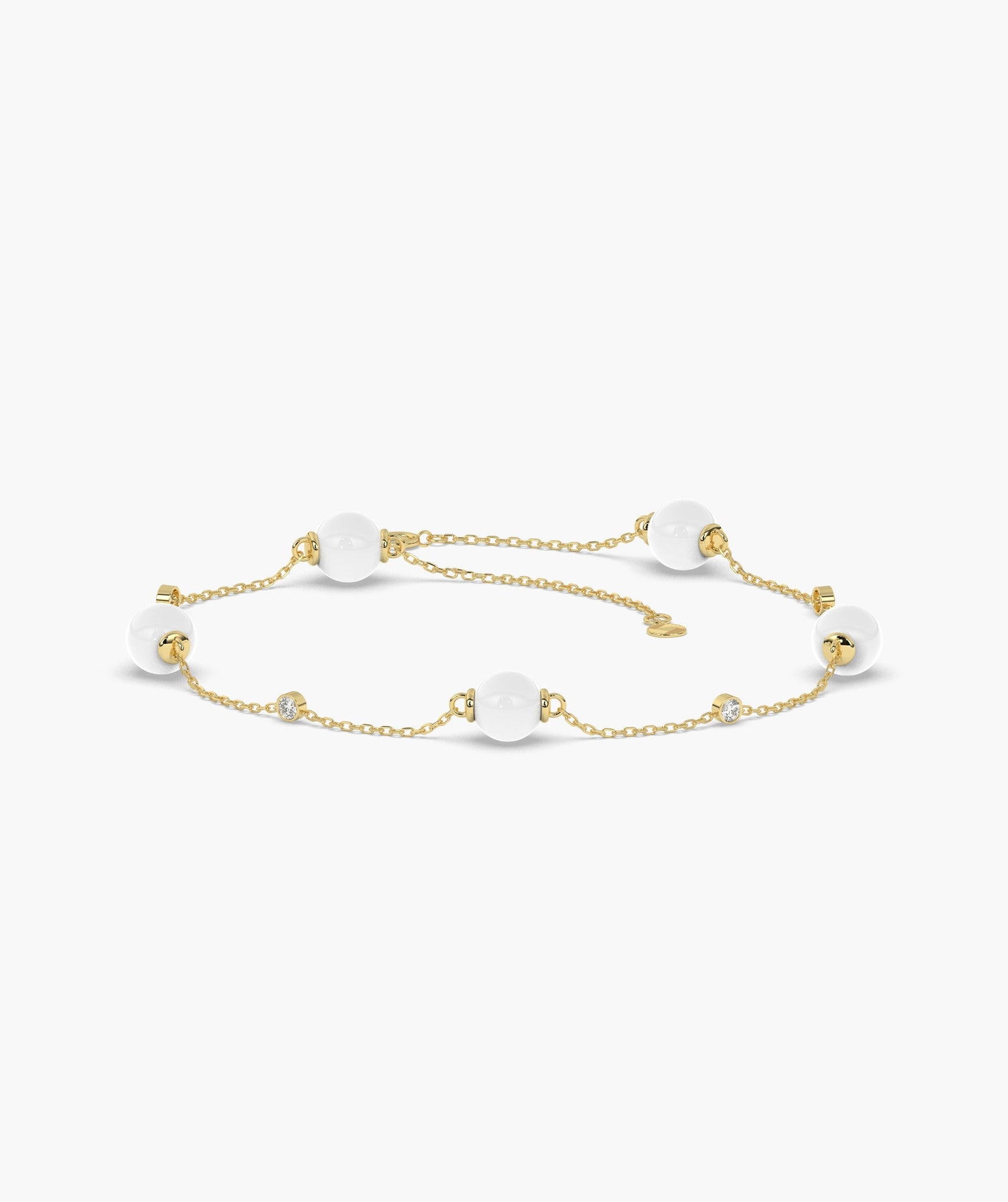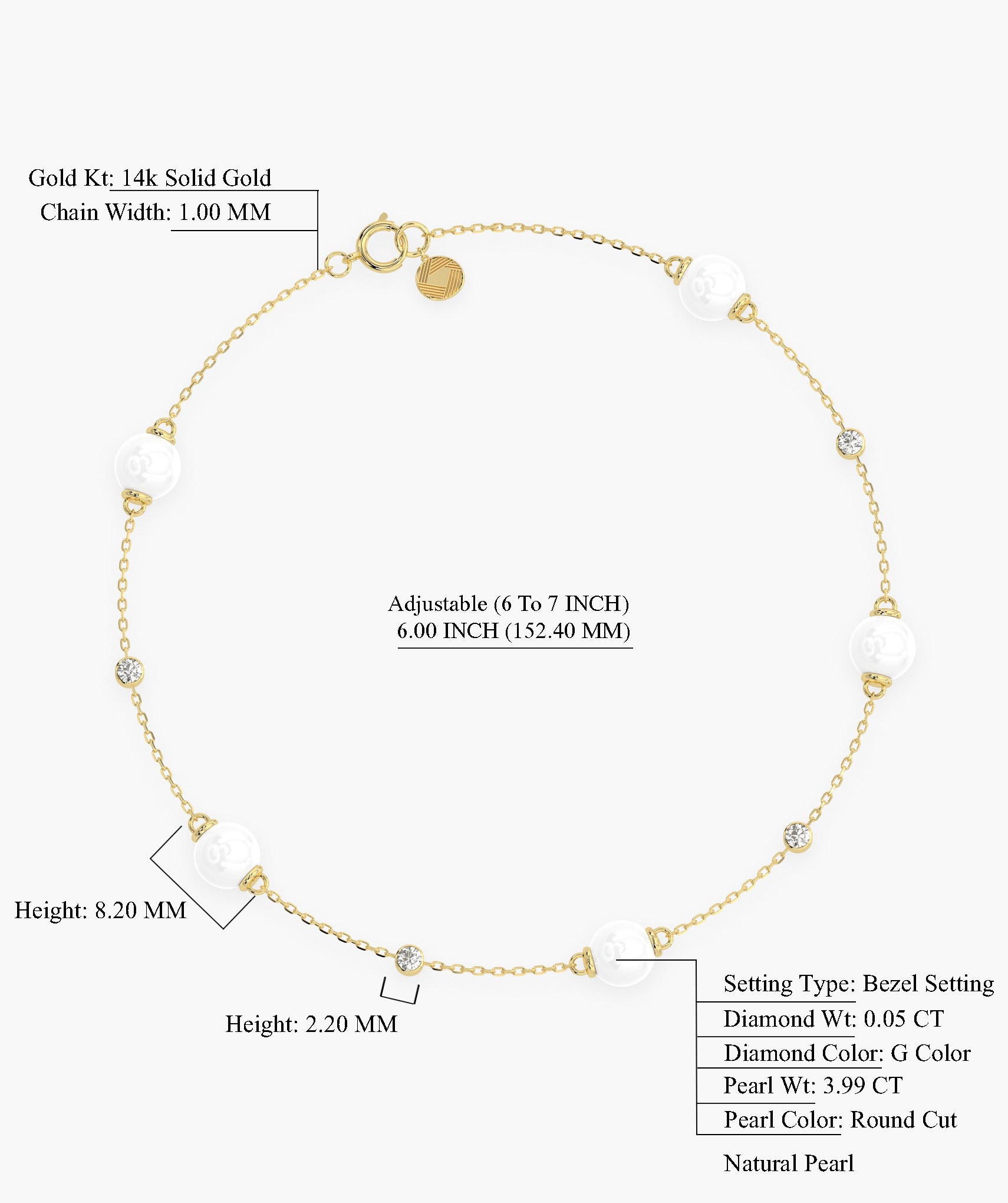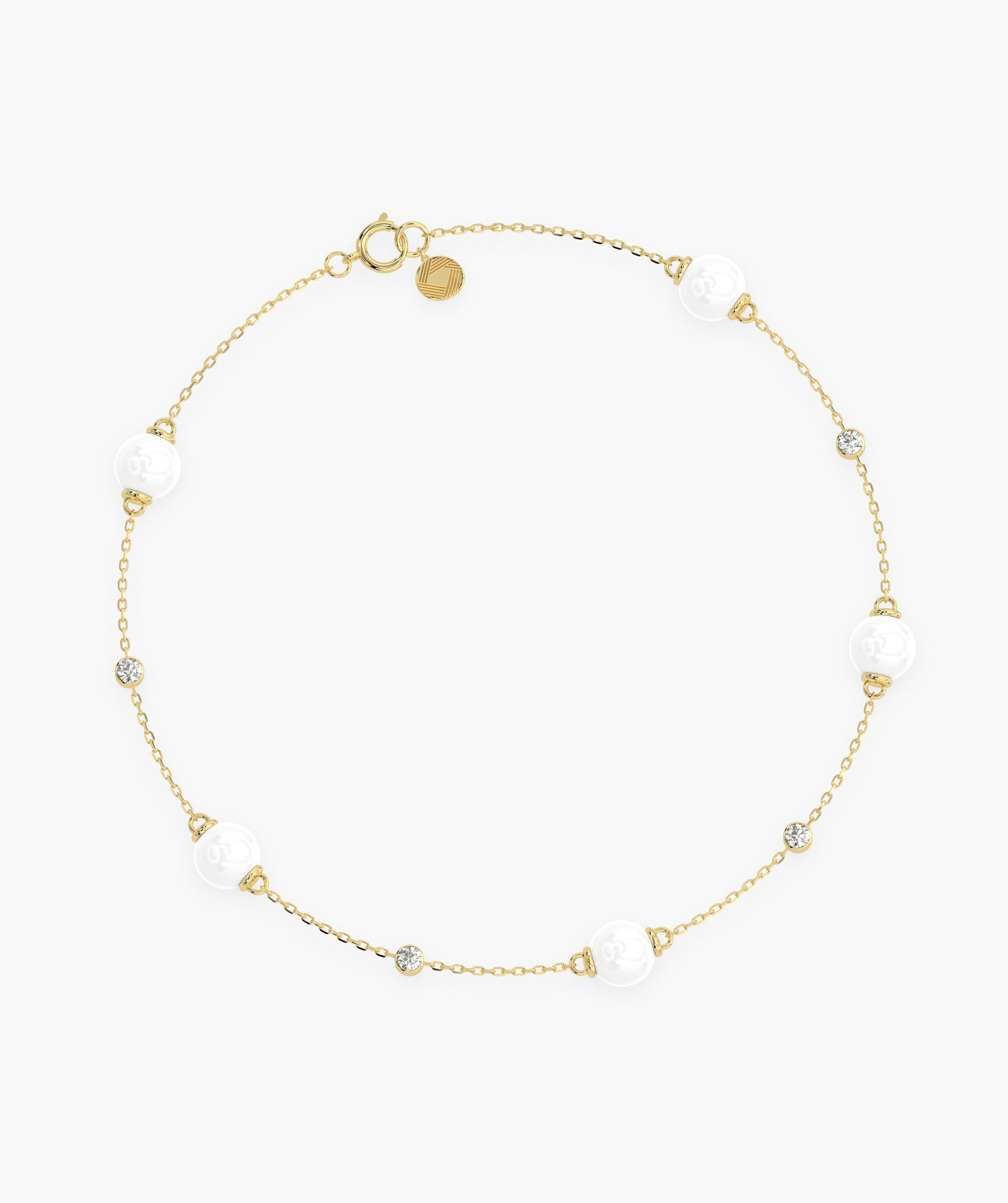 This 14K solid gold bracelet gracefully alternates between luminous pearl accents and sparkling diamonds, creating a serene and sophisticated look.