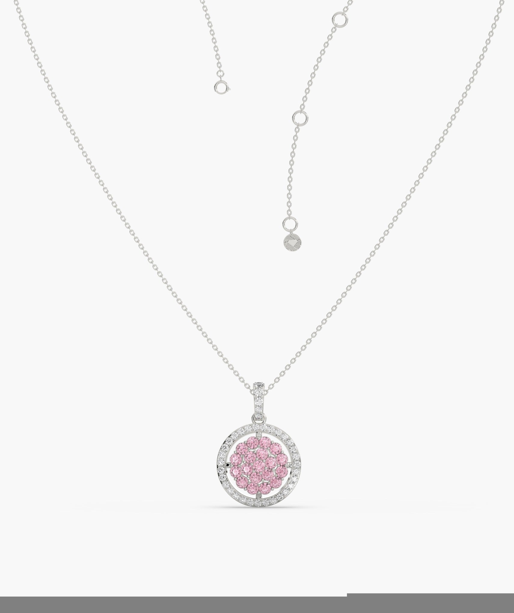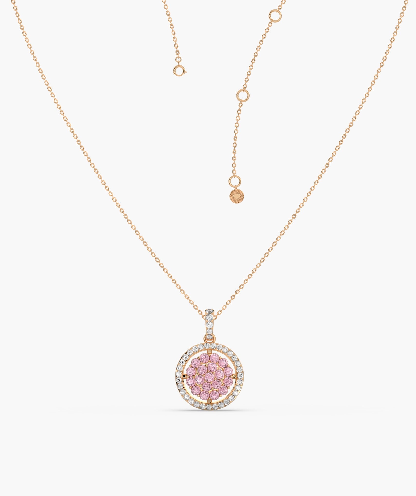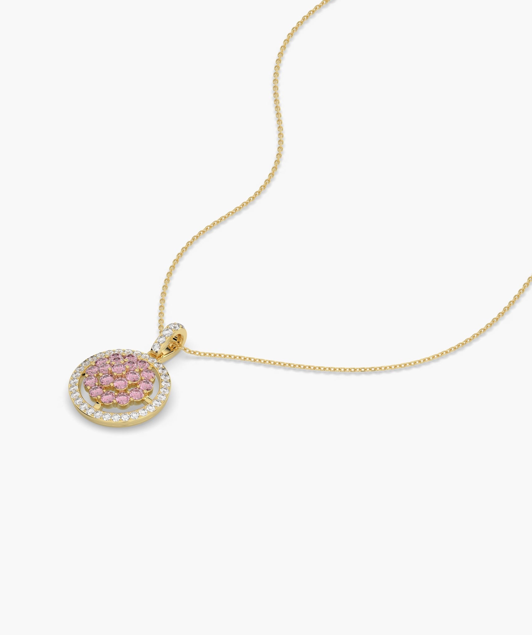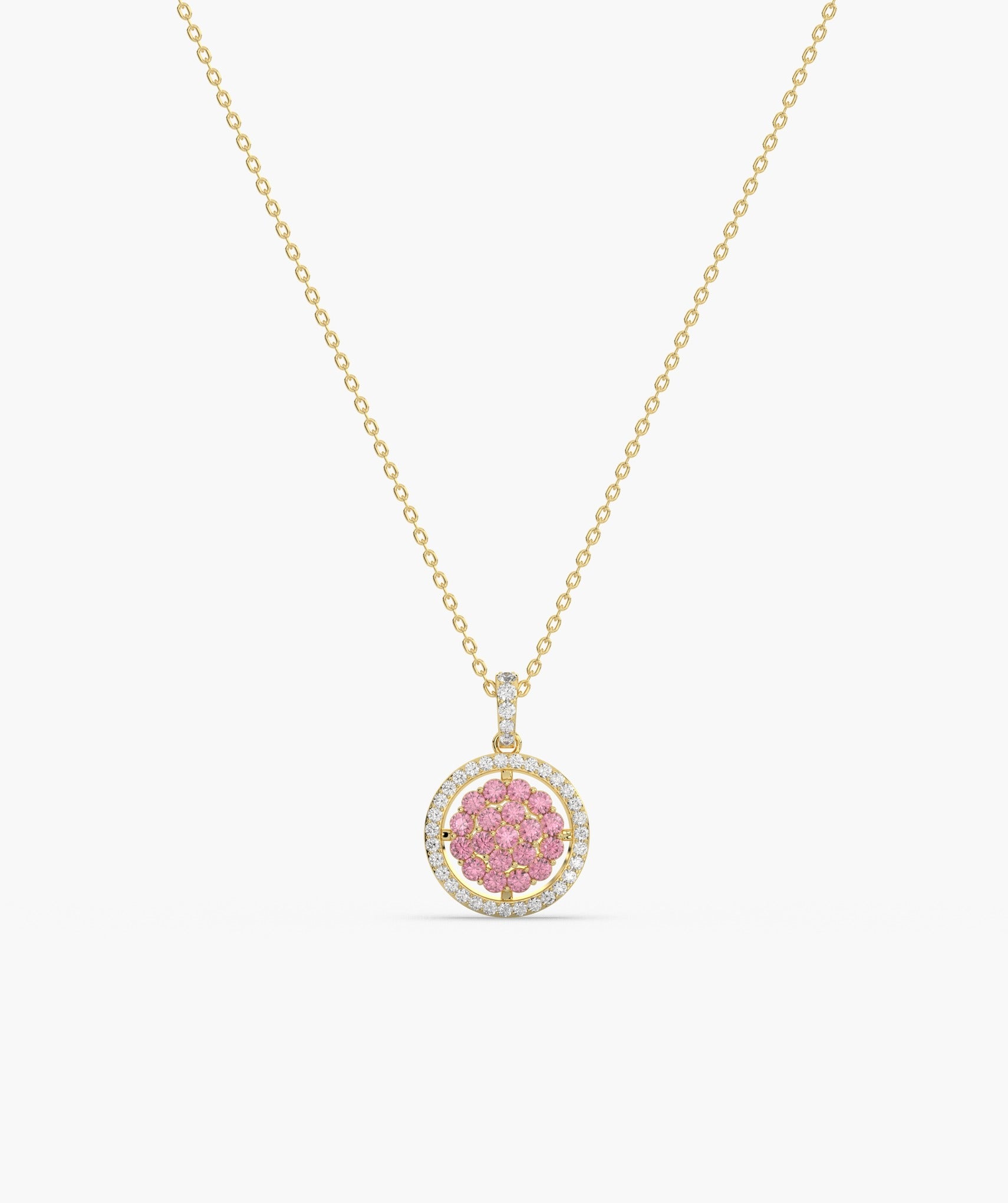 Elegant 14K gold necklace featuring a vibrant pink diamond cluster surrounded by sparkling white diamonds.