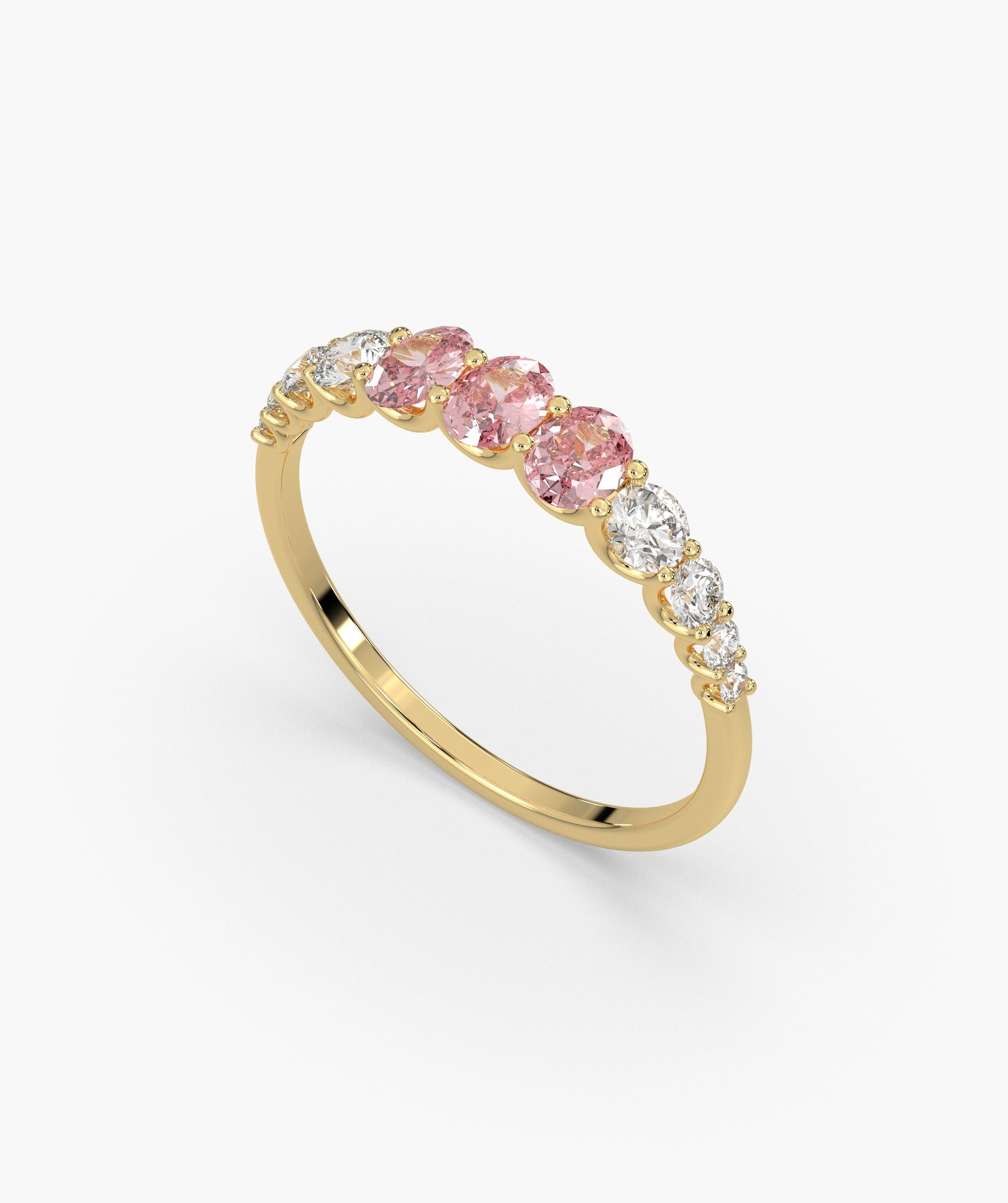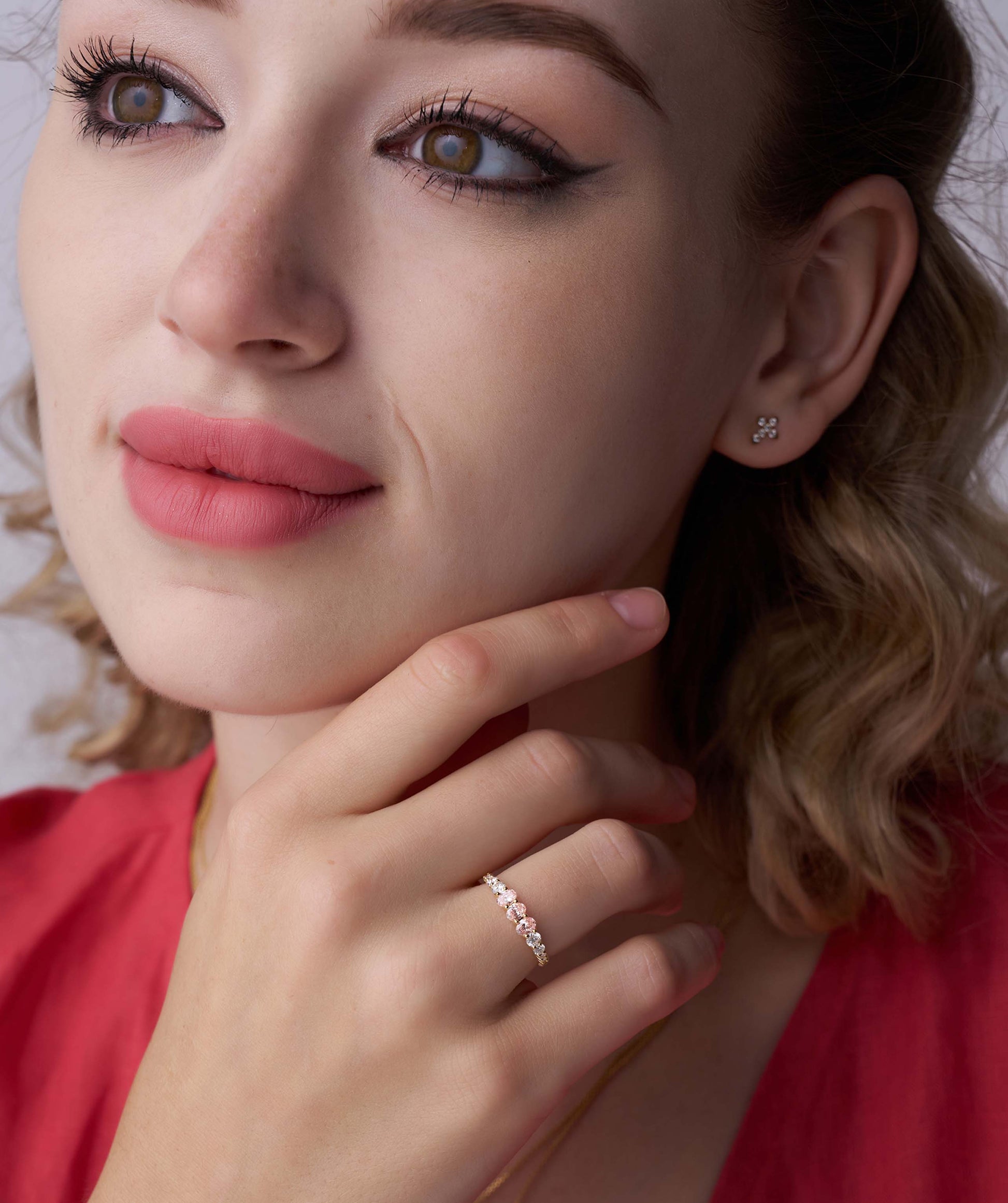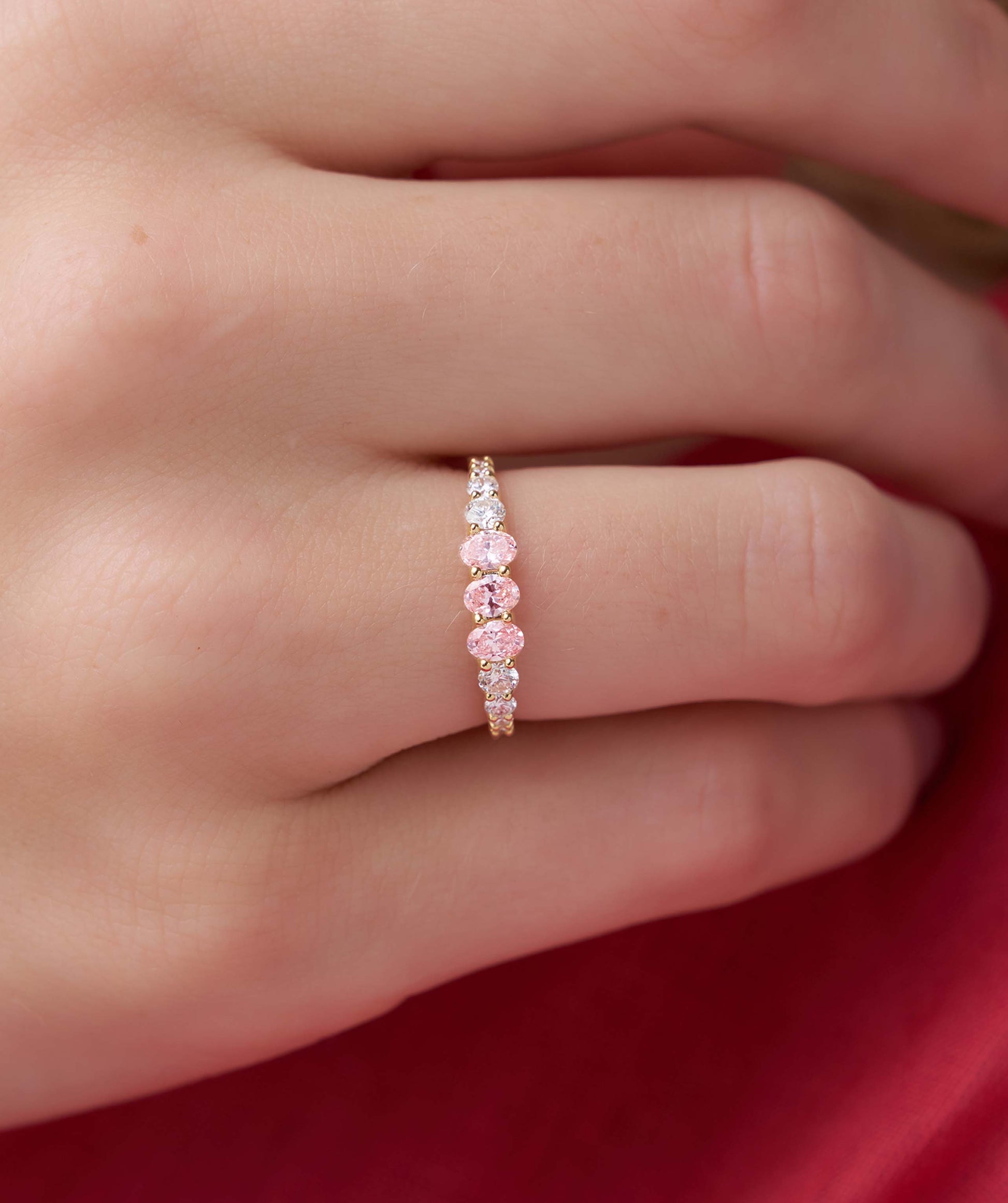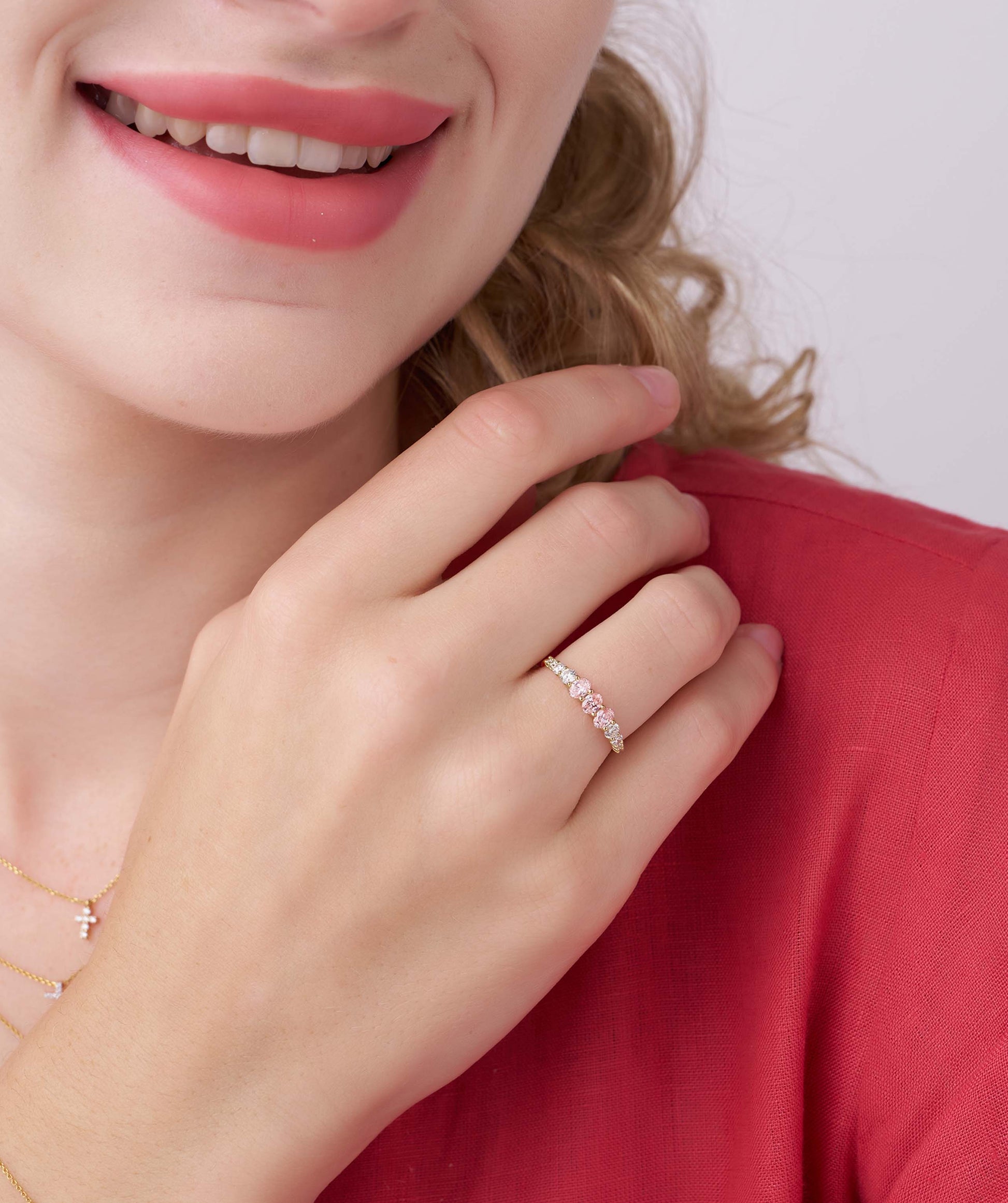 Celebrate feminine charm with this 14K gold ring, featuring three radiant pink stones framed by sparkling white accents.