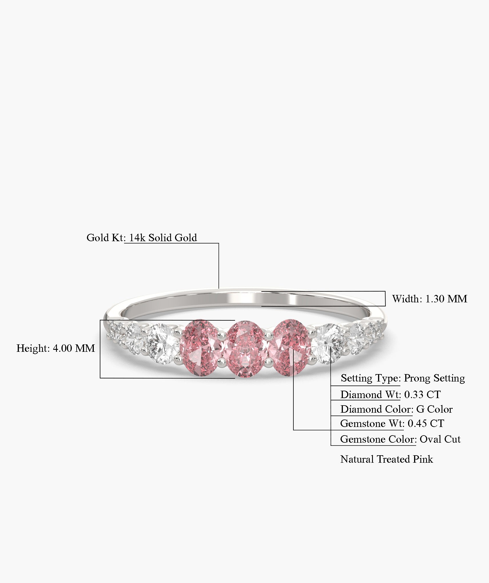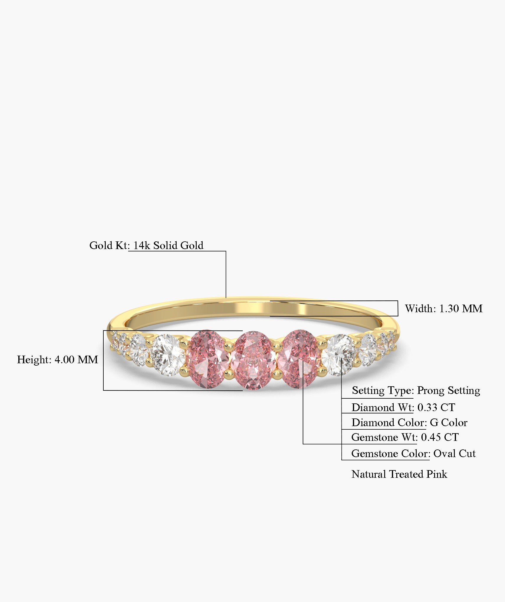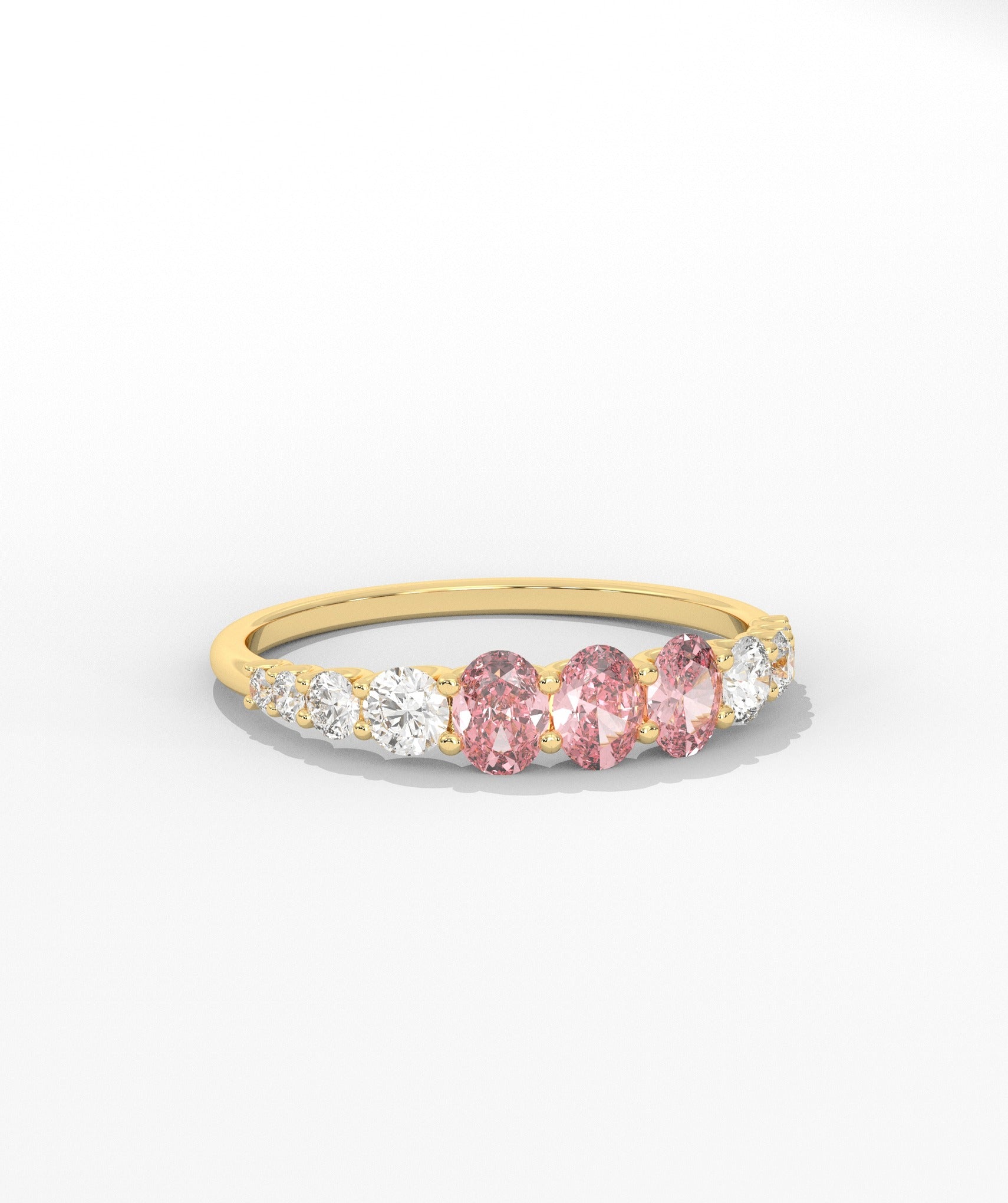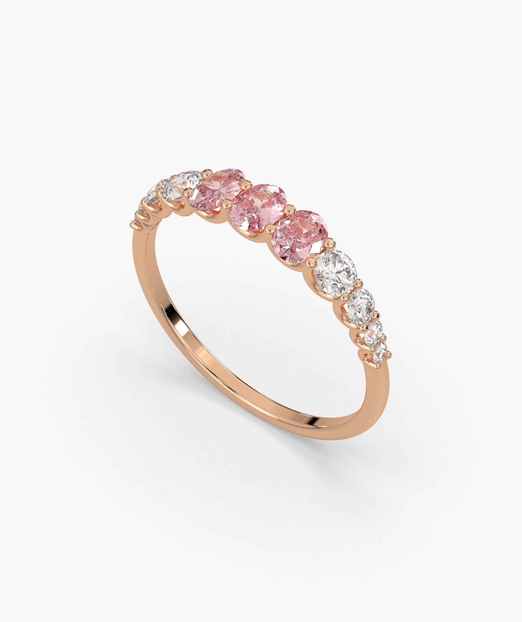 Celebrate feminine charm with this 14K gold ring, featuring three radiant pink stones framed by sparkling white accents.