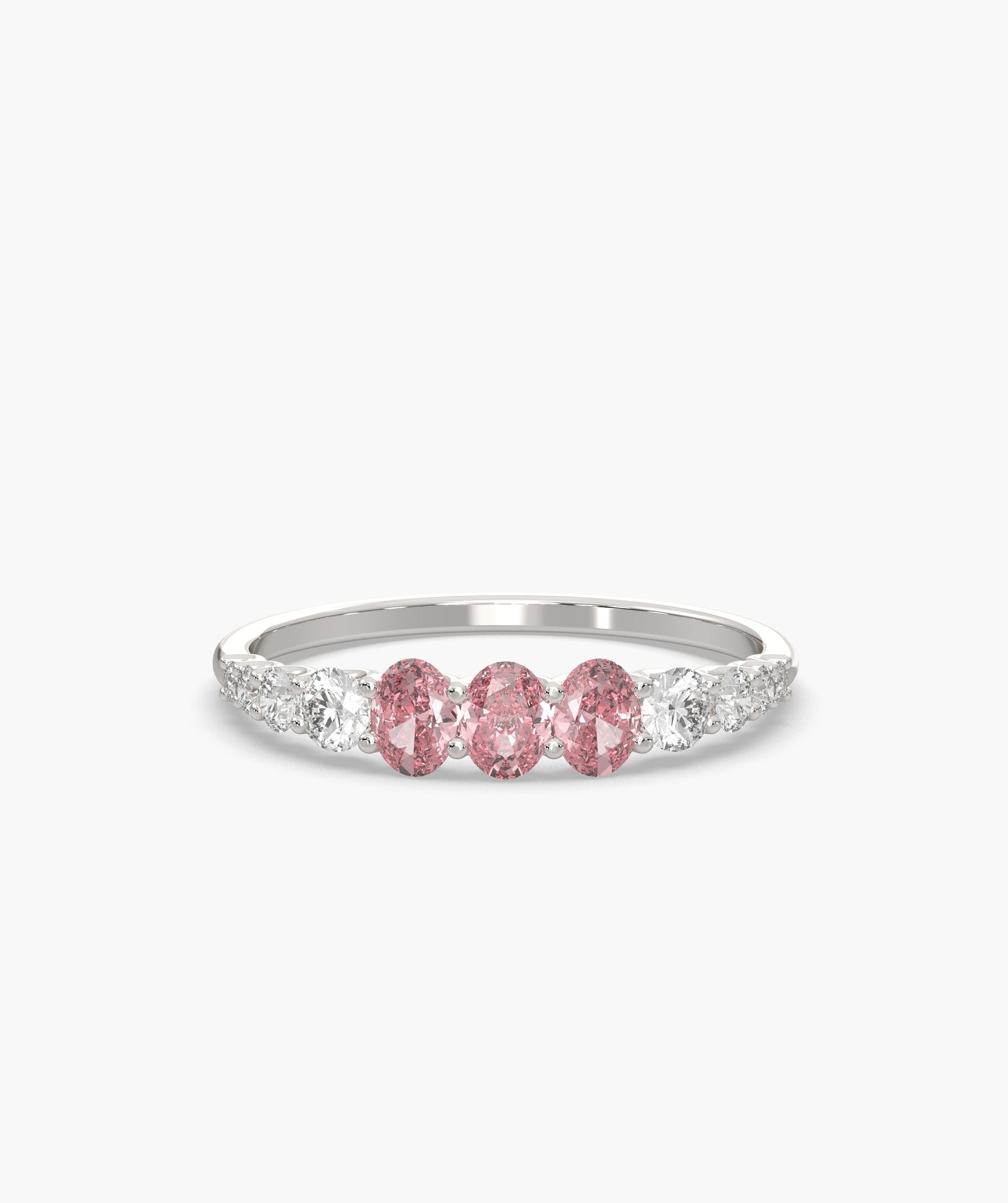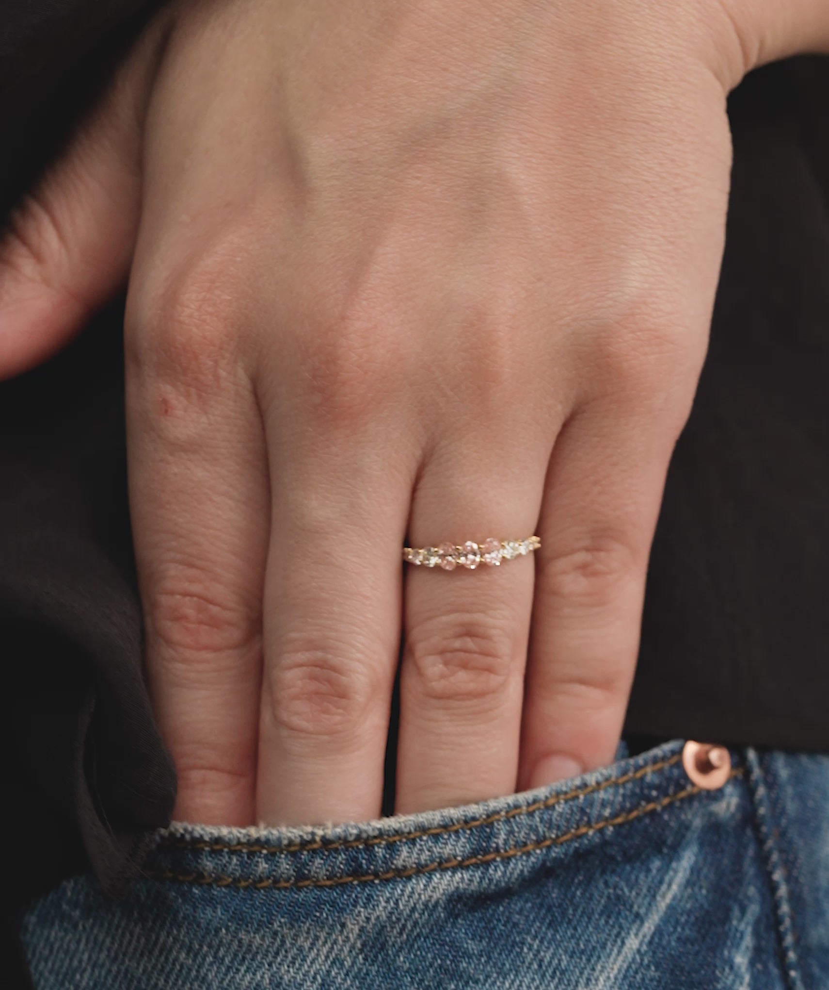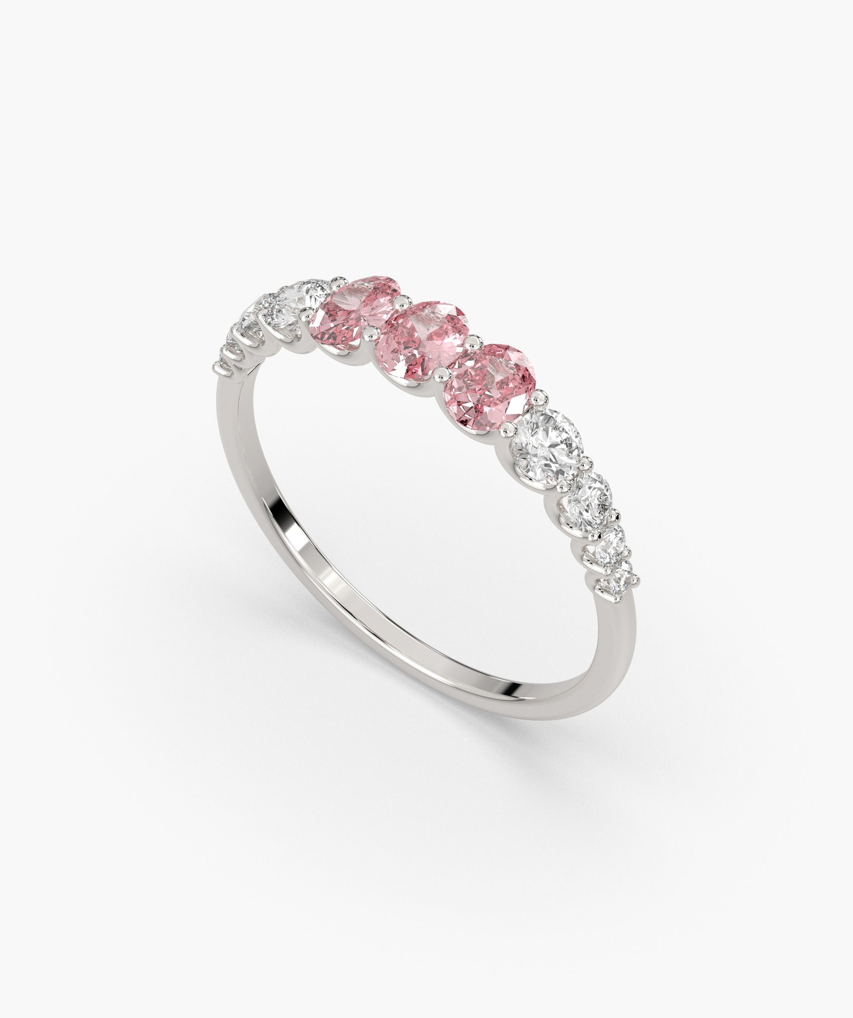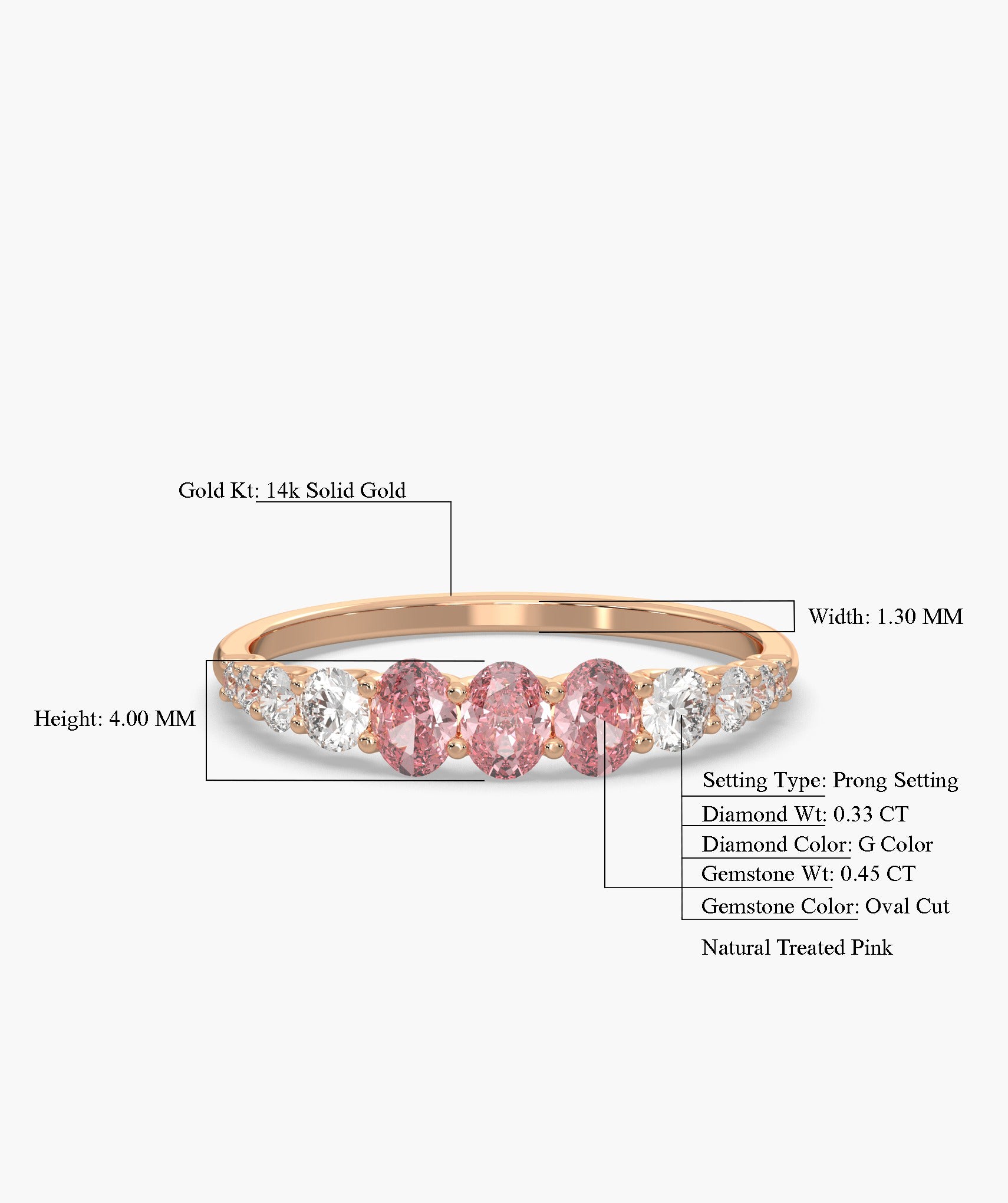 Celebrate feminine charm with this 14K gold ring, featuring three radiant pink stones framed by sparkling white accents.