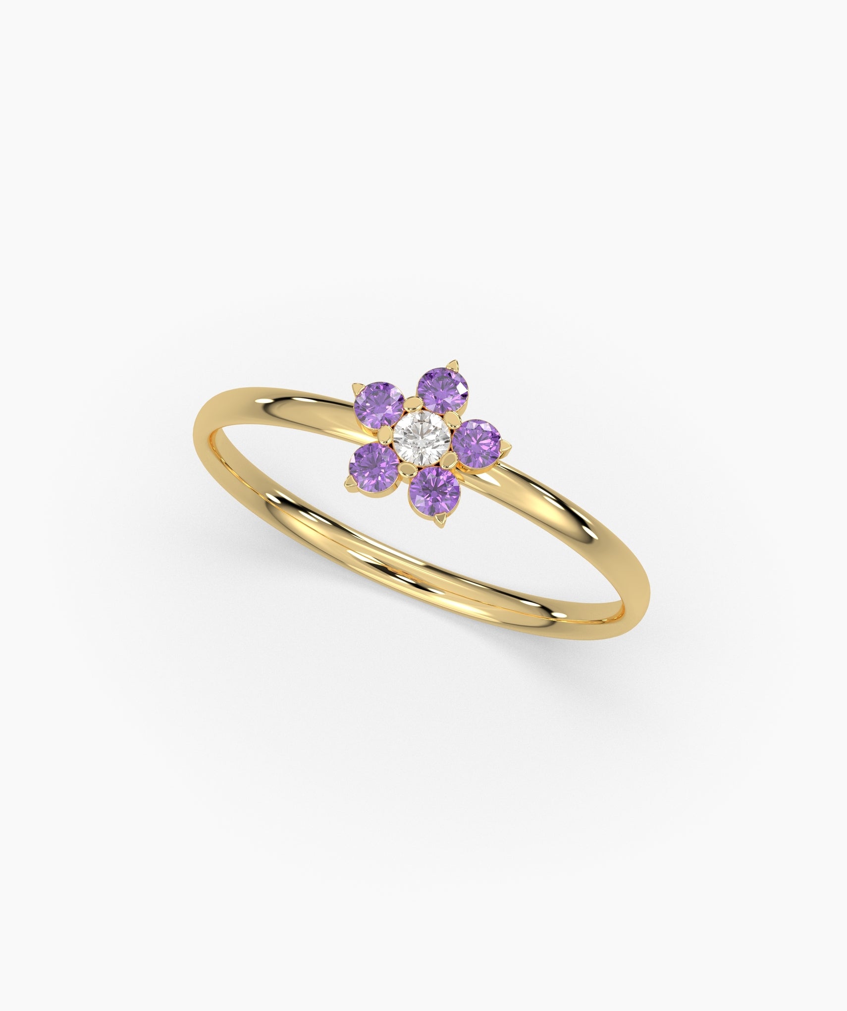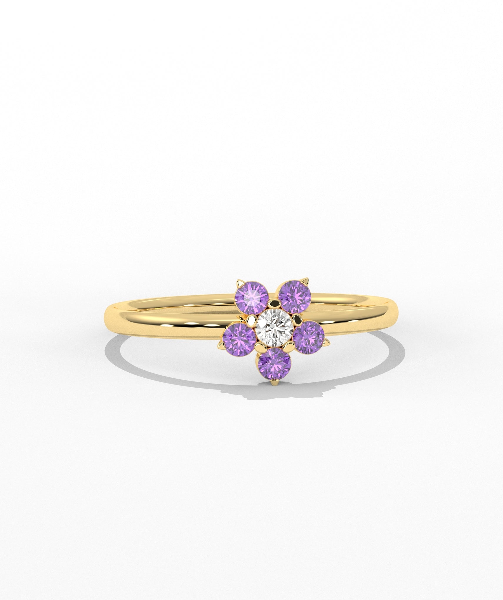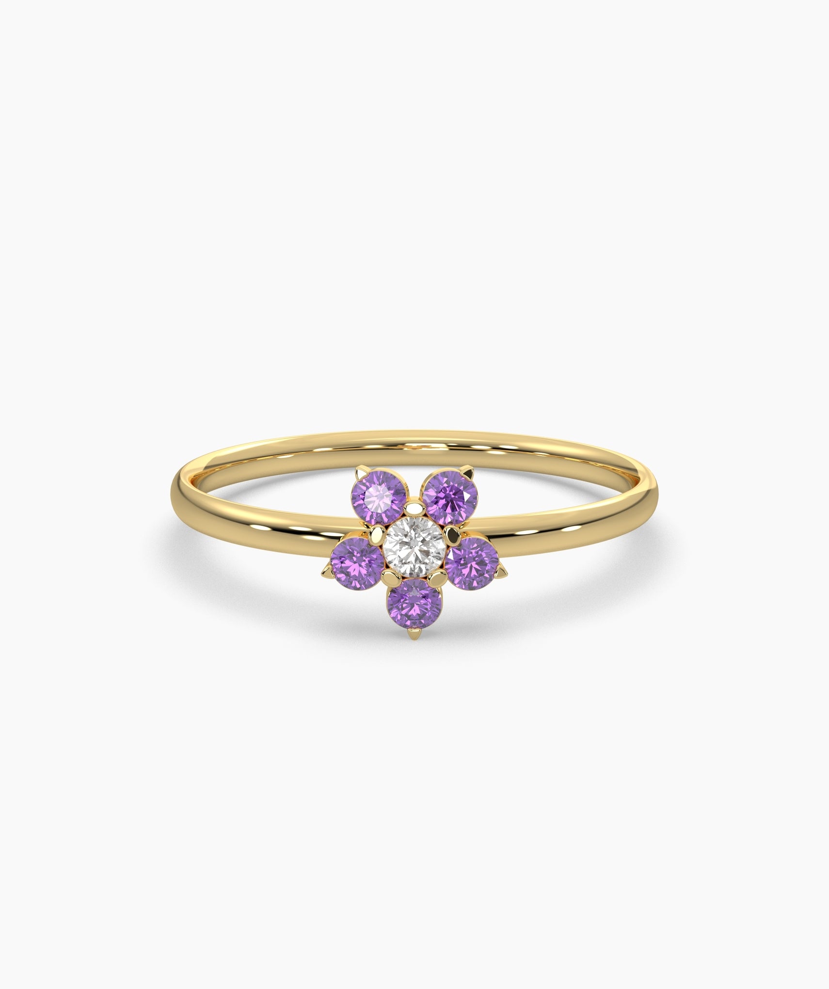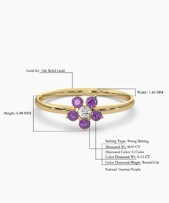 Infuse your daily stack with a playful pop of color that feels fresh and feminine. This whimsical design features a brilliant 0.05ct G-color white diamond center, surrounded by five vibrant purple diamonds to create a blooming 0.20ct floral motif. Expertly crafted in 14K solid gold, the stones are held in a classic prong setting that highlights their vivid hue. Resting on a polished 1.60mm band, it offers a comfortable, durable fit that adds a touch of springtime joy to your office blazer or weekend denim. Available in yellow, white, and rose gold to perfectly complement your unique style palette.