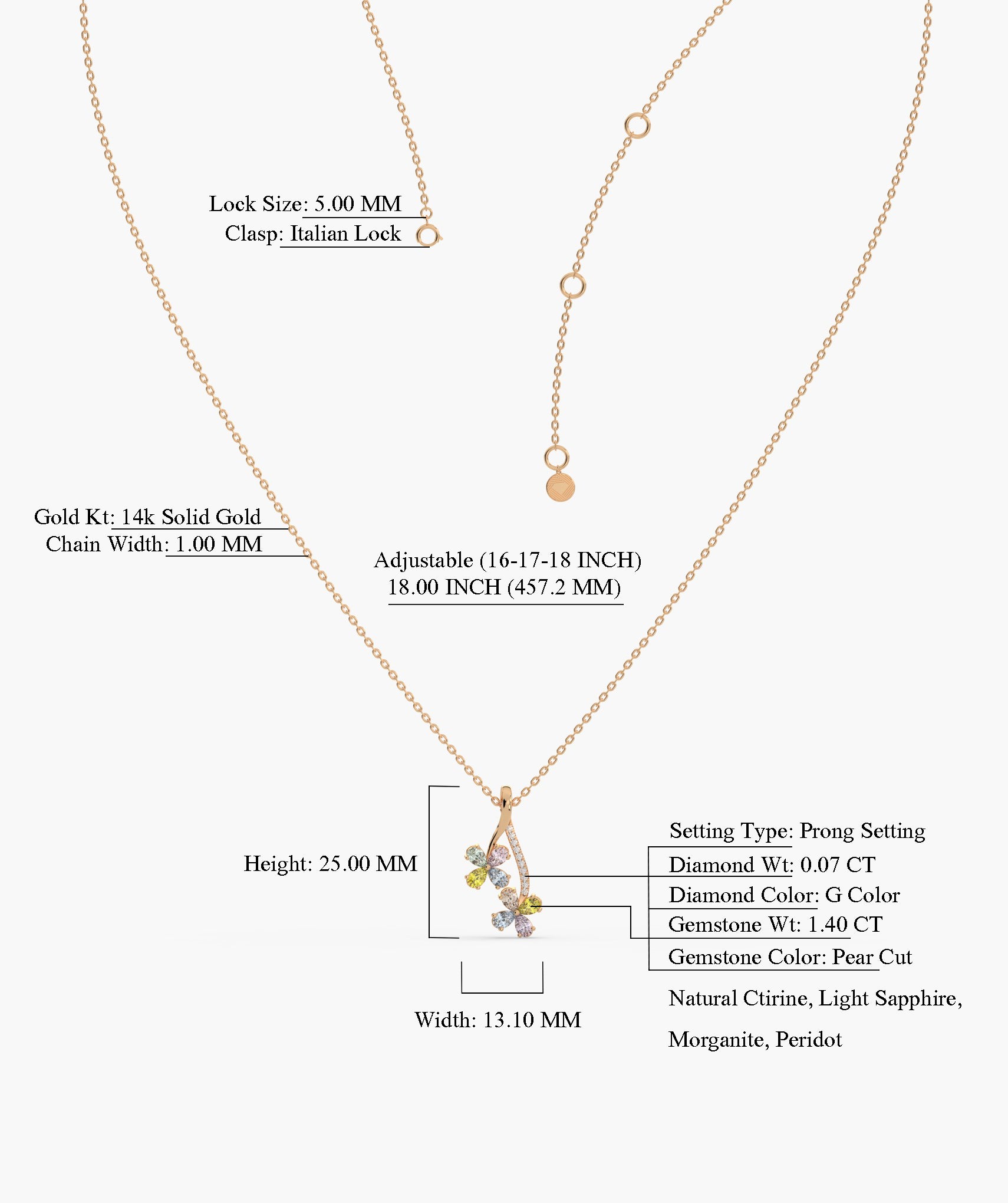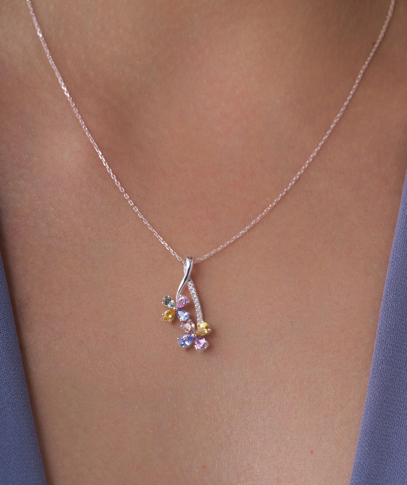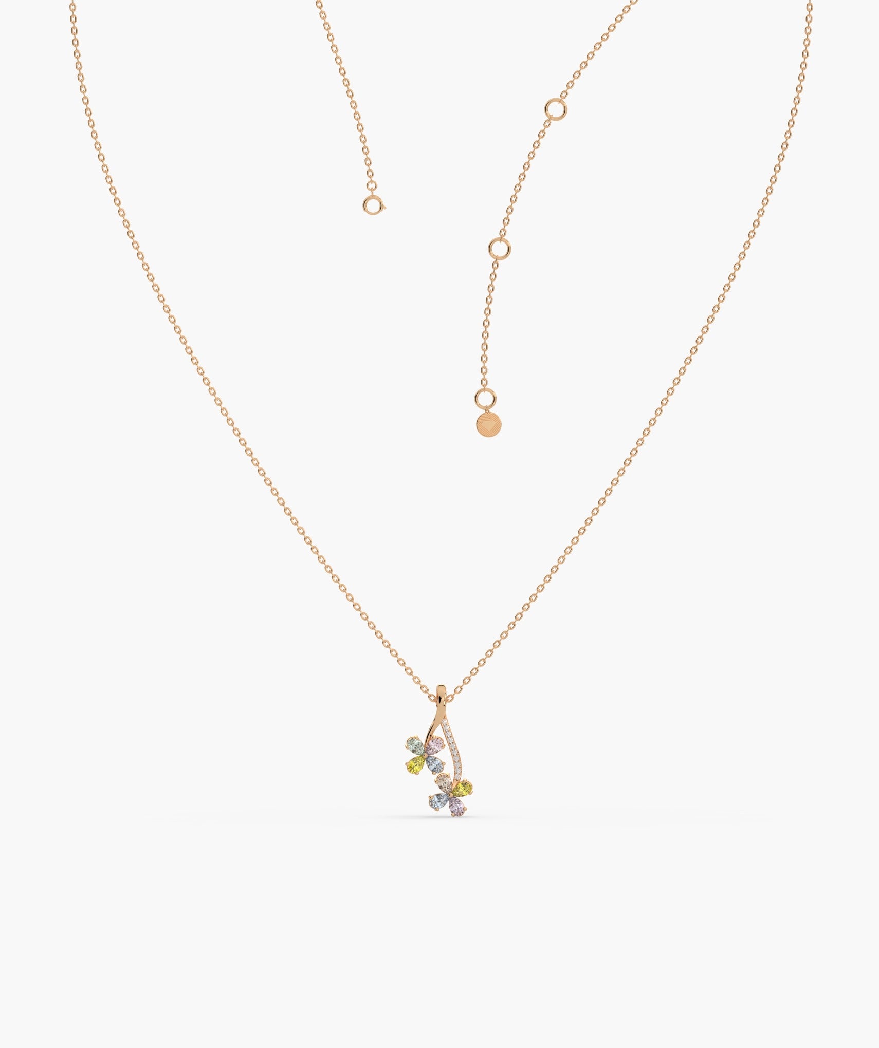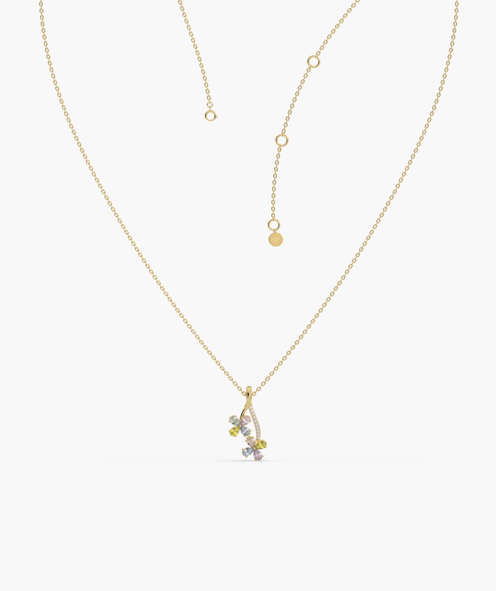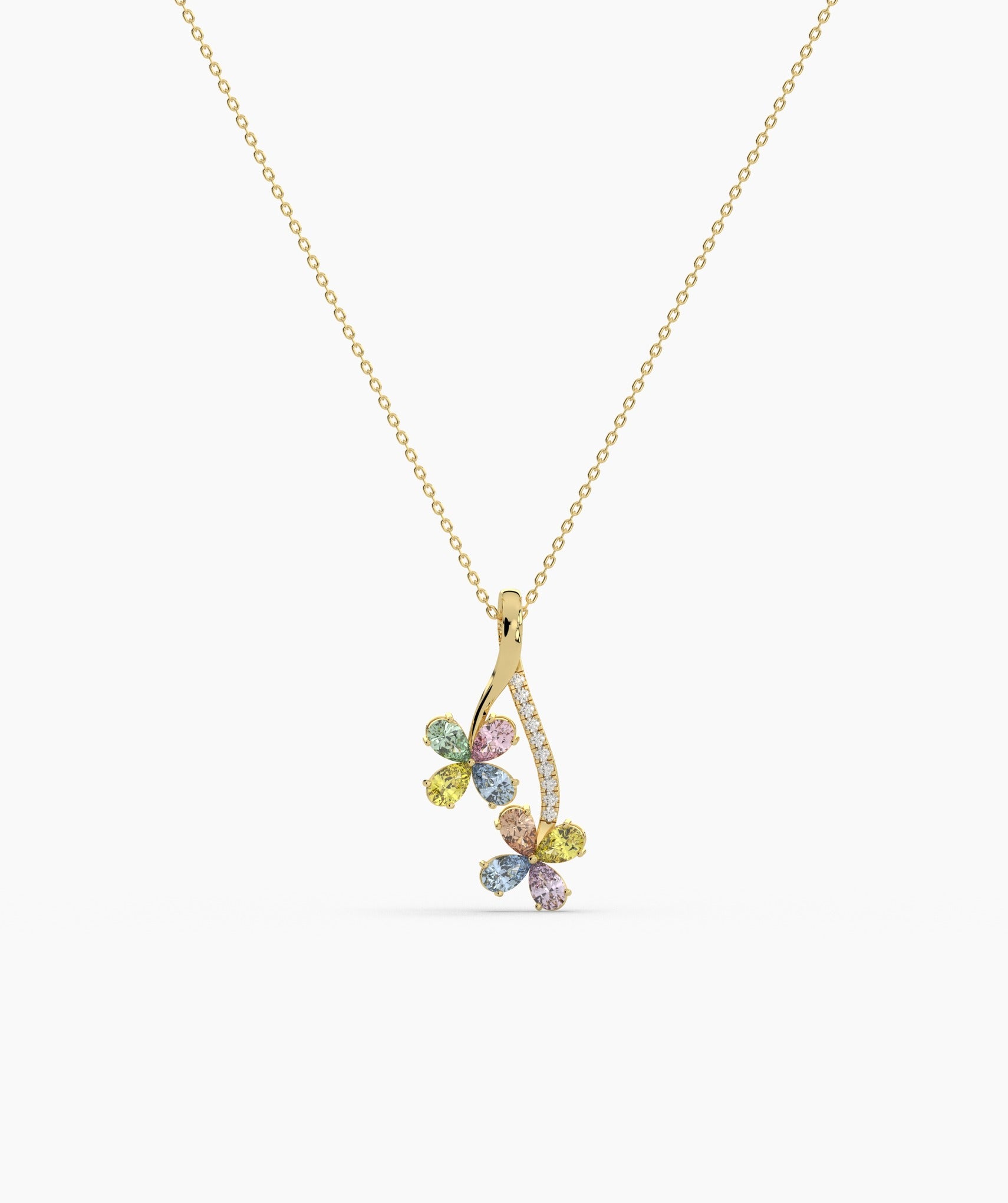 This 14K solid gold necklace features a vibrant floral design with multicolored diamonds and a diamond-accented stem.