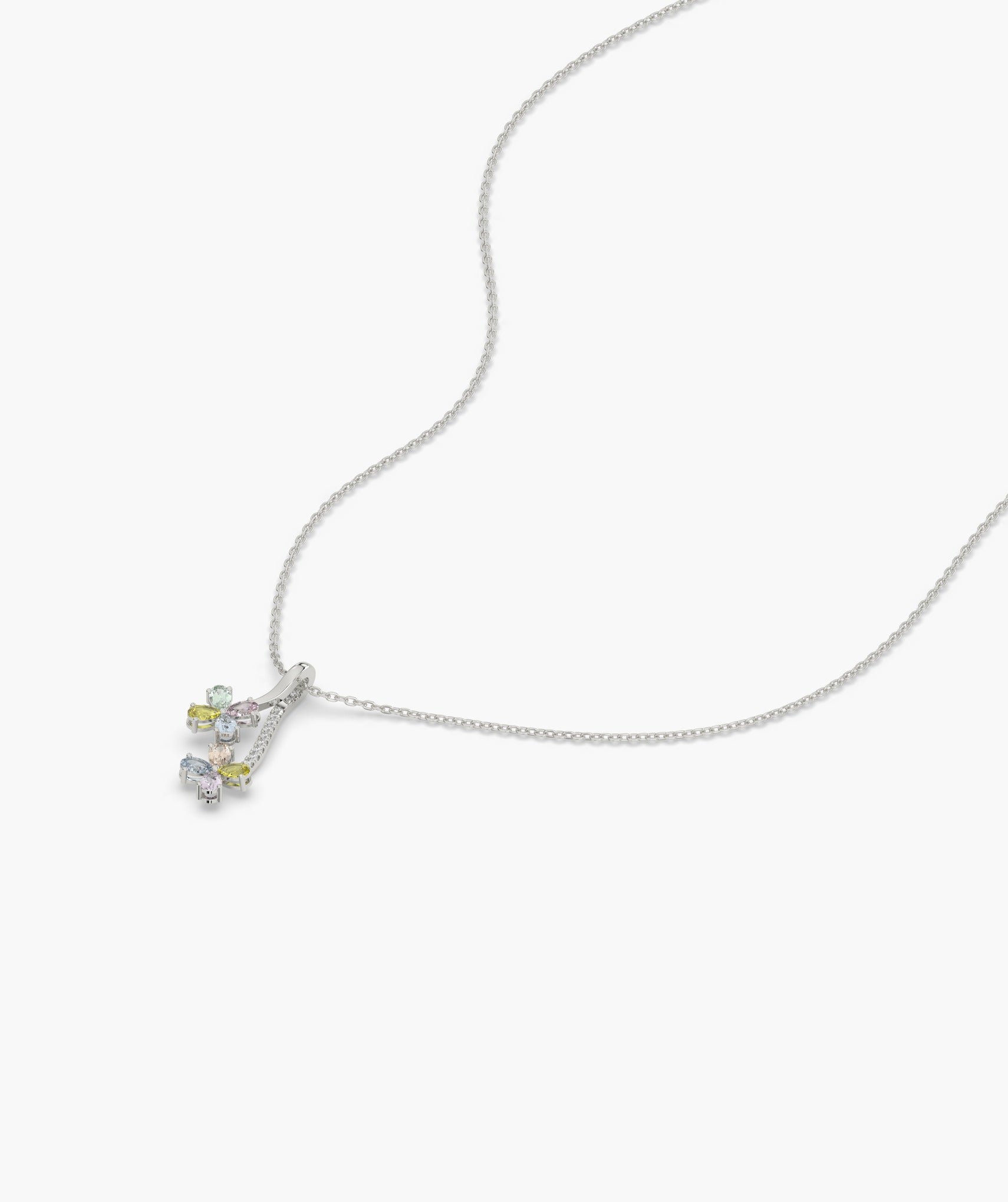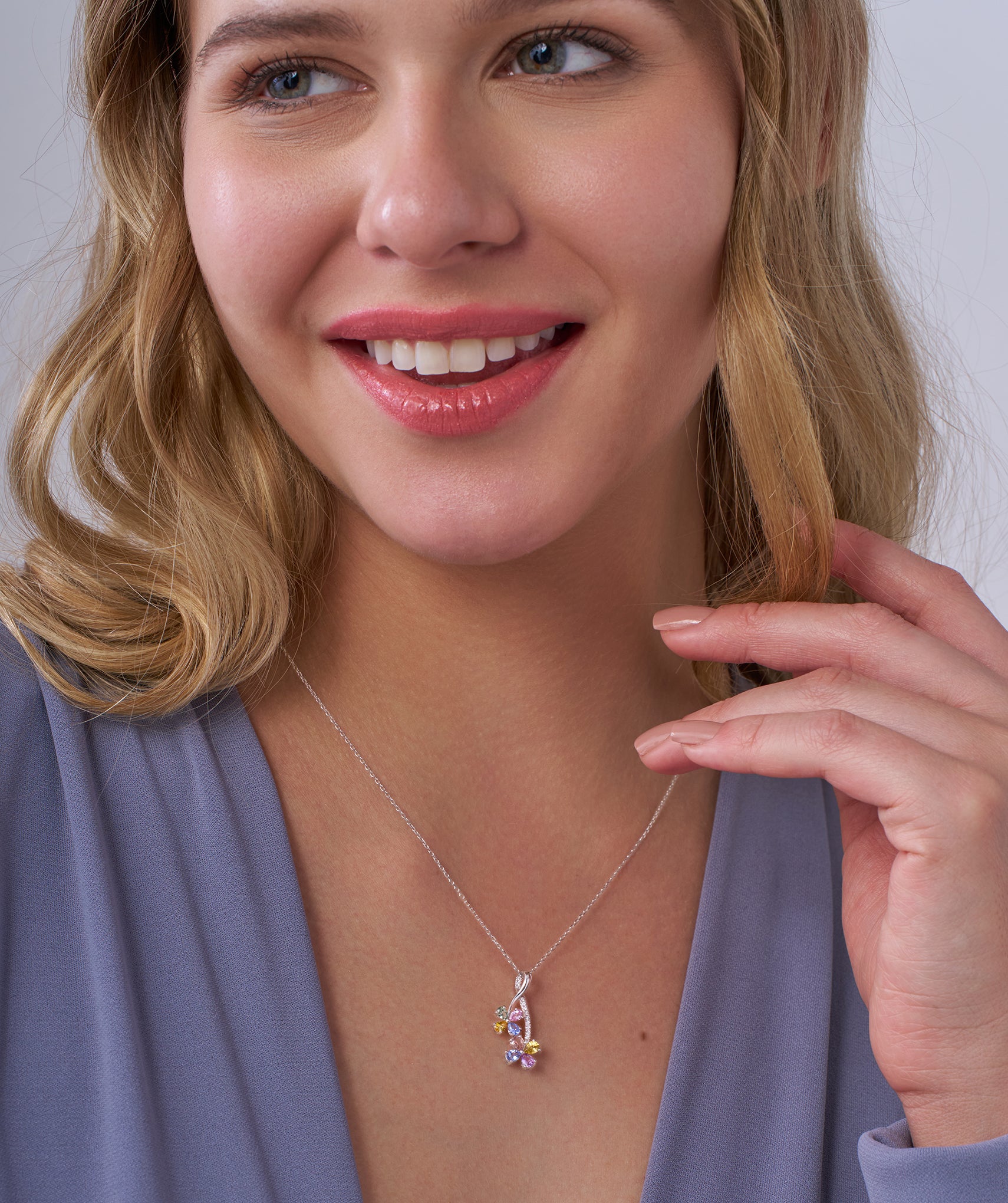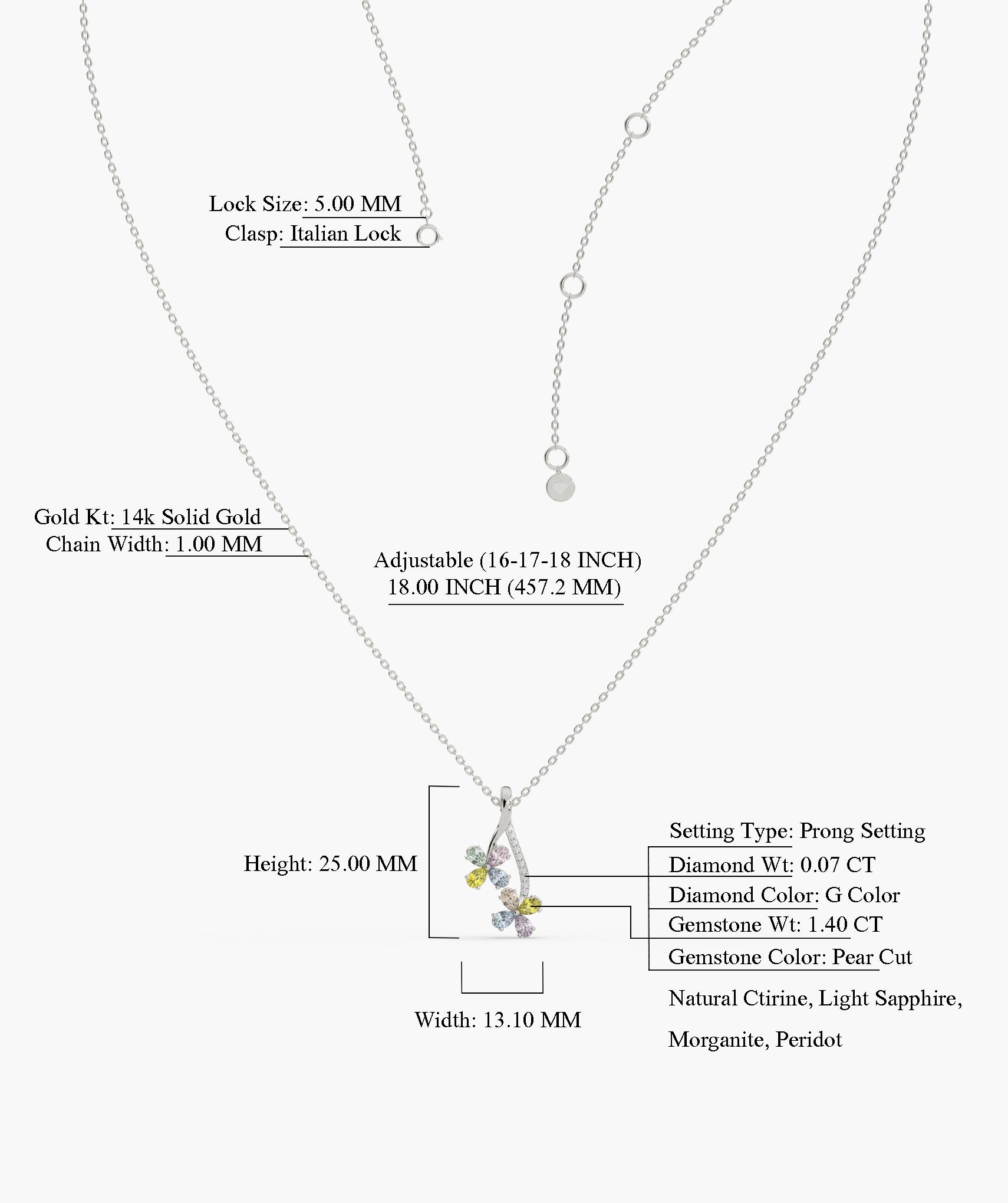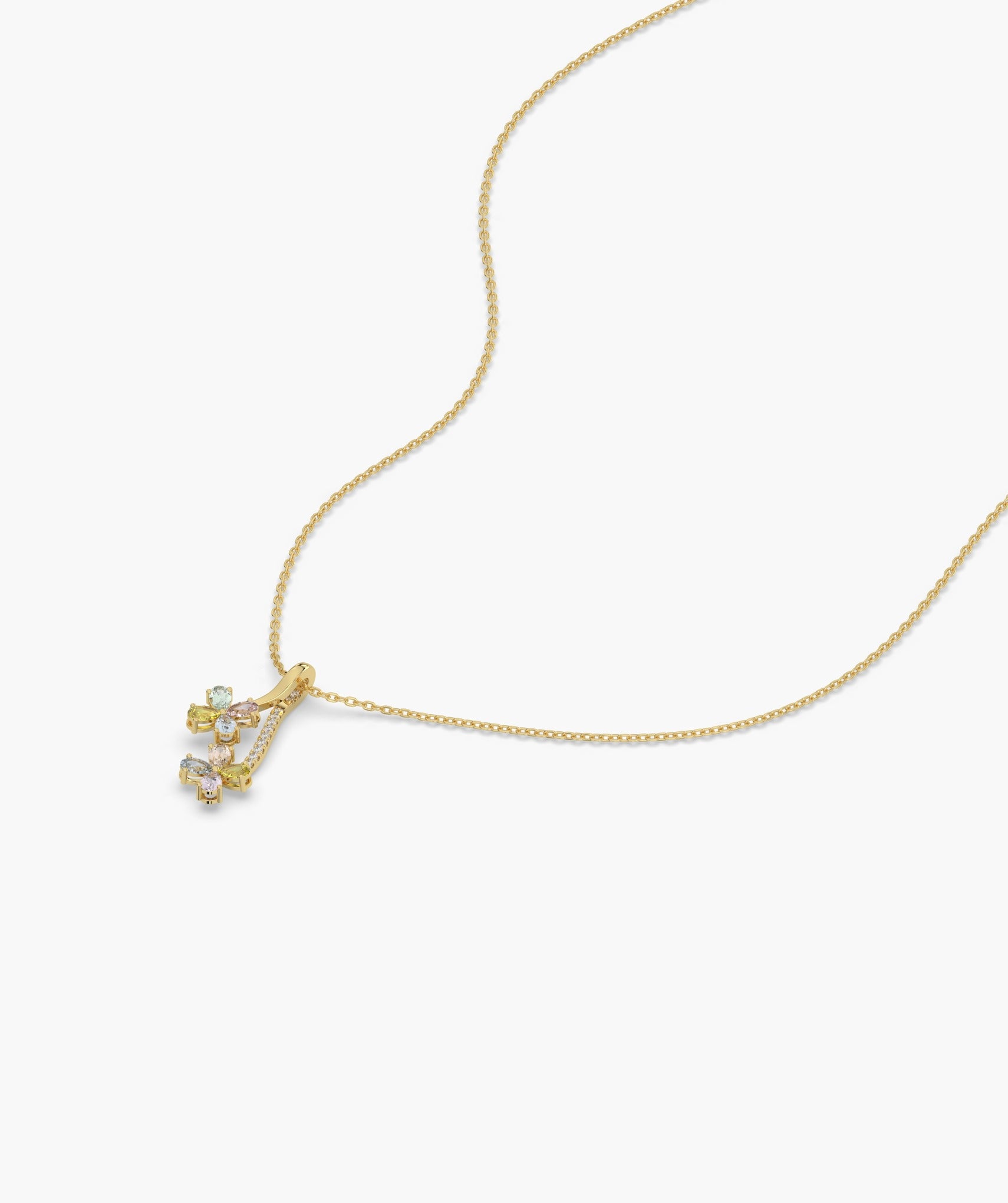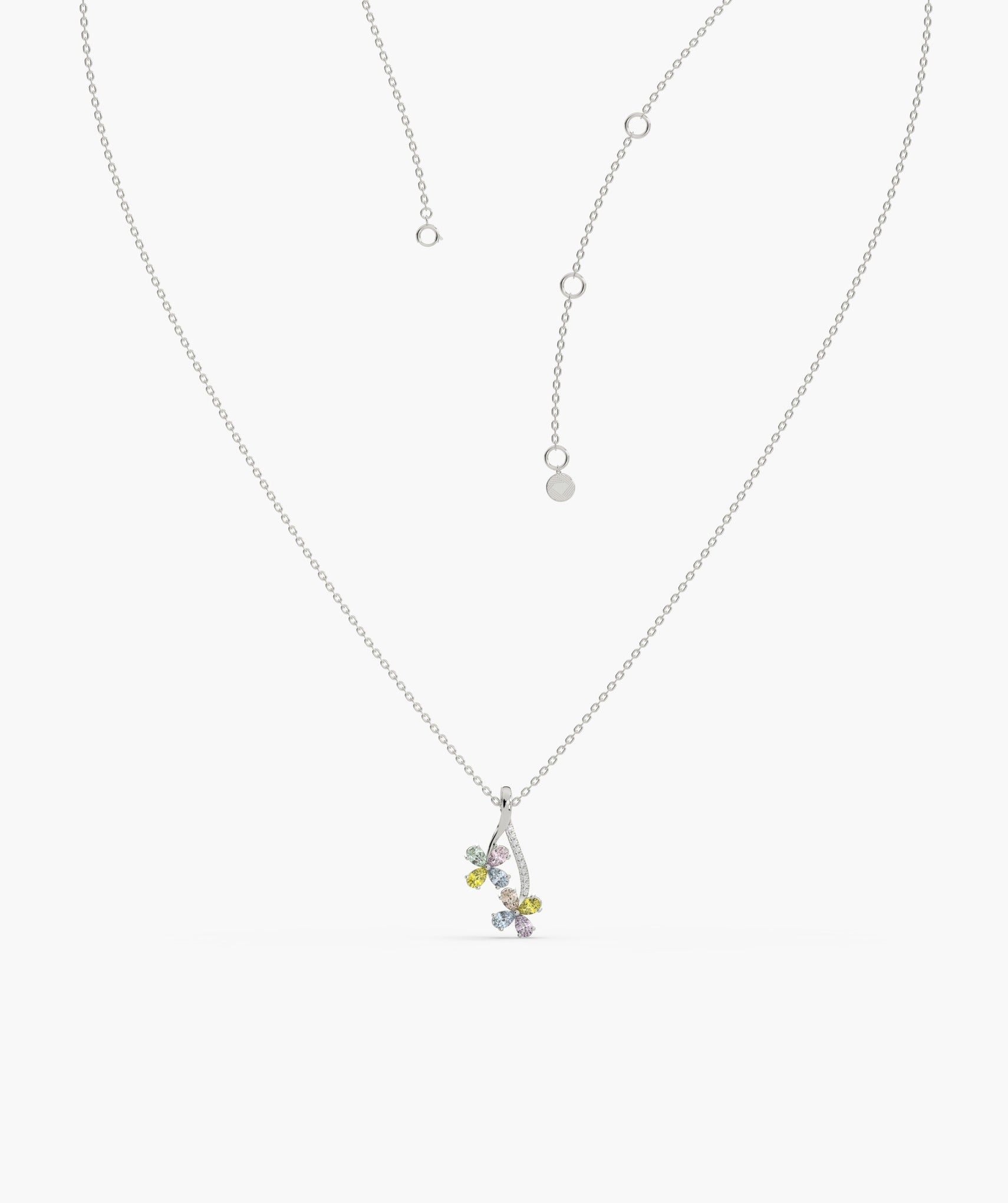 This 14K solid gold necklace features a vibrant floral design with multicolored diamonds and a diamond-accented stem.