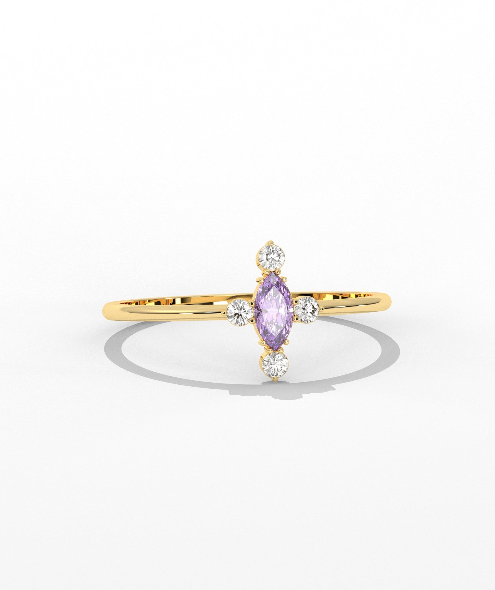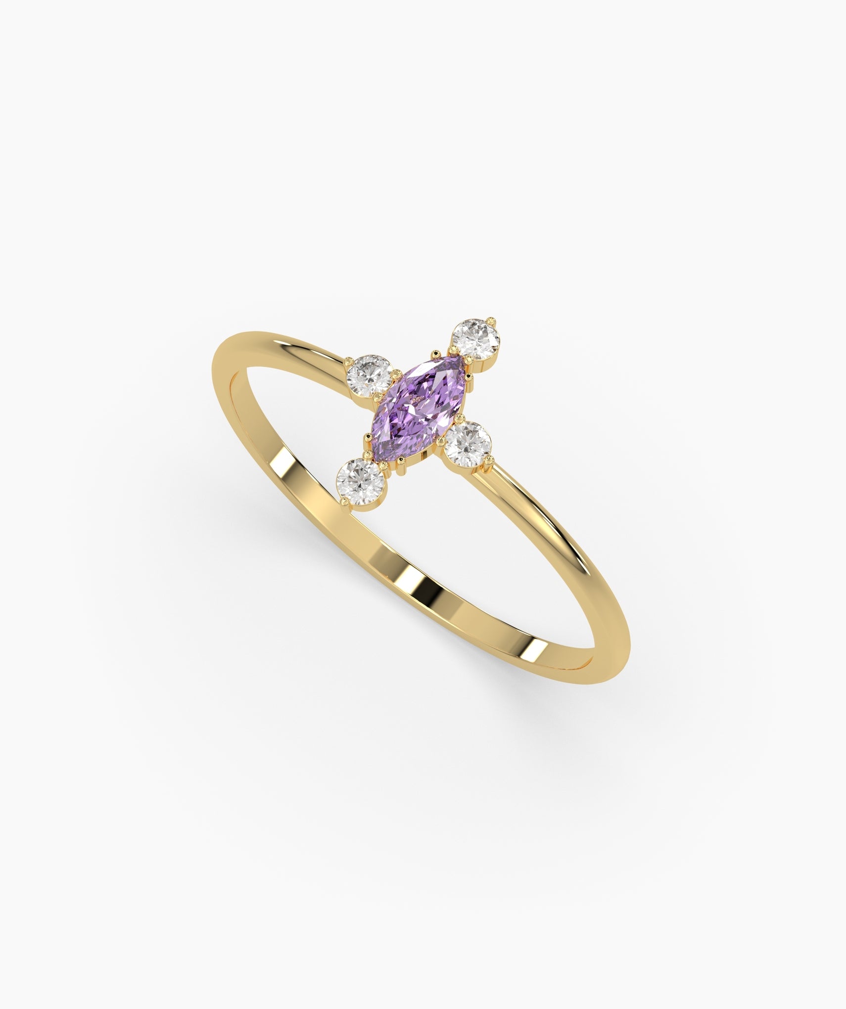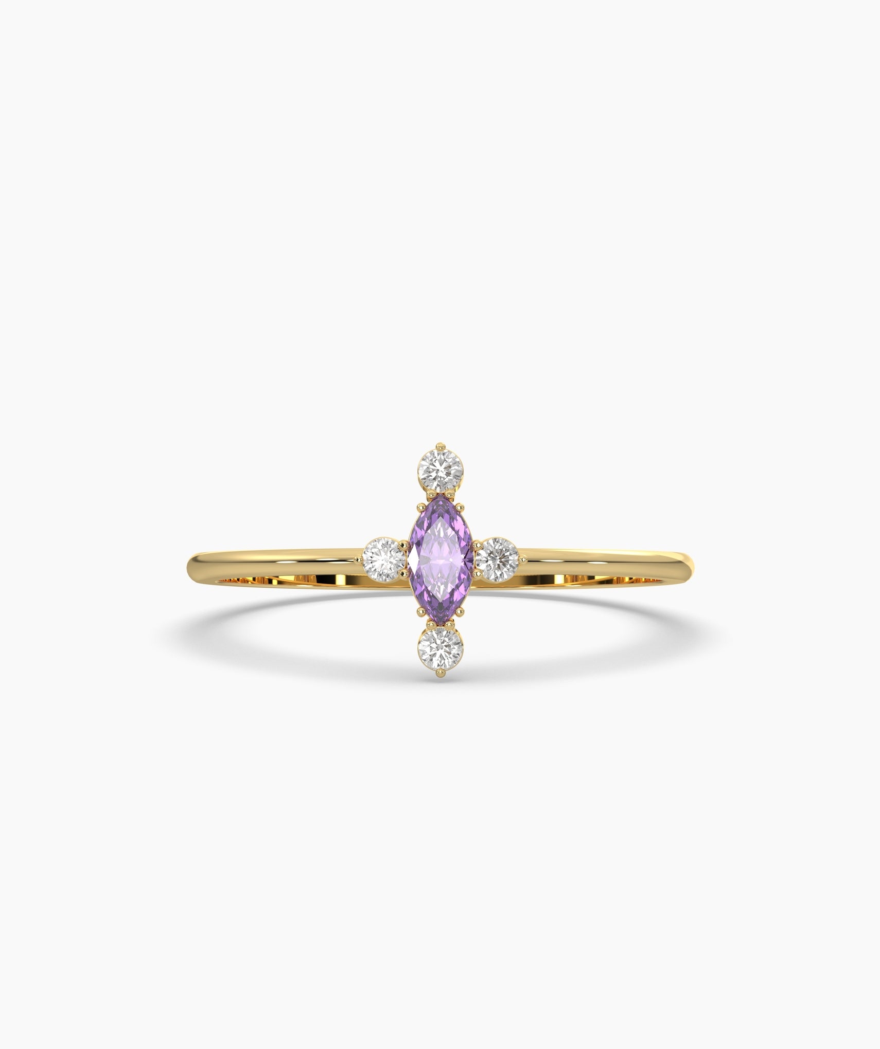 Add a vibrant touch of color to your daily rotation with this celestial inspired design. Set in 14K solid gold, the ring features a striking natural treated red marquise diamond at its center, framed by four shimmering white round diamonds in a compass like formation. The fiery contrast against the icy accents creates a look that feels both vintage and refreshingly modern. Available in yellow, white, and rose gold to suit your unique palette, this delicate piece is perfect for women who want a meaningful talisman that stands out in any stack.