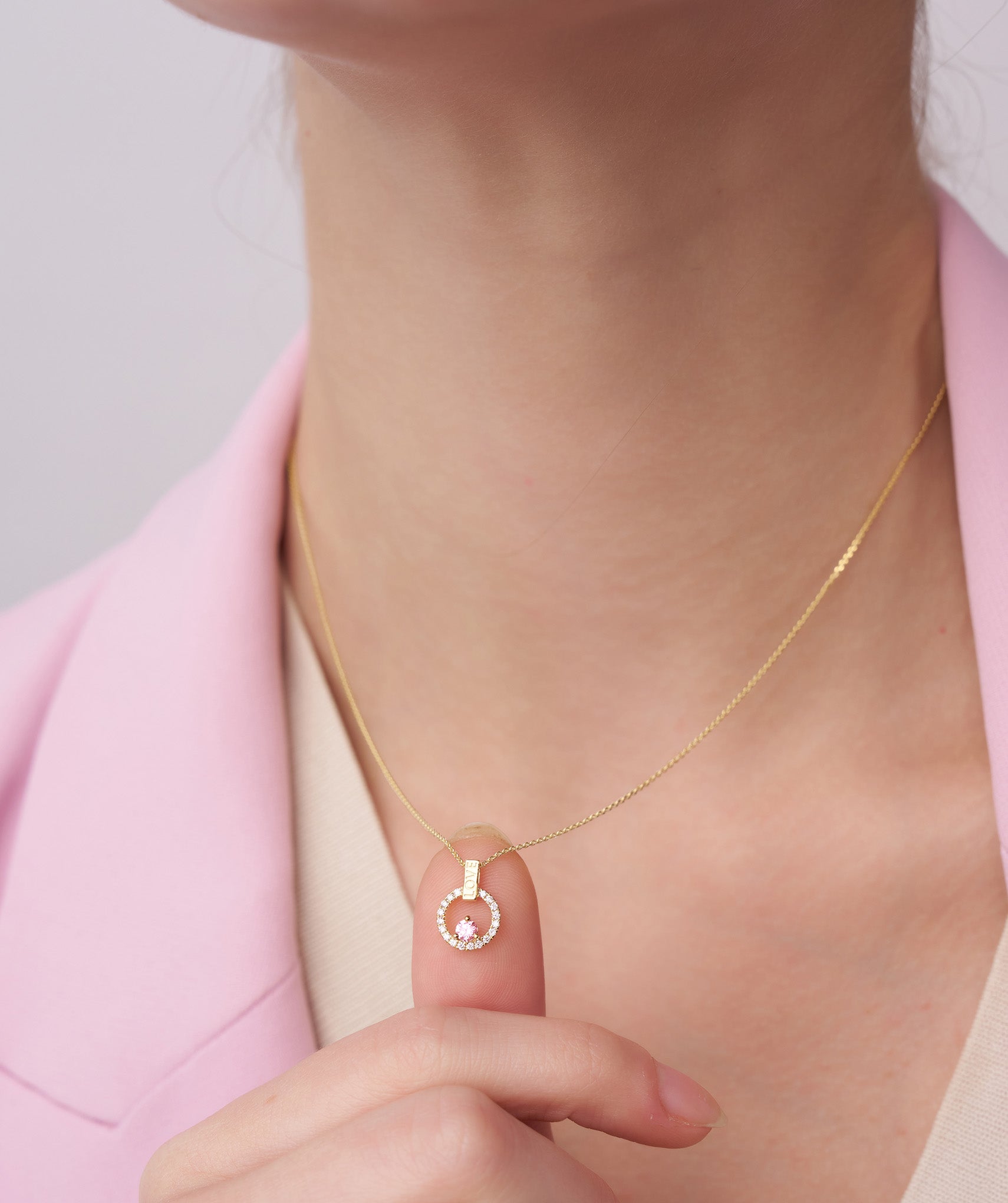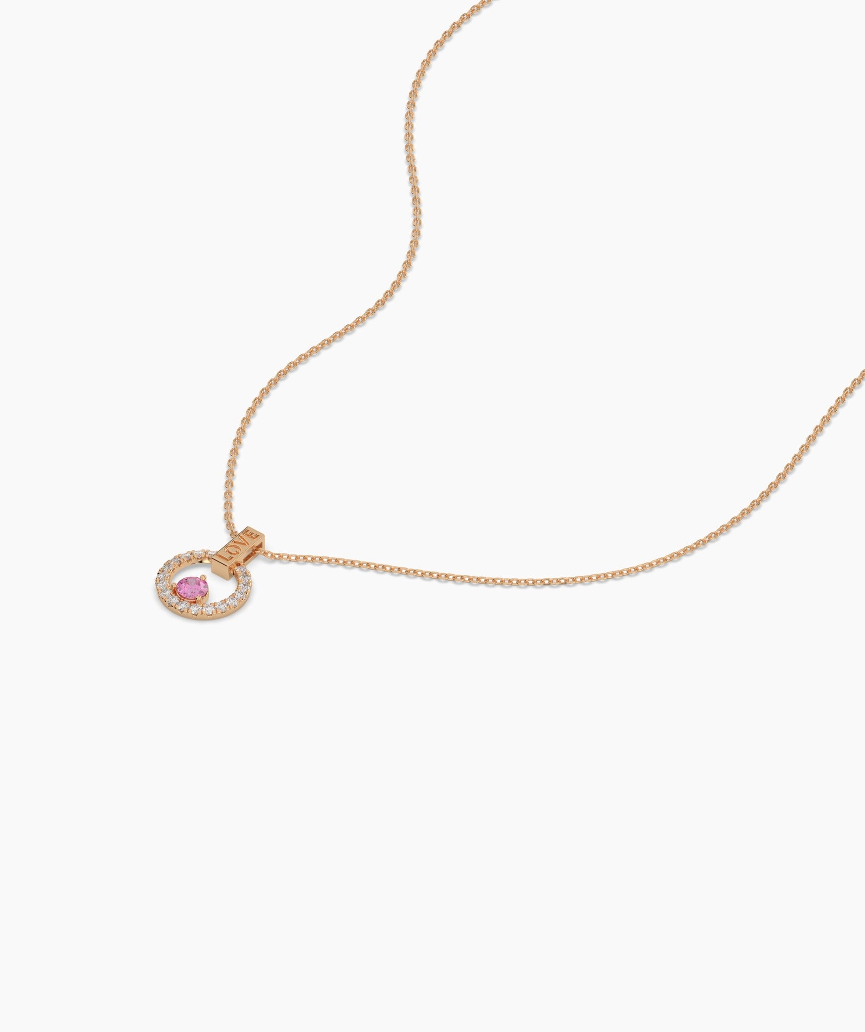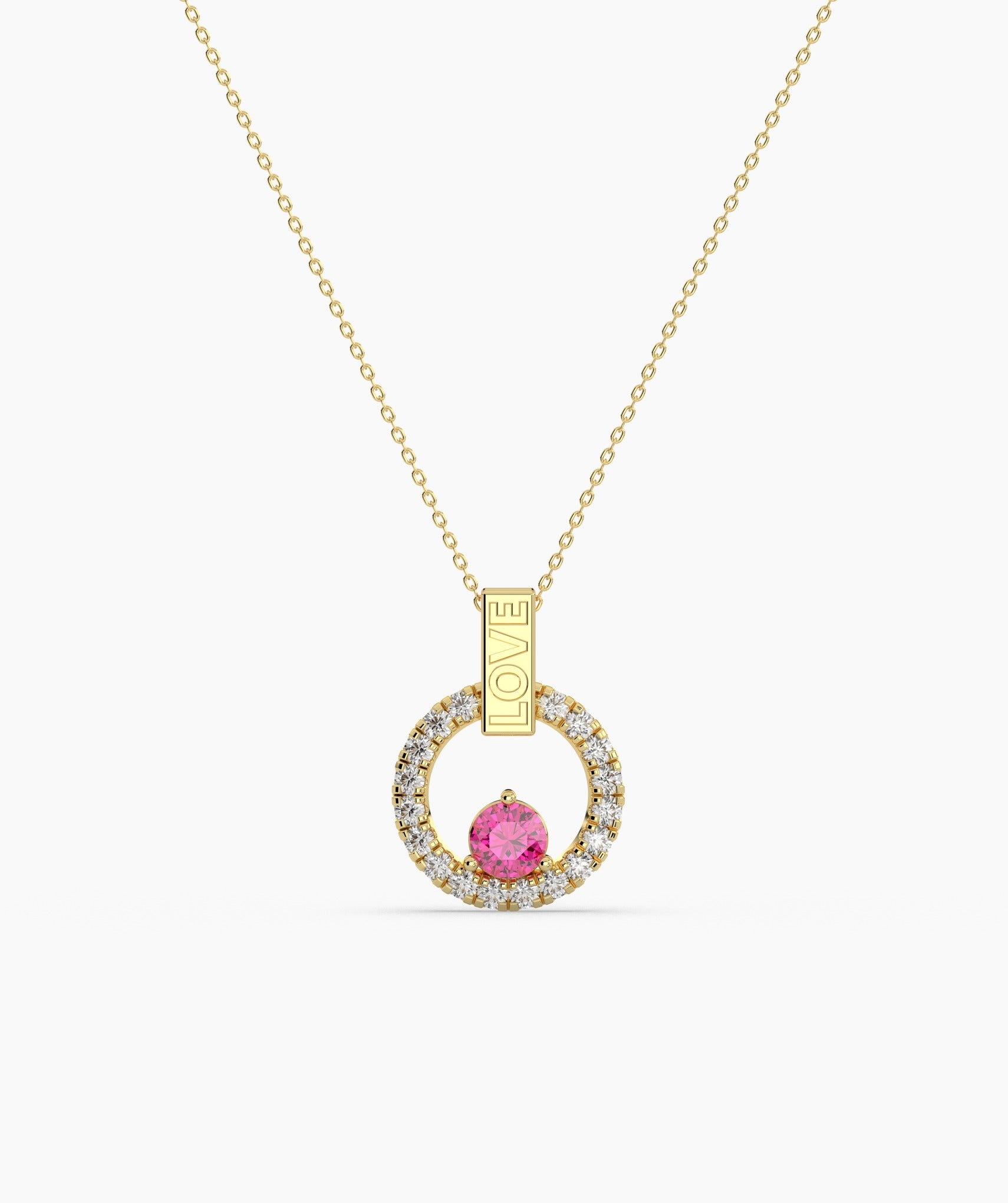 This elegant necklace showcases a brilliant pink sapphire at its center, surrounded by dazzling diamonds and a heartfelt "LOVE" charm.
