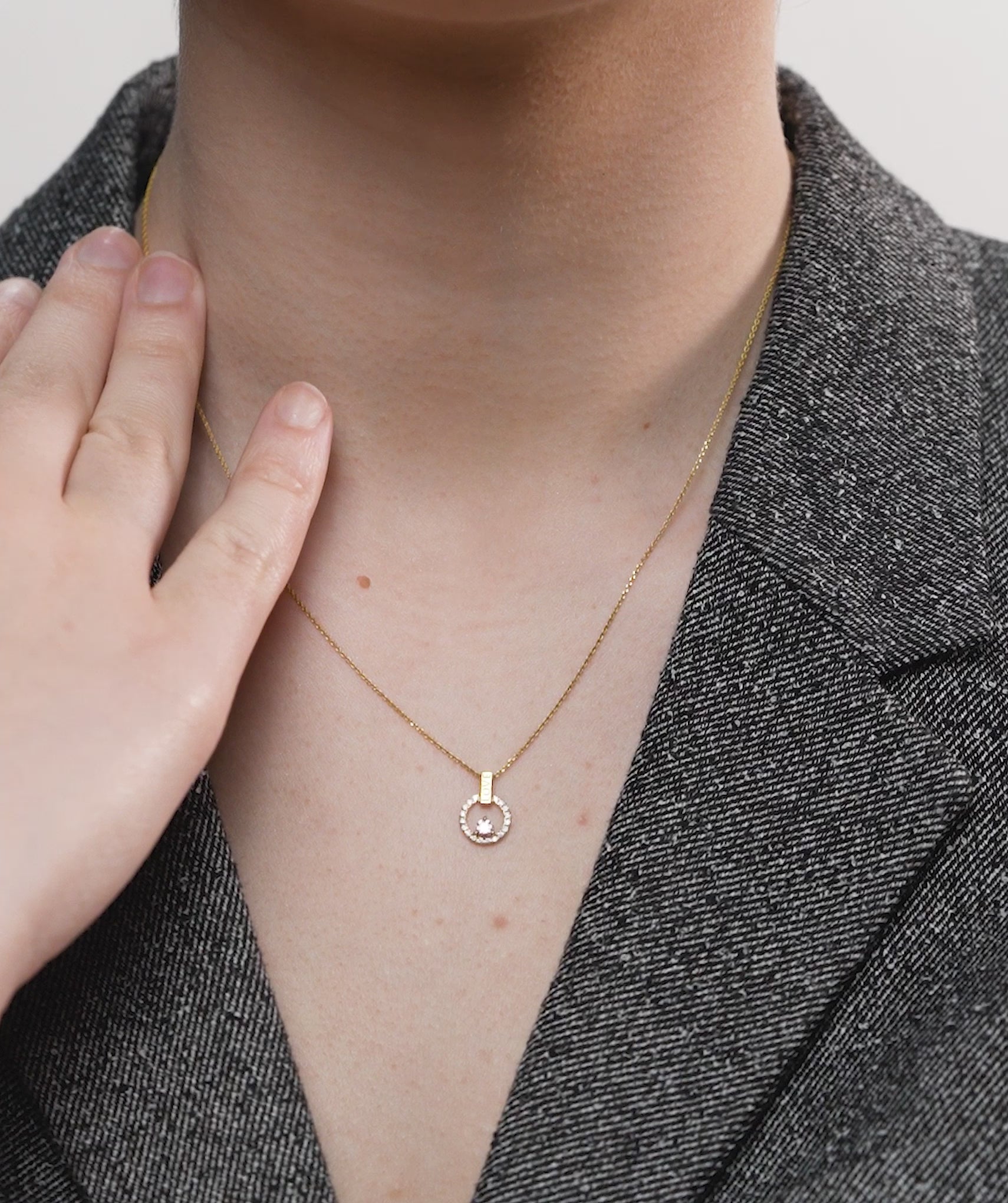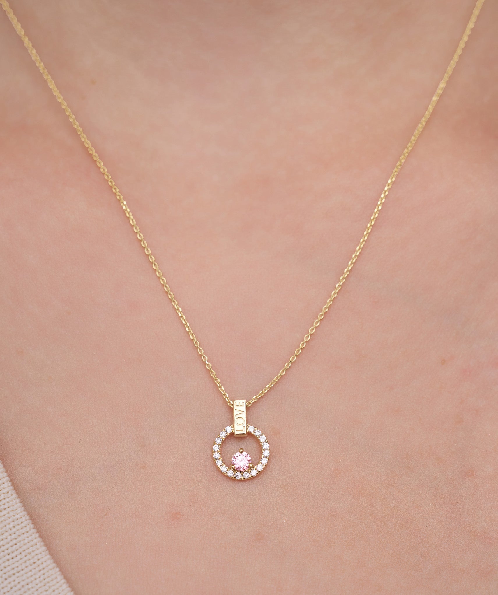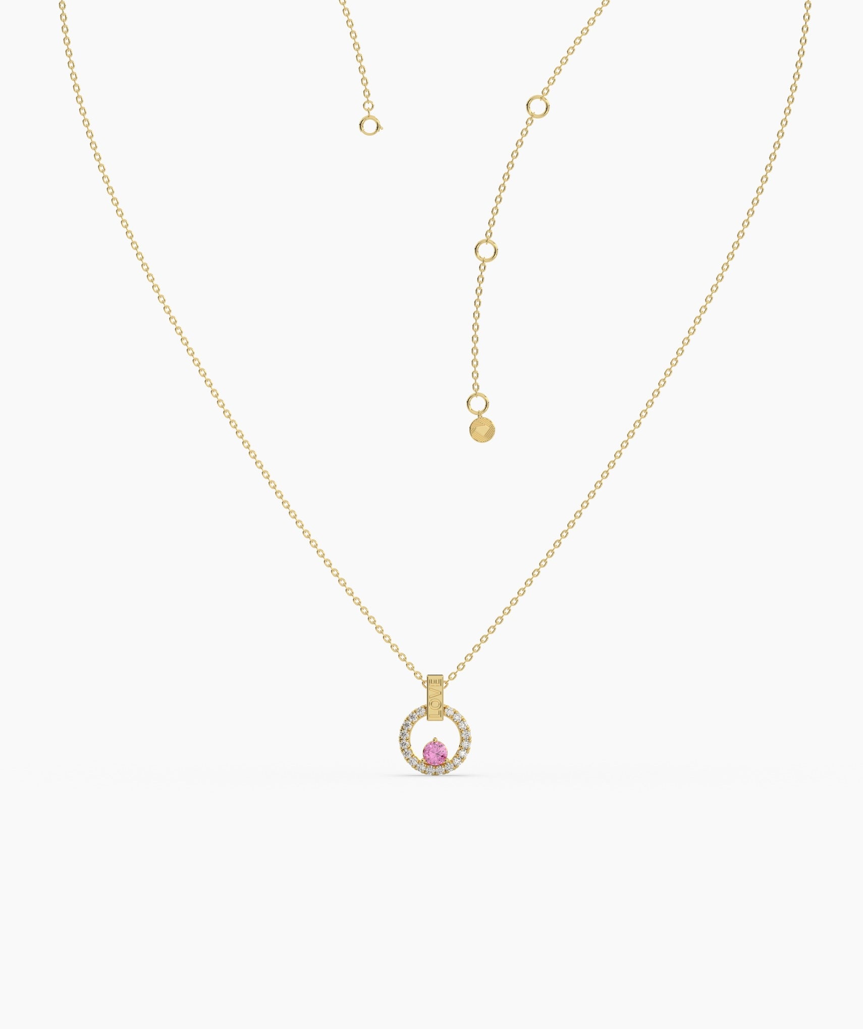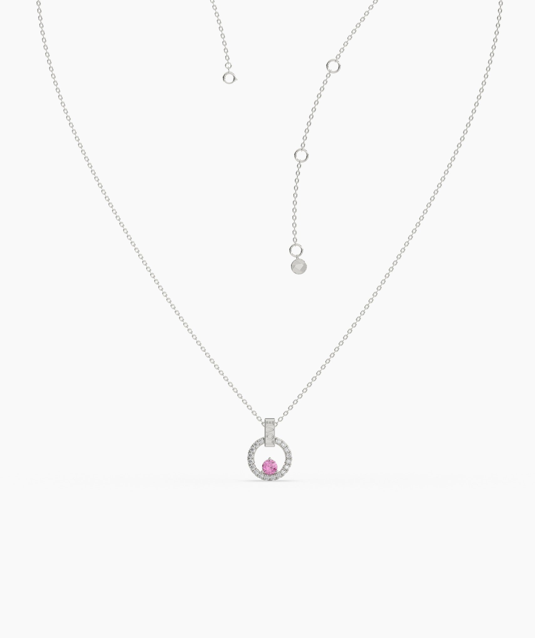 This elegant necklace showcases a brilliant pink sapphire at its center, surrounded by dazzling diamonds and a heartfelt "LOVE" charm.