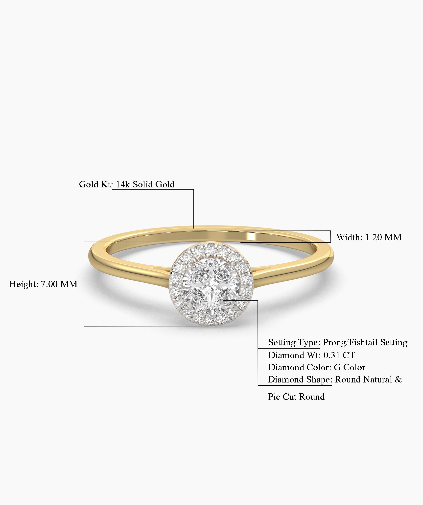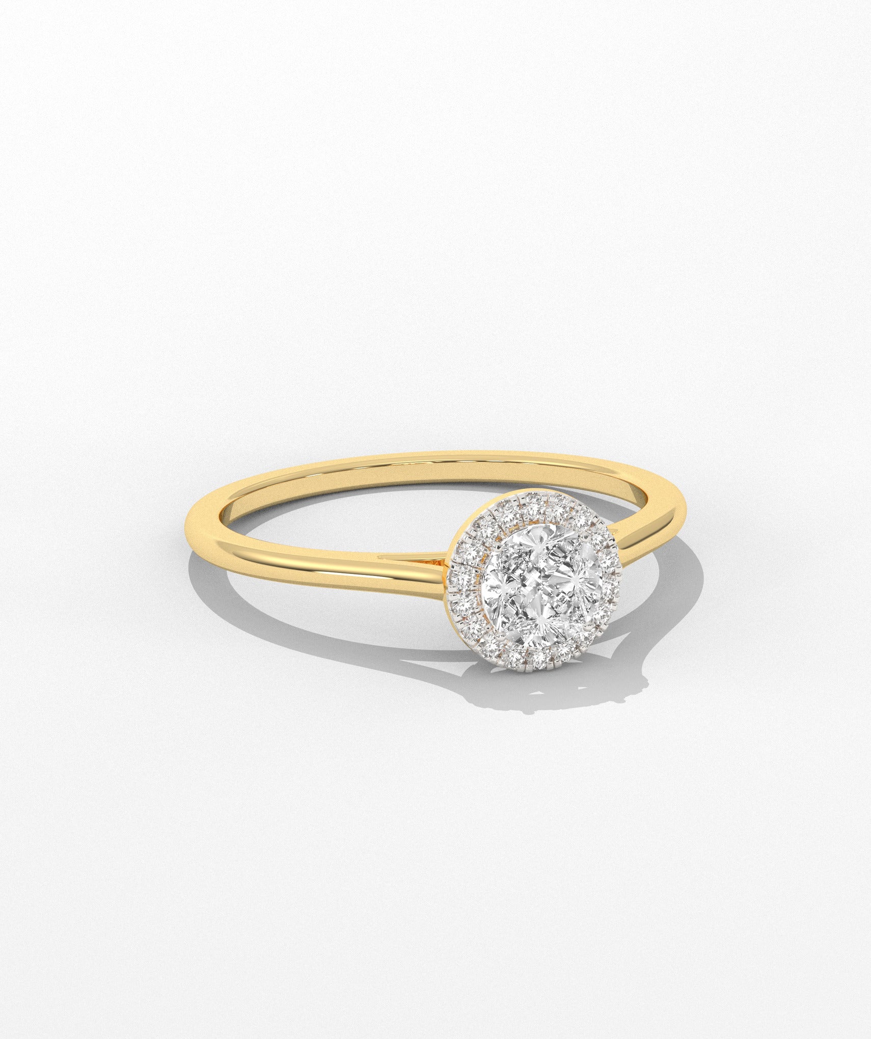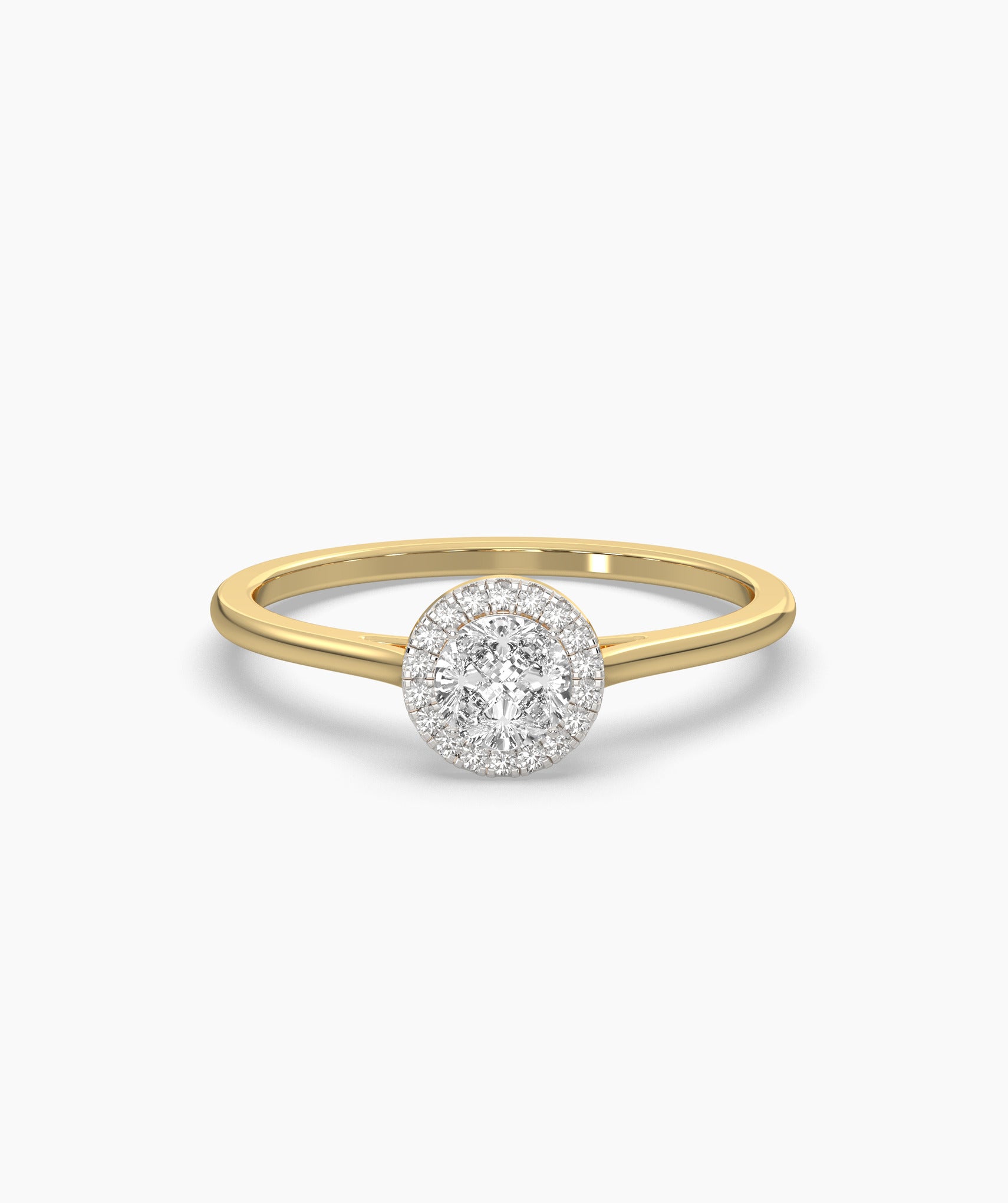 A timeless beauty, this 14K yellow gold ring features a brilliant round diamond cluster framed by a shimmering pavé halo. Its classic design and elegant sparkle make it perfect for engagements or daily elegance.