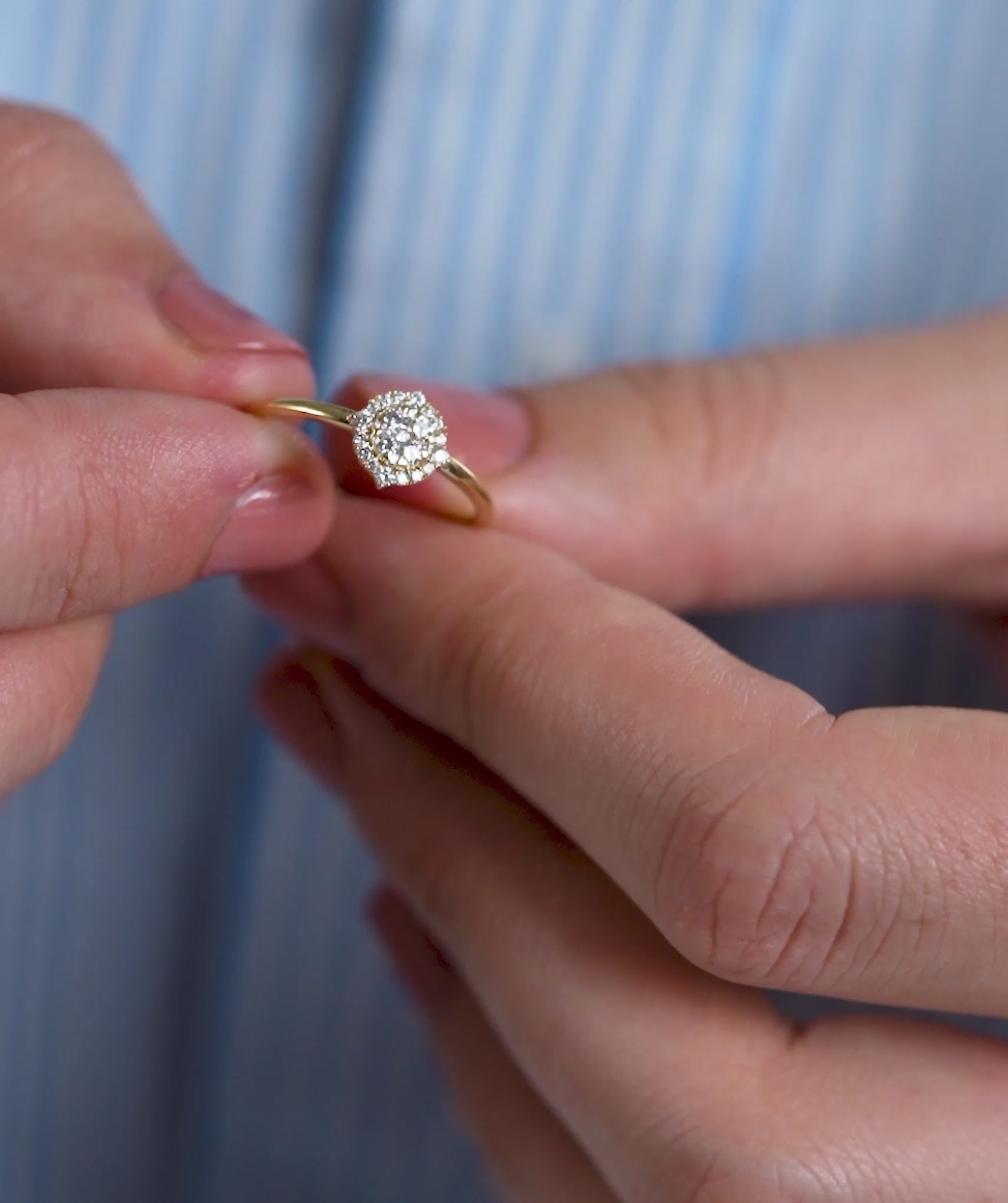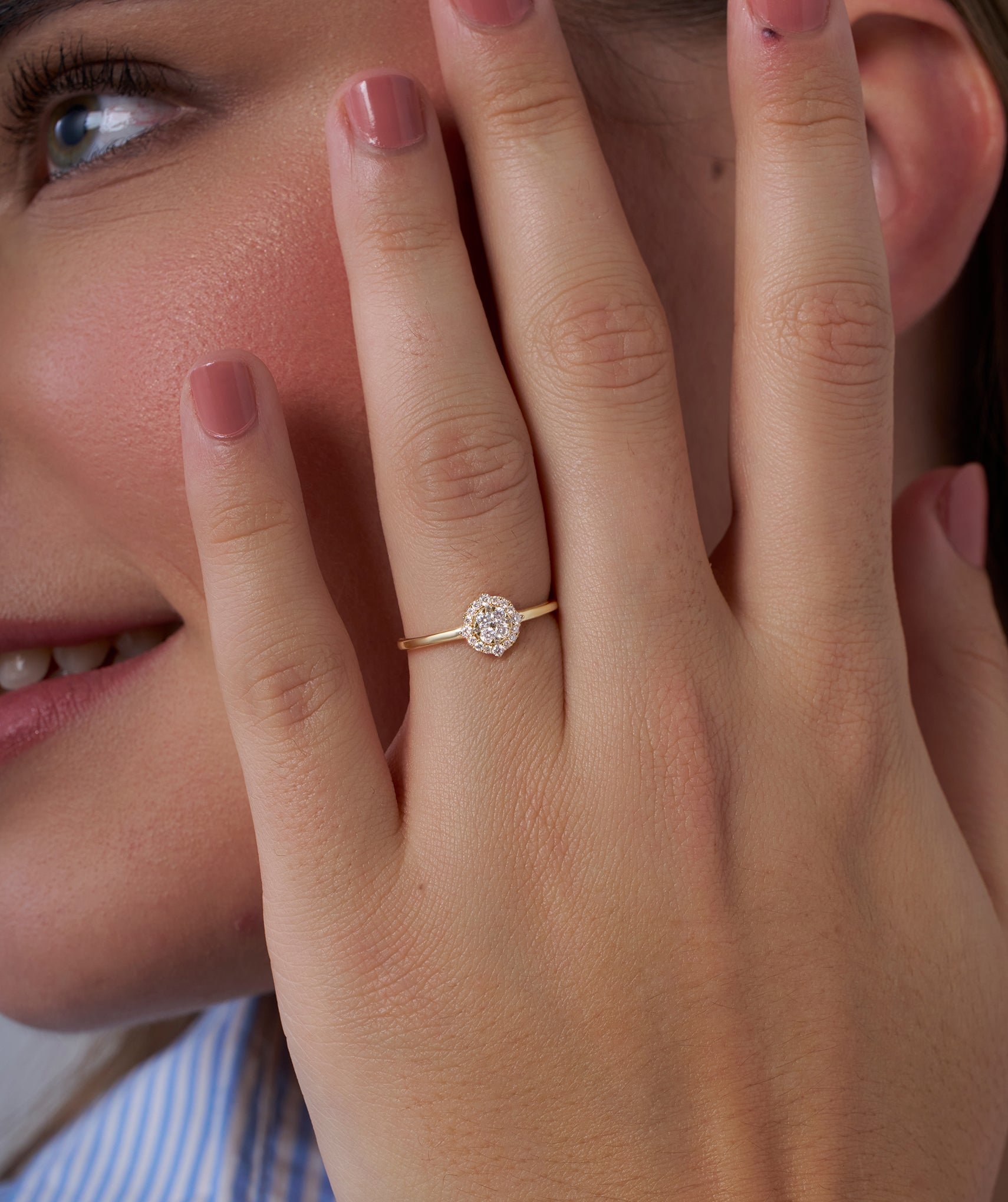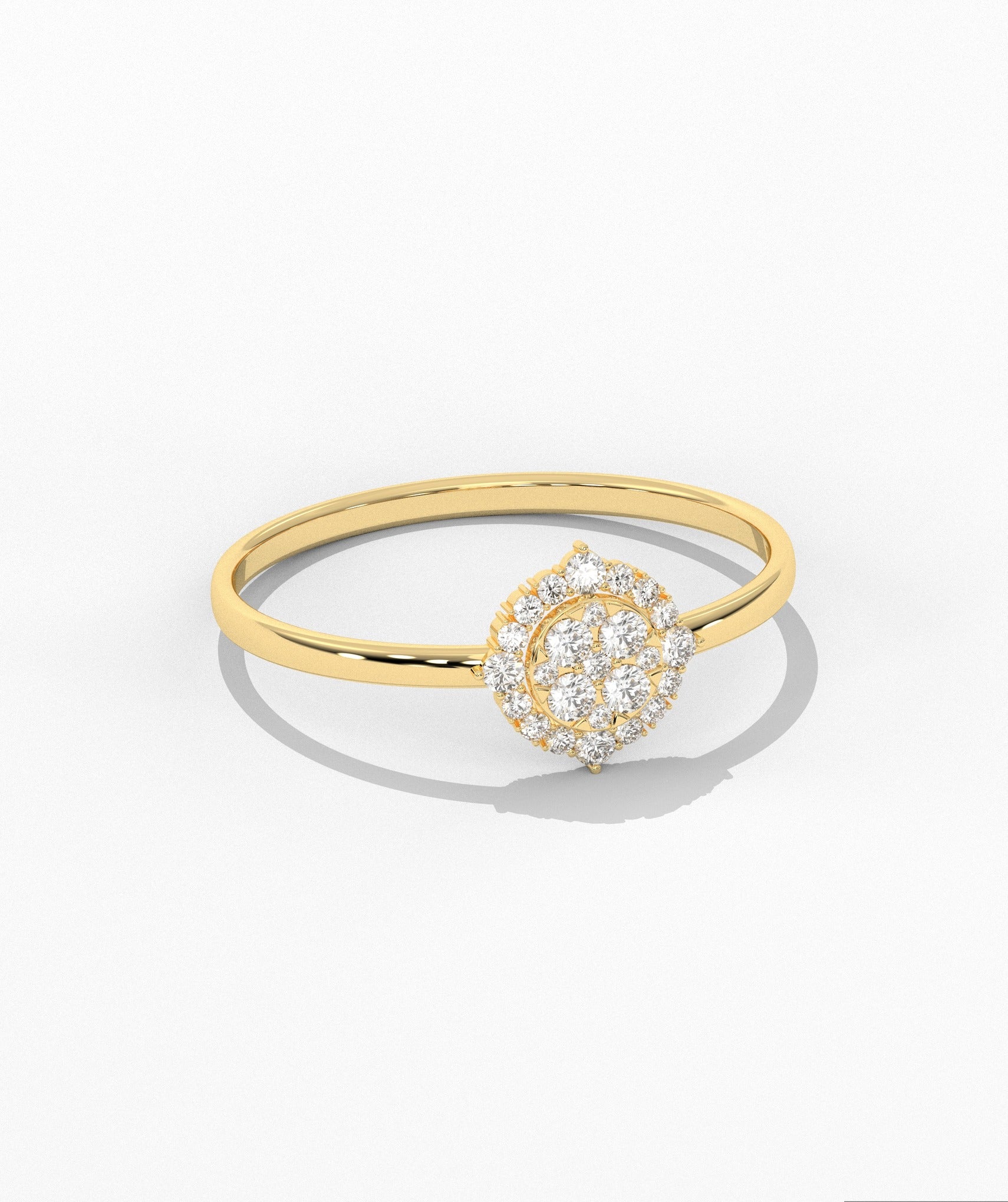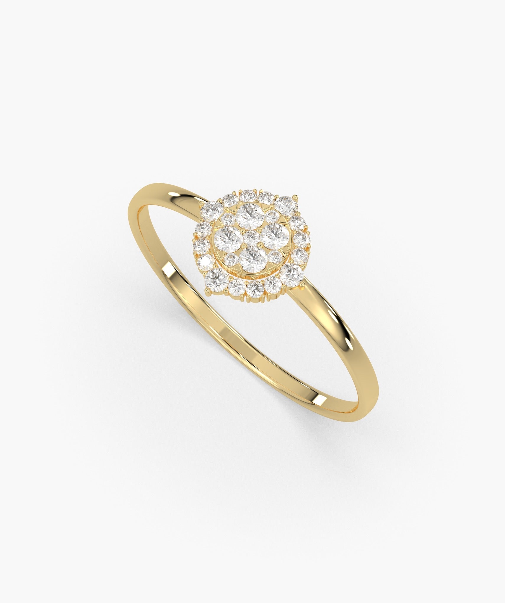 Elegant 14K gold ring featuring a dazzling round diamond cluster encircled by a shimmering halo, offering timeless charm and brilliance.