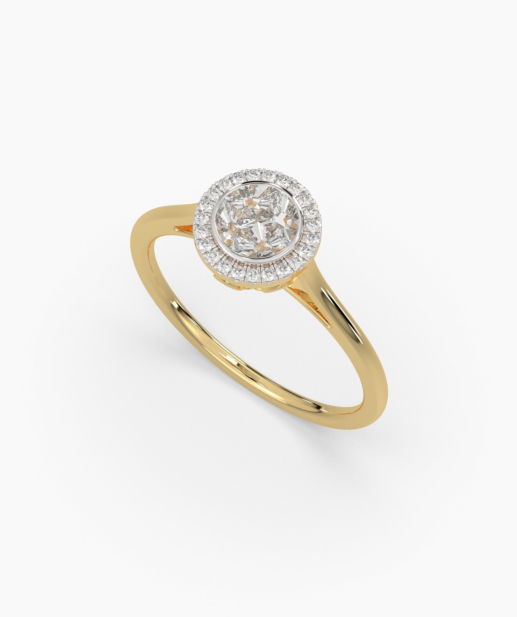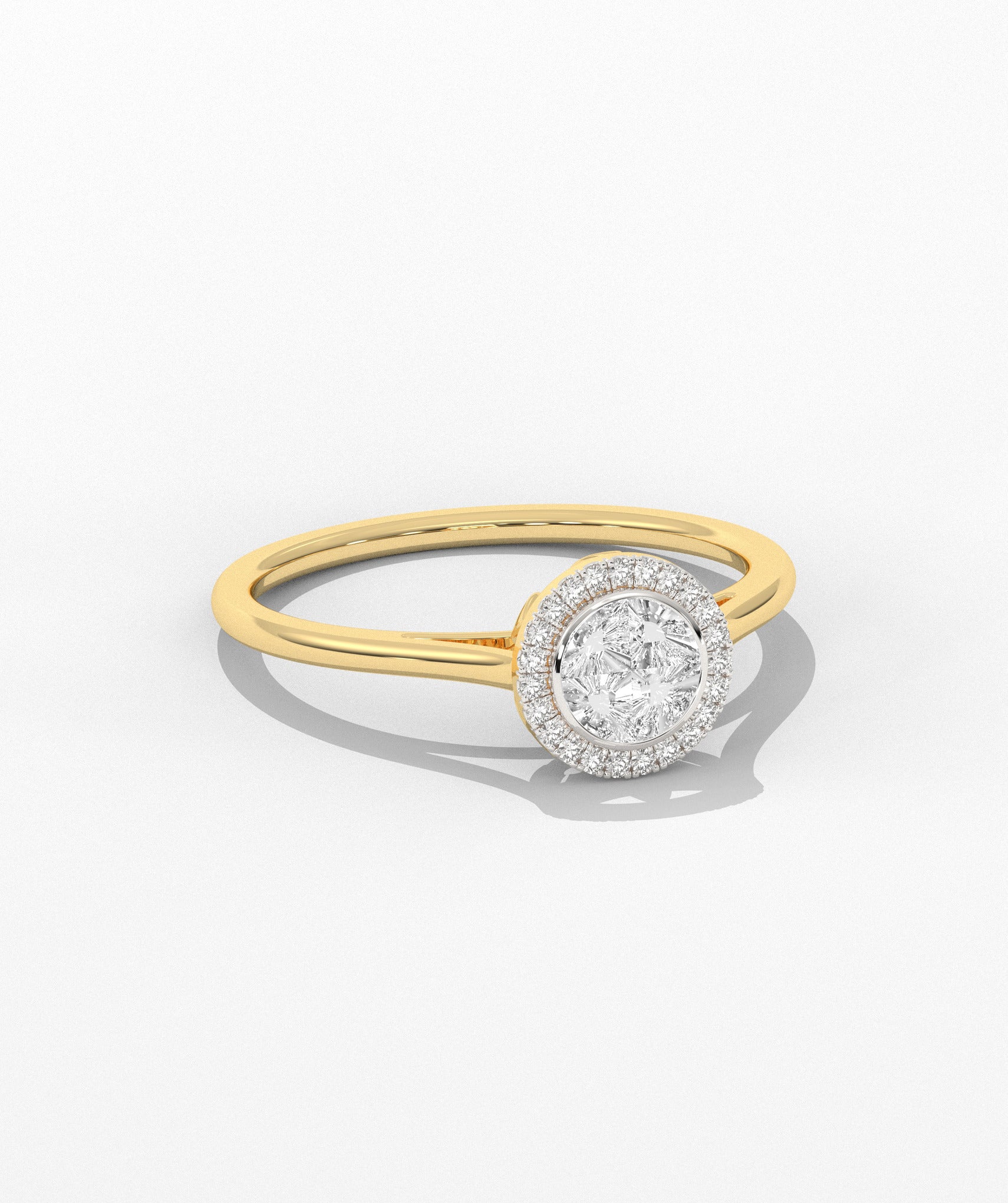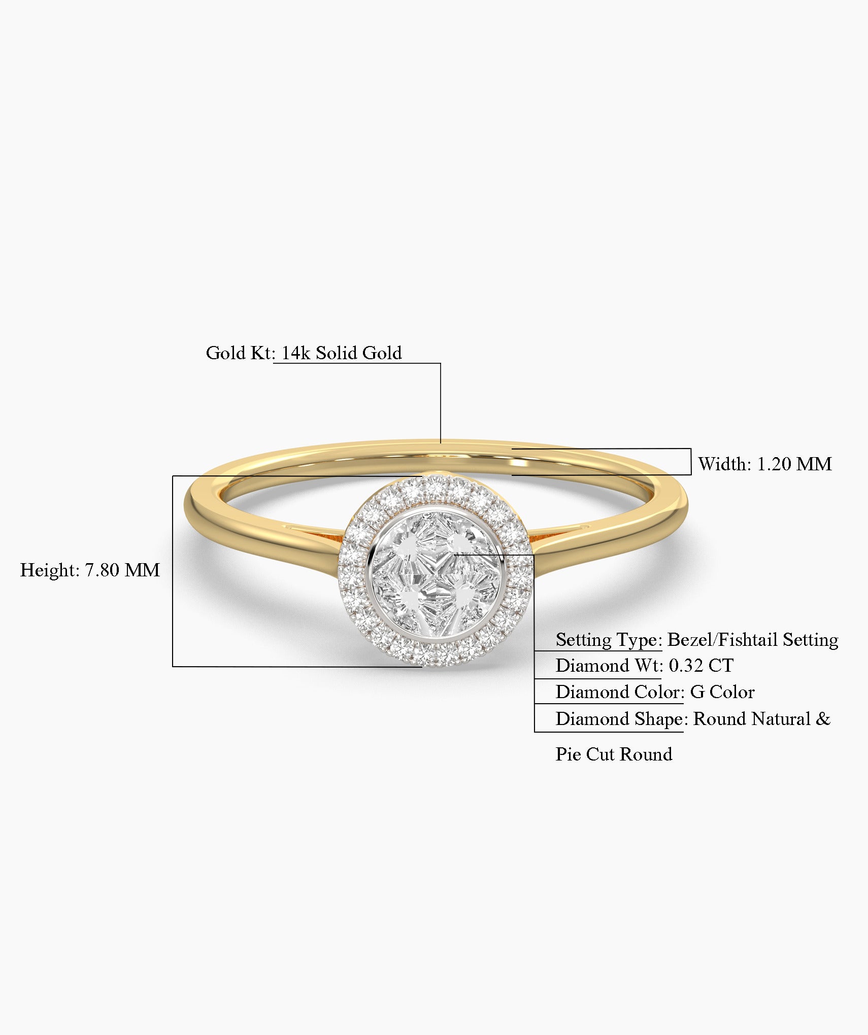 Classic brilliance meets modern ingenuity in this seamless composite design. The centerpiece features a "Pie Cut" round diamond arrangement multiple fancy-cut stones set together to mimic the fractured light and scale of a much larger solitaire. Wrapped in a sparkling diamond halo and set in 14K solid gold with natural diamonds (0.32 CT total weight), this piece offers maximum shine with a minimalist footprint. The ultra-fine 1.20mm band creates a floating effect on the finger, perfect for women who love the look of a substantial diamond but need a low-profile ring that won't catch on clothes during a busy day. Available in yellow, white, and rose gold to suit your personal style.