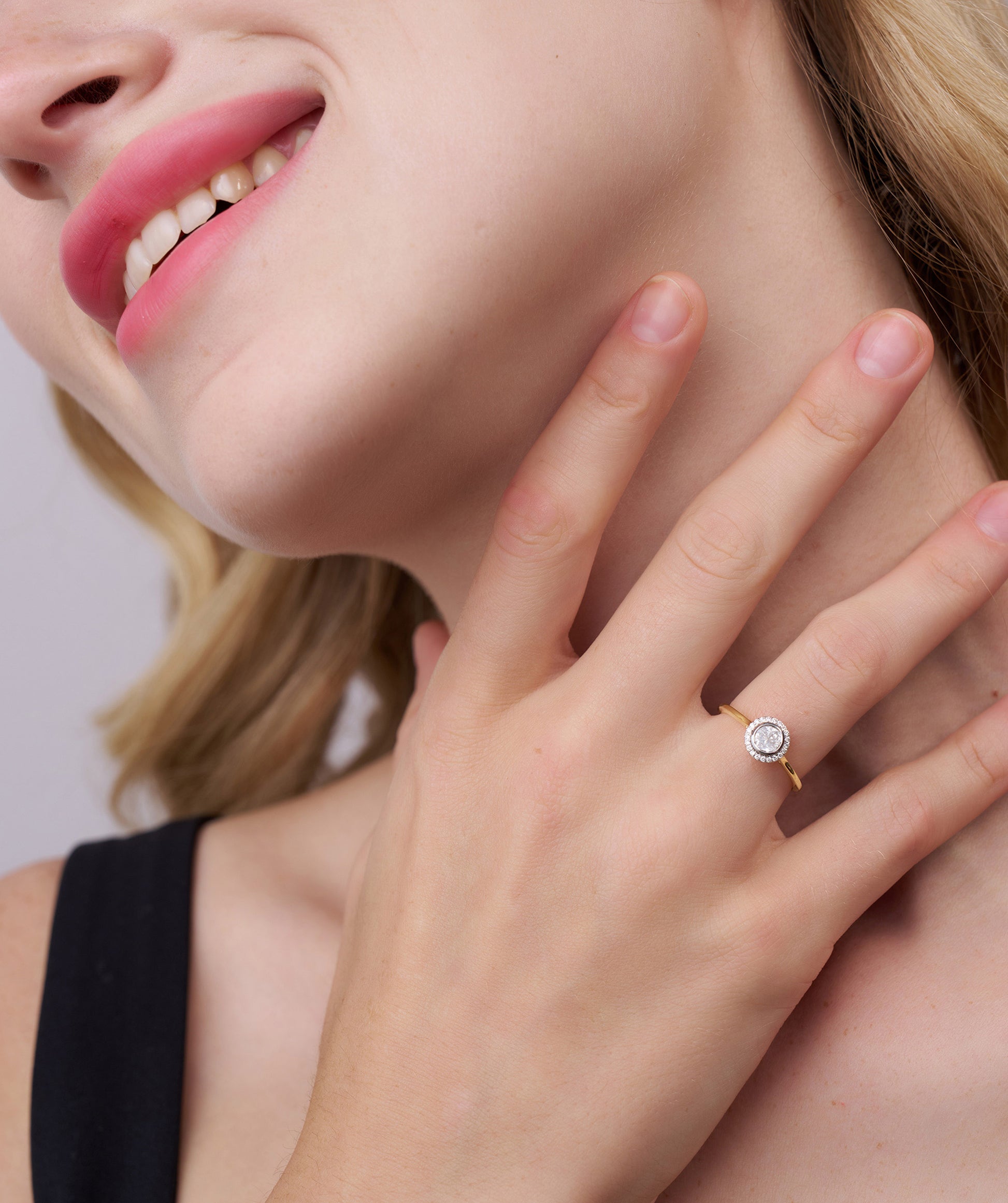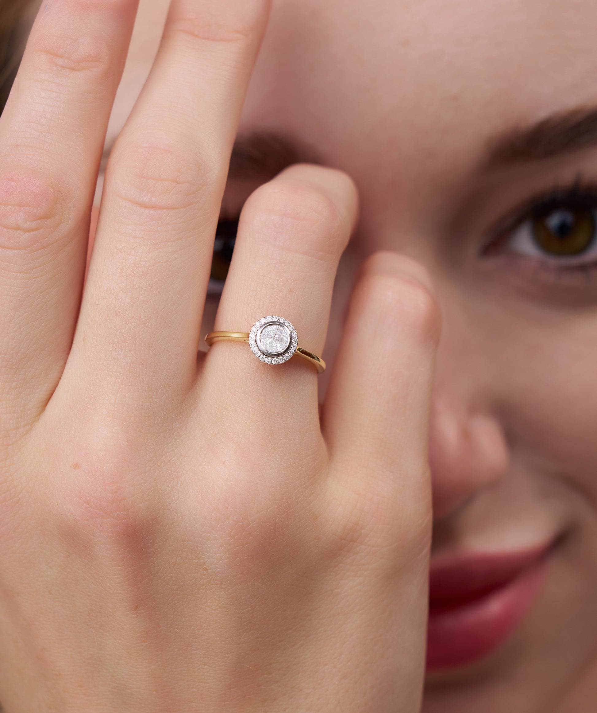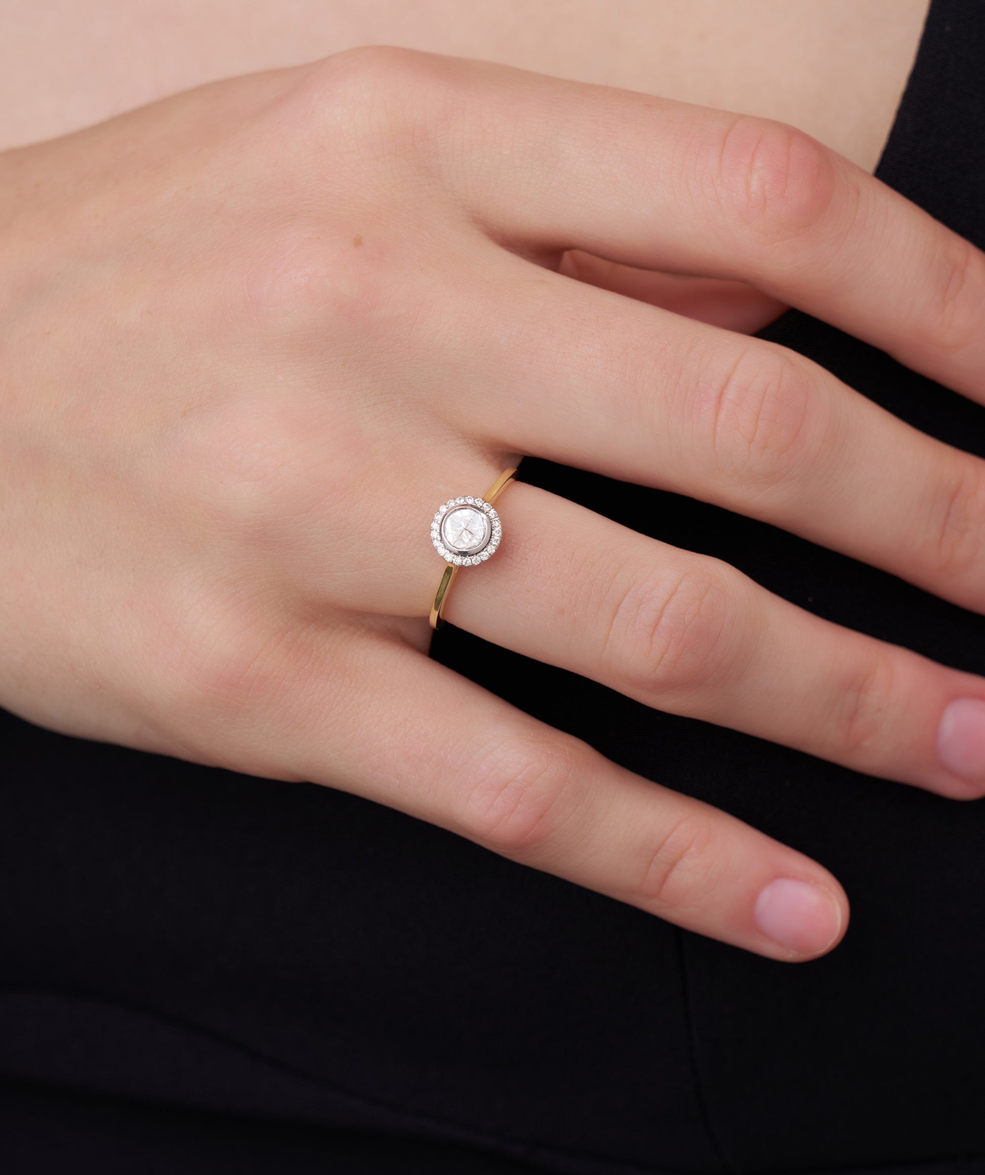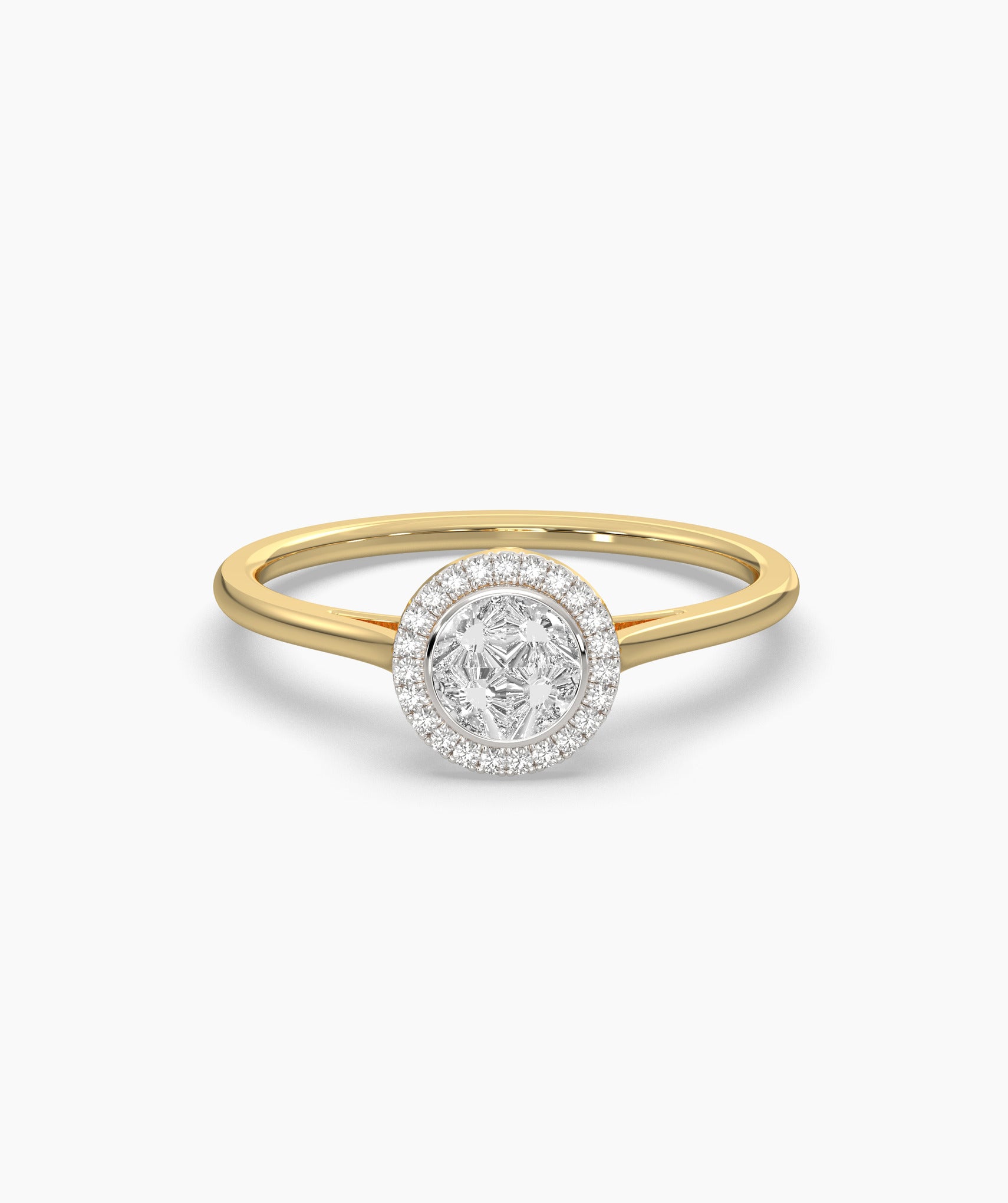 Classic brilliance meets modern ingenuity in this seamless composite design. The centerpiece features a "Pie Cut" round diamond arrangement multiple fancy-cut stones set together to mimic the fractured light and scale of a much larger solitaire. Wrapped in a sparkling diamond halo and set in 14K solid gold with natural diamonds (0.32 CT total weight), this piece offers maximum shine with a minimalist footprint. The ultra-fine 1.20mm band creates a floating effect on the finger, perfect for women who love the look of a substantial diamond but need a low-profile ring that won't catch on clothes during a busy day. Available in yellow, white, and rose gold to suit your personal style.