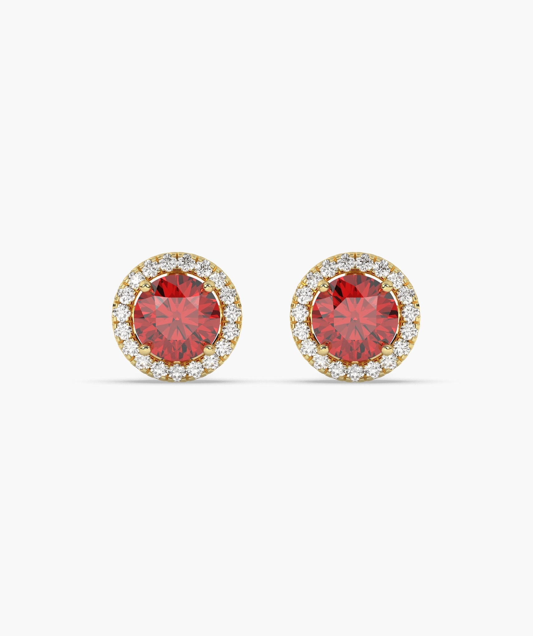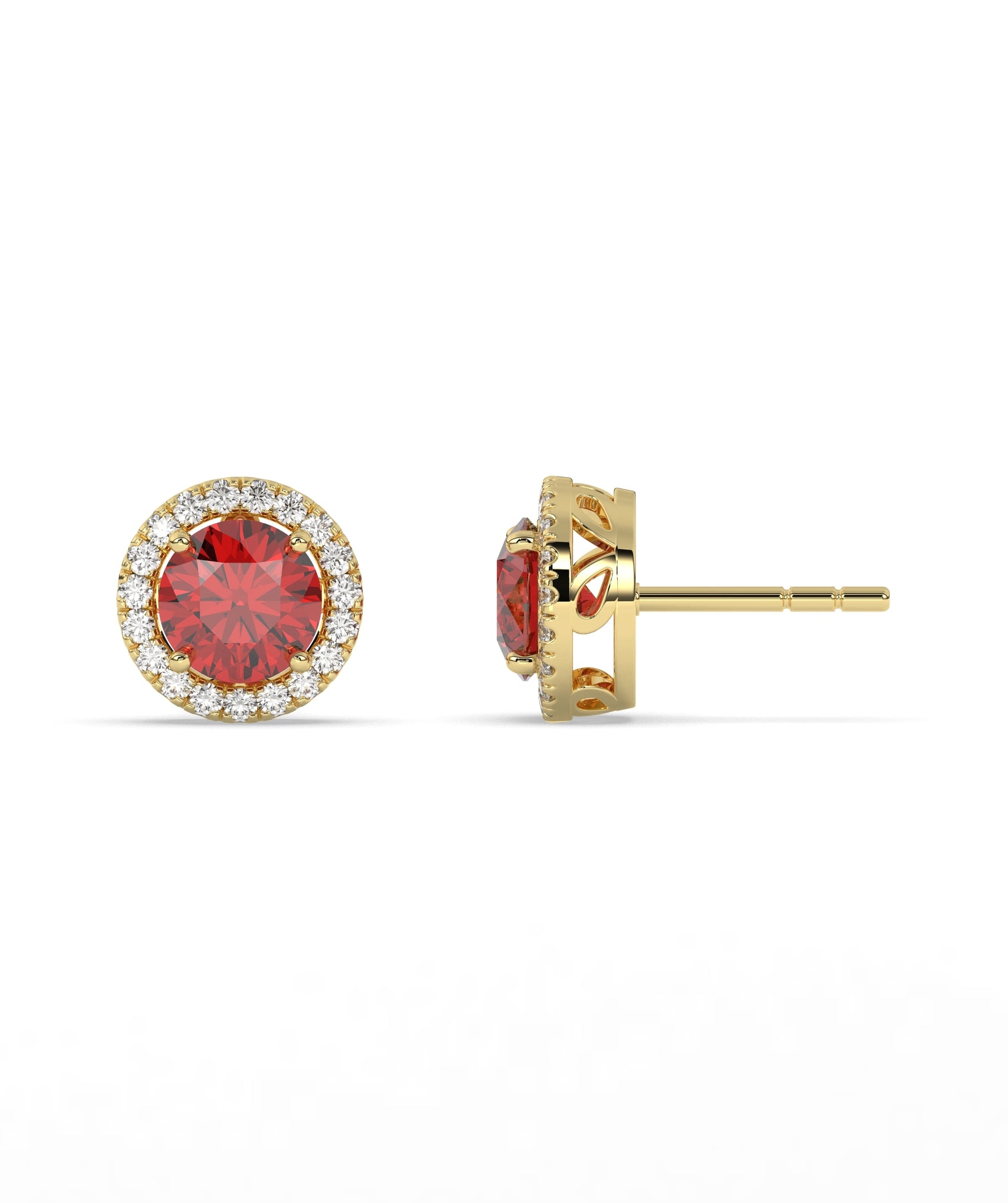 Inject a vibrant sense of passion into your everyday stack. These captivating studs are crafted in 14K solid gold and center on two natural round cut rubies, boasting a substantial 1.75 carats of rich, red color. Encircling each gemstone is a brilliant halo of round diamonds (0.21 ct), held in a detailed fishtail and prong setting that adds texture and maximizes light return. Measuring 8.3mm in diameter, they offer a bold, colorful presence that commands attention without weighing you down. Whether worn as a birthstone tribute or simply because you love the drama of red, these earrings transition effortlessly from a power suit to a little black dress. Available in yellow, white, and rose gold to suit your style.