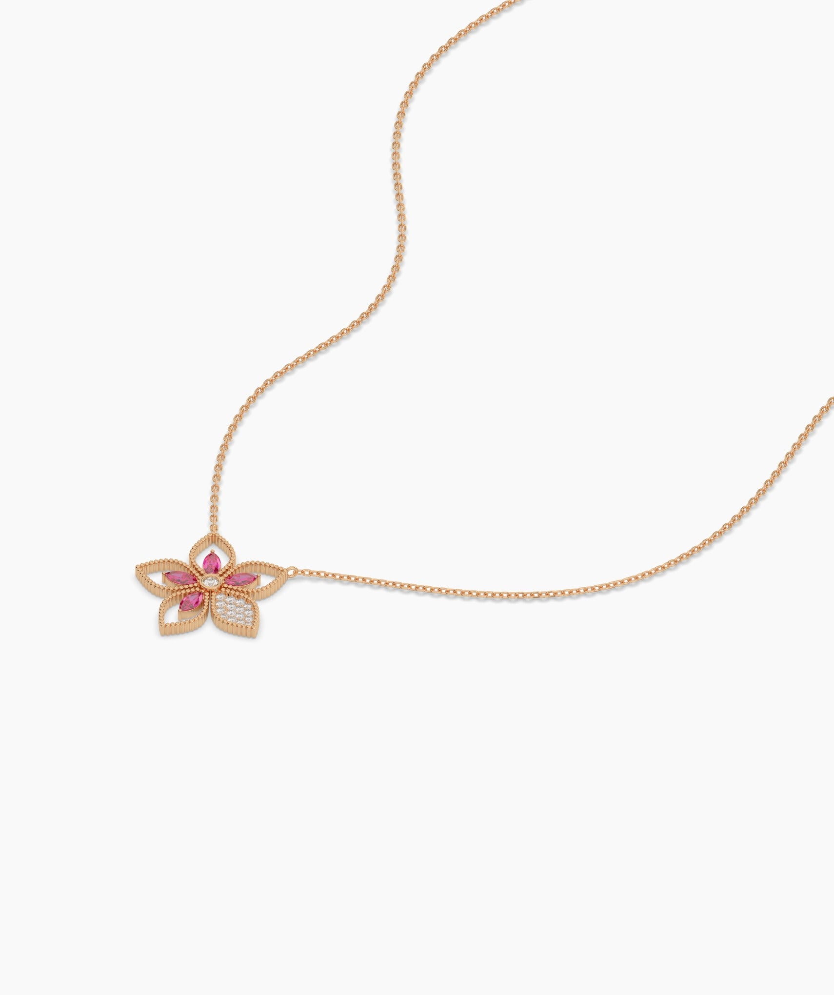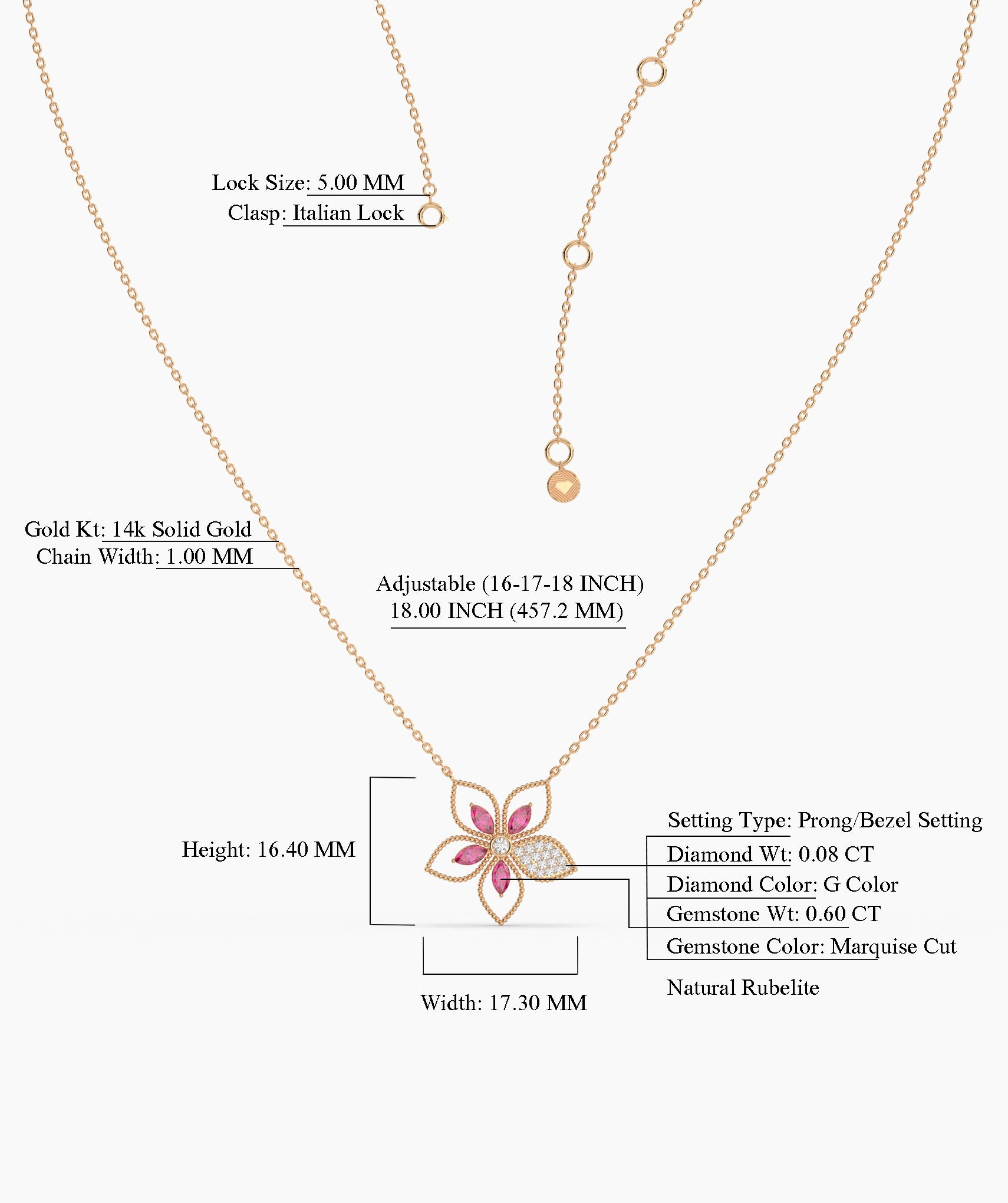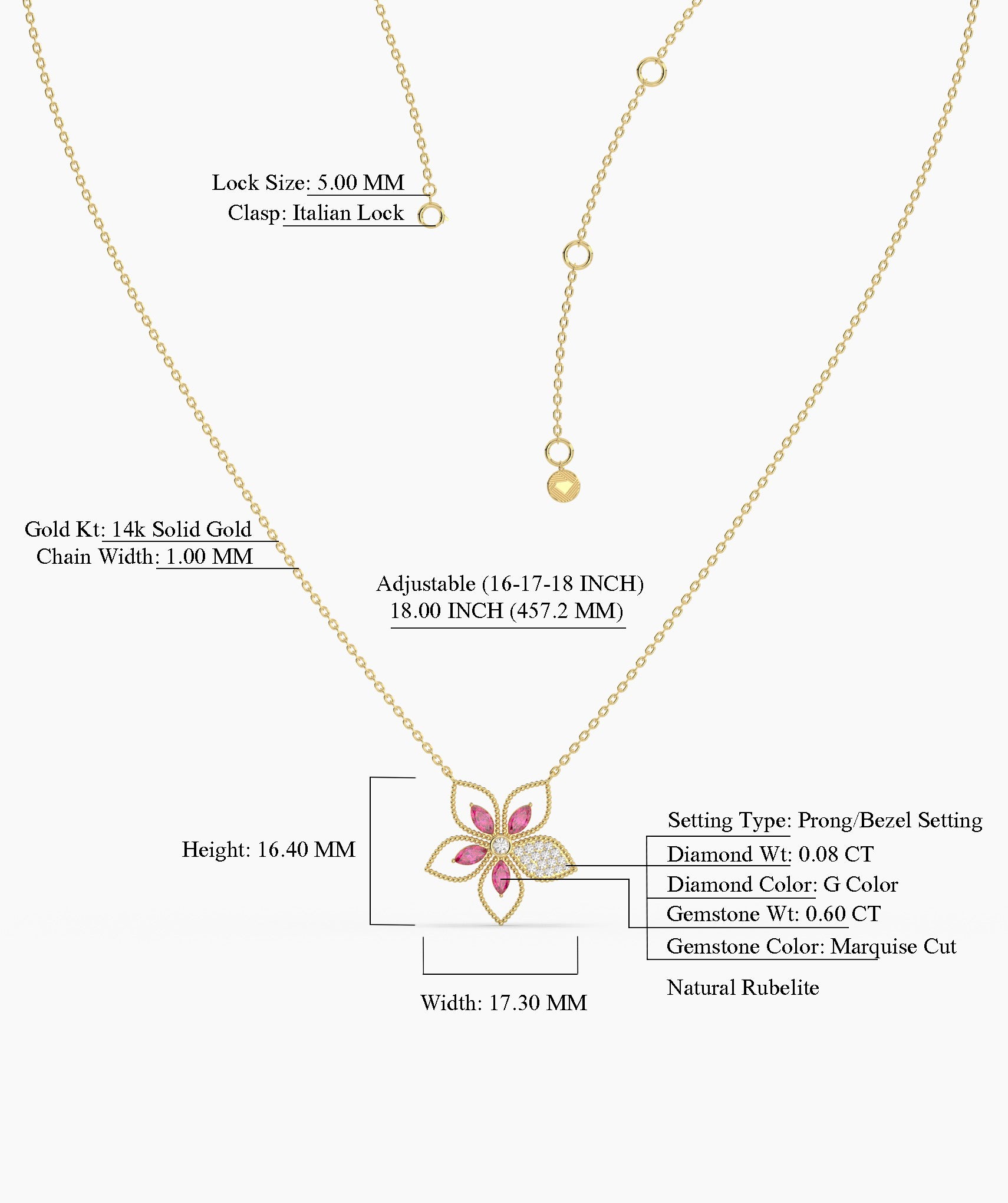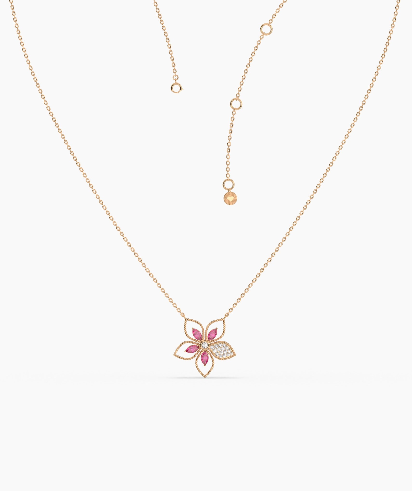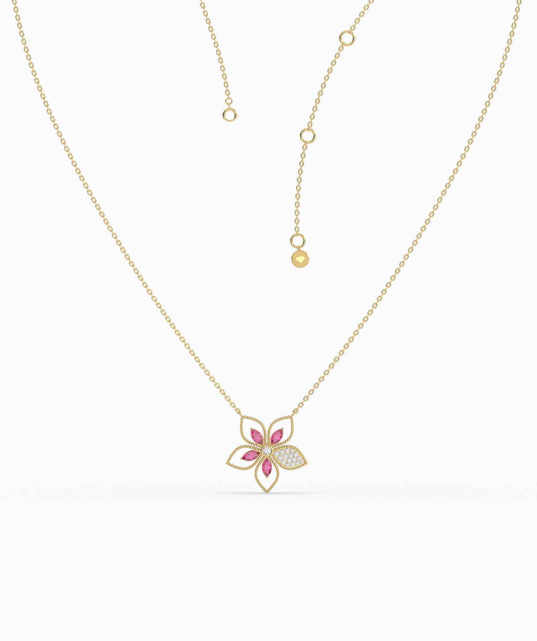 A stunning 14K solid gold necklace featuring a flower-inspired pendant adorned with marquise-cut rubies, sparkling diamonds, and intricate gold bead detailing.