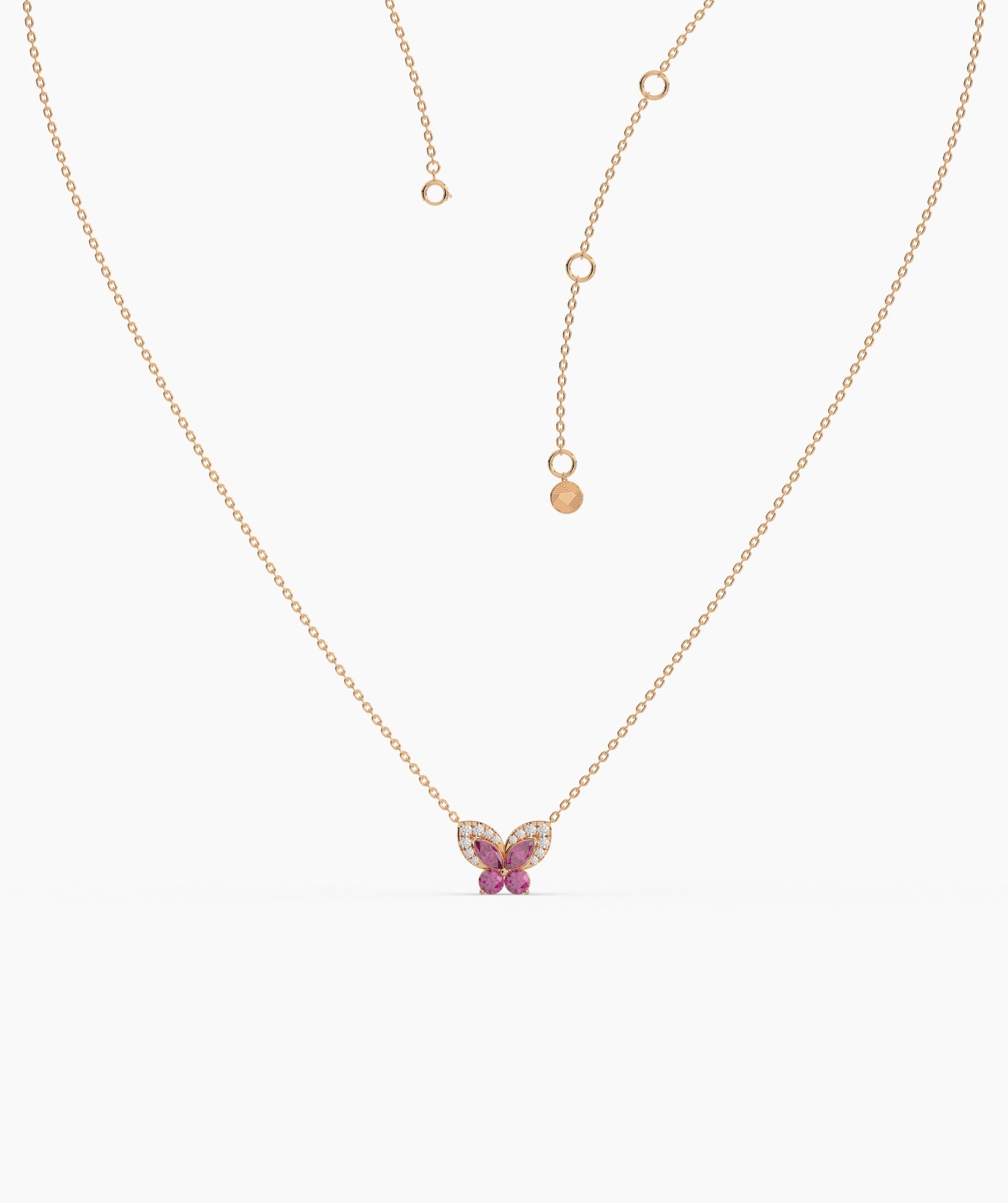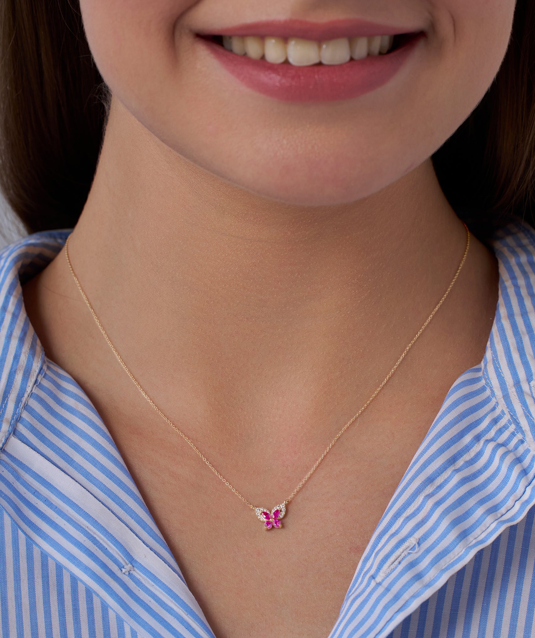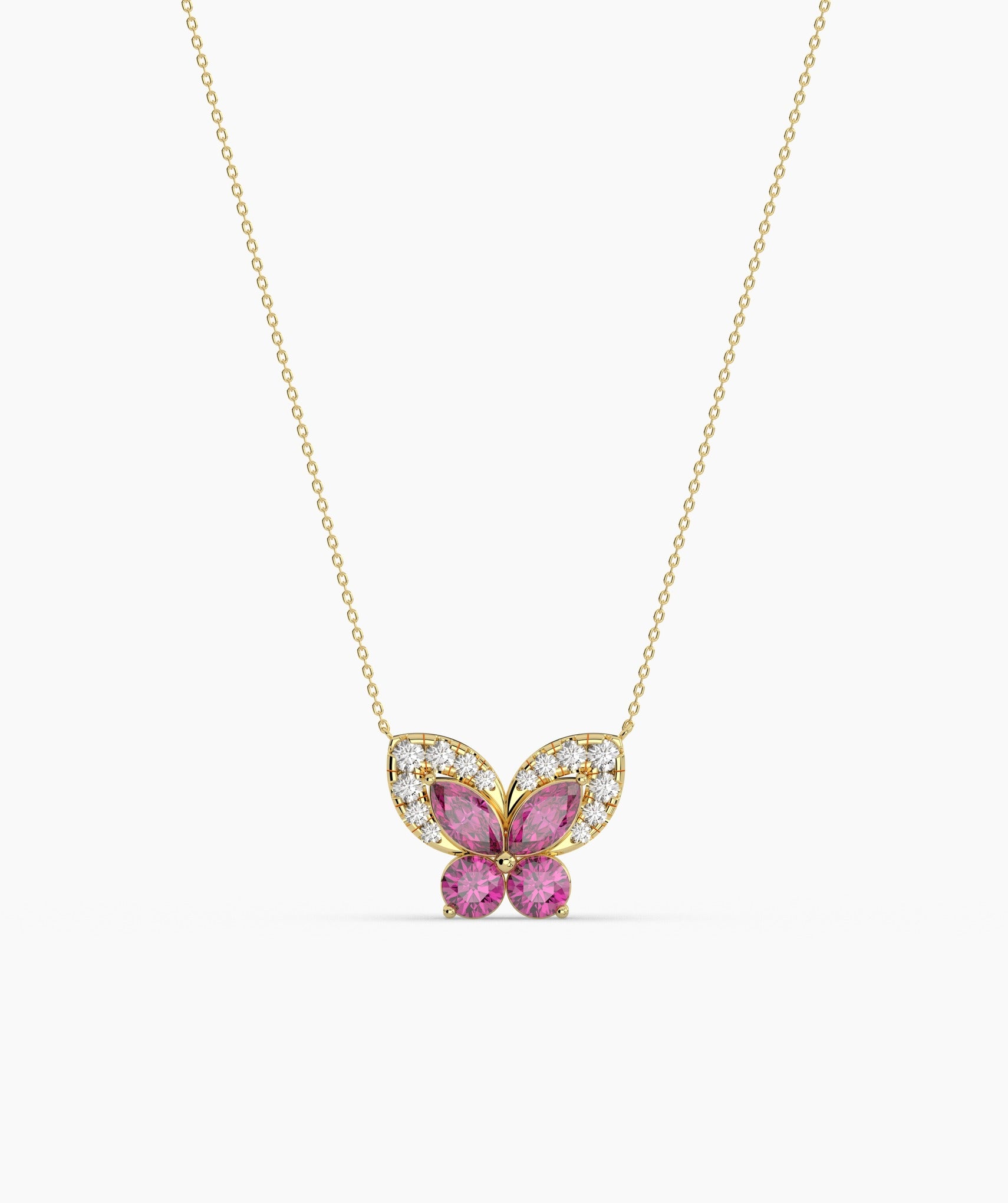 A captivating 14K solid gold necklace featuring a butterfly-shaped pendant with marquise-cut rubies and dazzling diamonds.