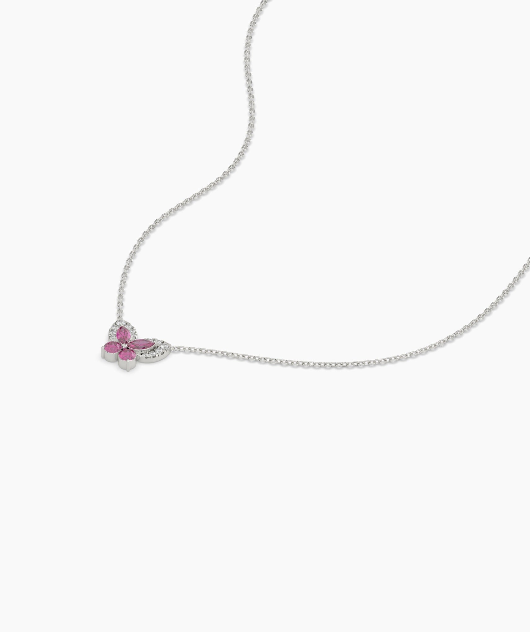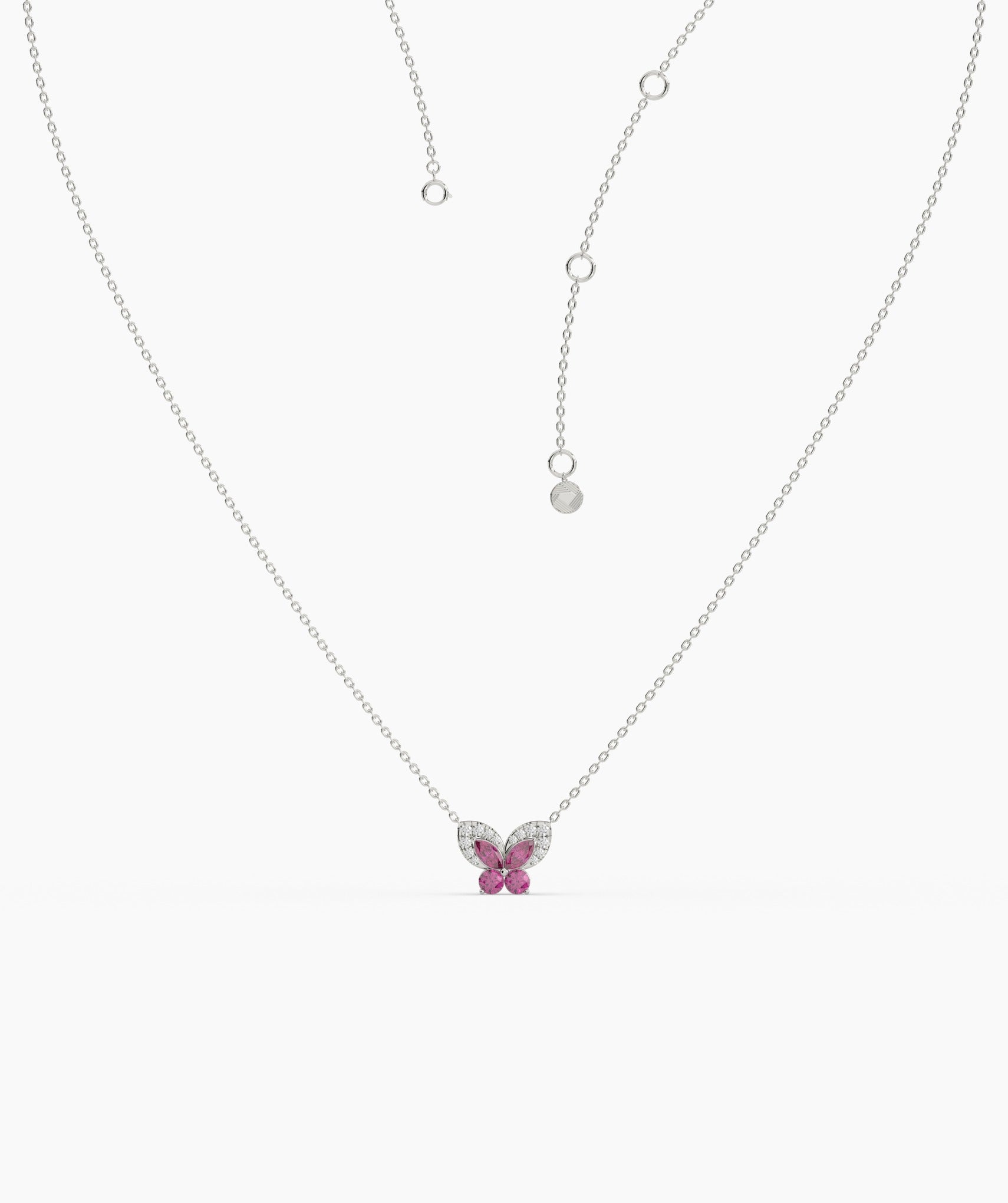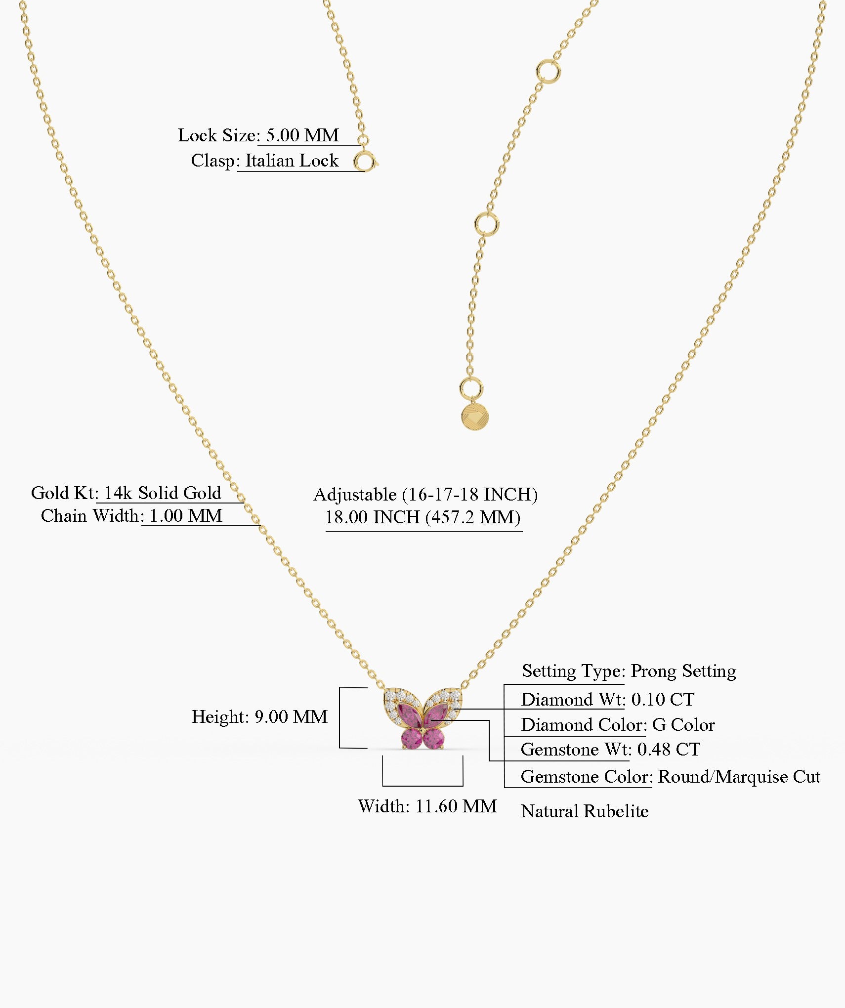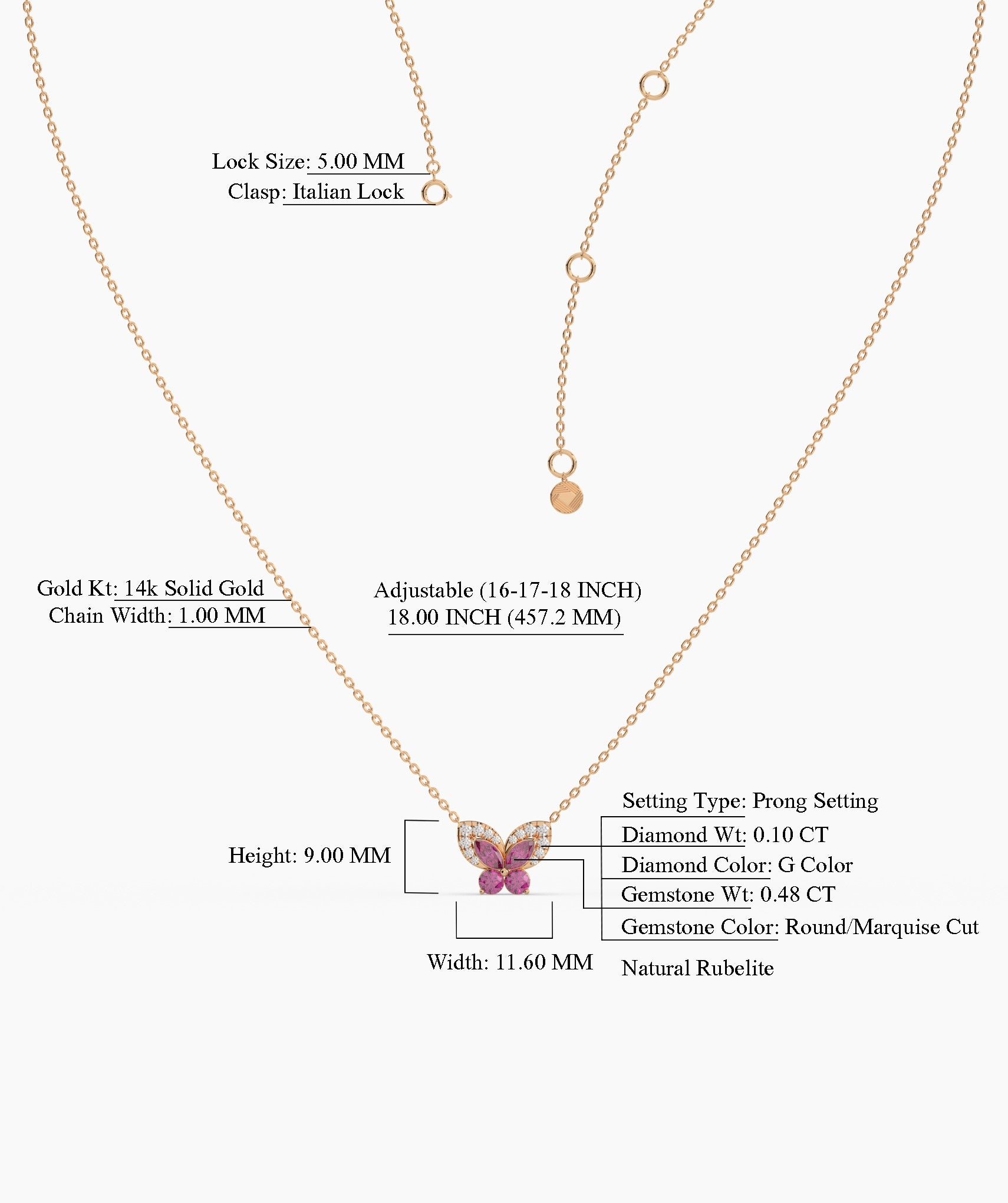 A captivating 14K solid gold necklace featuring a butterfly-shaped pendant with marquise-cut rubies and dazzling diamonds.