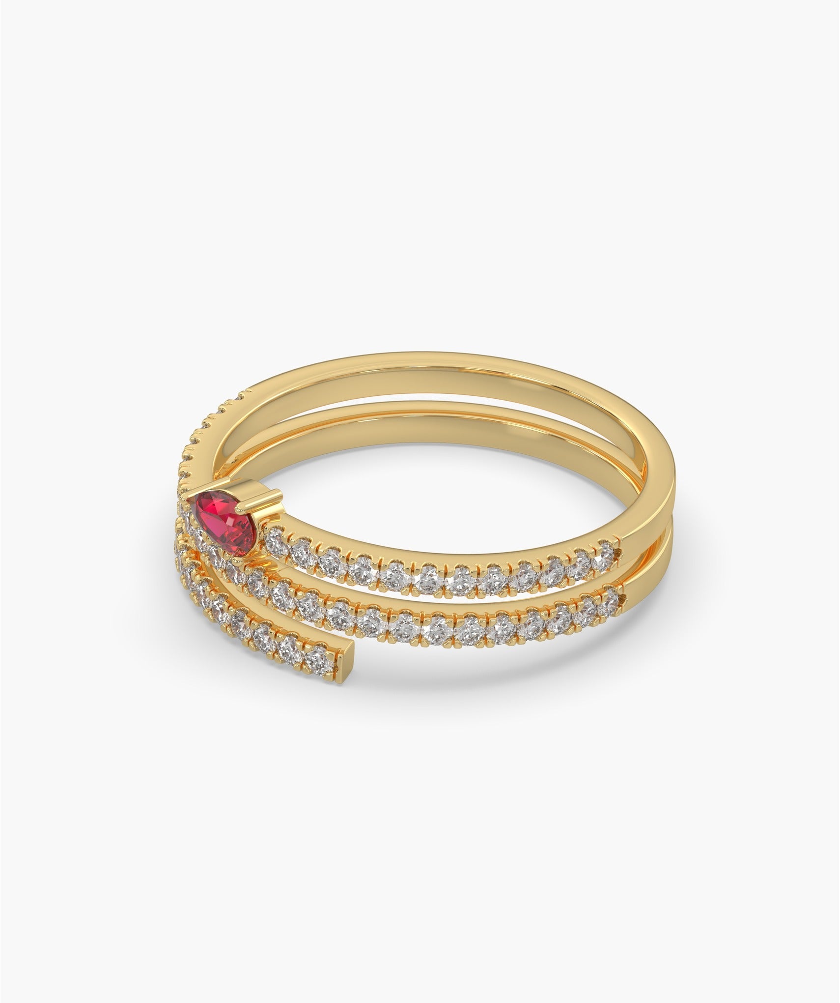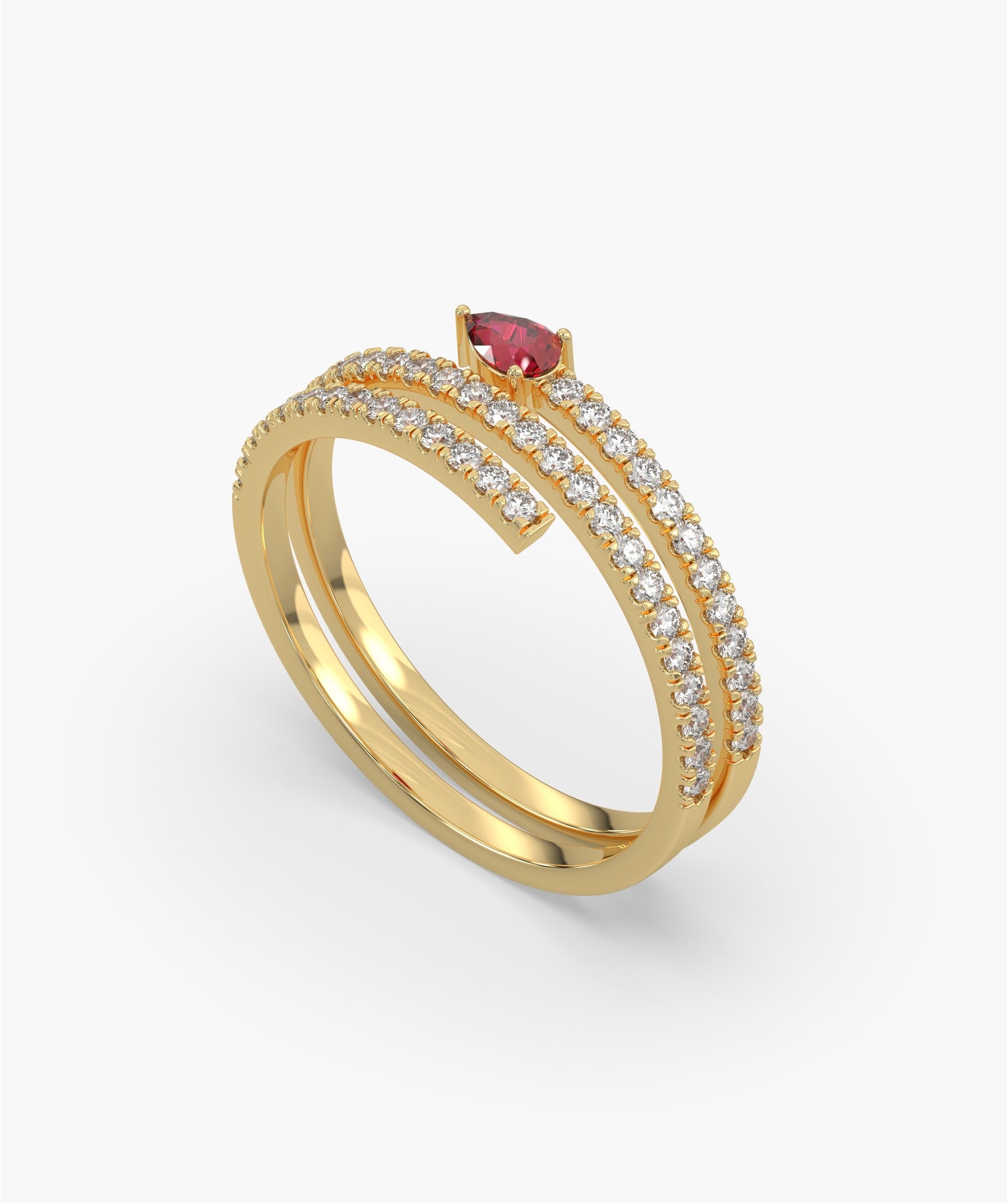 A sensual design that wraps around your style, this bold ring is an intimate expression of confident duality. The unique coil structure, crafted in luminous 14K solid gold, features a vibrant, bezel set Natural Ruby (Pear Cut) (0.17 CT) at its center. The twin bands are lined with sparkling Natural Diamonds (0.43 CT), meticulously set in a Fishtail Setting that delivers continuous shimmer. This striking piece of fine jewelry is designed for women who embrace modern, rebellious elegance, providing a luxurious, high-impact statement perfect for date nights and special events. Available in yellow, white, and rose gold.