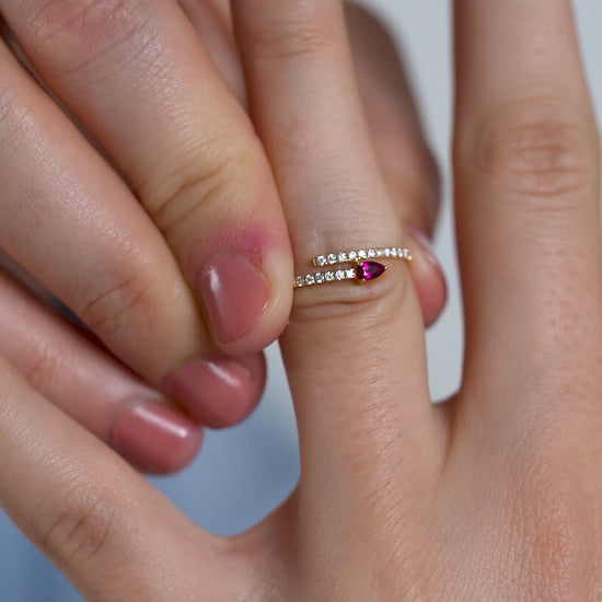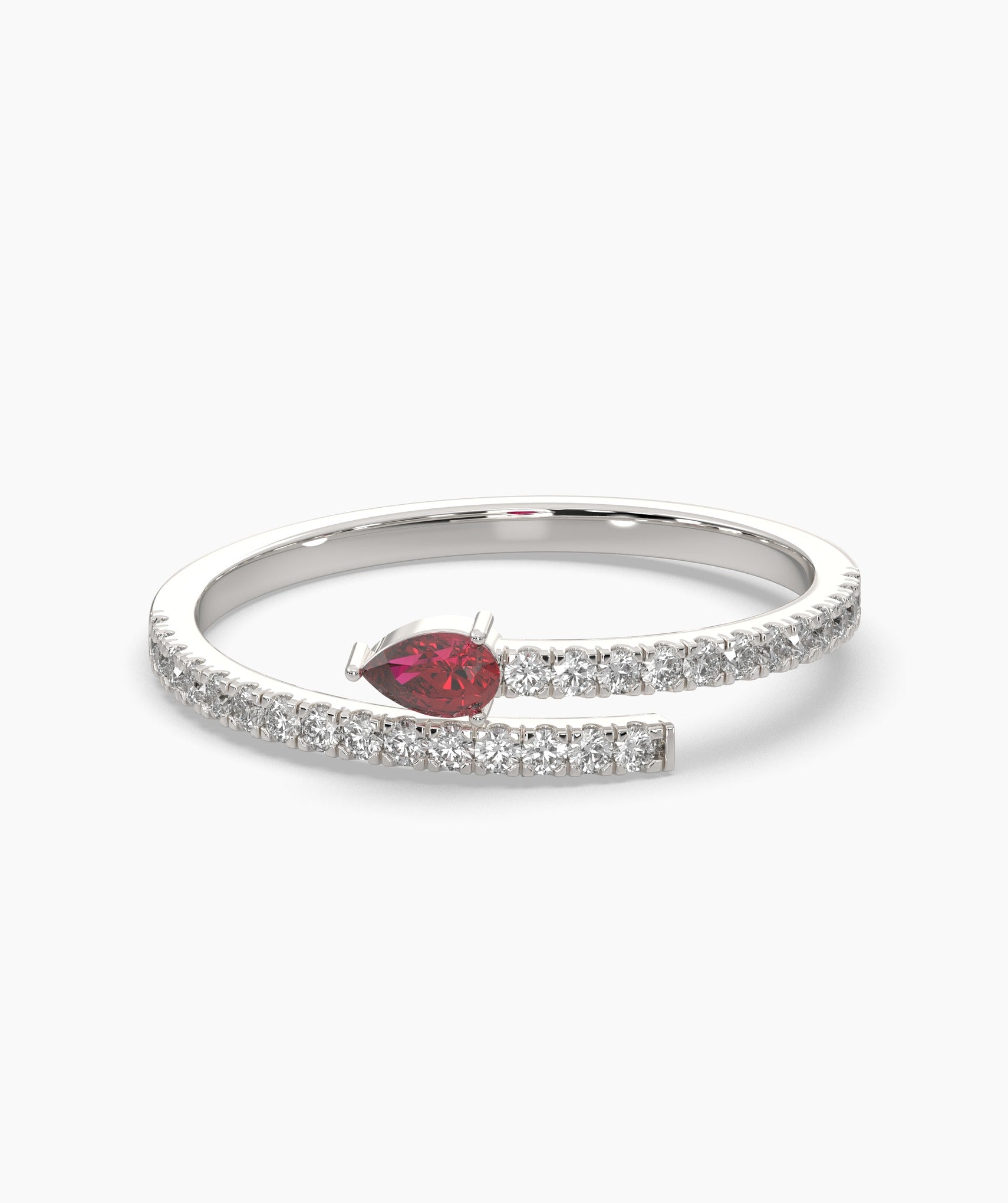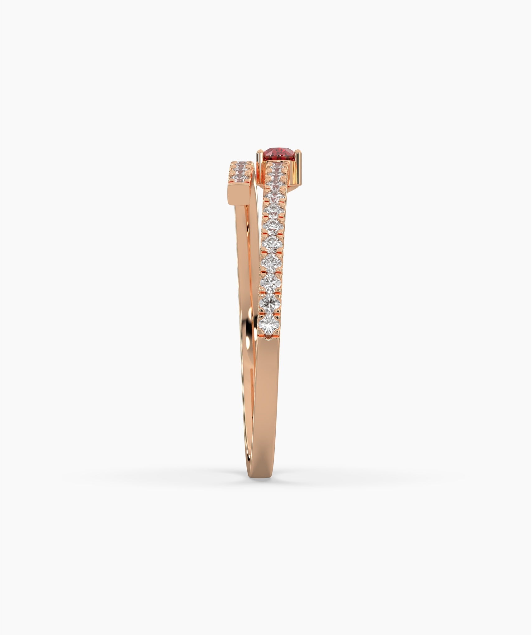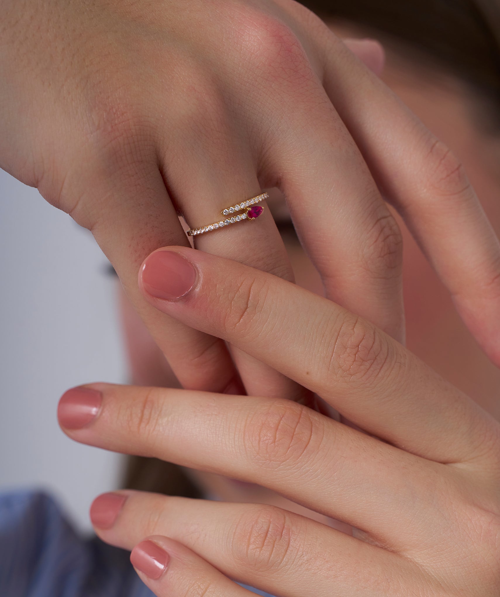 Embrace elegance with this 14K gold ring, highlighting a central red ruby embraced by diamonds, offering a timeless charm perfect for any occasion.
