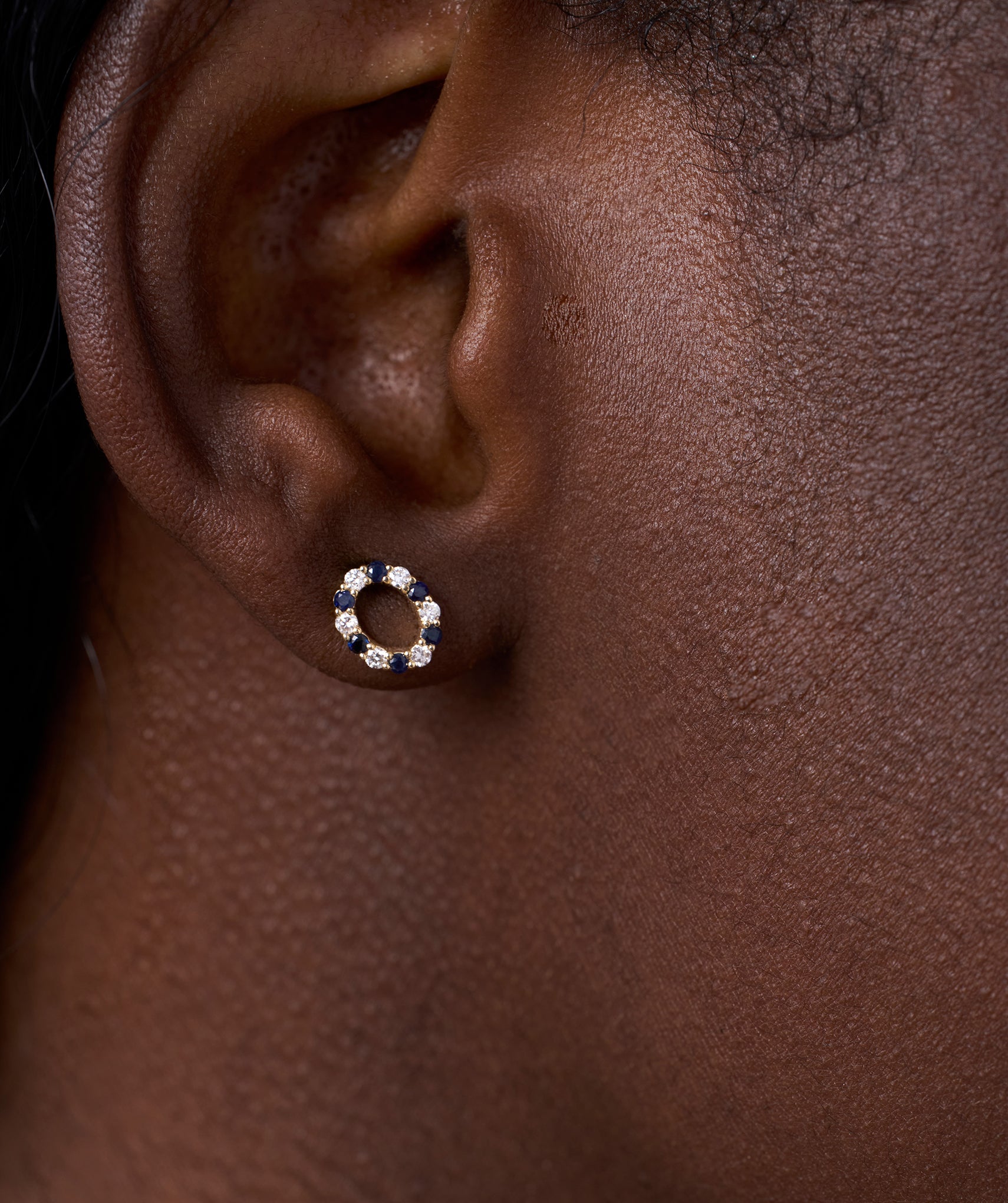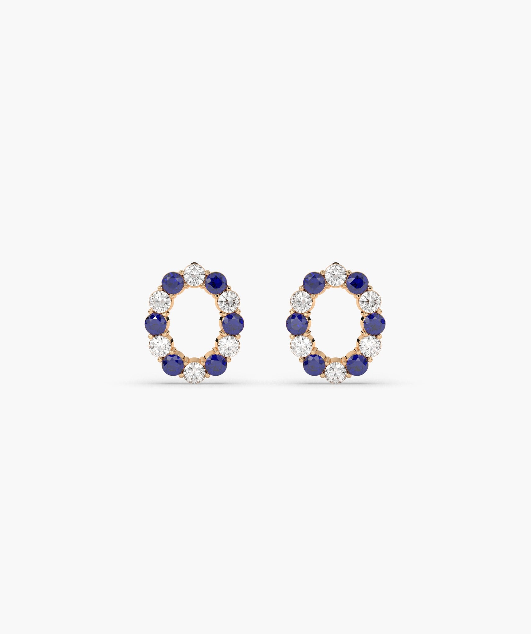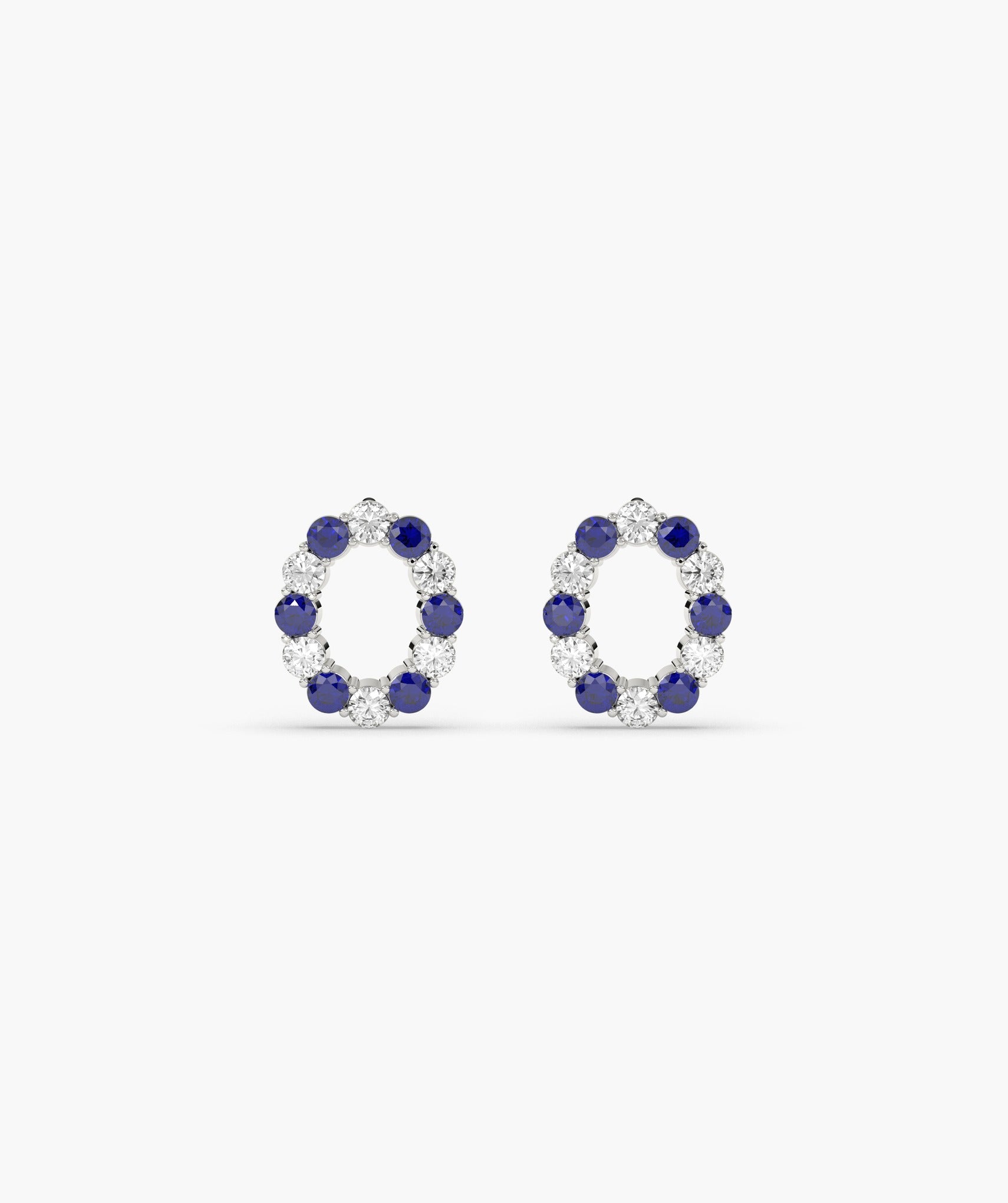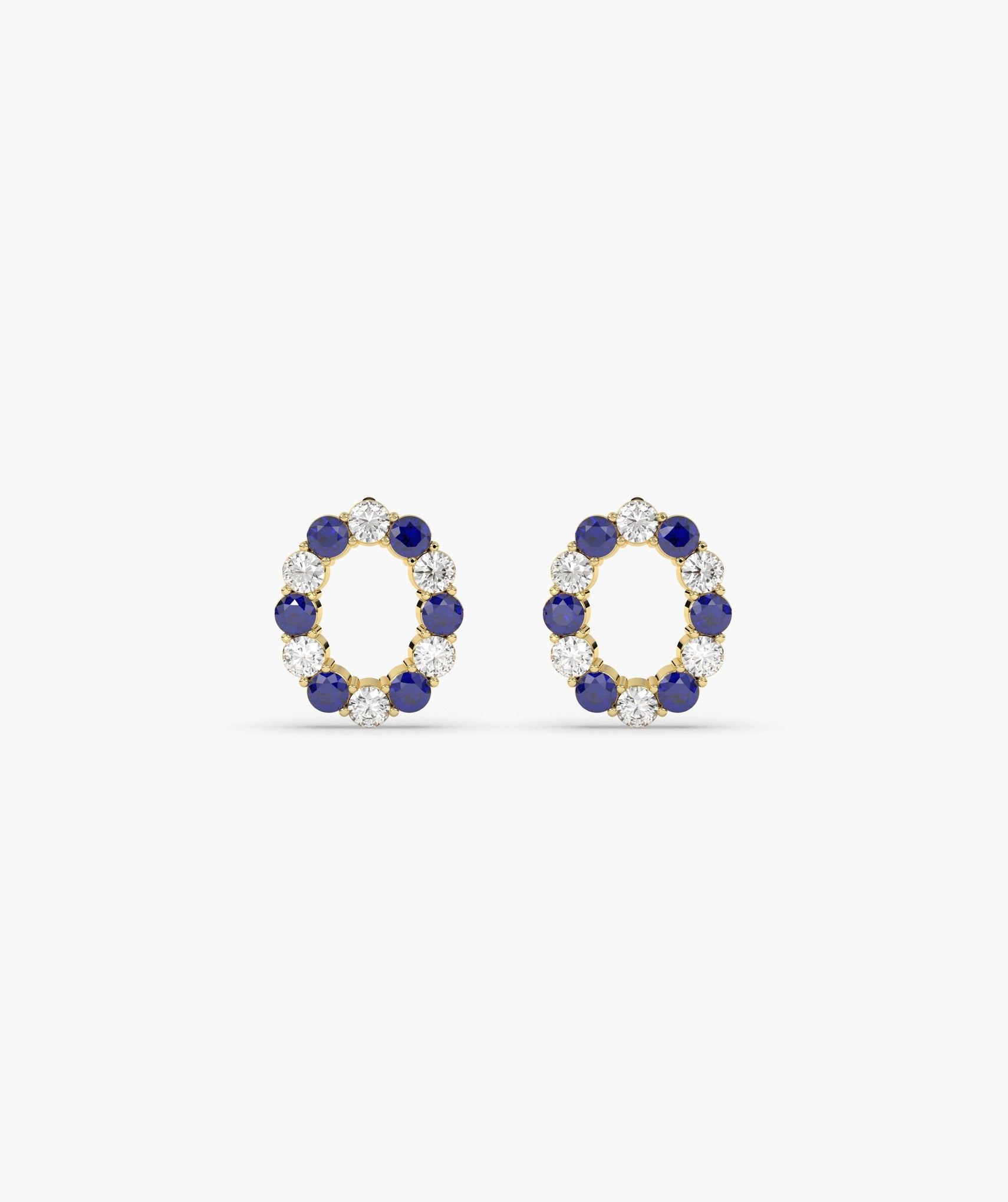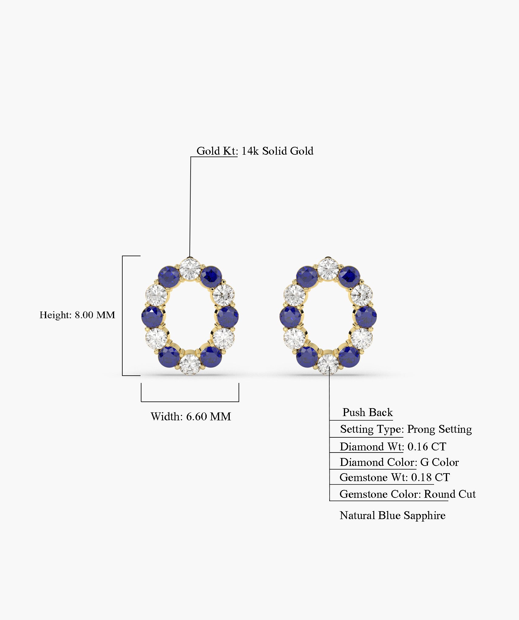 Crafted in 14K solid gold, these exquisite earrings showcase a stunning alternation of deep blue sapphires and sparkling diamonds set in a circular halo design.