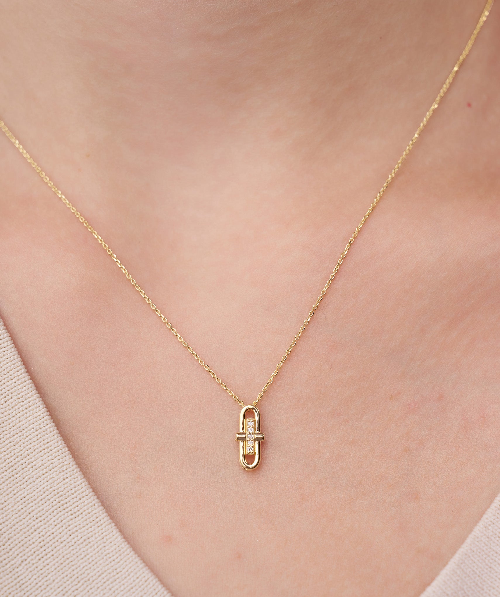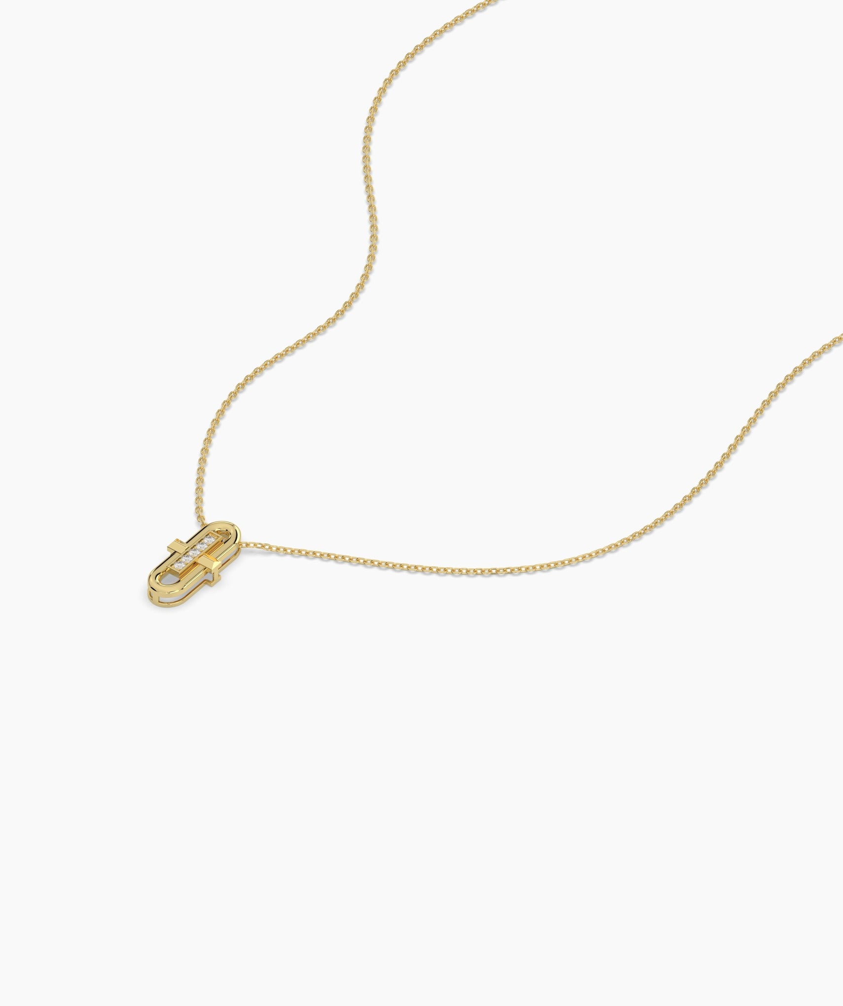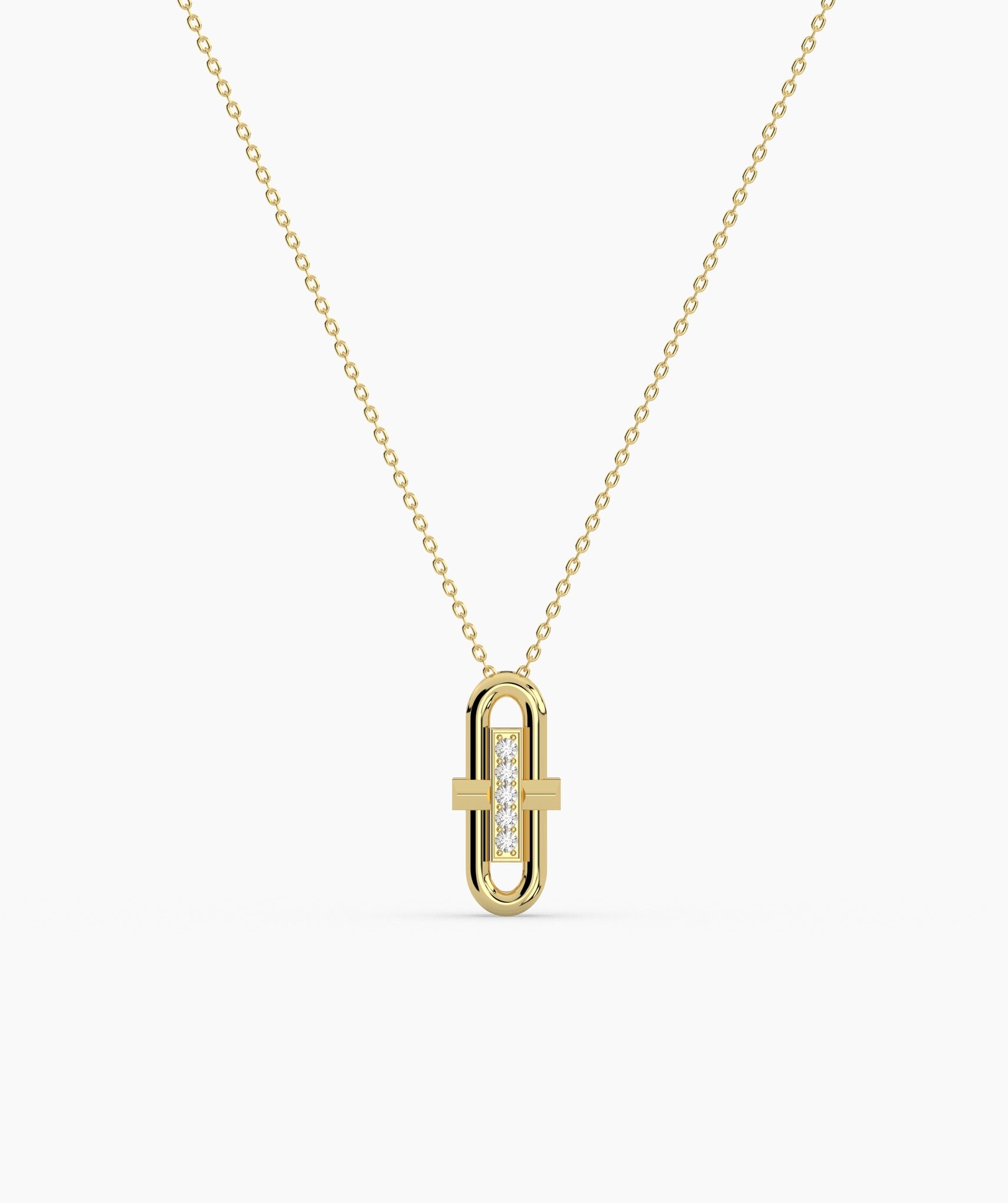 This contemporary necklace features a minimalist gold pendant with sparkling diamonds for understated elegance.
