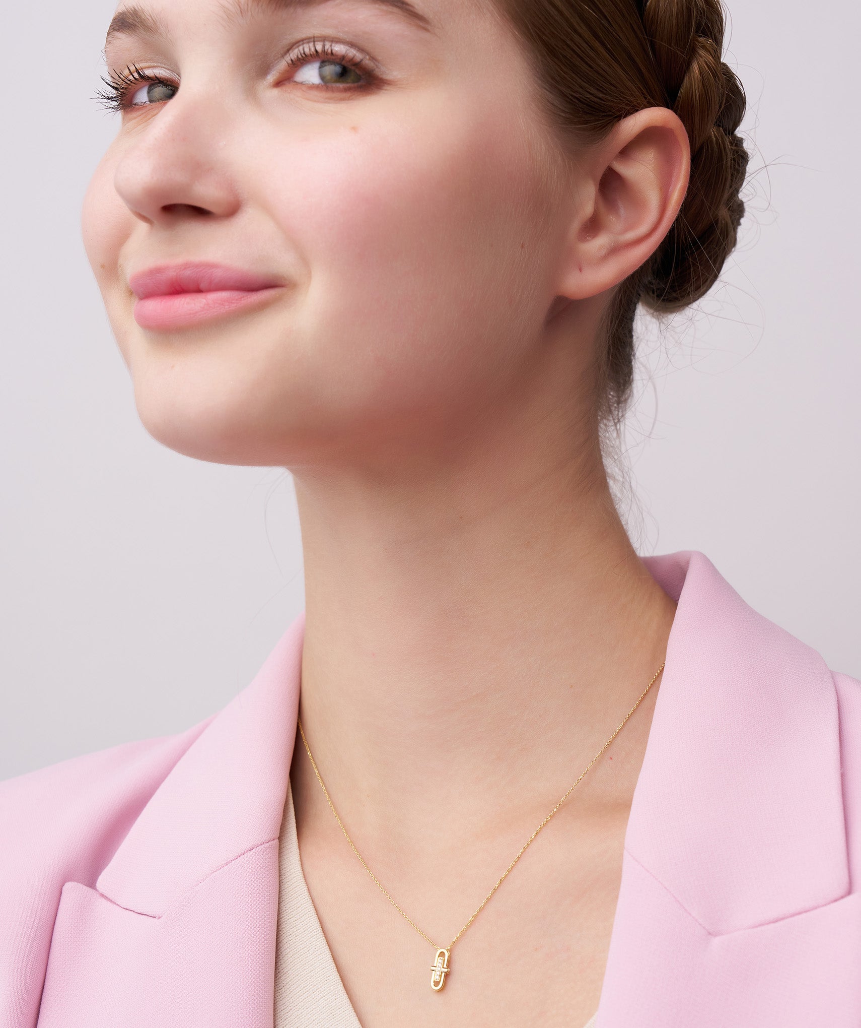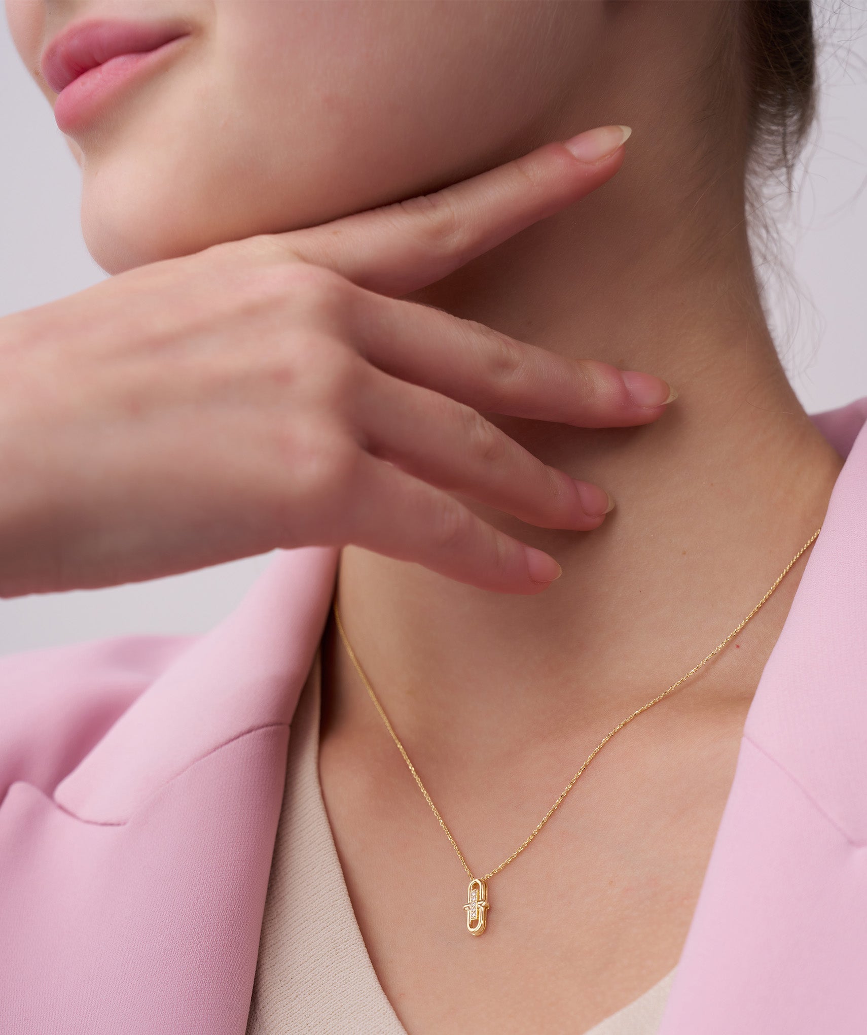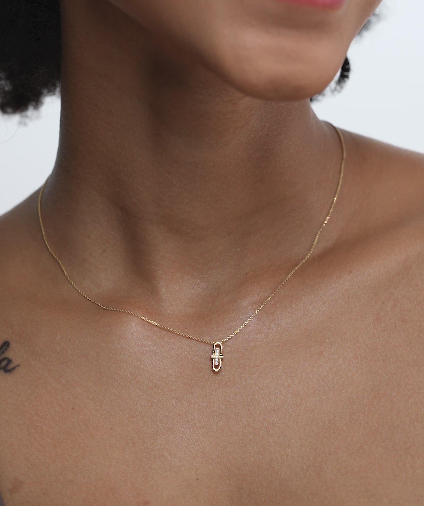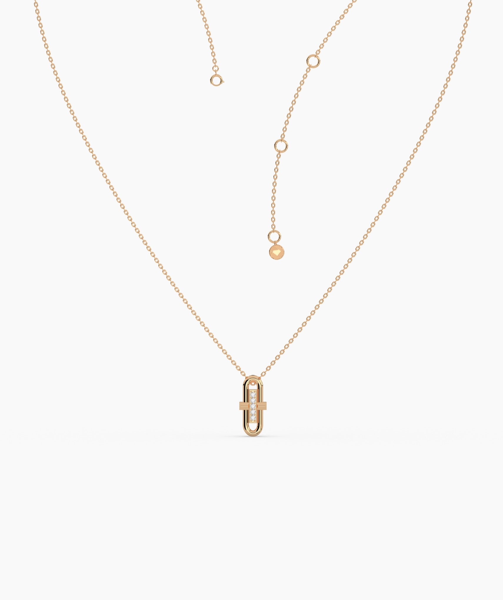 This contemporary necklace features a minimalist gold pendant with sparkling diamonds for understated elegance.