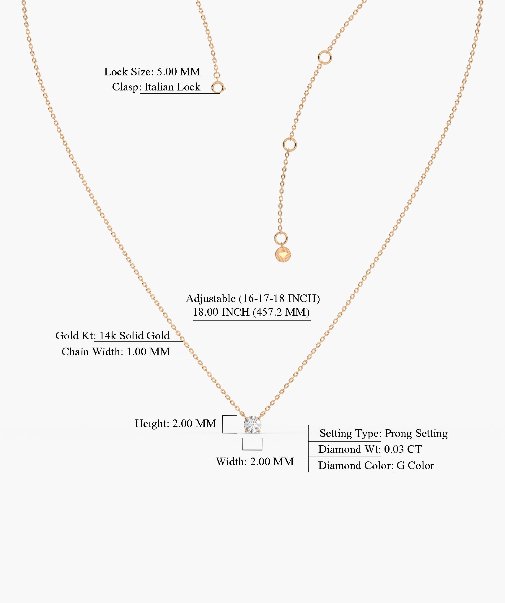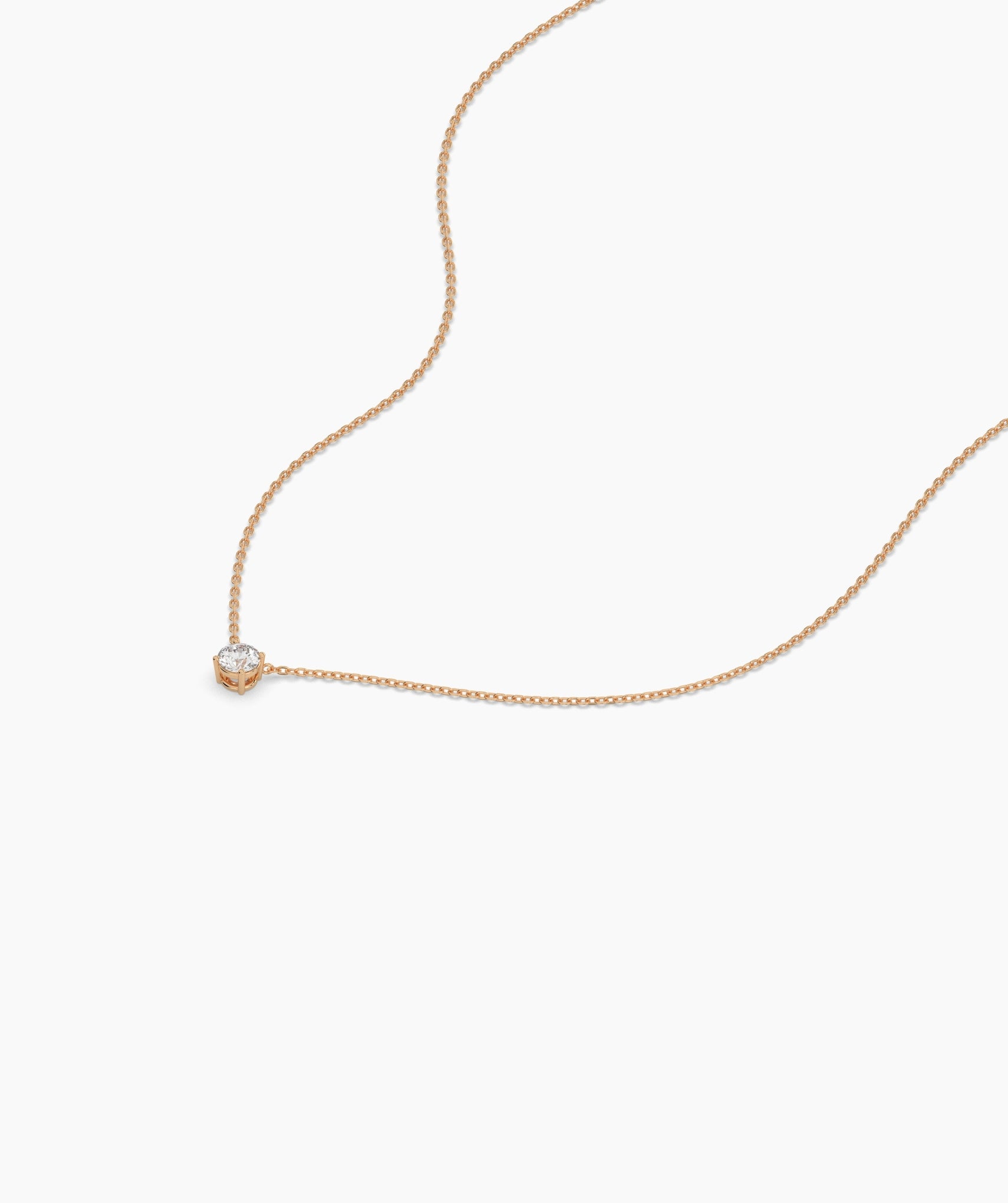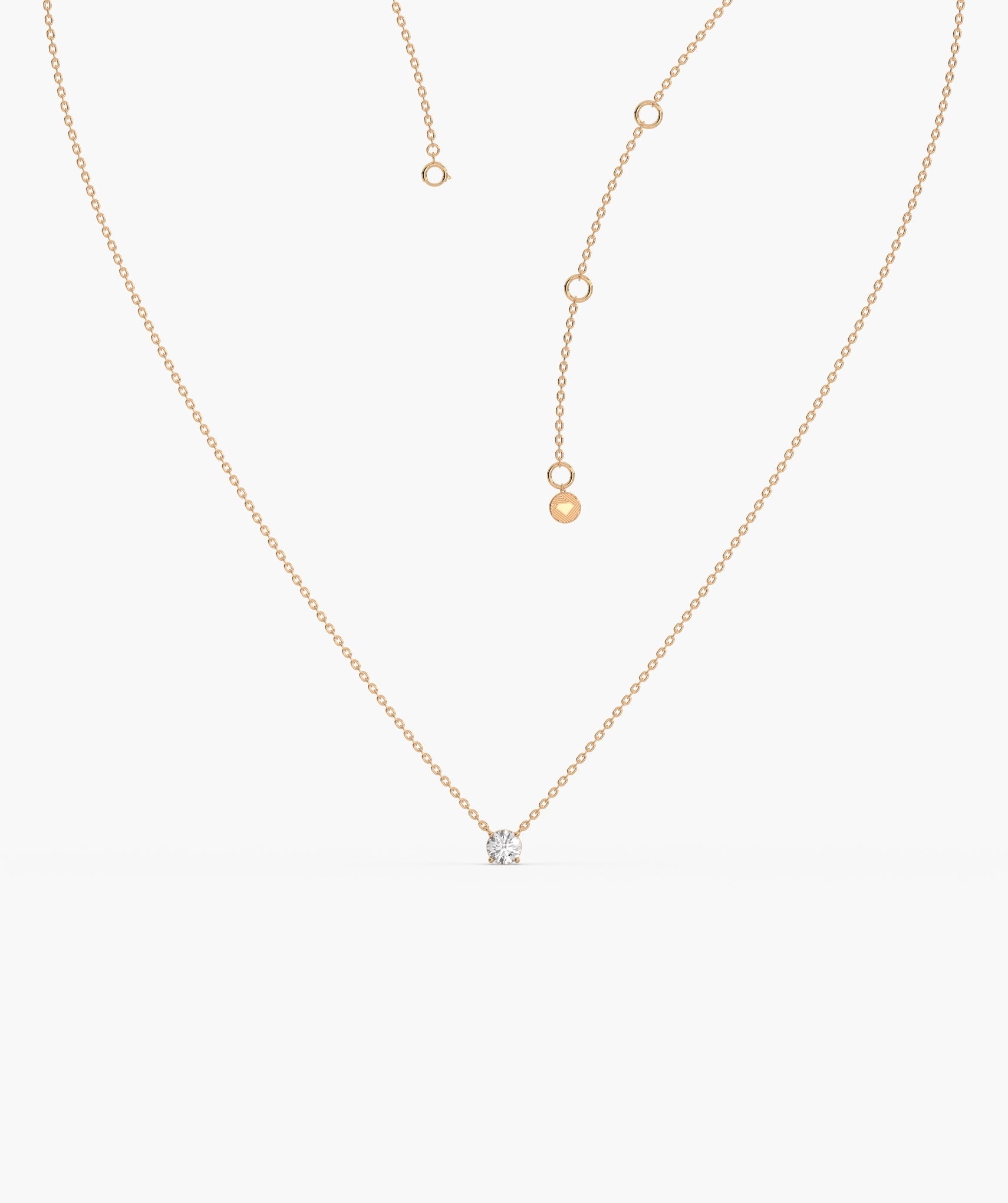 This refined necklace showcases a brilliant round diamond set in a smooth Prong of 14K rose gold. Paired with a dainty adjustable chain, it’s perfect for layering or wearing solo for a timeless, minimalist look. A radiant everyday piece with subtle luxury and charm.