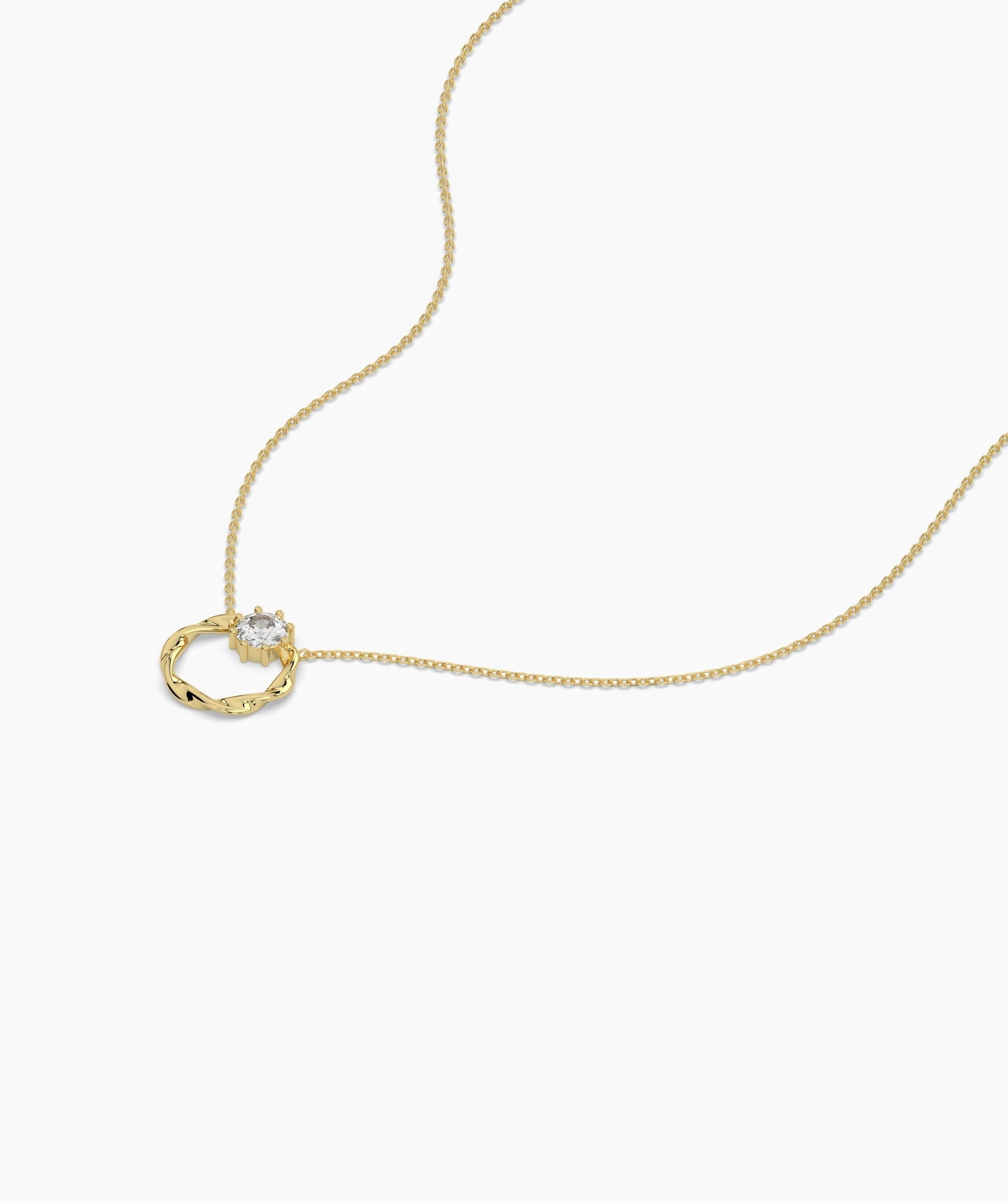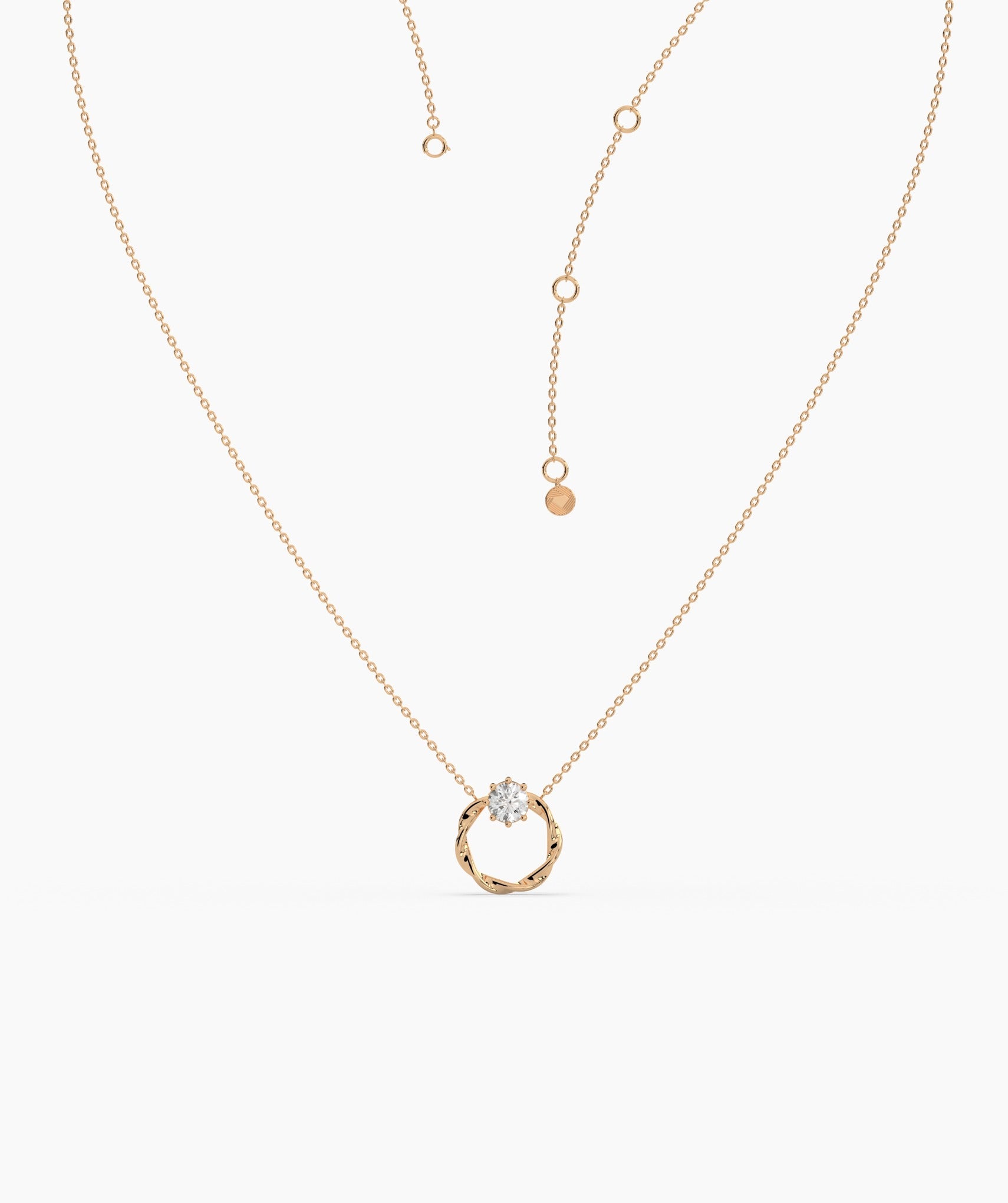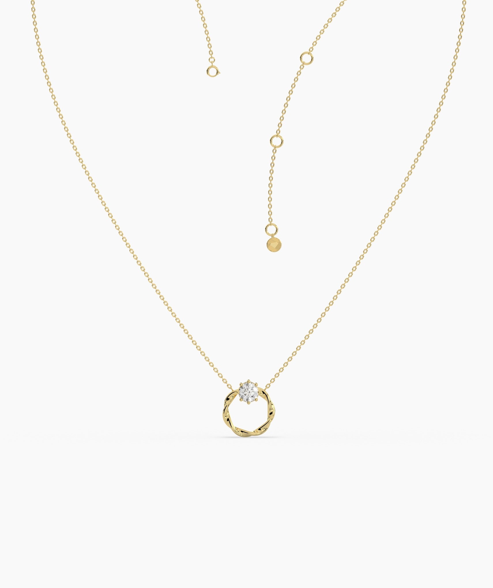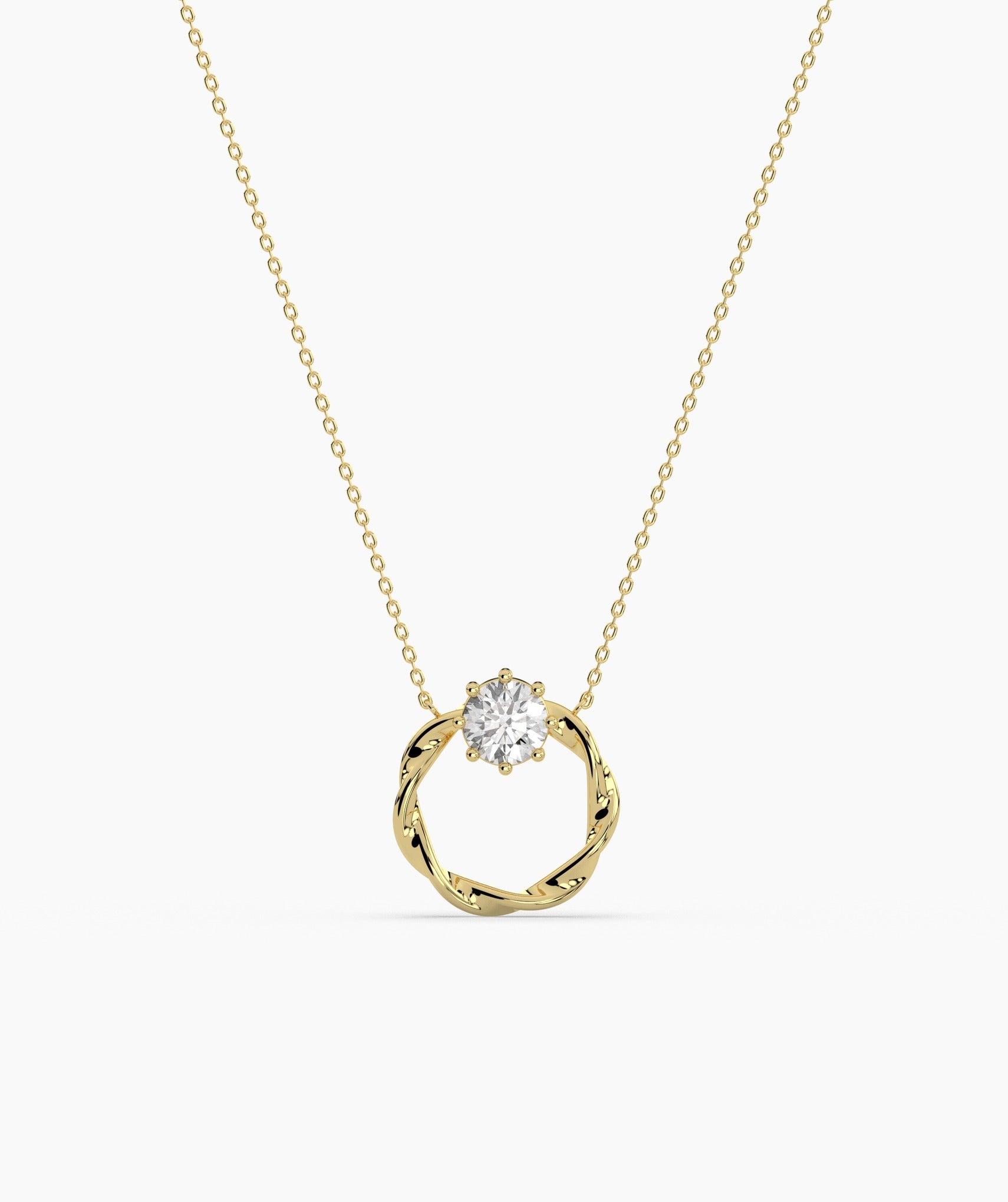 Elevate your style with this 14K gold pendant, where a braided ring design cradles a radiant solitaire for timeless allure.
