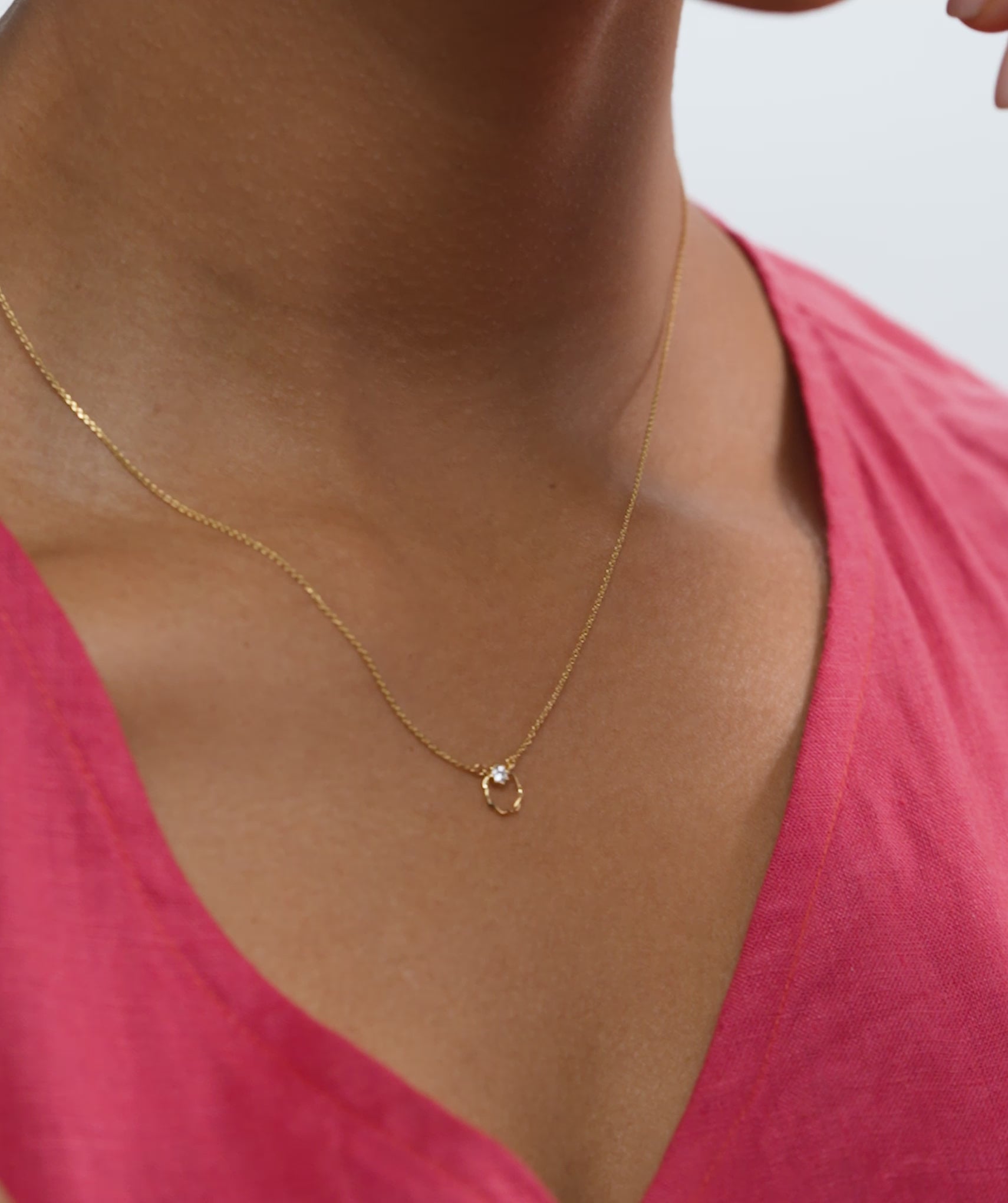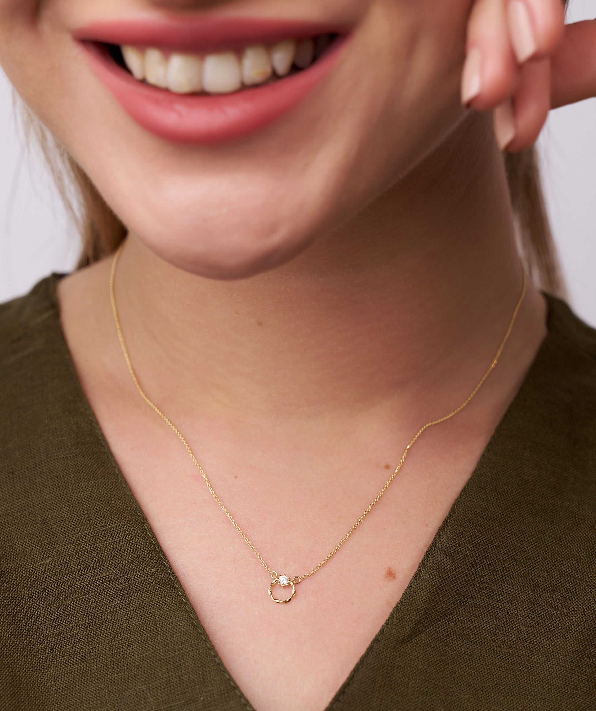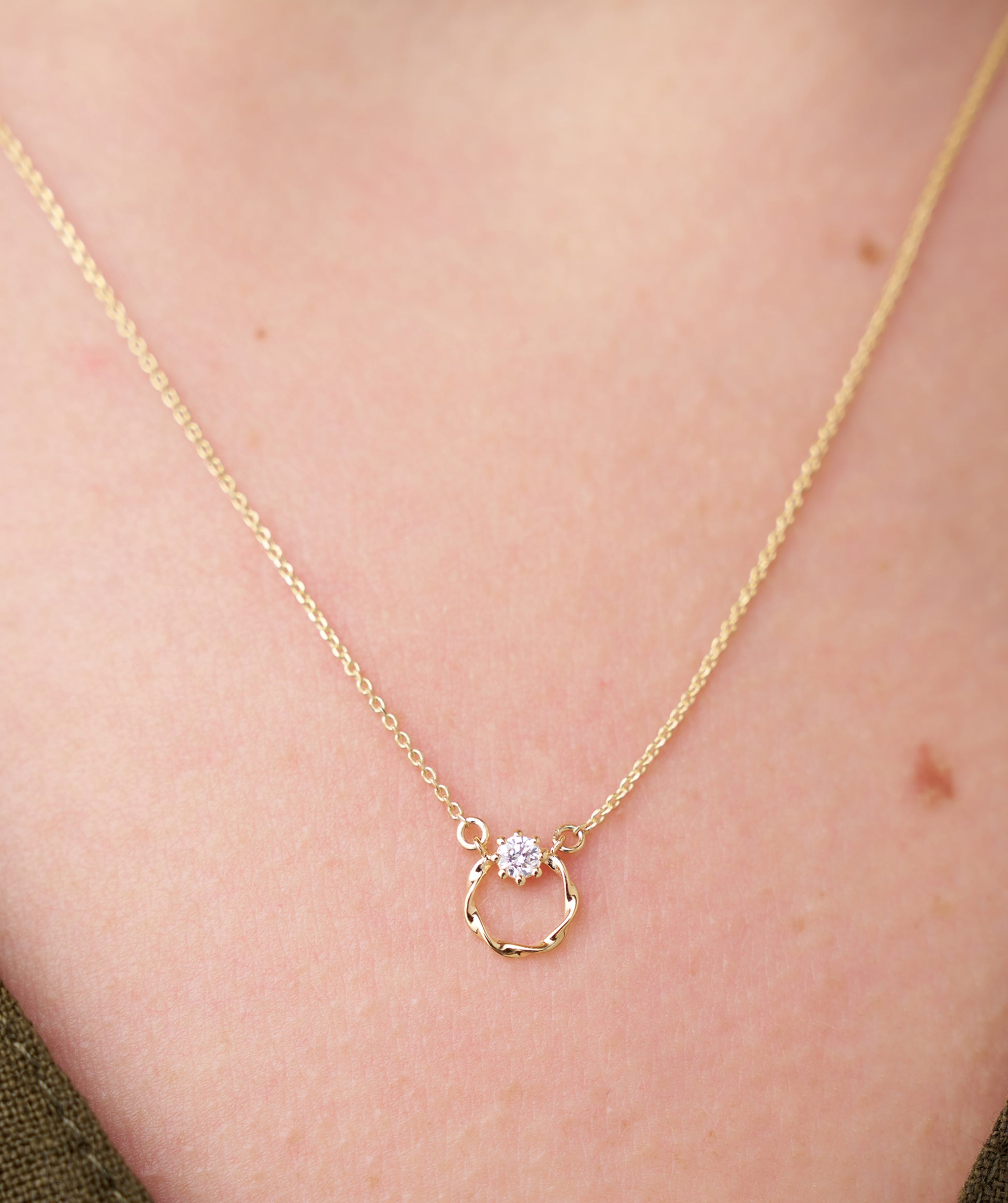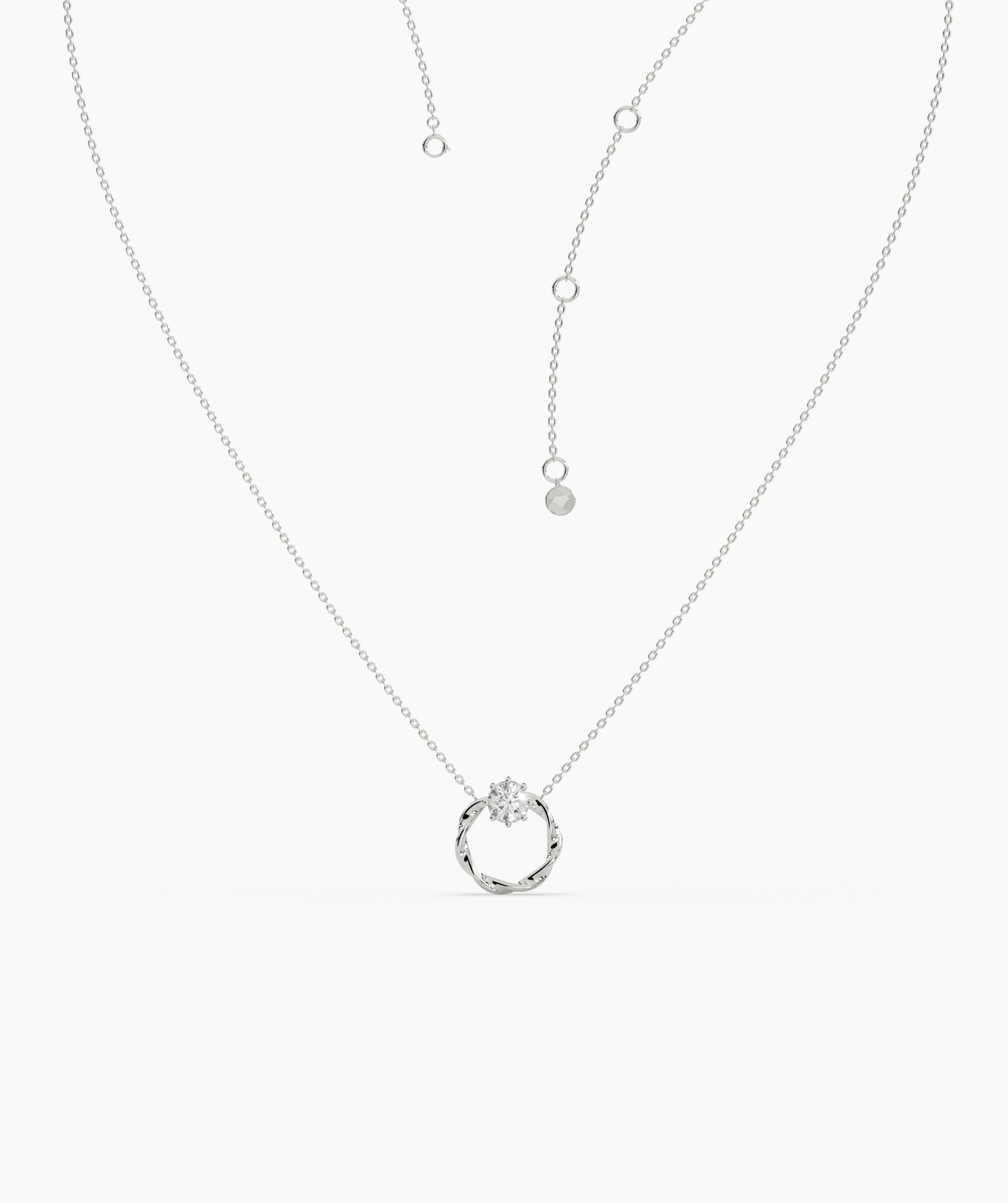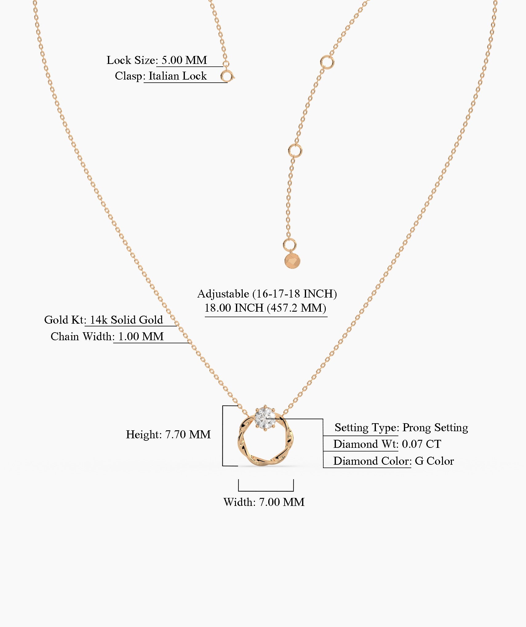 Elevate your style with this 14K gold pendant, where a braided ring design cradles a radiant solitaire for timeless allure.