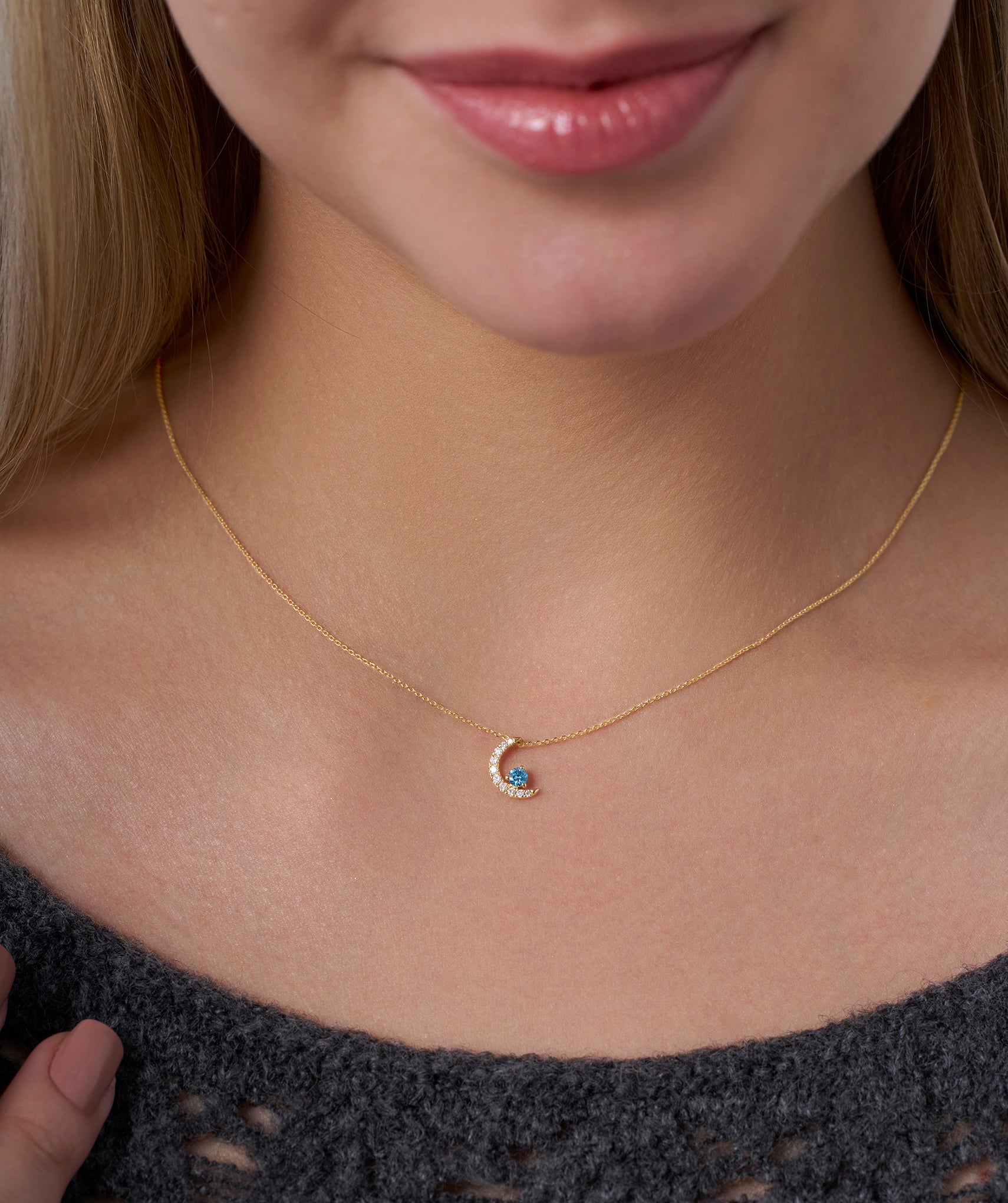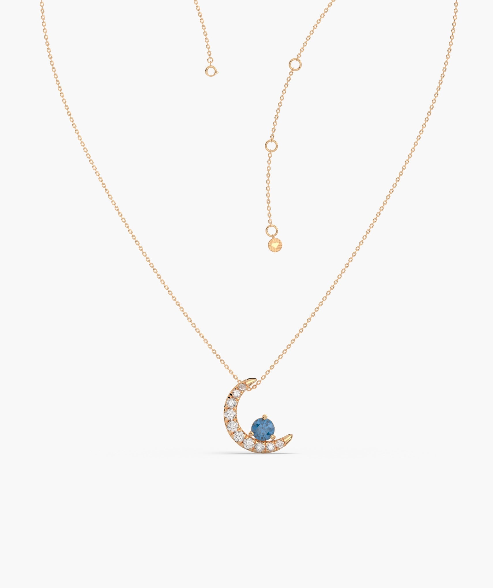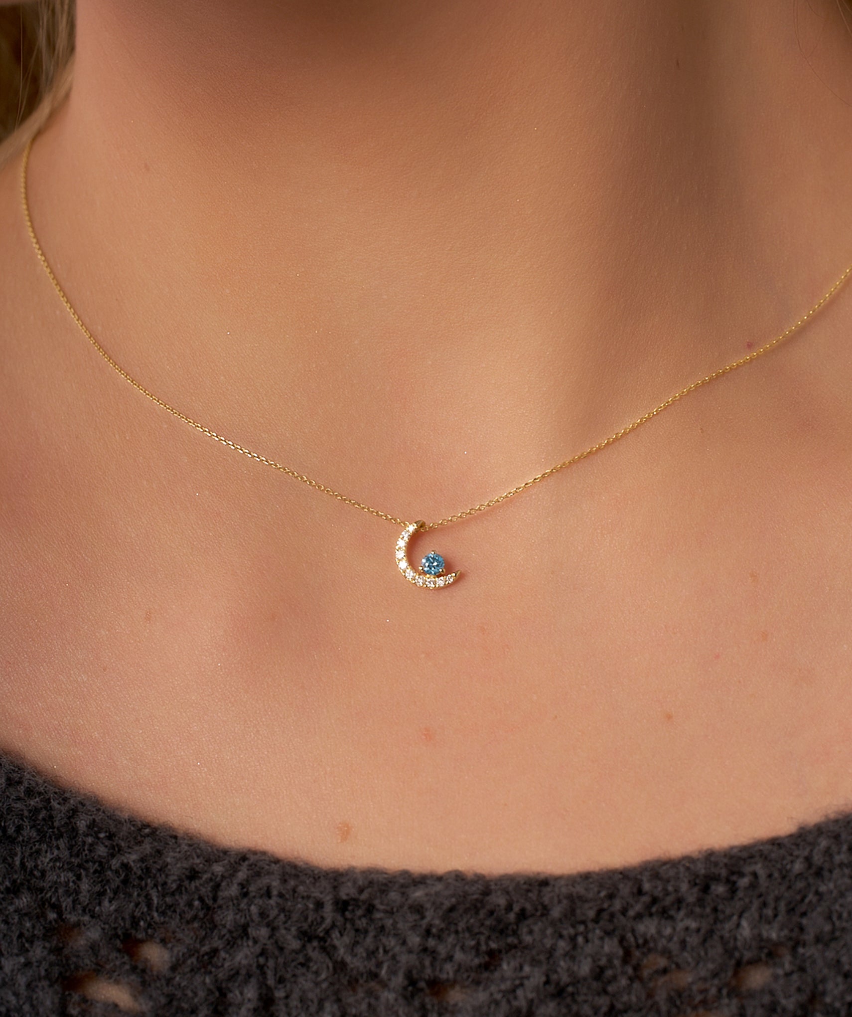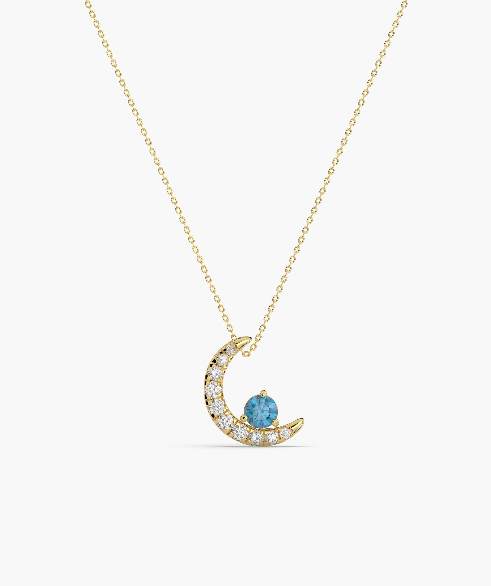 Charming 14K gold necklace with a diamond-studded crescent moon and a vibrant blue diamond, embodying celestial elegance.
