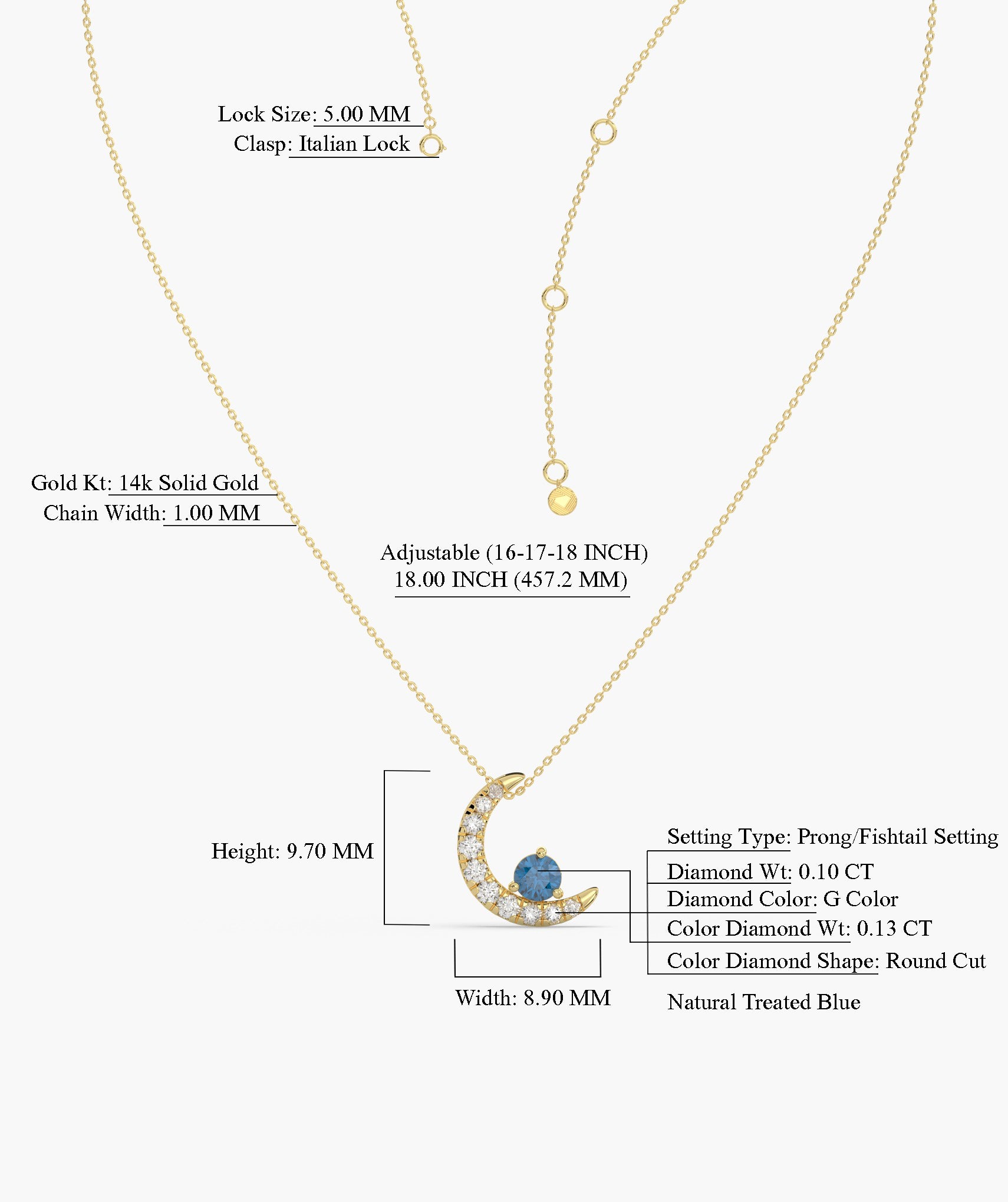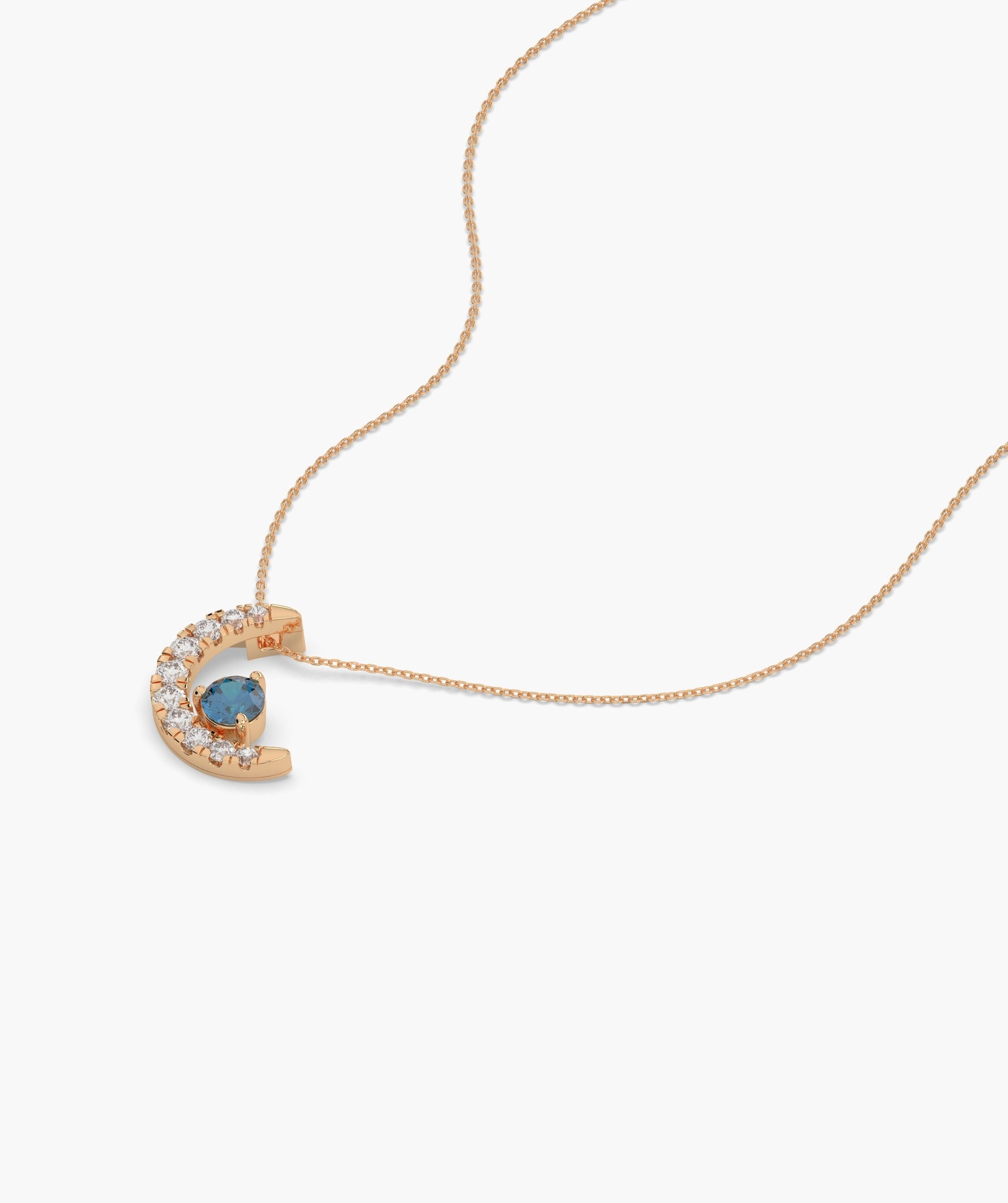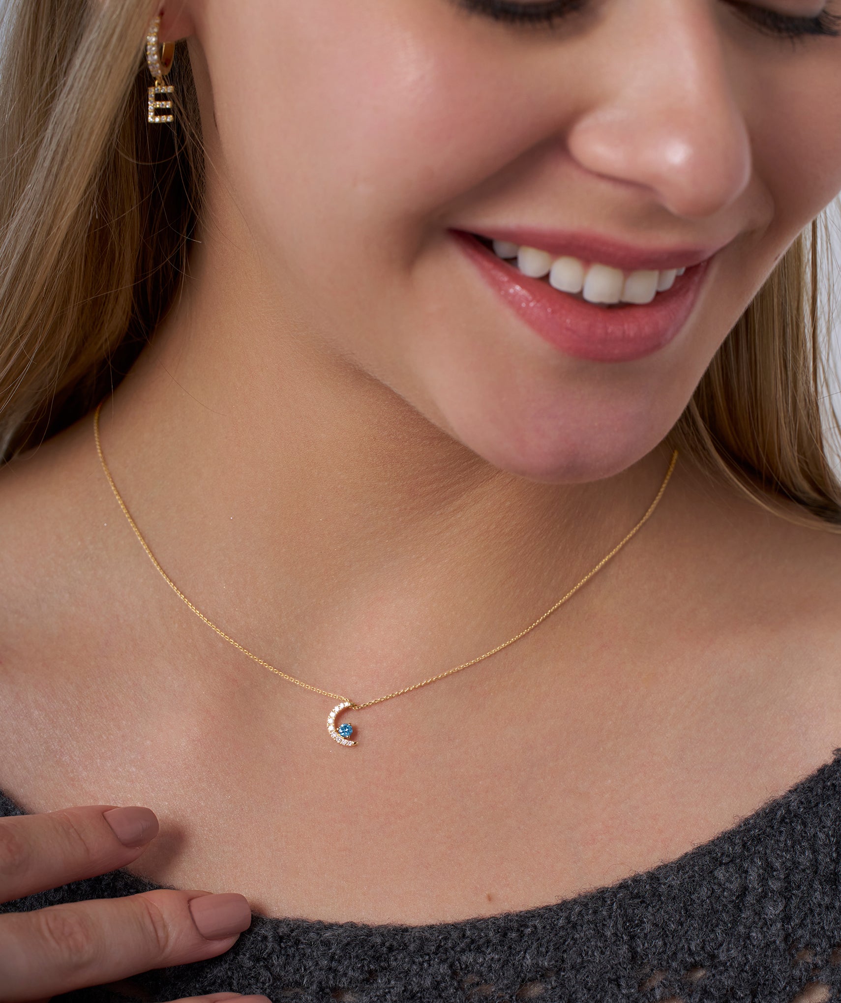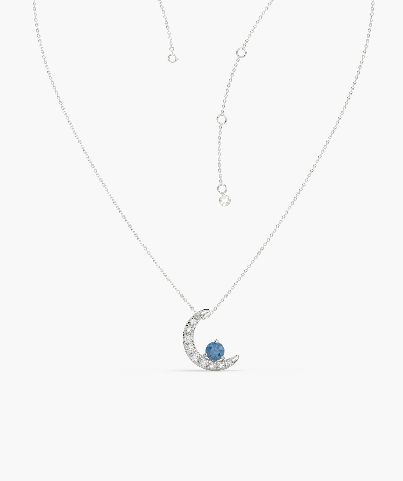 Charming 14K gold necklace with a diamond-studded crescent moon and a vibrant blue diamond, embodying celestial elegance.